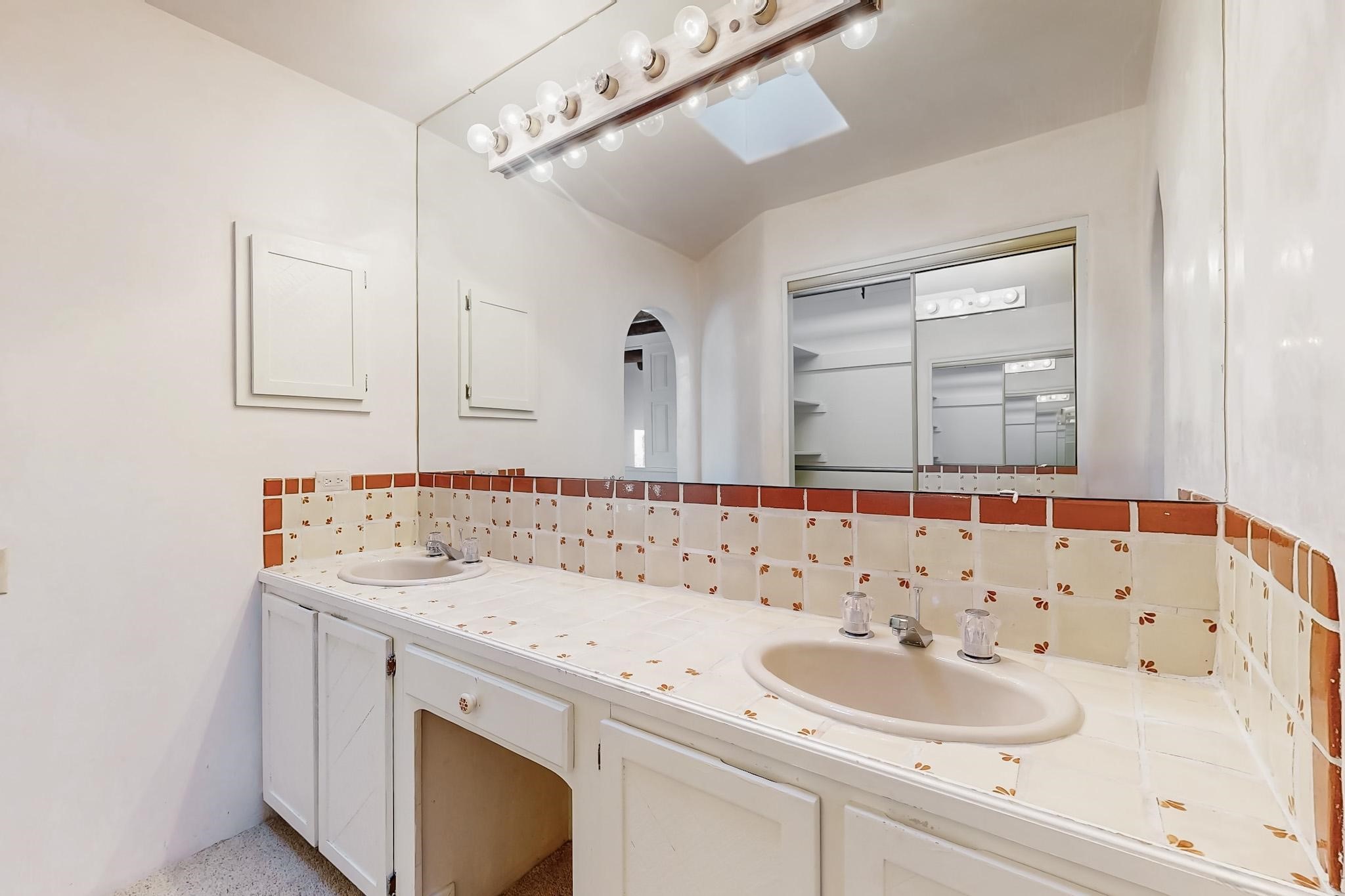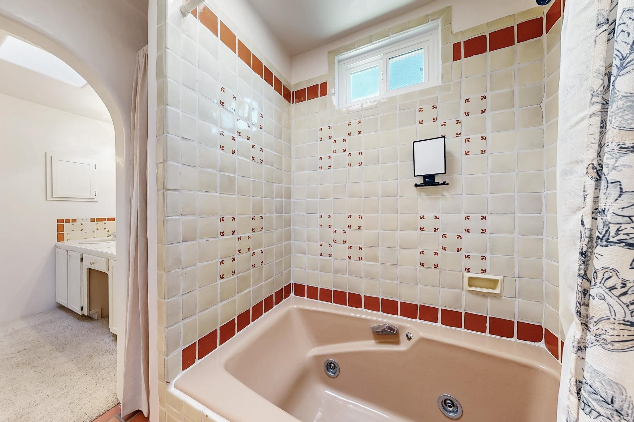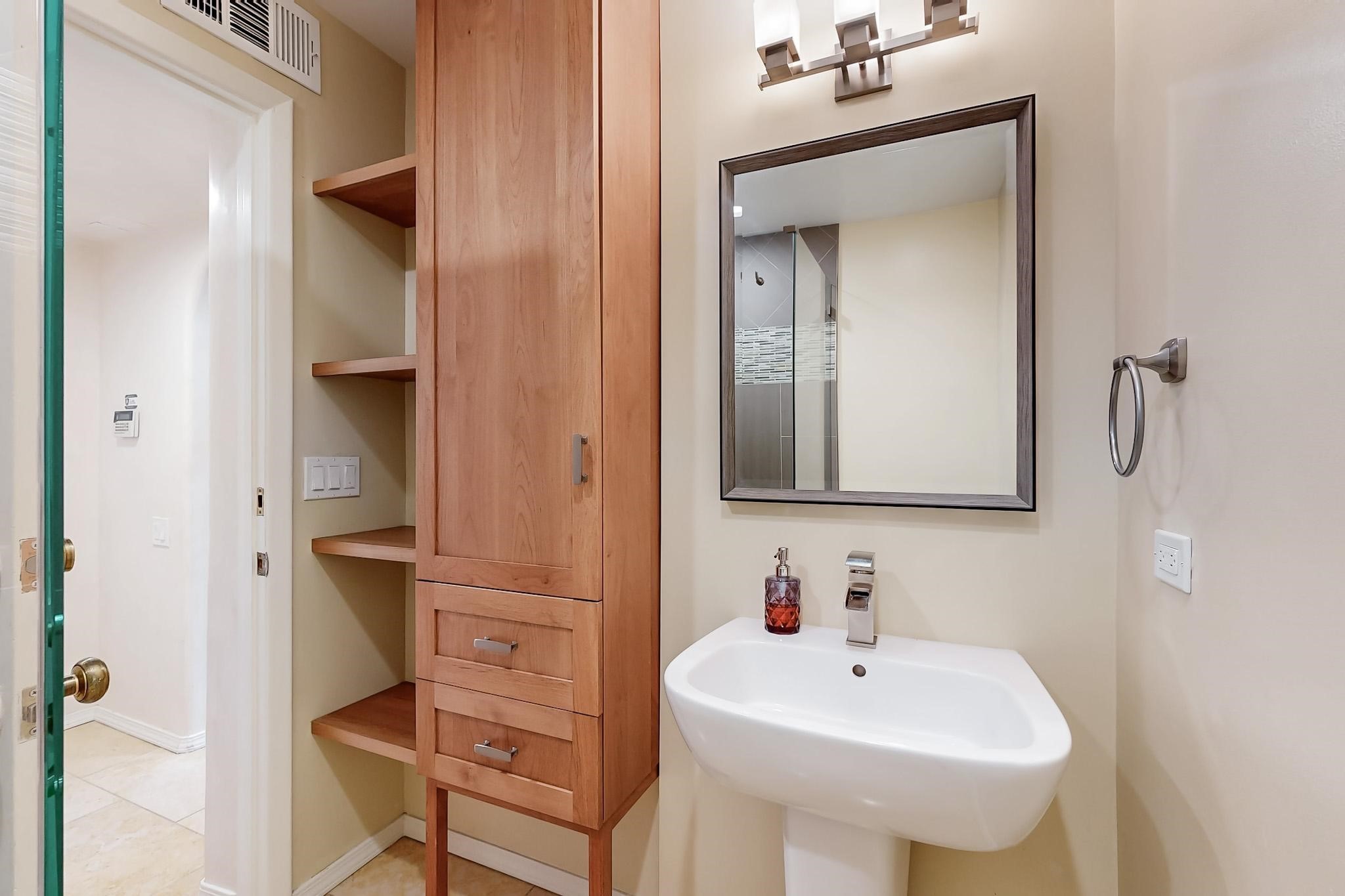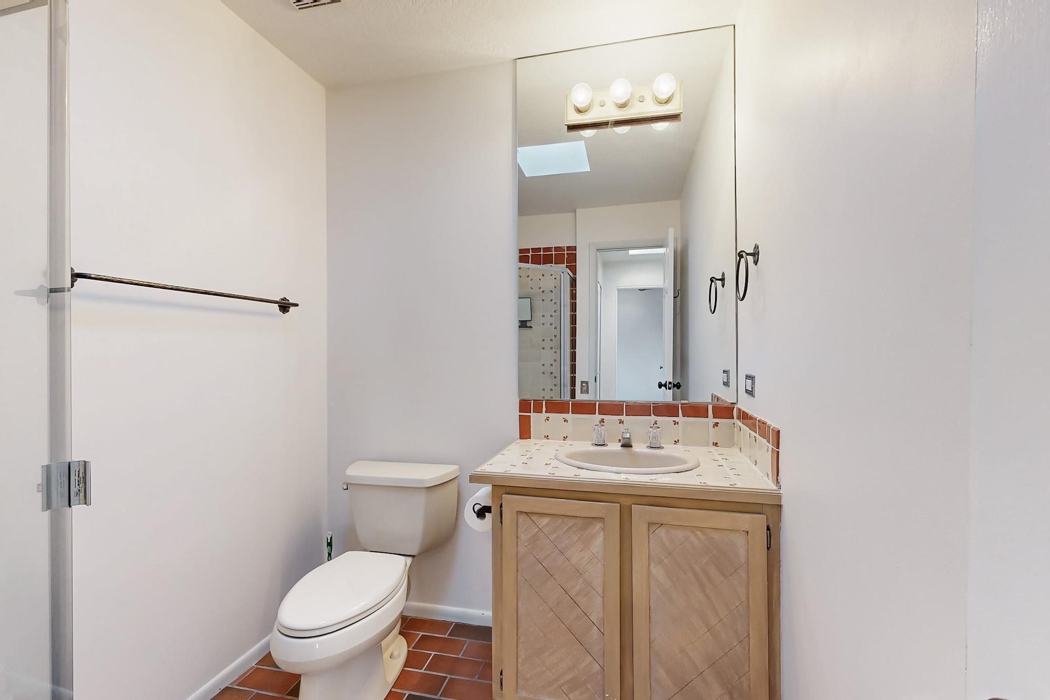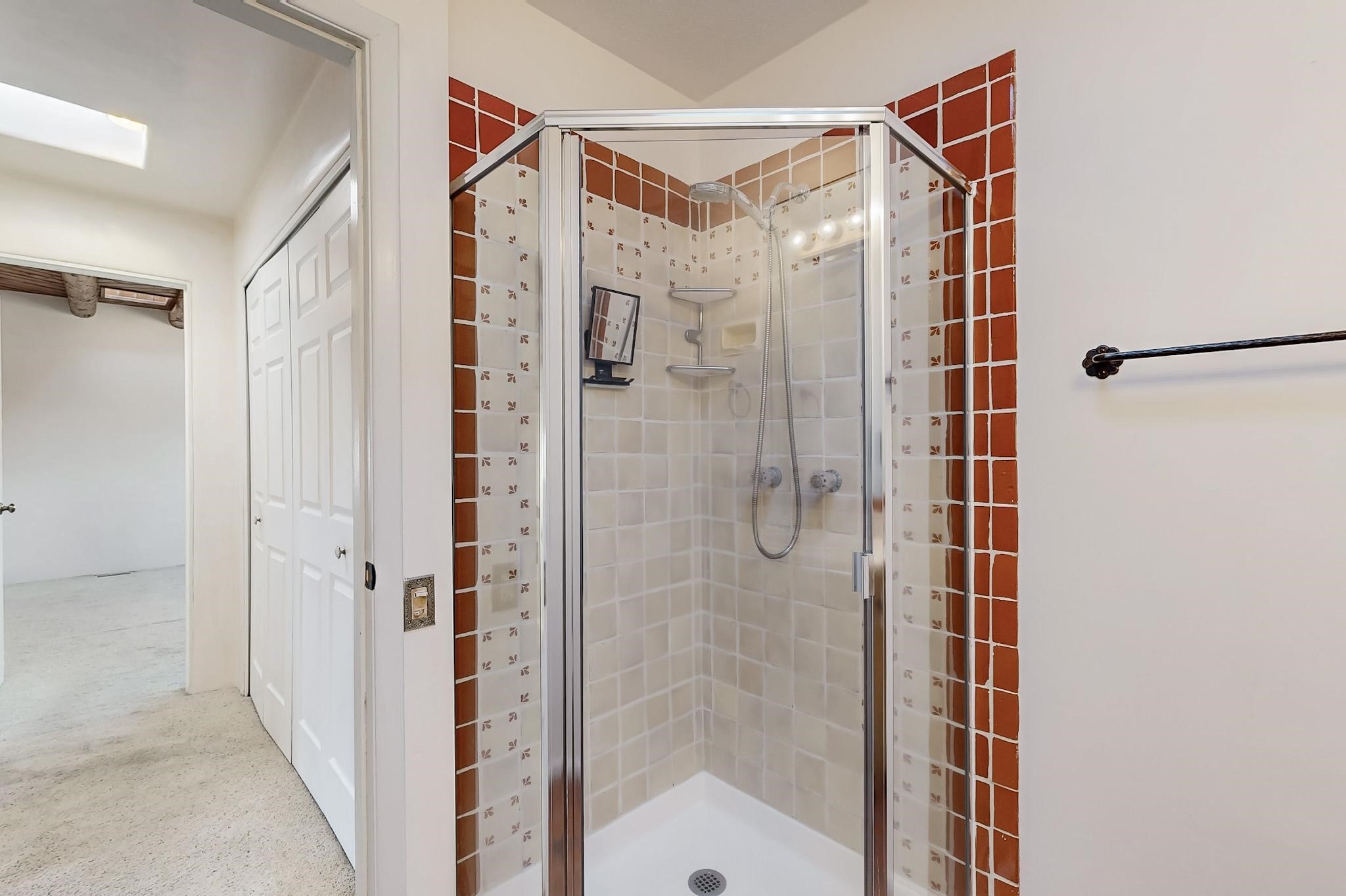 This beautiful two-story condo features an open-concept first floor with travertine tile, a living room with an electric fireplace, a dining area, and a kitchen with granite countertops, stainless steel appliances, and hidden appliance storage. A full bathroom is located behind the kitchen. Upstairs, there are two bedrooms and two bathrooms, including an owner's suite with a traditional kiva fireplace and shutters opening to the living area. The second bedroom has wood flooring and access to a portal space. Custom details throughout include decorative tile, Nichos, plaster walls, and custom hardware.Situated on an historic street, the condo offers a courtyard off the dining room with space for outdoor dining and a rock water feature. It provides a rural feel in an urban setting, within walking distance of the historic plaza and DeVargas Market Center. This unit includes two extra parking passes for parking around the corner in the complex. The owners are offering a $10,000 credit towards closing costs and flooring.