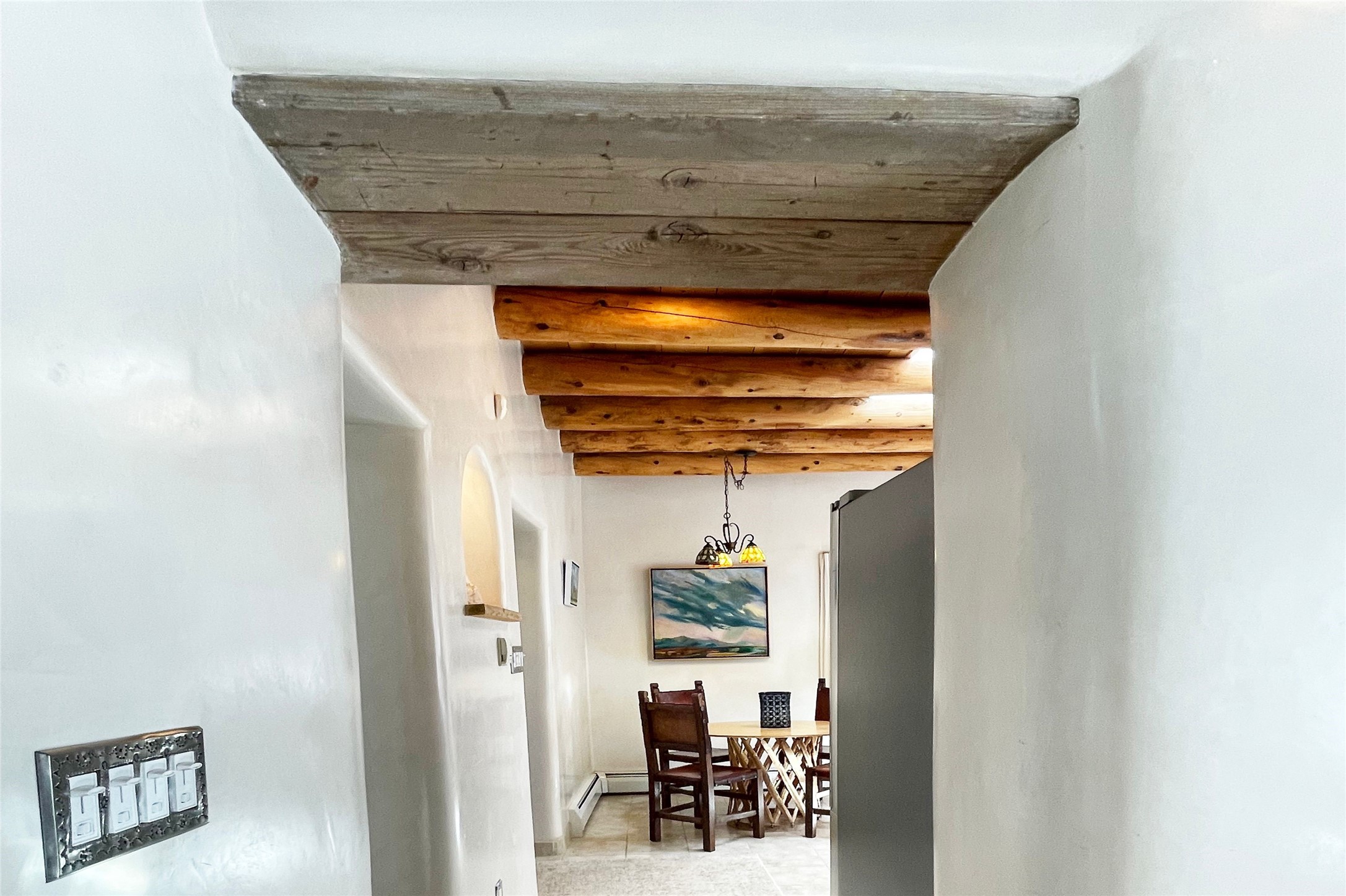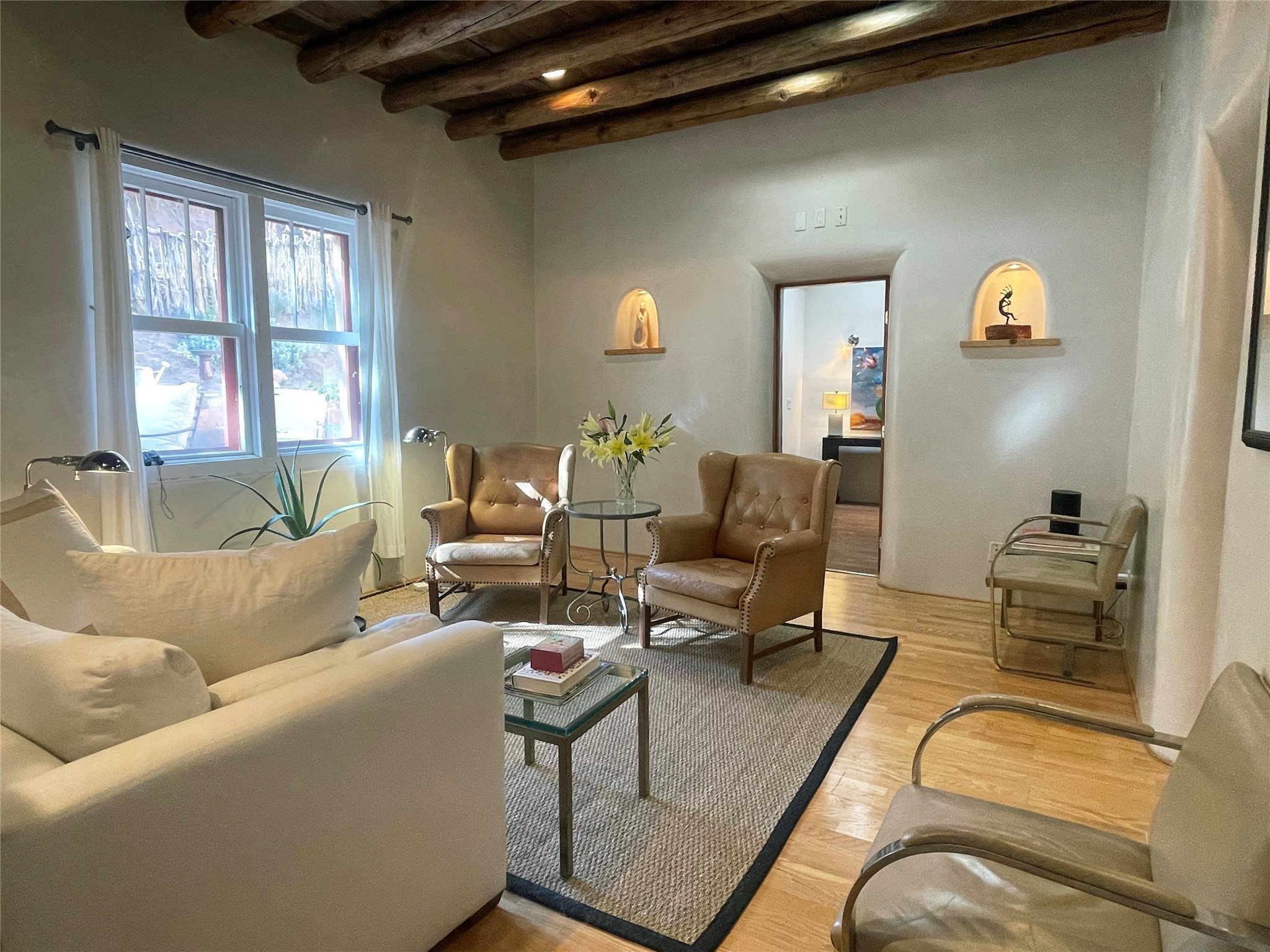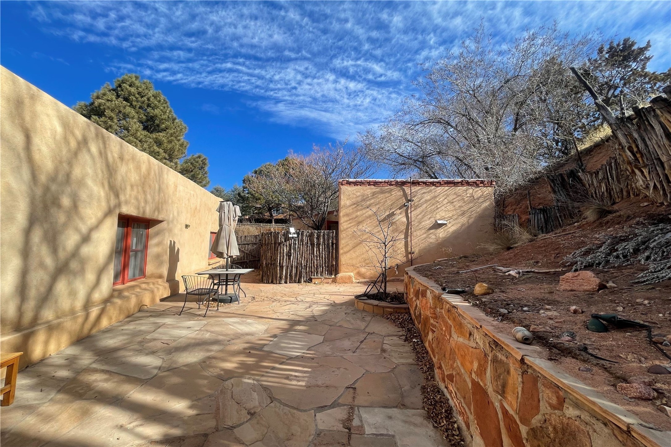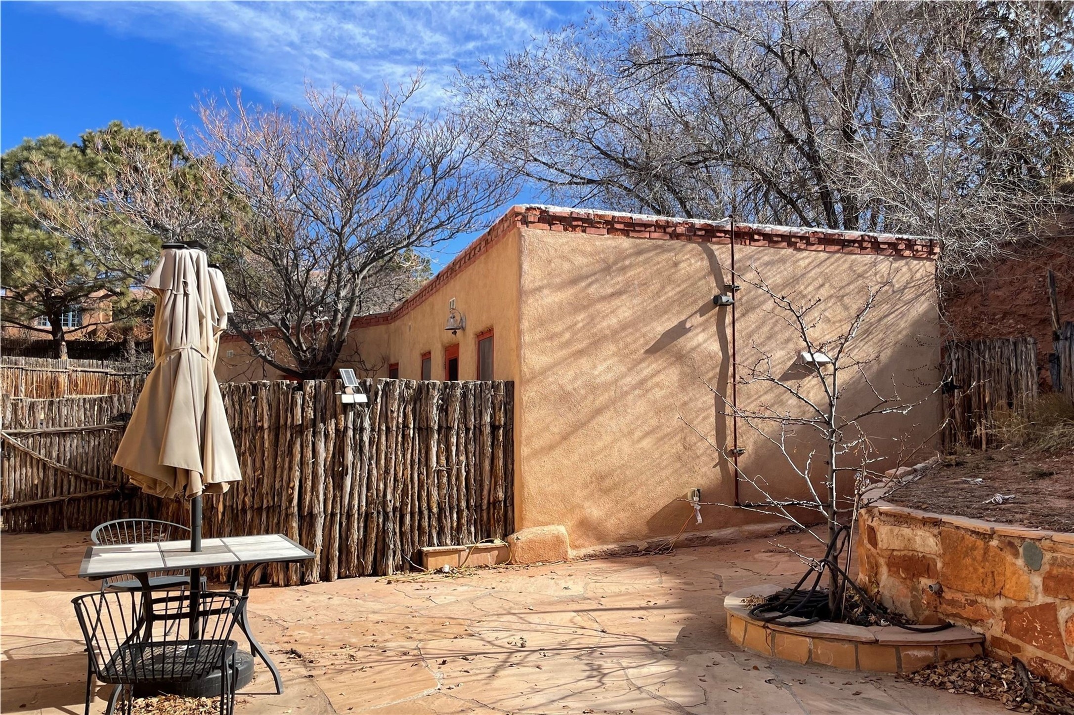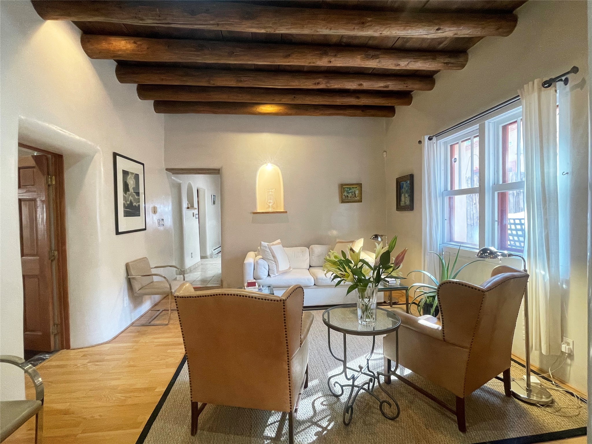 Truly, this authentic Santa Fe Historic Double Adobe Home and Casita near the Plaza exude Santa Fe Style. Down a lane from Paseo De Peralta, leads one to this very private family compound situated on .71 acres of land. The main home was built by the Spanish military in the late 1700s to house an officer at Fort Marcy. The Sisneros Family came to own it due to a daughter marrying the Spanish Colonel in 1840. The property then became a family Compound. This storied Santa Fe property has been owned and loved by the Sisneros family ever since. The compound comprises a two-bedroom, two-bath main home and a one-bedroom, one-bath casita, both with full kitchens and living room areas. The Main Home and the Casita were fully restored and remodeled in 2008. The restoration was accomplished with respect for the historic quality of the home. The high viga ceilings, diamond finish, hand-troweled plaster walls, multiple nichos, and wood floors speak to that respectfully. Adjacent land, purchased from the Cathedral in the 1950s, adds westerly city and mountain views. Enjoy the private outdoor patio area nestled below the Cross of the Martyrs, and walk, yes walk, to all that the heart of the Historic Santa Fe Plaza has to offer. This is a once in a lifetime opportunity!