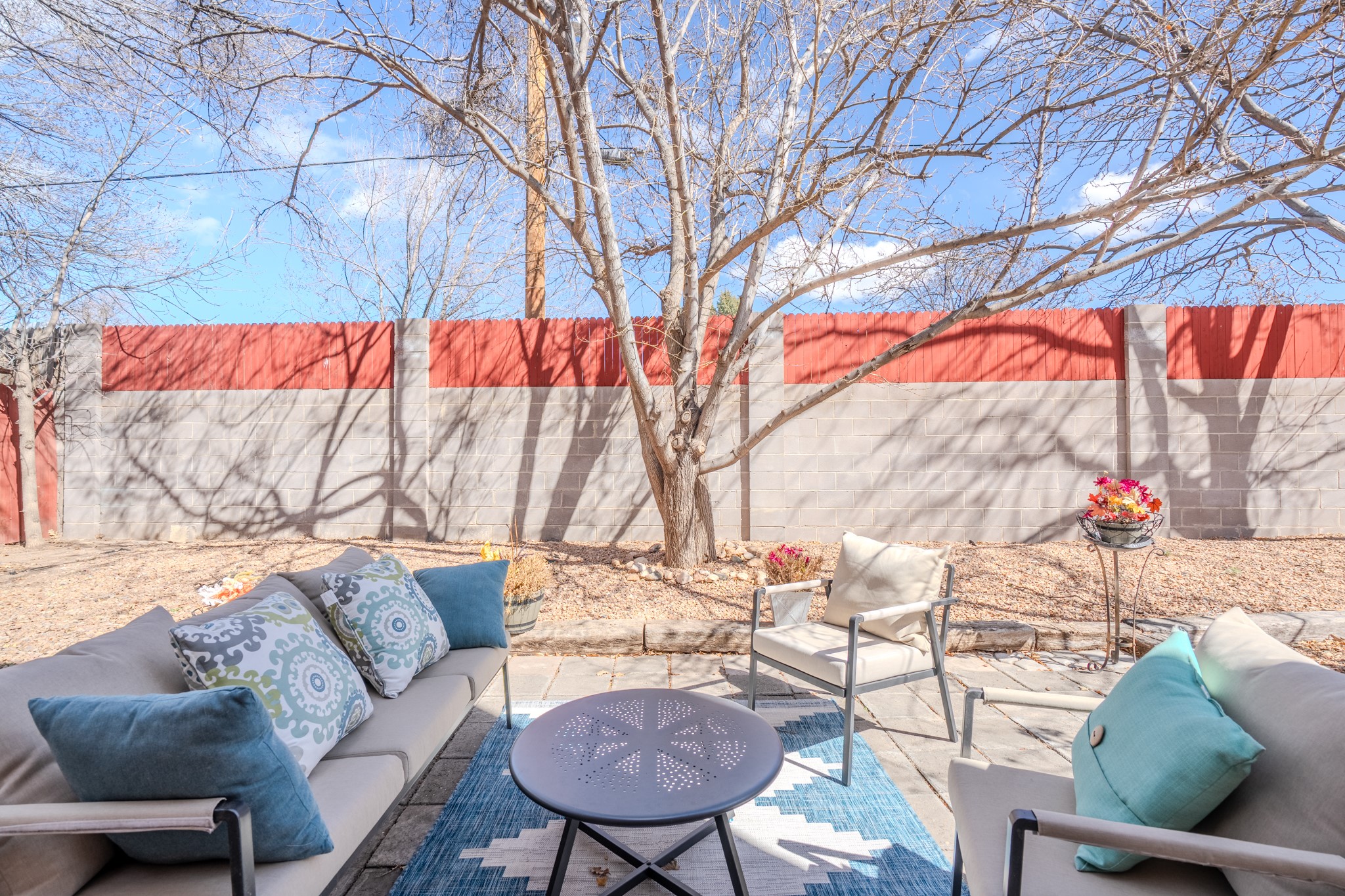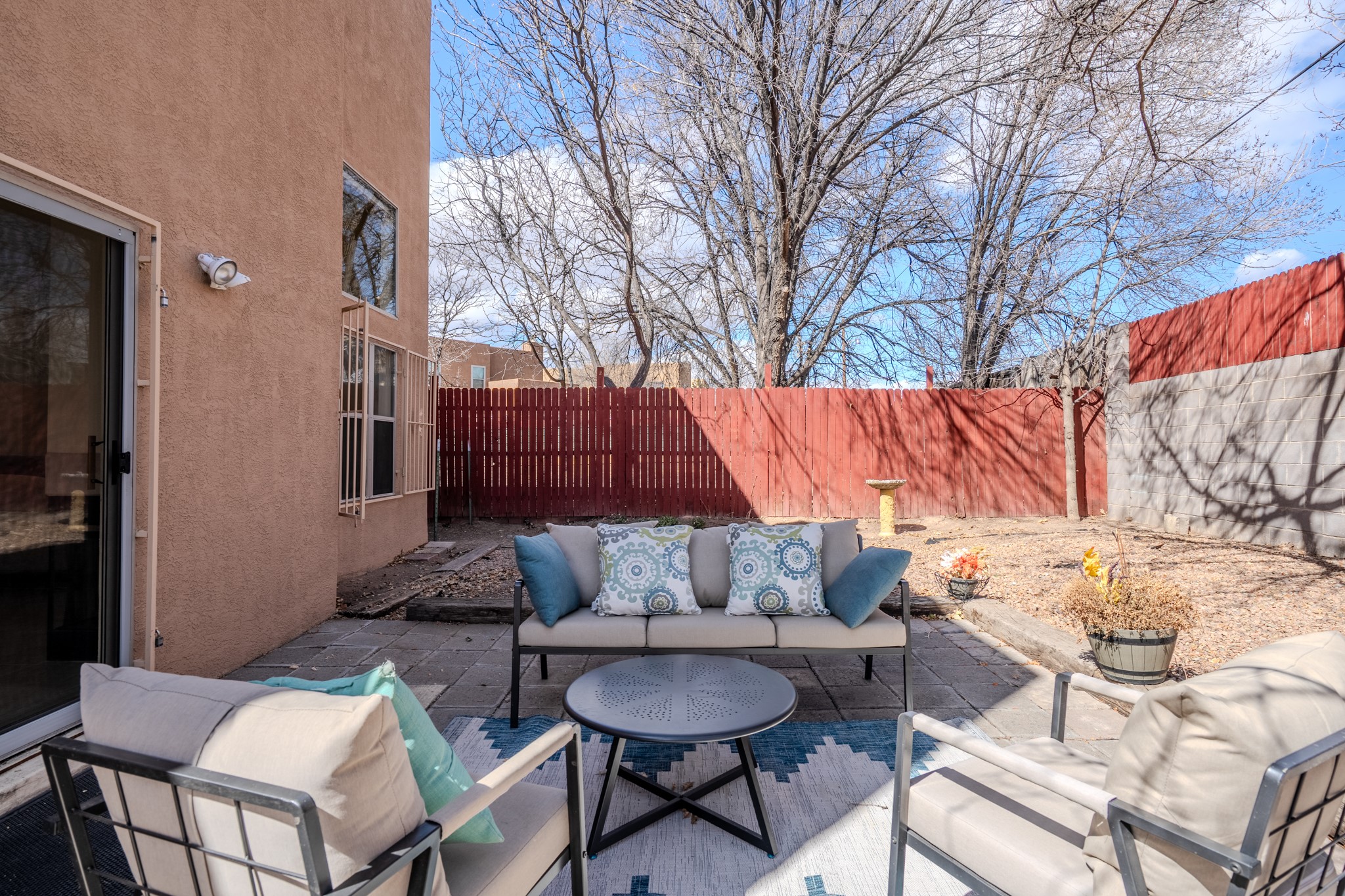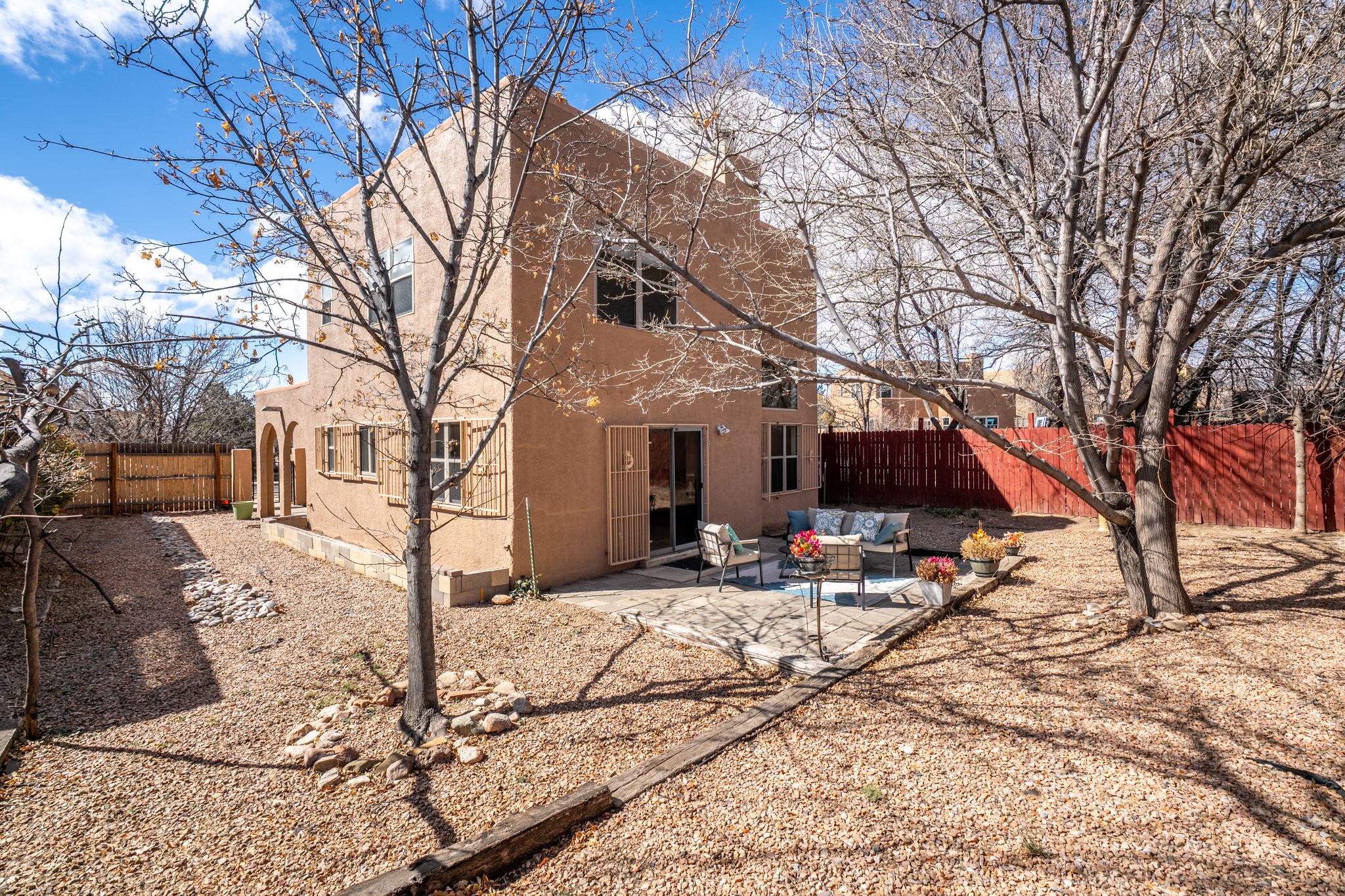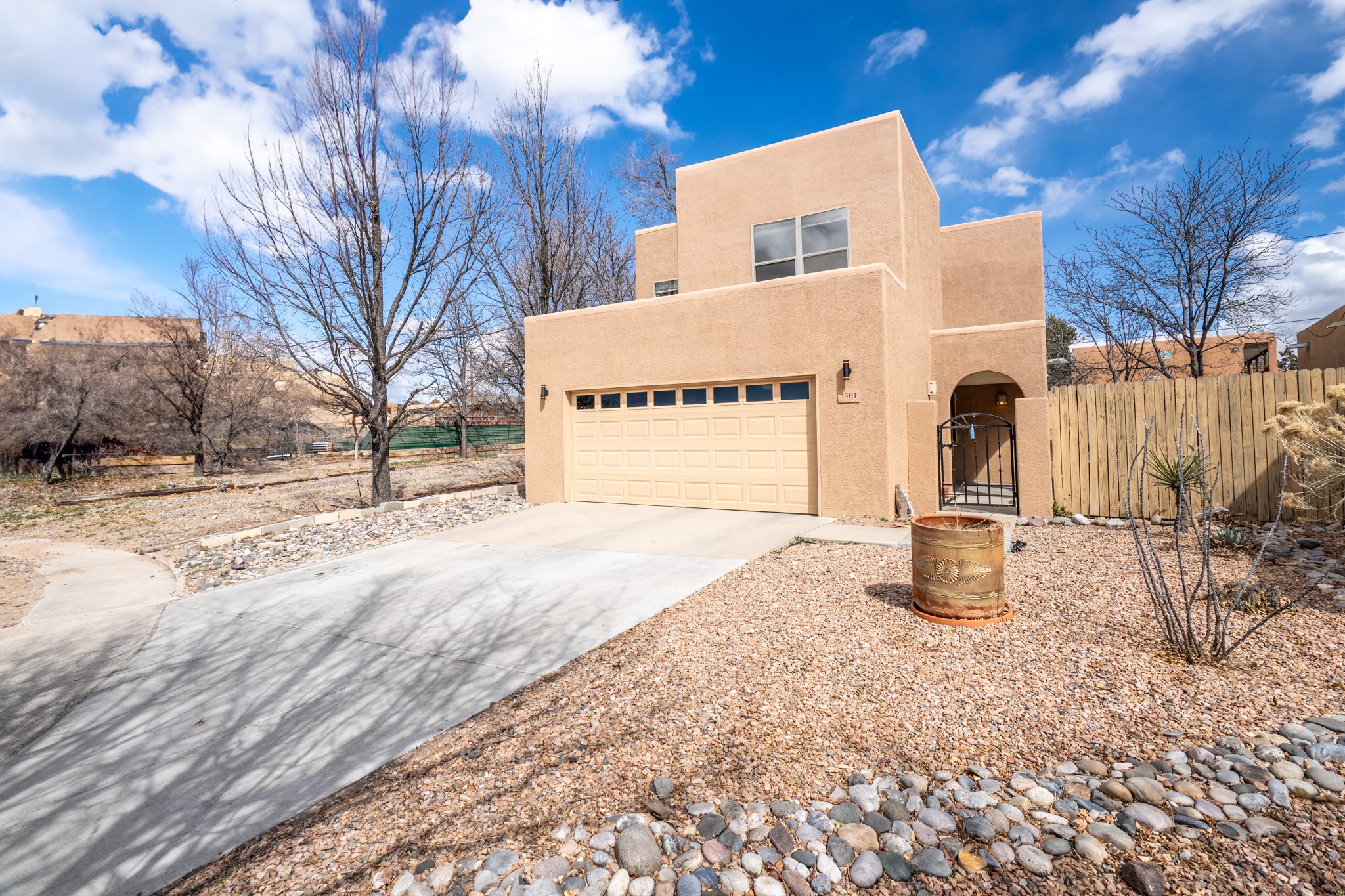 Priced $41,000 below appraisal and pre-inspected, this beautifully updated, light, and bright 3-bedroom, 2.5-bathroom home is situated on a quiet cul-de-sac providing a peaceful and very private ambiance in the heart of central Santa Fe. The two-story design boasts an open and airy layout, accentuated by soaring ceilings in the living room, clearstory picture windows that flood the space with natural light, and a charming wood-burning fireplace. Central refrigerated air conditioning and skylights throughout ensure year-round comfort and a welcoming atmosphere.The modernized kitchen shines with elegant granite countertops and stainless steel appliances complementing the home's contemporary feel. The updated bathrooms feature tasteful finishes that add a touch of luxury. The master suite is a serene retreat, complete with an ensuite bathroom and a generously sized walk-in closet, providing ample storage and privacy.Outdoor living is a delight with a fully enclosed, gated courtyard and an expansive yard shaded by lovely mature trees, offering both privacy and beautiful green screening during the warmer months. The patio area is ideal for outdoor entertaining or simply relaxing in the tranquil surroundings. Adding to the sense of seclusion, an unbuildable lot next door enhances the privacy and provides additional space.Practicality meets convenience with an attached 2-car garage and no HOA fees. Centrally located, this home is just minutes from shopping, parks, restaurants, fitness centers, and schools, making it an ideal spot for easy, everyday living. This stunning Santa Fe home offers a rare combination of modern updates, spacious design, and an unbeatable location.