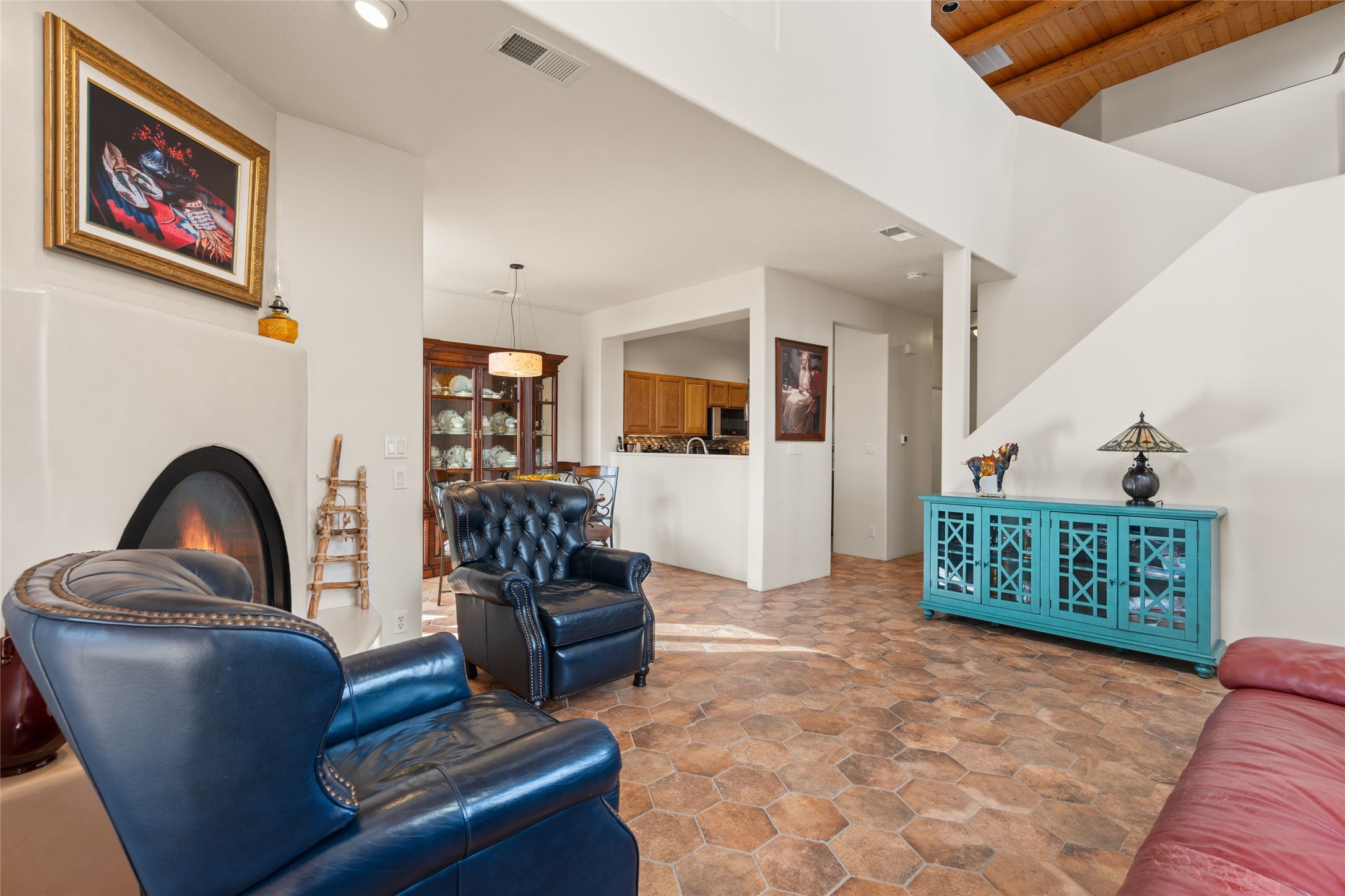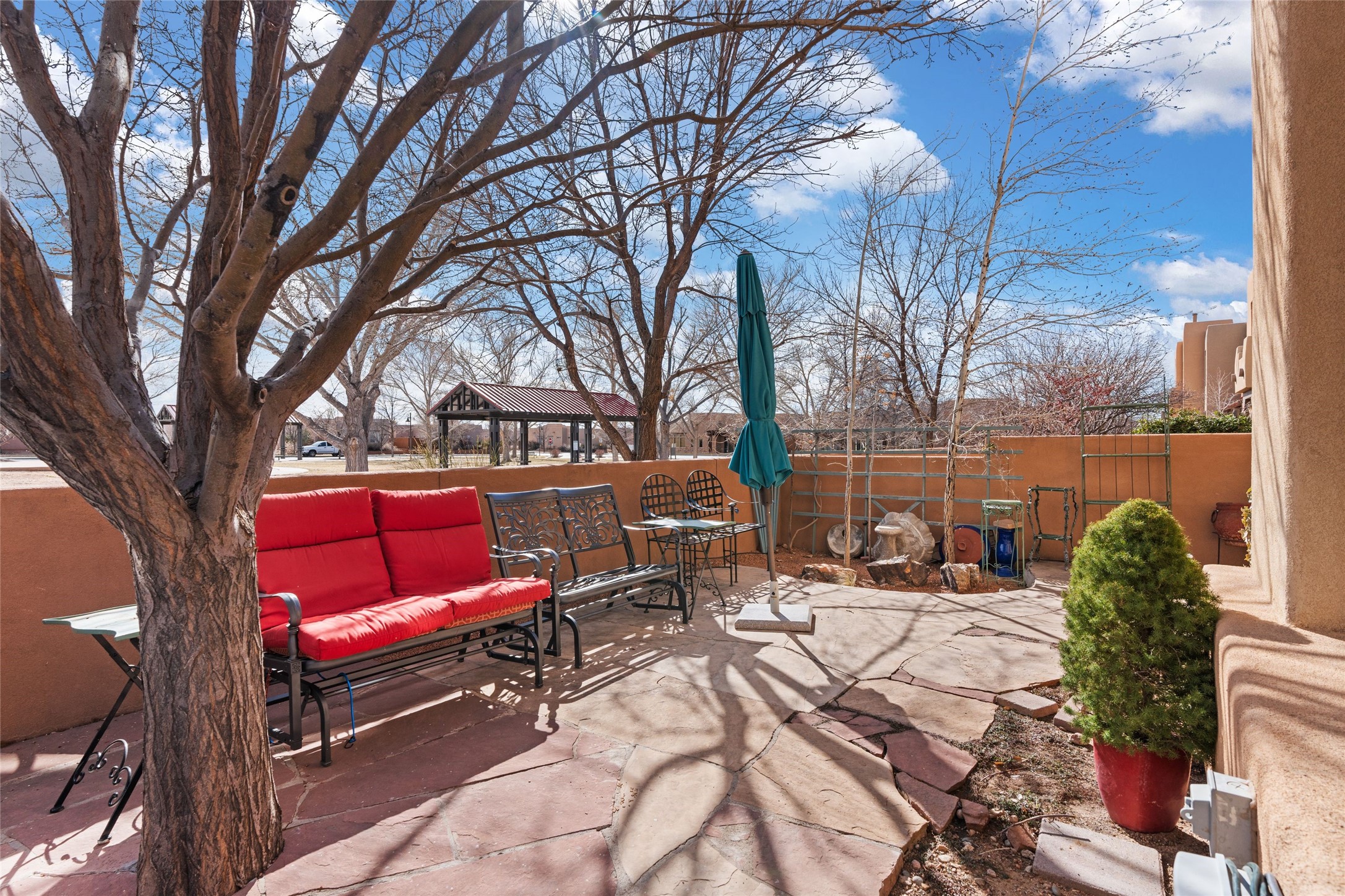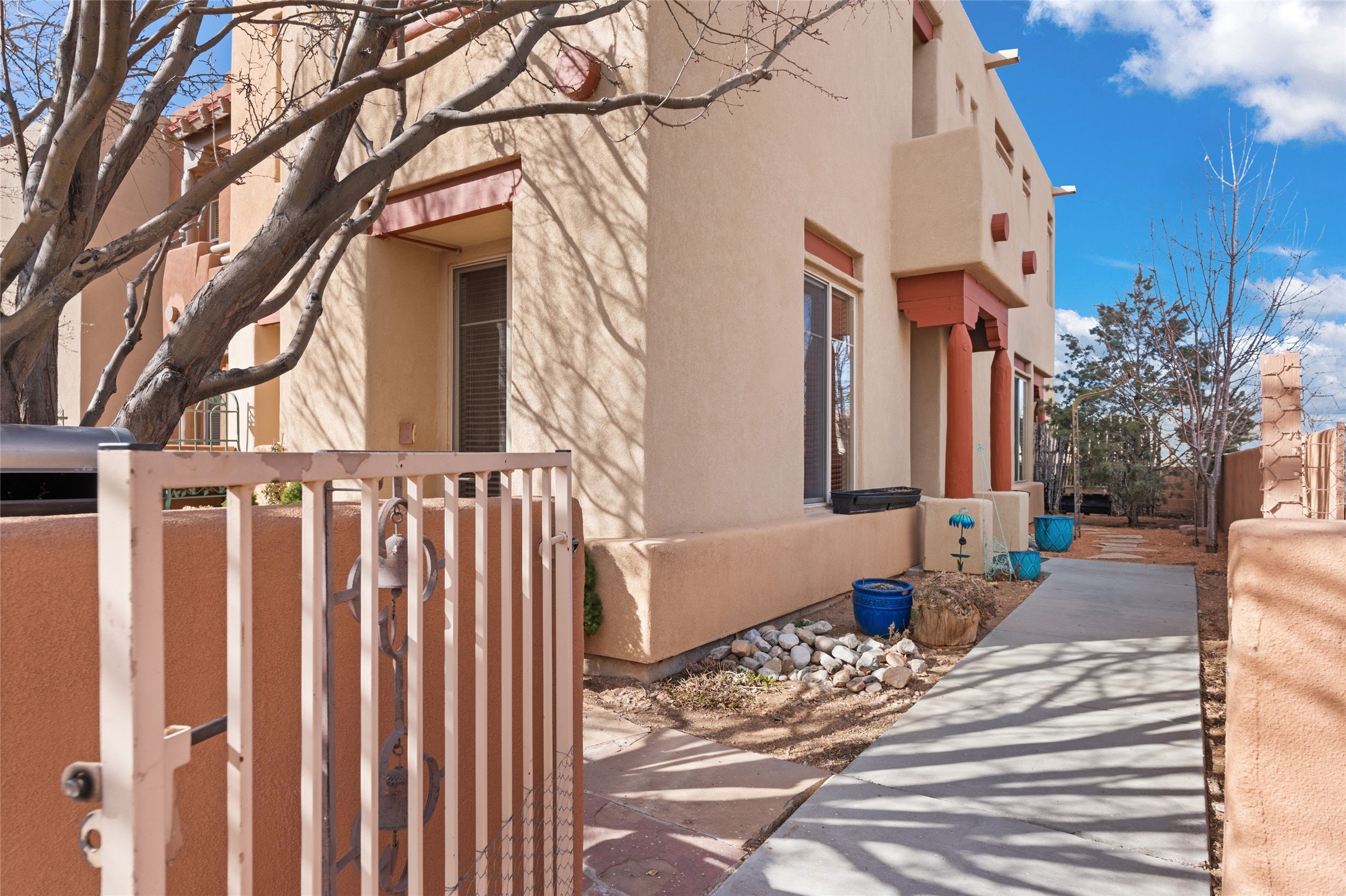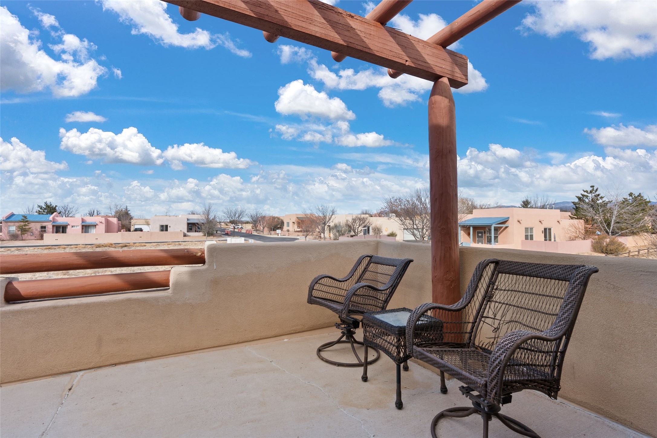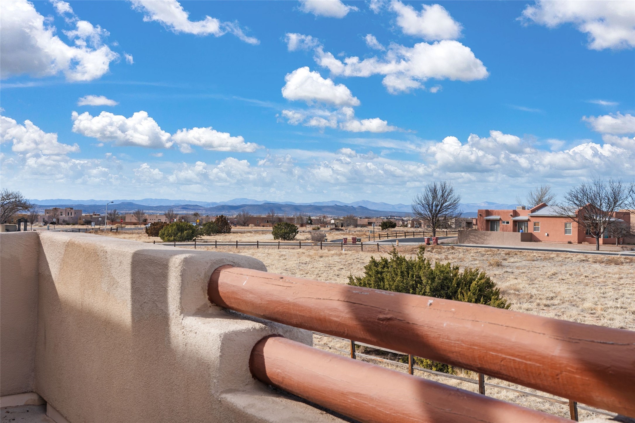 Premier townhome with great light and amazing views from upper deck. Three-bedroom home with three full baths. Prime location on the corner across from the park and close to walking trails. Open living and dining area with vaulted ceiling and vigas and corner kiva fireplace. Large doors out to the front allow enjoyment of the courtyard and outdoor space. Well-designed kitchen and bar space, good storage throughout the home. The primary bedroom upstairs with ensuite and large walk-in closet is separated from the second upstairs bedroom by a large landing area and office or sitting room space. Features a second story viewing deck is spacious and sunny and is the perfect place to view the wonderful Santa Fe sky. There is one bedroom downstairs with a full bath. Rear entry two-car garage and plenty of guest parking.