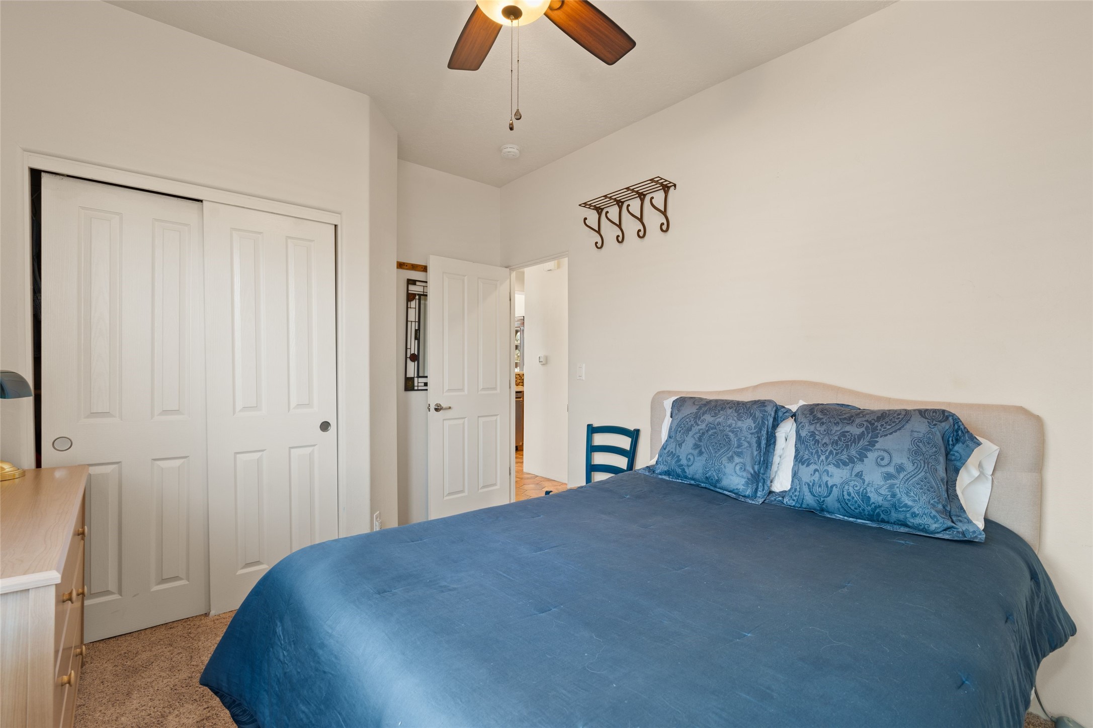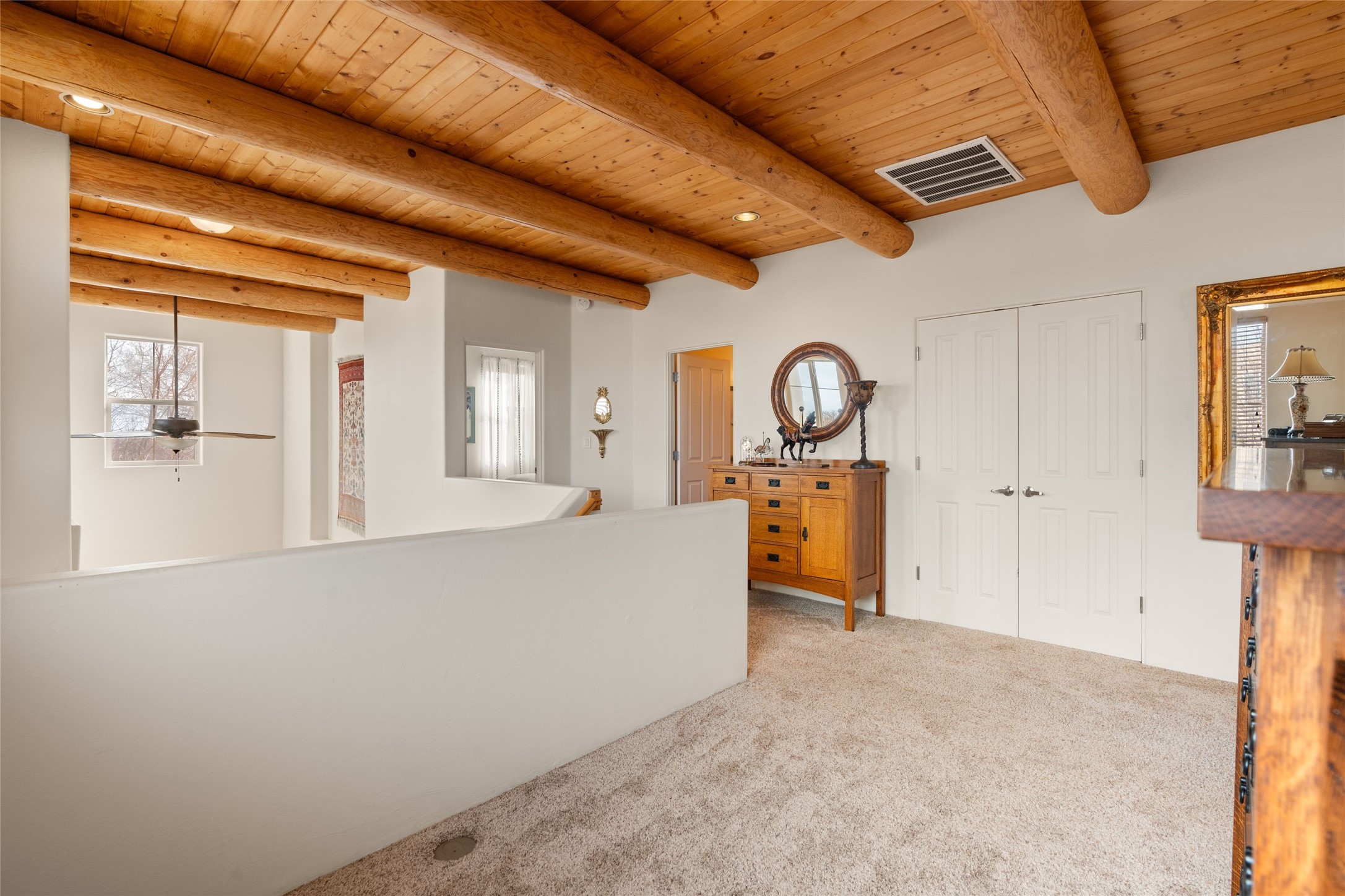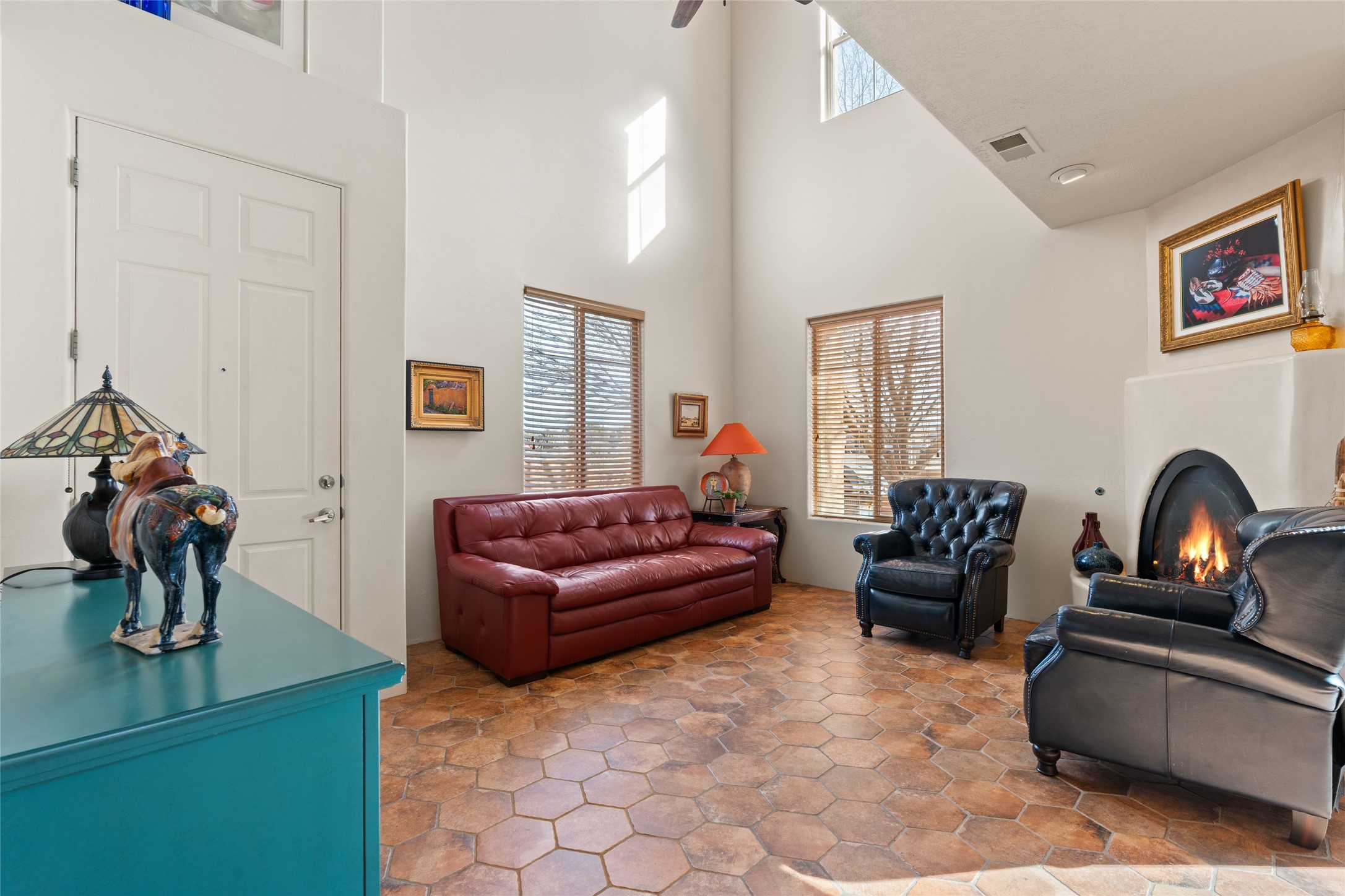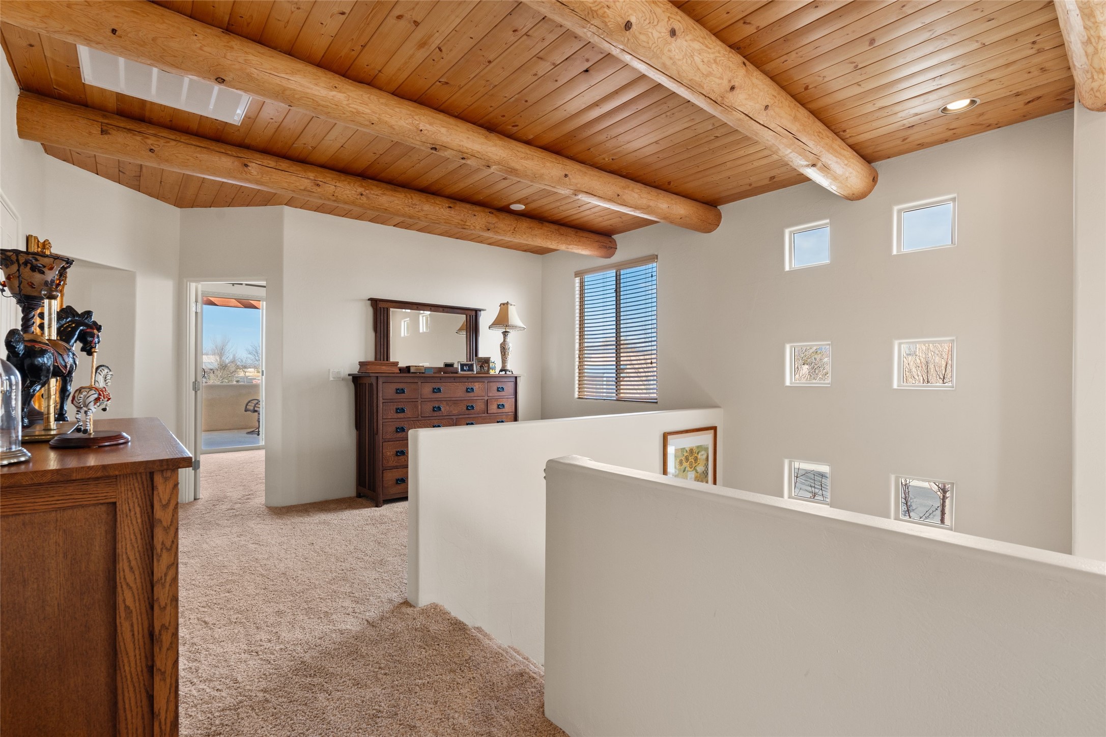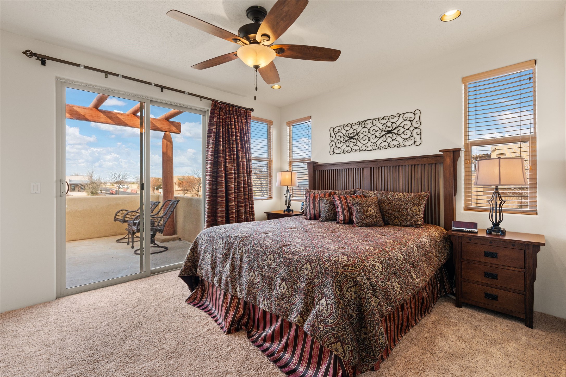Premier townhome with great light and amazing views from upper deck. Three-bedroom home with three full baths. Prime location on the corner across from the park and close to walking trails. Open living and dining area with vaulted ceiling and vigas and corner kiva fireplace. Large doors out to the front allow enjoyment of the courtyard and outdoor space. Well-designed kitchen and bar space, good storage throughout the home. The primary bedroom upstairs with ensuite and large walk-in closet is separated from the second upstairs bedroom by a large landing area and office or sitting room space. Features a second story viewing deck is spacious and sunny and is the perfect place to view the wonderful Santa Fe sky. There is one bedroom downstairs with a full bath. Rear entry two-car garage and plenty of guest parking.