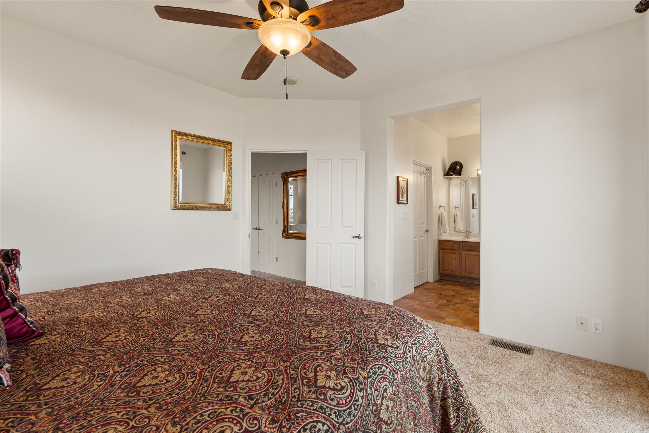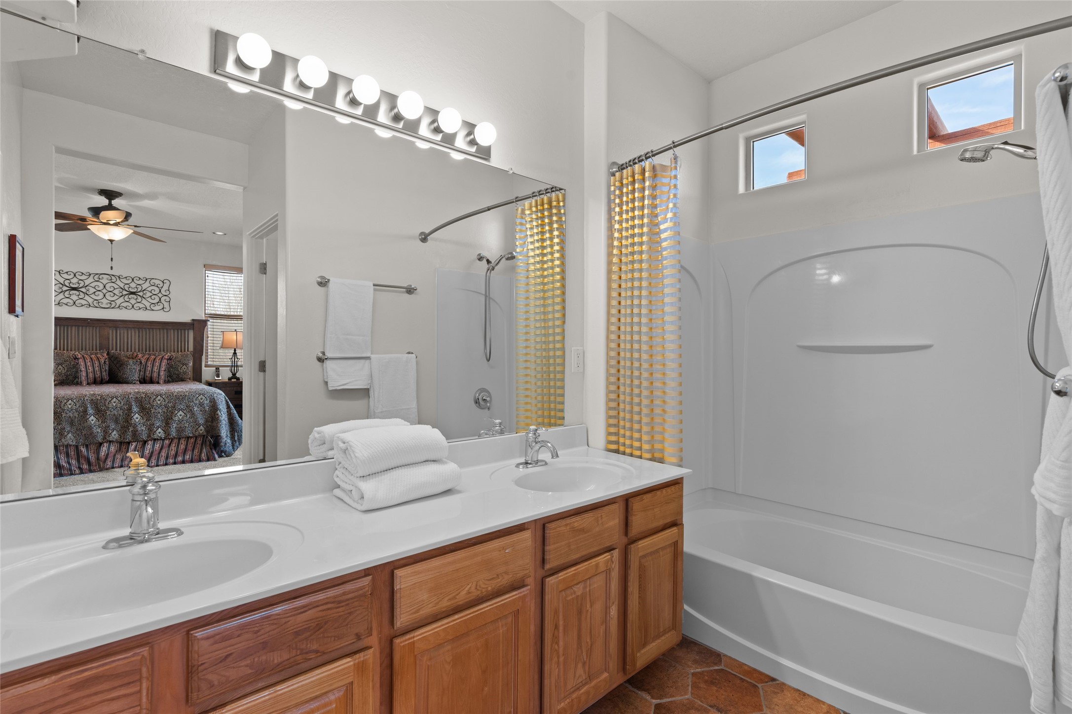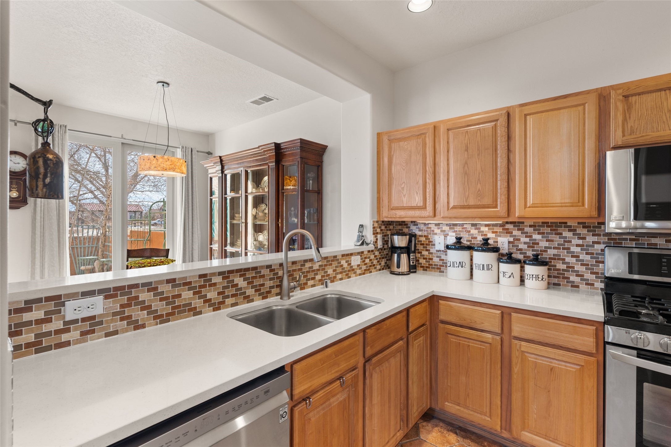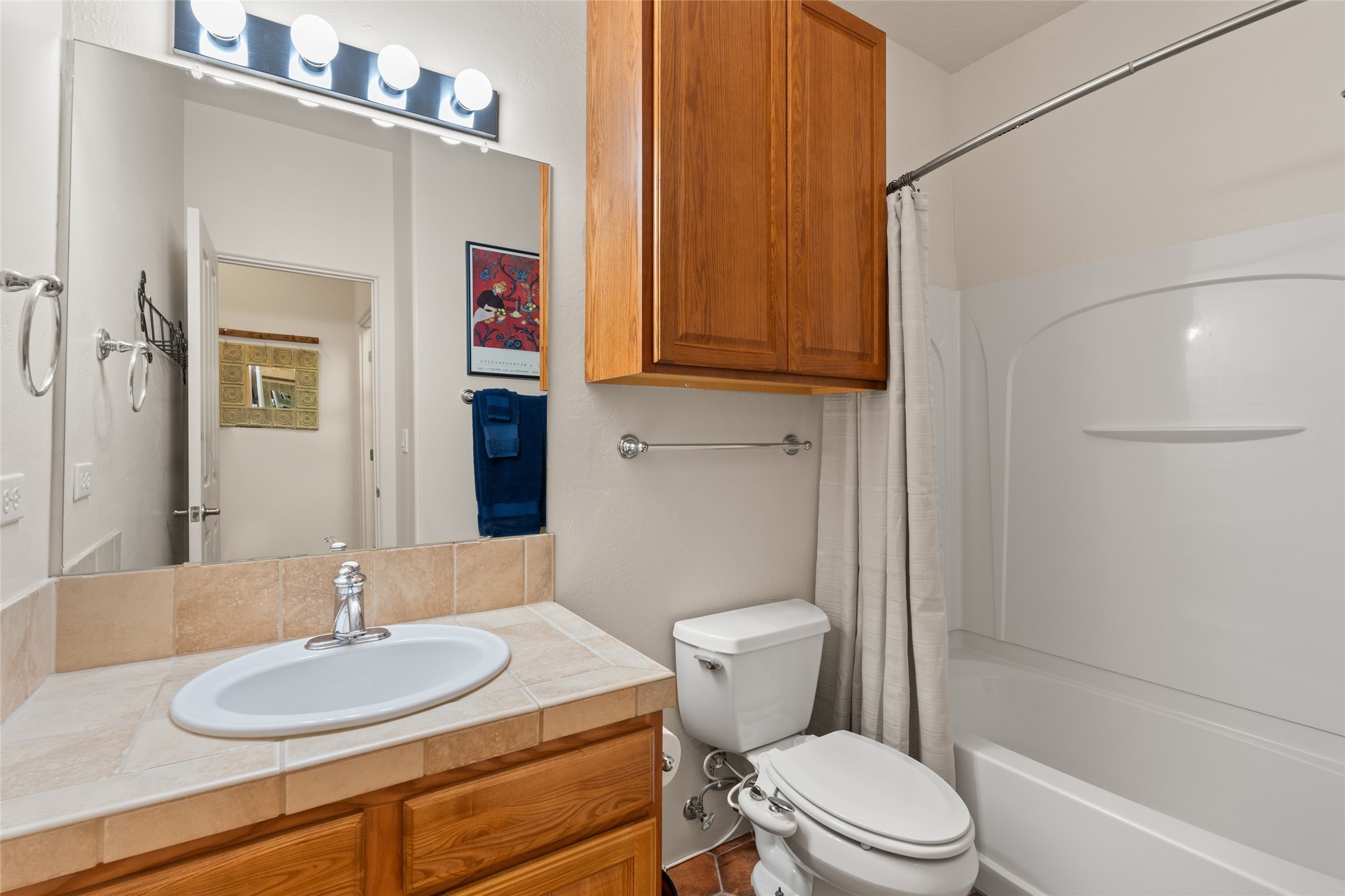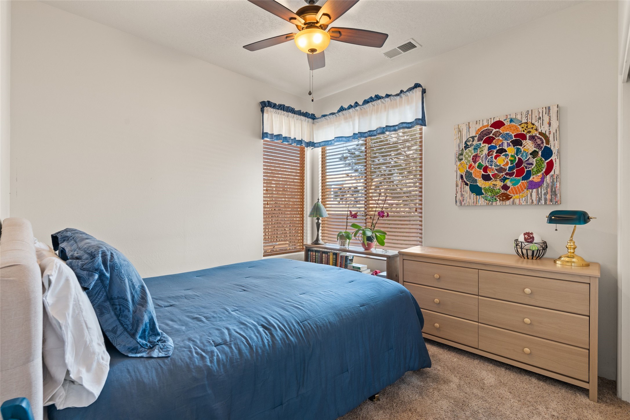 Premier townhome with great light and amazing views from upper deck. Three-bedroom home with three full baths. Prime location on the corner across from the park and close to walking trails. Open living and dining area with vaulted ceiling and vigas and corner kiva fireplace. Large doors out to the front allow enjoyment of the courtyard and outdoor space. Well-designed kitchen and bar space, good storage throughout the home. The primary bedroom upstairs with ensuite and large walk-in closet is separated from the second upstairs bedroom by a large landing area and office or sitting room space. Features a second story viewing deck is spacious and sunny and is the perfect place to view the wonderful Santa Fe sky. There is one bedroom downstairs with a full bath. Rear entry two-car garage and plenty of guest parking.