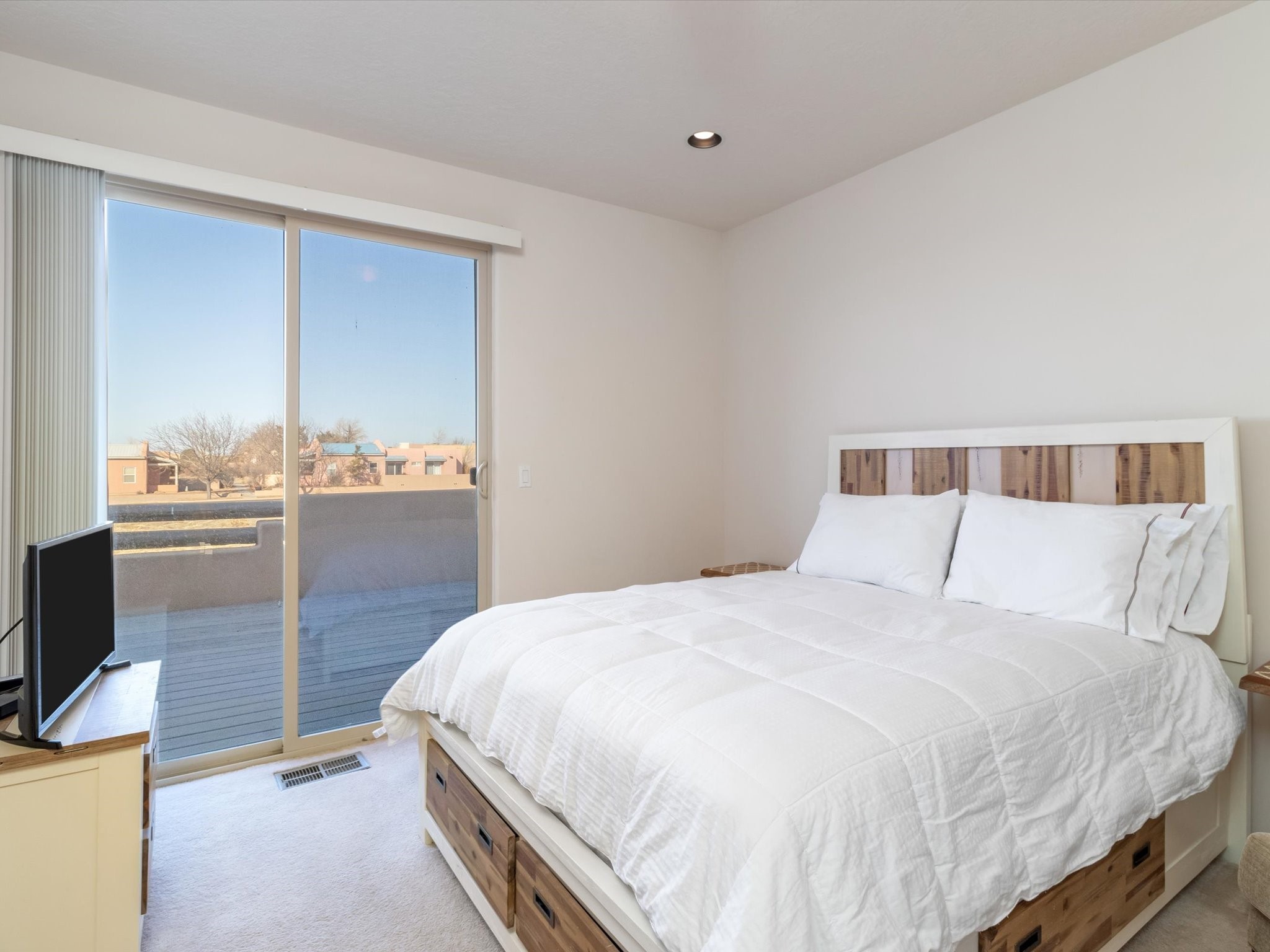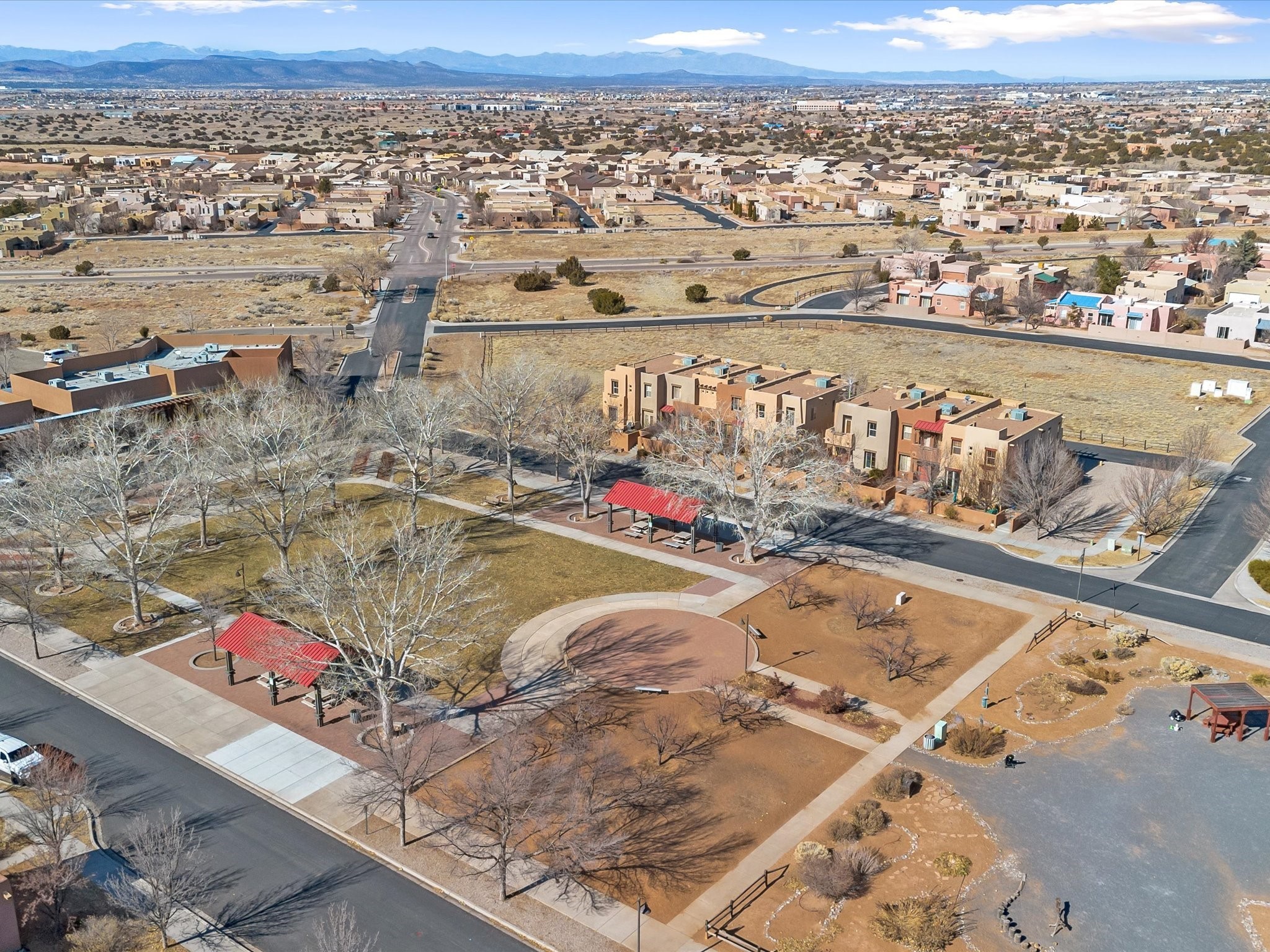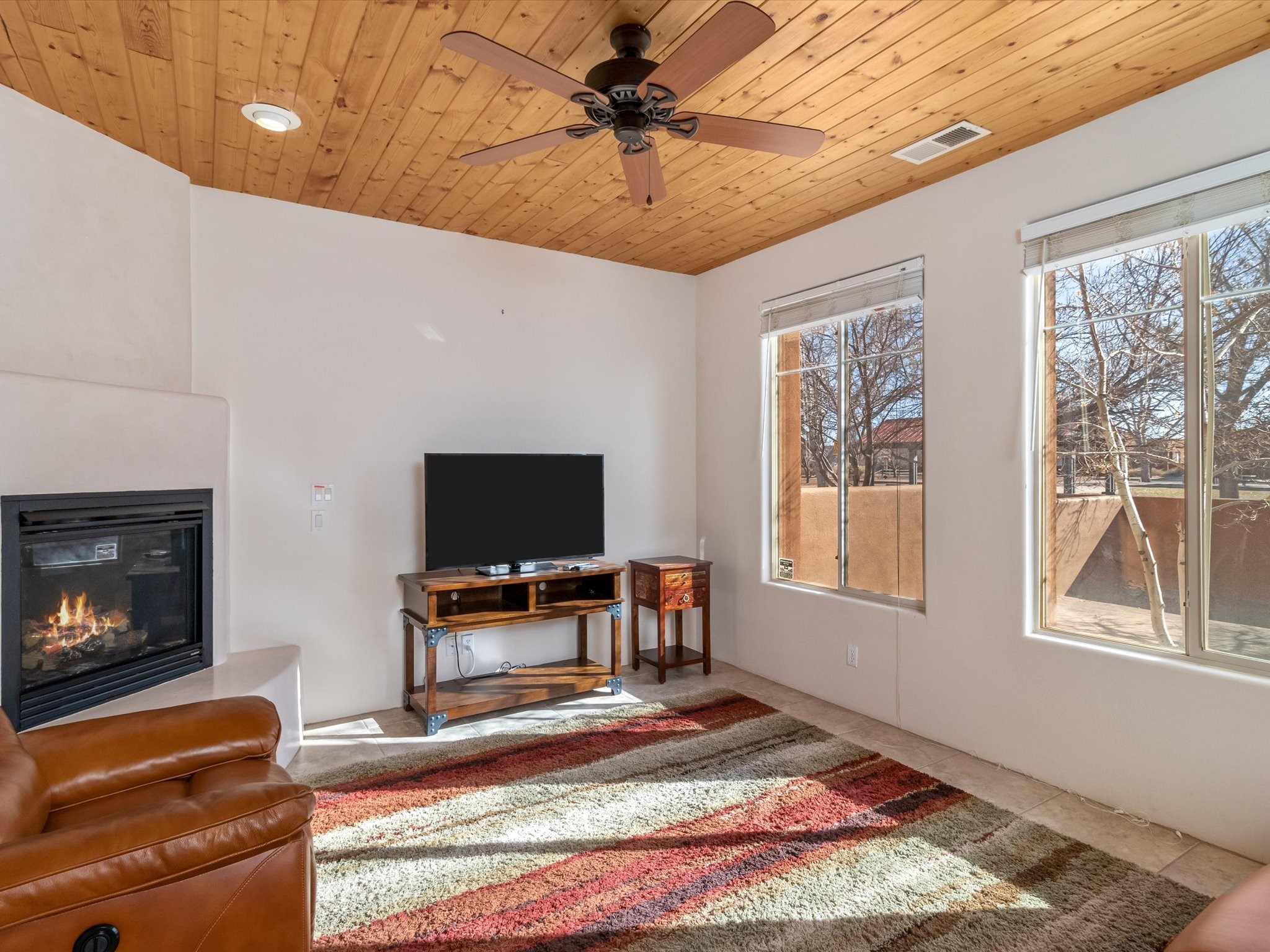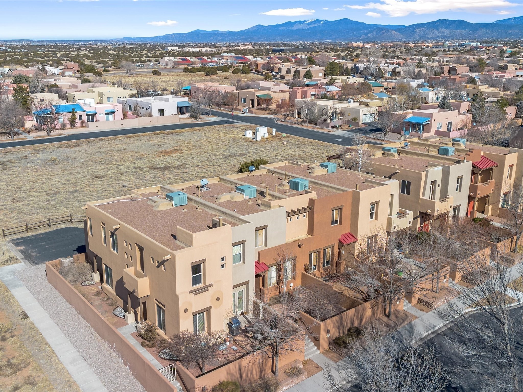 Welcome to this comfortable and warm townhome, gently lived in and located directly across from Rancho Viejo Village Park Plaza. As you step inside, you're greeted by charming tongue and groove ceilings that open up to a spacious living area--ideal for easy entertaining and everyday living. This home features 2 bedrooms, each with their own en-suite bathrooms, offering privacy and convenience. The primary bedroom opens to a large deck with stunning views, perfect for relaxing outdoors. Enjoy the natural light that floods each room, creating a bright and welcoming atmosphere. The thoughtful floor plan provides excellent separation between the bedrooms, ensuring peace and privacy. A generous front courtyard adds to the charm, offering an inviting space for outdoor gatherings or quiet moments in the fresh air. The home is surrounded by beautiful trails and ample open space for outdoor activities, and is conveniently located near Santa Fe Community College with easy access to I-25 for quick commutes. This townhome is a perfect blend of comfort, convenience, and scenic beauty. Don't wait to schedule a private showing today!