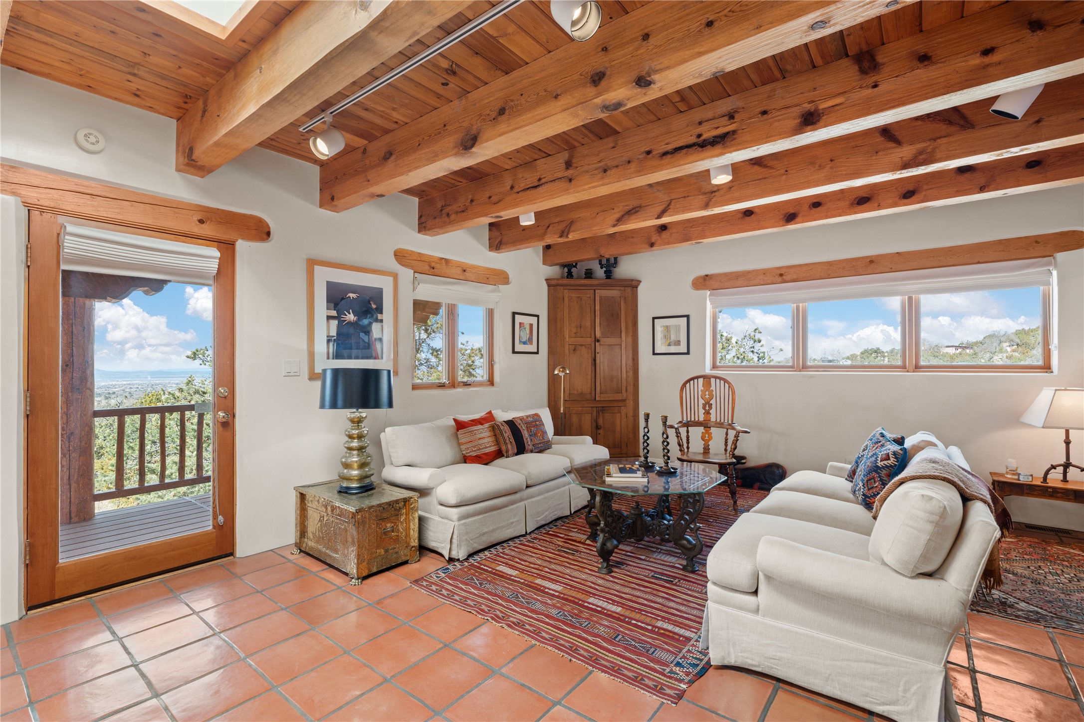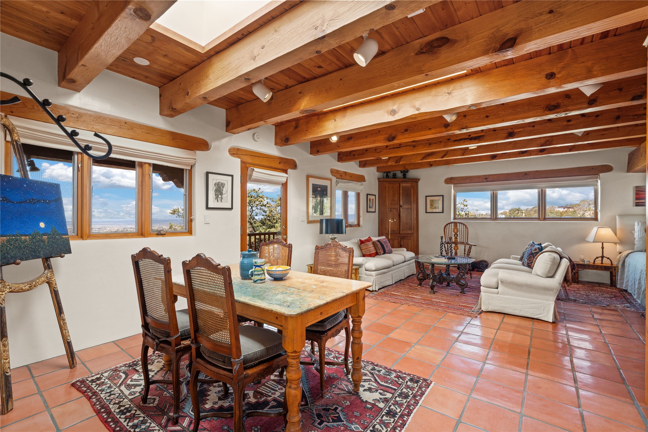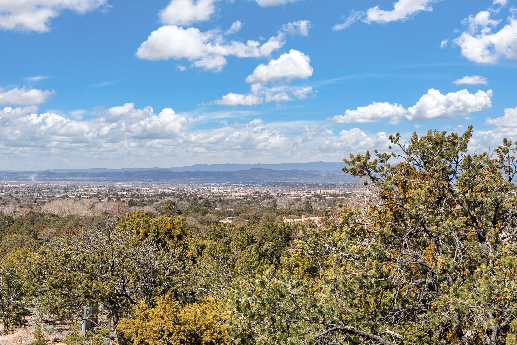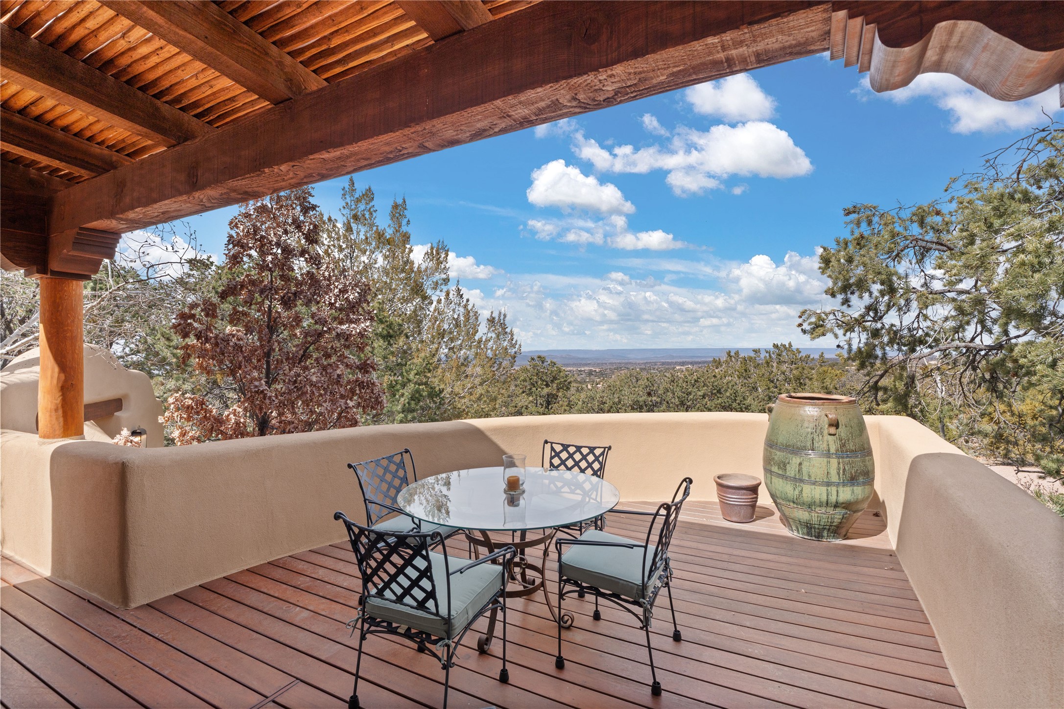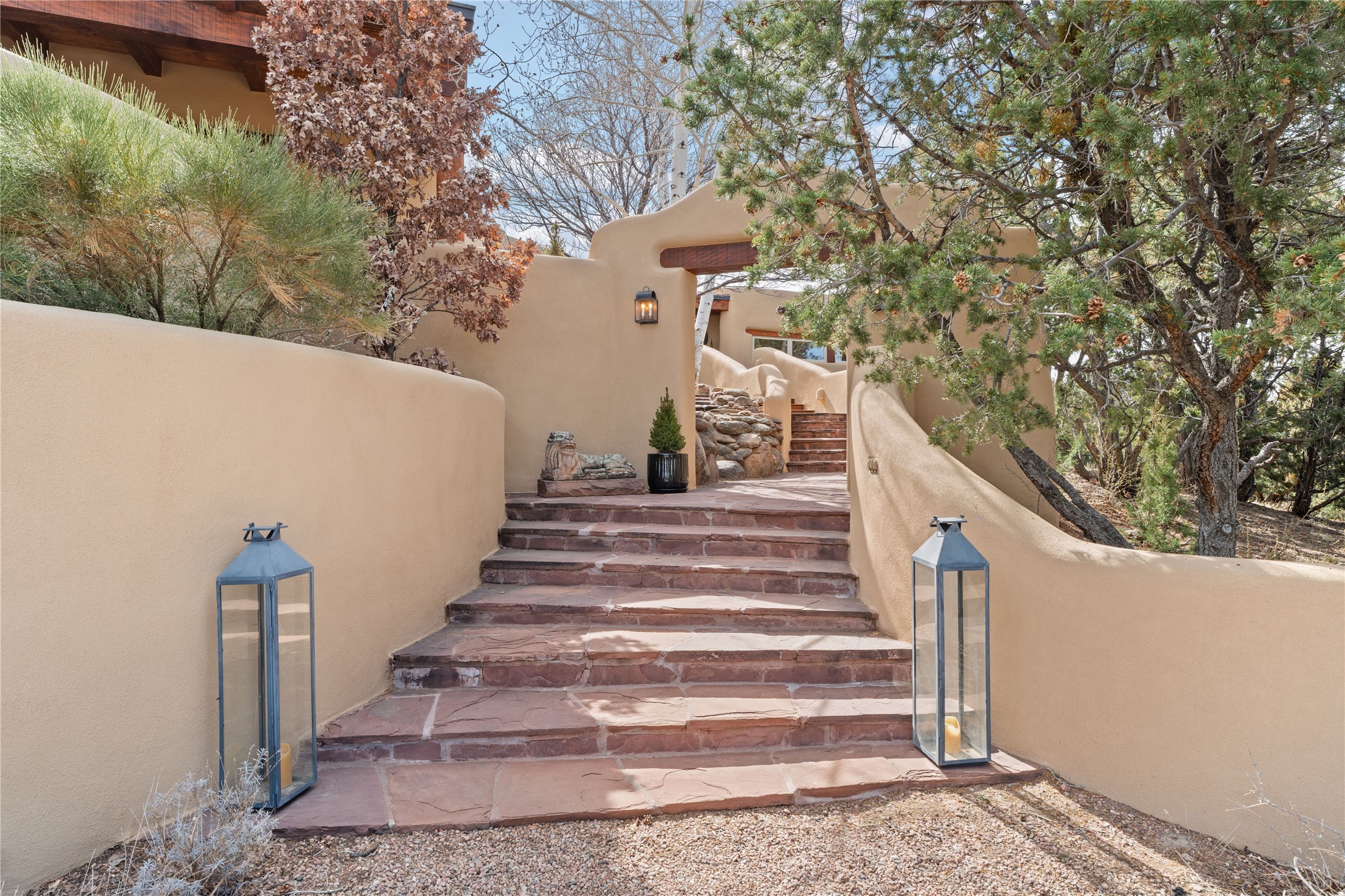 Nestled at the base of Sun and Moon Mountains, this exquisite adobe residence designed by Ken Mackenzie, and its charming casita, offer unparalleled views and masterful craftsmanship. Set amidst dramatic rock outcroppings, the home is accessed via a flagstone staircase surrounded by mature landscaping and a cascading water feature.Inside, curvaceous adobe walls create a seamless flow between distinct living areas. The cozy family room, featuring built-in bookshelves, banco seating, and a wood-burning fireplace, opens to a chef's kitchen with generous storage and ample prep-space. Adjacent to the kitchen, an intimate dining room is elevated above the living area, providing both a sense of architectural interest and breathtaking views of the Jemez Mountains and city lights. Two sets of sliding doors open to a mahogany deck, extending the living space and inviting you to enjoy the airy interplay between interior and exterior spaces.The primary suite offers a tranquil retreat with two bedrooms, one of which enjoys a kiva fireplace and a secluded flagstone patio, while the other can serve as a versatile office, den, or exercise space, with access to a private deck and incredible views. Both bedrooms share a spa-inspired bathroom with a double vanity and soaking tub, as well as a half bath. On the opposite side of the home, two additional bedrooms share a stylish 3/4-bath. Coved ceilings, plaster walls, built-ins and nichos enhance the charm and warmth of the home.An elevated 624-square-foot casita captures stunning views from its large windows and west-facing deck. The light-filled floor plan includes a kitchenette and 3/4-bath. An additional 130-square foot studio can be used for a variety of purposes. The exceptional foothill location provides immediate access to hiking trails and nearby Museum Hill. The property is well-maintained with pride of ownership reflected in the newer roof, stucco and mini-splits for cooling. Sited on 4.7 acres, this property is the perfect blend of peaceful living, stunning design, and unmatched views--truly a one-of-a-kind home.