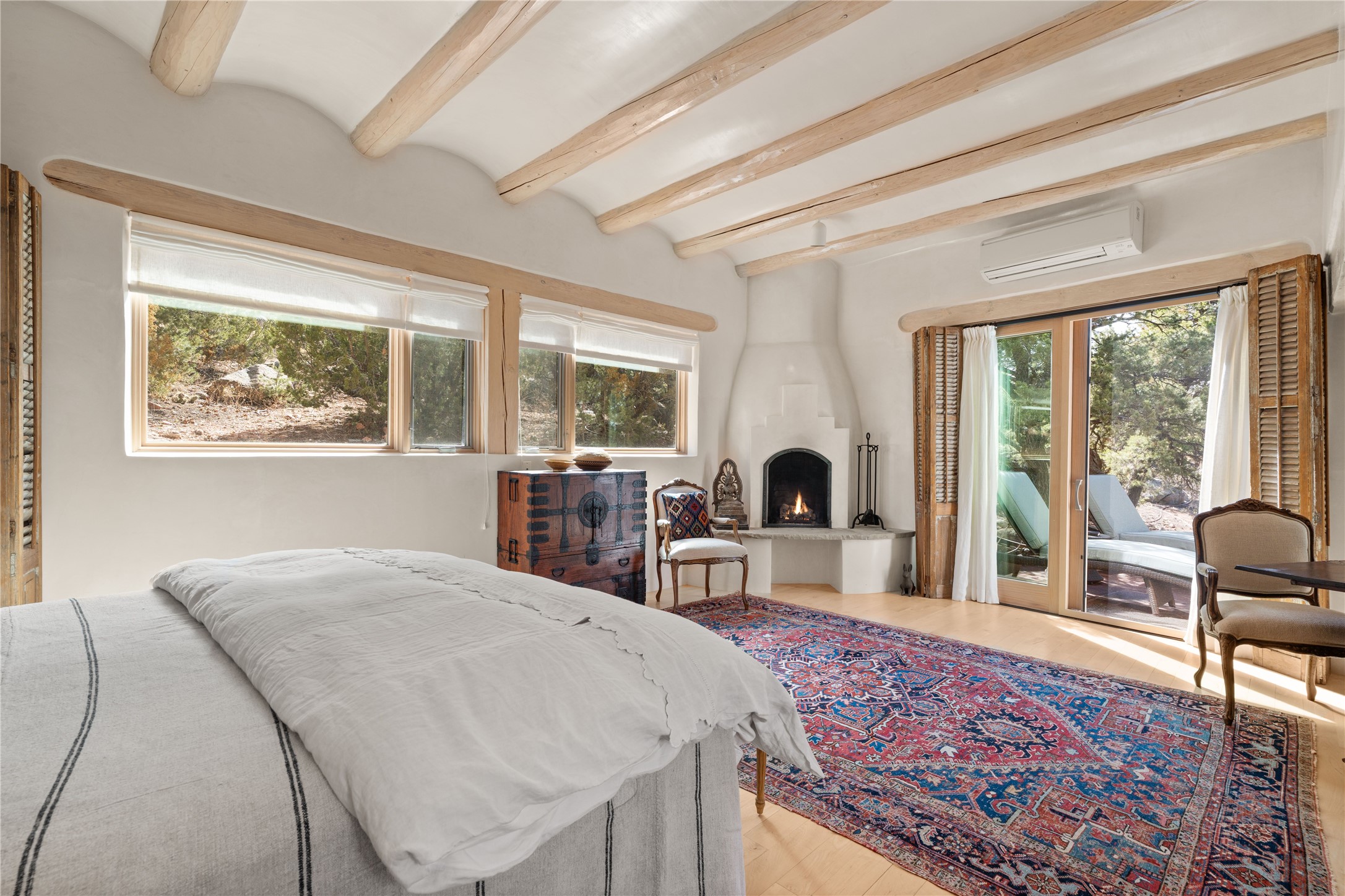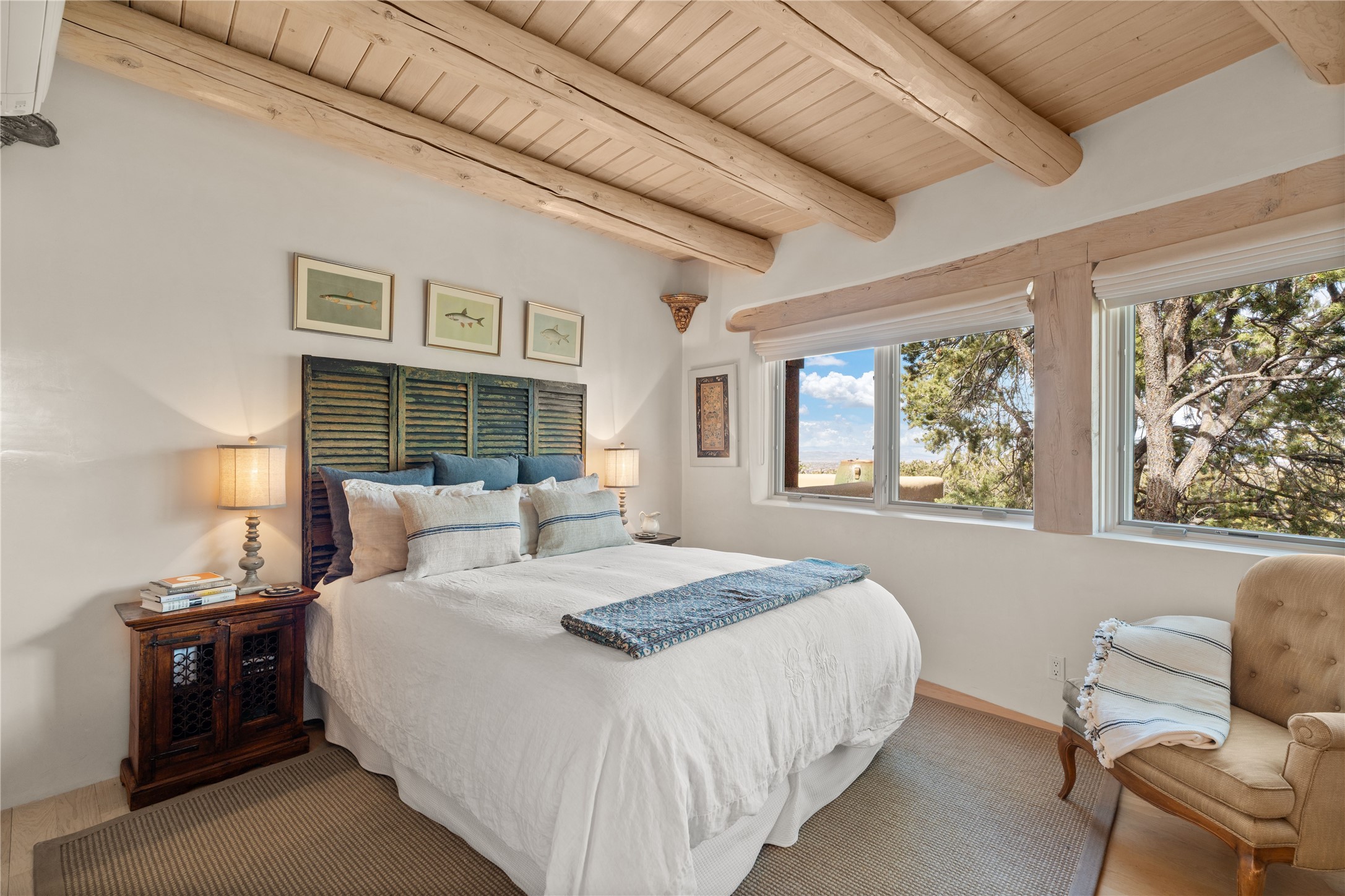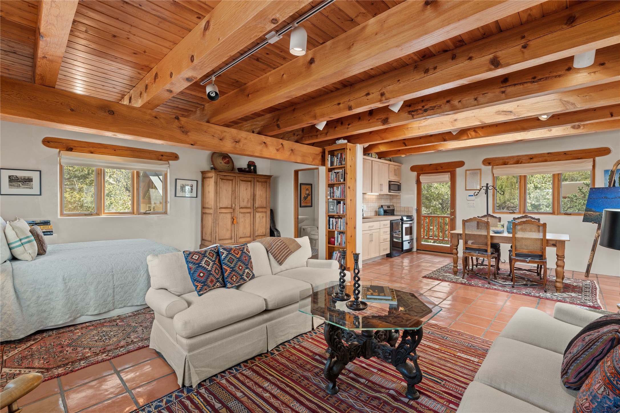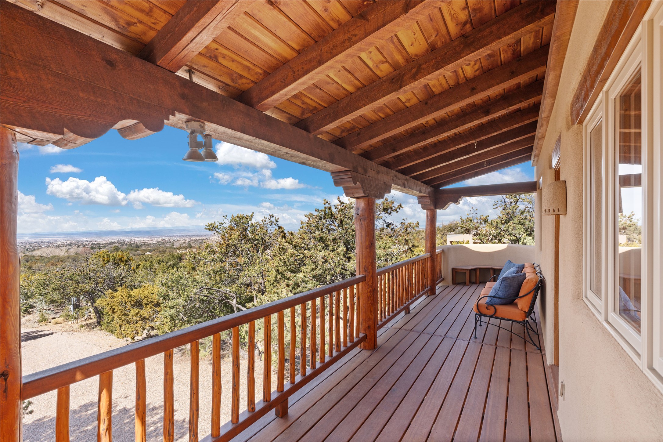 Nestled at the base of Sun and Moon Mountains, this exquisite adobe residence designed by Ken Mackenzie, and its charming casita, offer unparalleled views and masterful craftsmanship. Set amidst dramatic rock outcroppings, the home is accessed via a flagstone staircase surrounded by mature landscaping and a cascading water feature.Inside, curvaceous adobe walls create a seamless flow between distinct living areas. The cozy family room, featuring built-in bookshelves, banco seating, and a wood-burning fireplace, opens to a chef's kitchen with generous storage and ample prep-space. Adjacent to the kitchen, an intimate dining room is elevated above the living area, providing both a sense of architectural interest and breathtaking views of the Jemez Mountains and city lights. Two sets of sliding doors open to a mahogany deck, extending the living space and inviting you to enjoy the airy interplay between interior and exterior spaces.The primary suite offers a tranquil retreat with two bedrooms, one of which enjoys a kiva fireplace and a secluded flagstone patio, while the other can serve as a versatile office, den, or exercise space, with access to a private deck and incredible views. Both bedrooms share a spa-inspired bathroom with a double vanity and soaking tub, as well as a half bath. On the opposite side of the home, two additional bedrooms share a stylish 3/4-bath. Coved ceilings, plaster walls, built-ins and nichos enhance the charm and warmth of the home.An elevated 624-square-foot casita captures stunning views from its large windows and west-facing deck. The light-filled floor plan includes a kitchenette and 3/4-bath. An additional 130-square foot studio can be used for a variety of purposes. The exceptional foothill location provides immediate access to hiking trails and nearby Museum Hill. The property is well-maintained with pride of ownership reflected in the newer roof, stucco and mini-splits for cooling. Sited on 4.7 acres, this property is the perfect blend of peaceful living, stunning design, and unmatched views--truly a one-of-a-kind home.