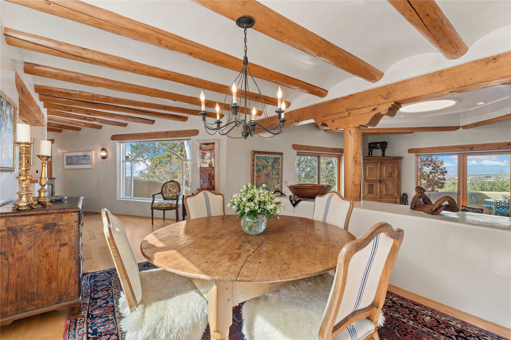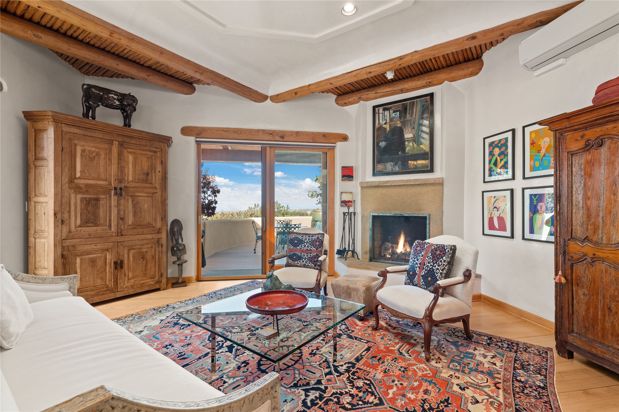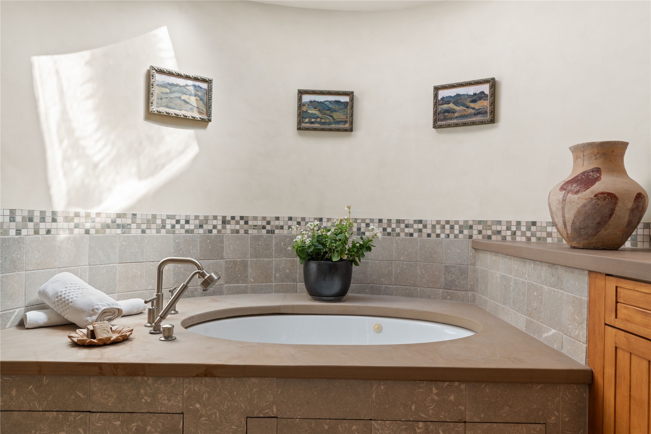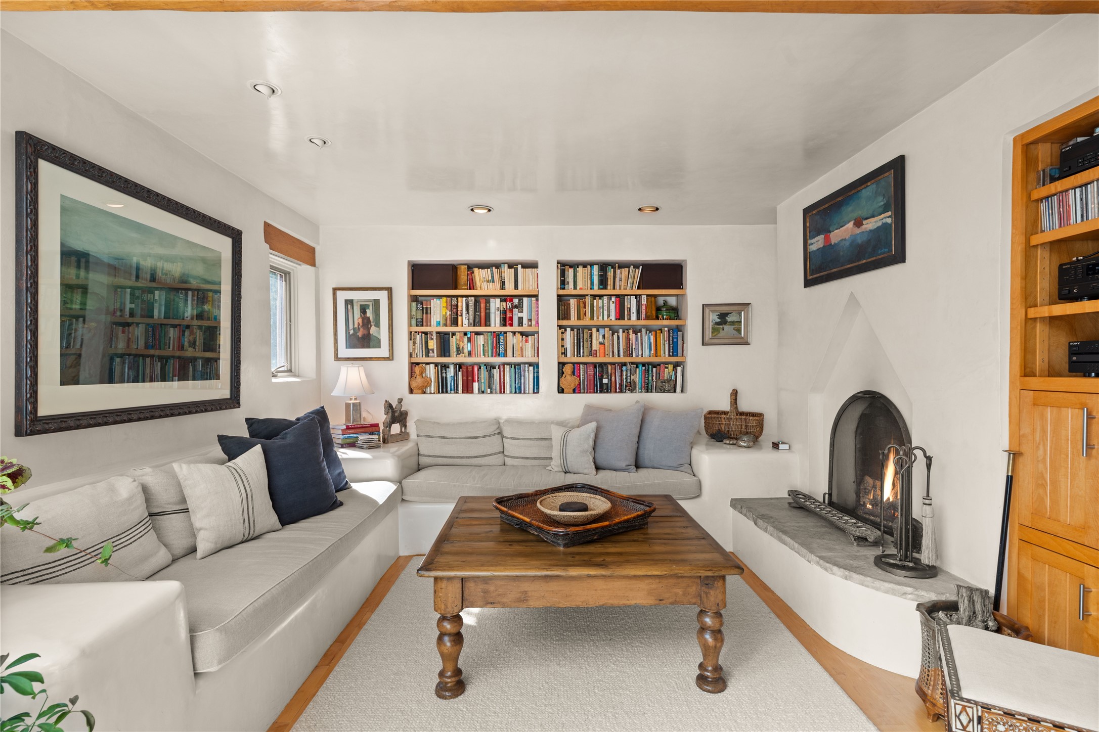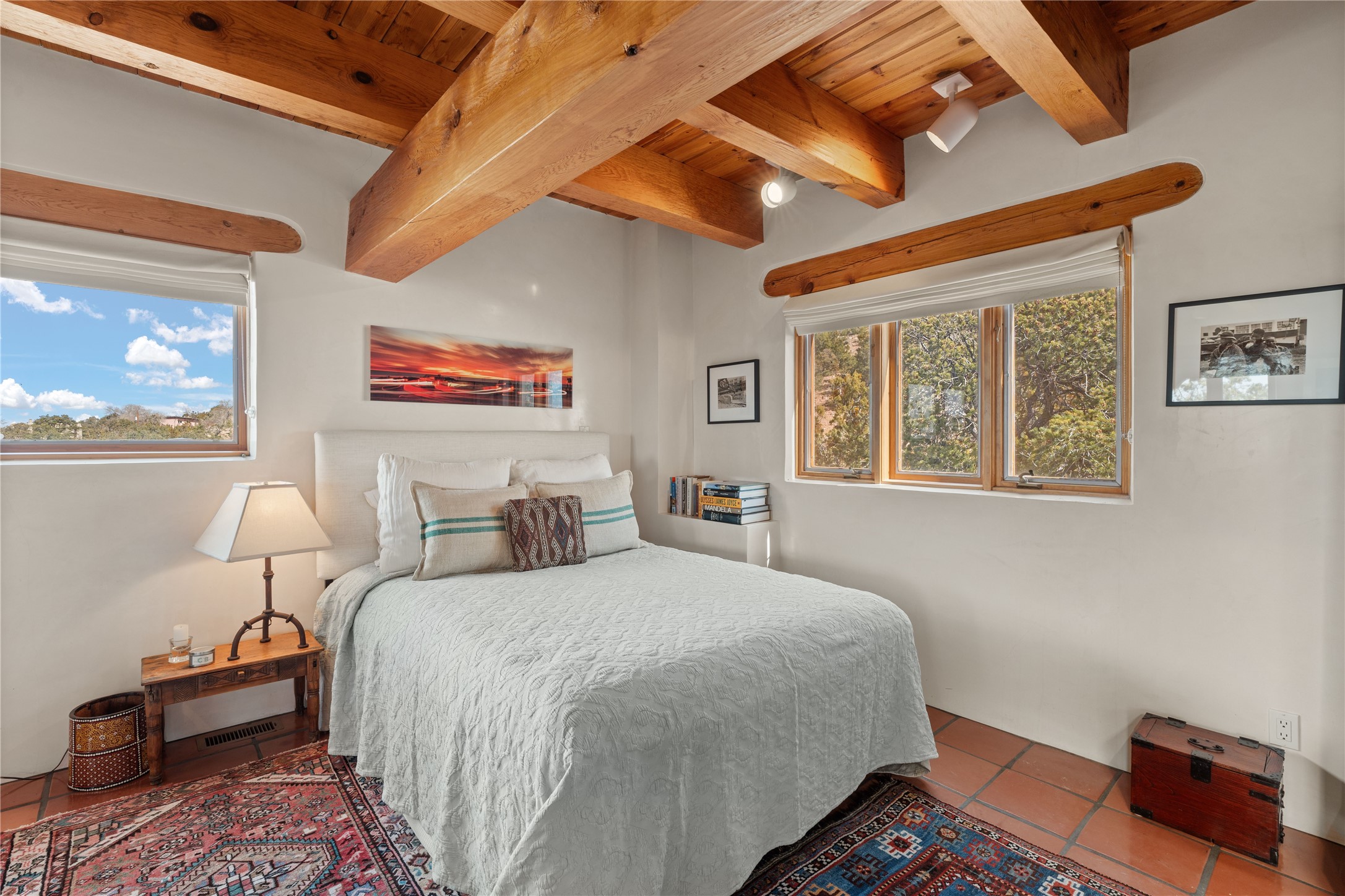 Nestled at the base of Sun and Moon Mountains, this exquisite adobe residence designed by Ken Mackenzie, and its charming casita, offer unparalleled views and masterful craftsmanship. Set amidst dramatic rock outcroppings, the home is accessed via a flagstone staircase surrounded by mature landscaping and a cascading water feature.Inside, curvaceous adobe walls create a seamless flow between distinct living areas. The cozy family room, featuring built-in bookshelves, banco seating, and a wood-burning fireplace, opens to a chef's kitchen with generous storage and ample prep-space. Adjacent to the kitchen, an intimate dining room is elevated above the living area, providing both a sense of architectural interest and breathtaking views of the Jemez Mountains and city lights. Two sets of sliding doors open to a mahogany deck, extending the living space and inviting you to enjoy the airy interplay between interior and exterior spaces.The primary suite offers a tranquil retreat with two bedrooms, one of which enjoys a kiva fireplace and a secluded flagstone patio, while the other can serve as a versatile office, den, or exercise space, with access to a private deck and incredible views. Both bedrooms share a spa-inspired bathroom with a double vanity and soaking tub, as well as a half bath. On the opposite side of the home, two additional bedrooms share a stylish 3/4-bath. Coved ceilings, plaster walls, built-ins and nichos enhance the charm and warmth of the home.An elevated 624-square-foot casita captures stunning views from its large windows and west-facing deck. The light-filled floor plan includes a kitchenette and 3/4-bath. An additional 130-square foot studio can be used for a variety of purposes. The exceptional foothill location provides immediate access to hiking trails and nearby Museum Hill. The property is well-maintained with pride of ownership reflected in the newer roof, stucco and mini-splits for cooling. Sited on 4.7 acres, this property is the perfect blend of peaceful living, stunning design, and unmatched views--truly a one-of-a-kind home.