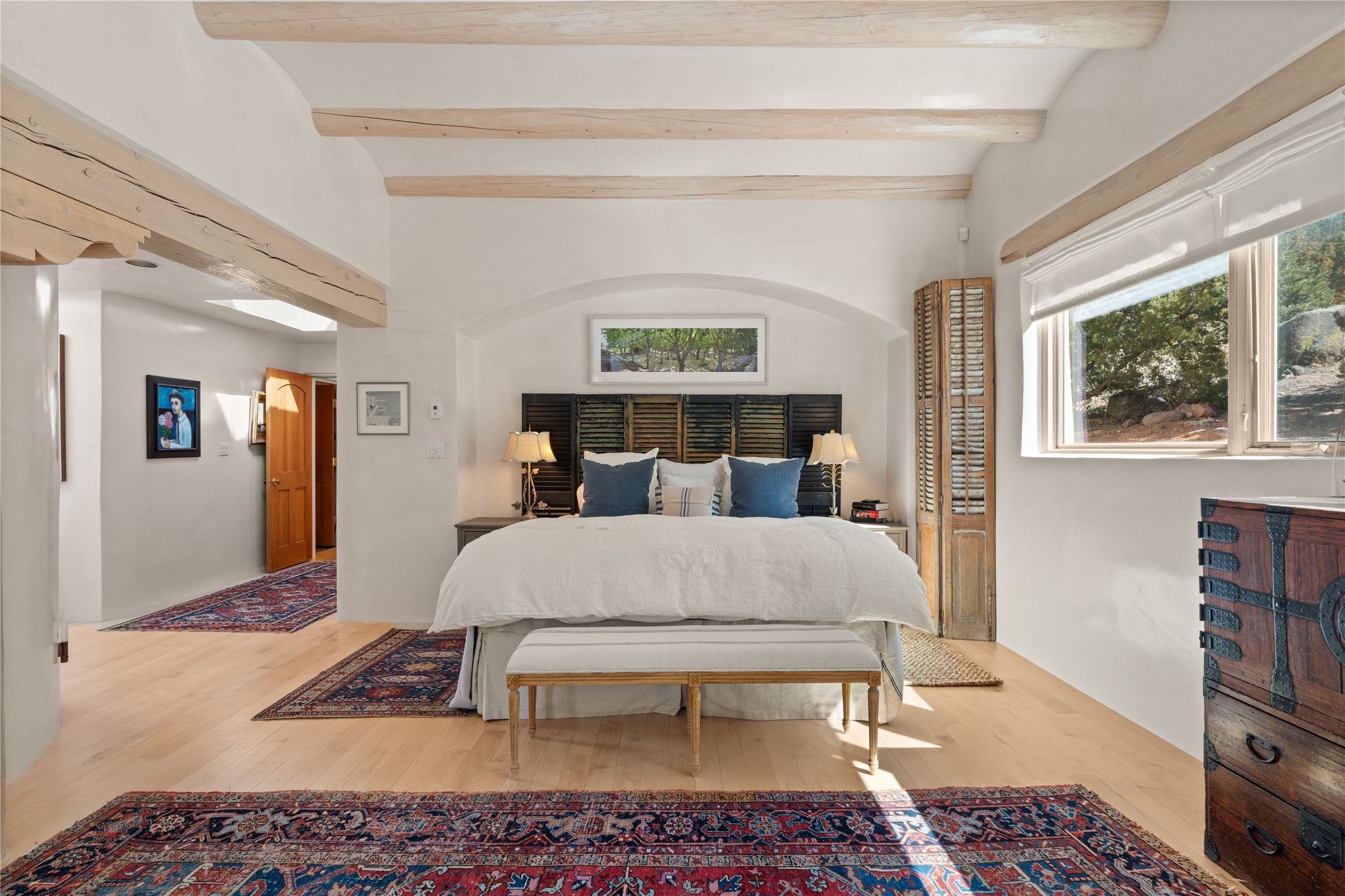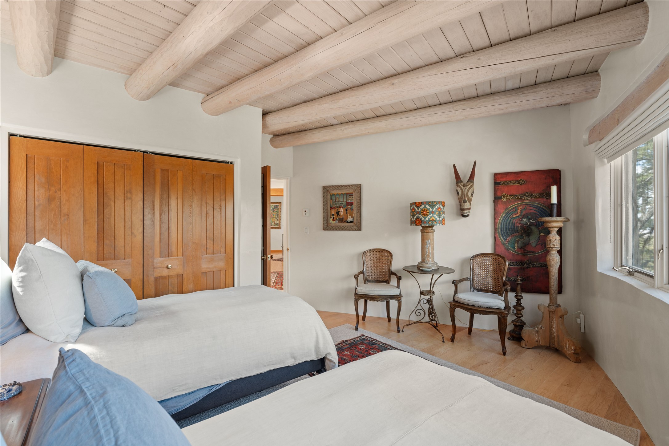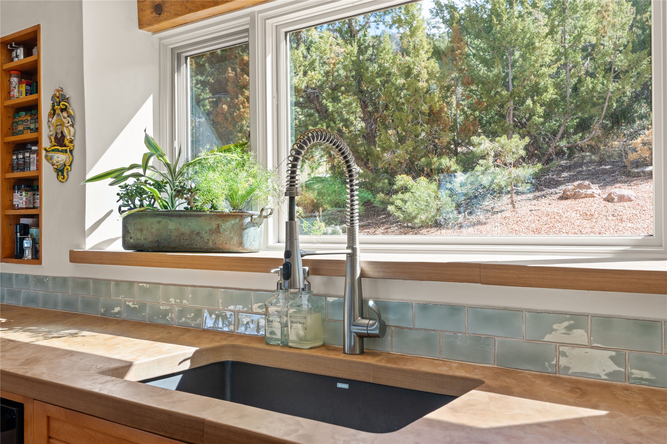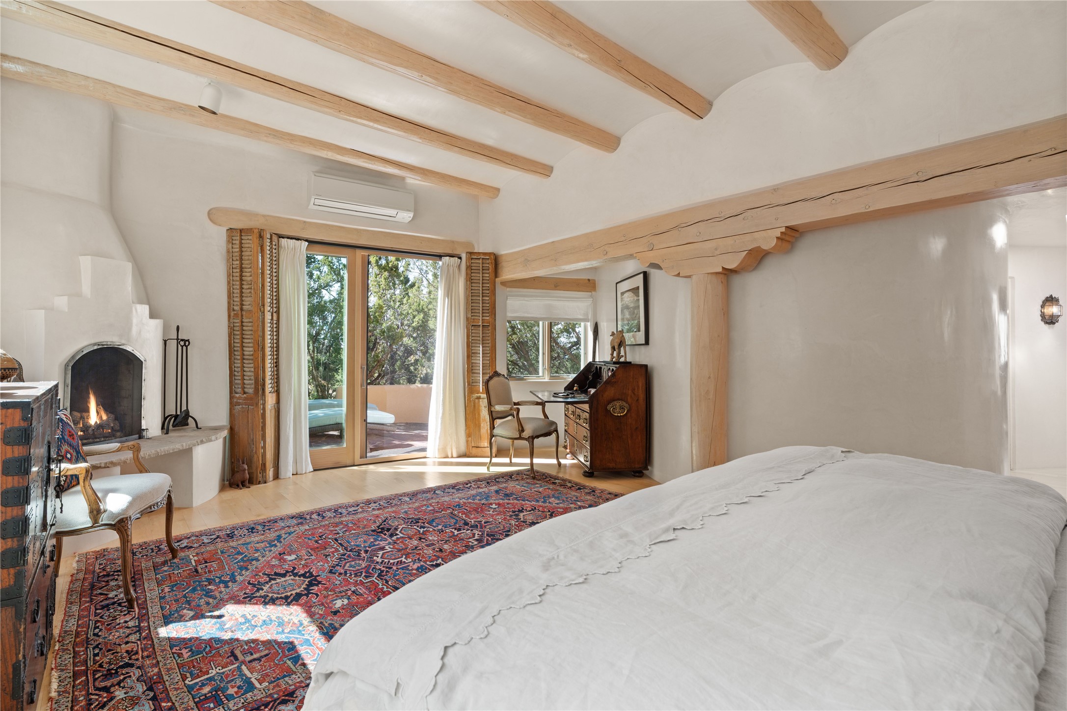 Nestled at the base of Sun and Moon Mountains, this exquisite adobe residence designed by Ken Mackenzie, and its charming casita, offer unparalleled views and masterful craftsmanship. Set amidst dramatic rock outcroppings, the home is accessed via a flagstone staircase surrounded by mature landscaping and a cascading water feature.Inside, curvaceous adobe walls create a seamless flow between distinct living areas. The cozy family room, featuring built-in bookshelves, banco seating, and a wood-burning fireplace, opens to a chef's kitchen with generous storage and ample prep-space. Adjacent to the kitchen, an intimate dining room is elevated above the living area, providing both a sense of architectural interest and breathtaking views of the Jemez Mountains and city lights. Two sets of sliding doors open to a mahogany deck, extending the living space and inviting you to enjoy the airy interplay between interior and exterior spaces.The primary suite offers a tranquil retreat with two bedrooms, one of which enjoys a kiva fireplace and a secluded flagstone patio, while the other can serve as a versatile office, den, or exercise space, with access to a private deck and incredible views. Both bedrooms share a spa-inspired bathroom with a double vanity and soaking tub, as well as a half bath. On the opposite side of the home, two additional bedrooms share a stylish 3/4-bath. Coved ceilings, plaster walls, built-ins and nichos enhance the charm and warmth of the home.An elevated 624-square-foot casita captures stunning views from its large windows and west-facing deck. The light-filled floor plan includes a kitchenette and 3/4-bath. An additional 130-square foot studio can be used for a variety of purposes. The exceptional foothill location provides immediate access to hiking trails and nearby Museum Hill. The property is well-maintained with pride of ownership reflected in the newer roof, stucco and mini-splits for cooling. Sited on 4.7 acres, this property is the perfect blend of peaceful living, stunning design, and unmatched views--truly a one-of-a-kind home.
