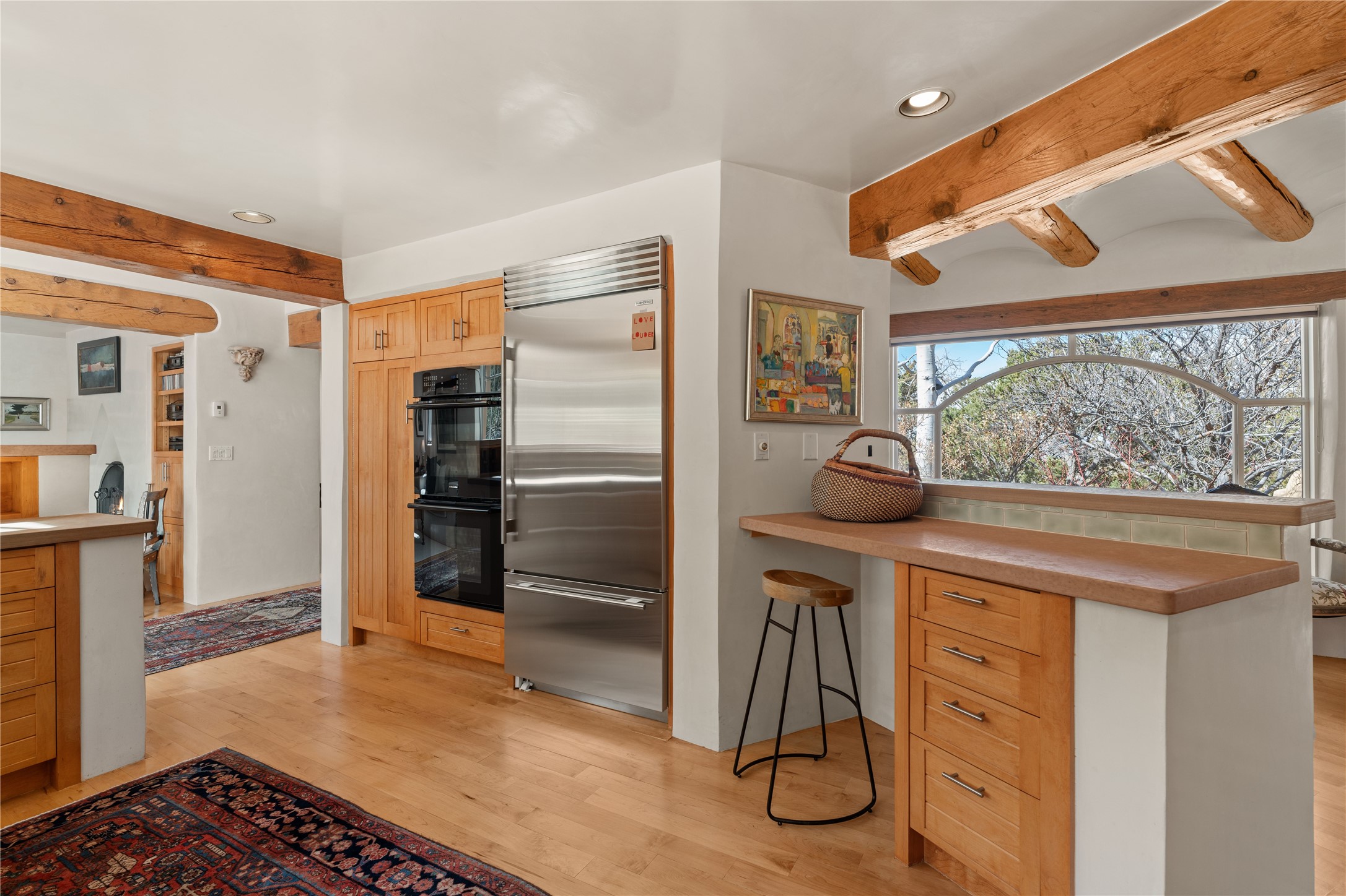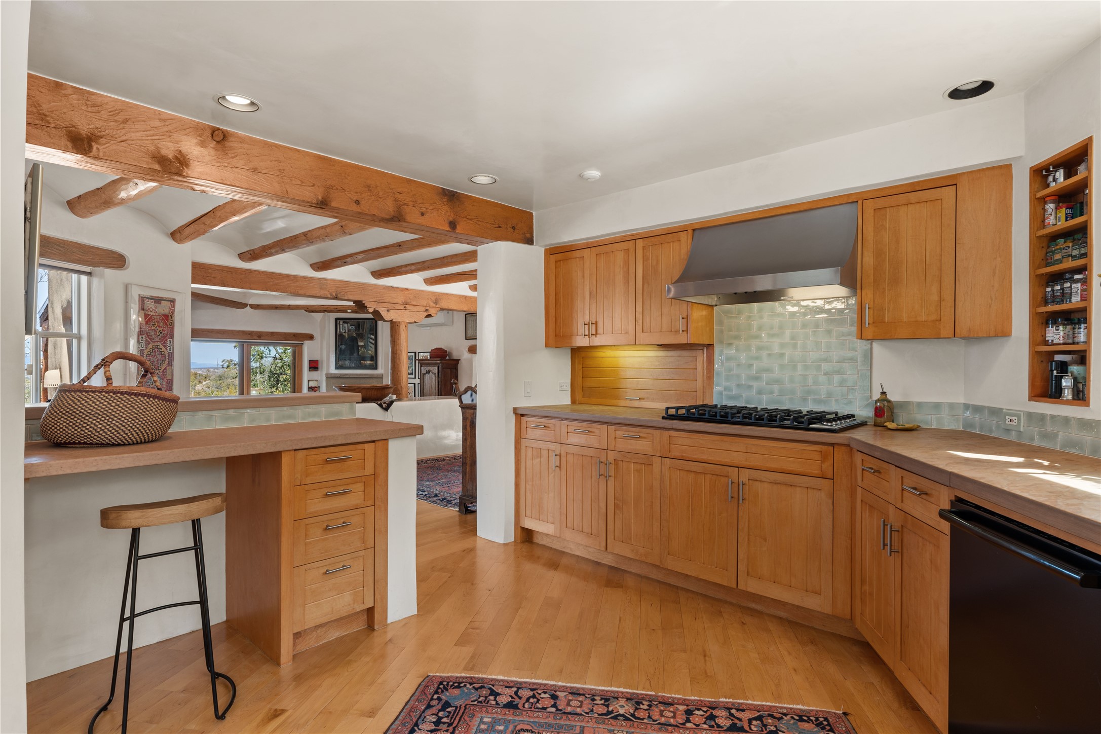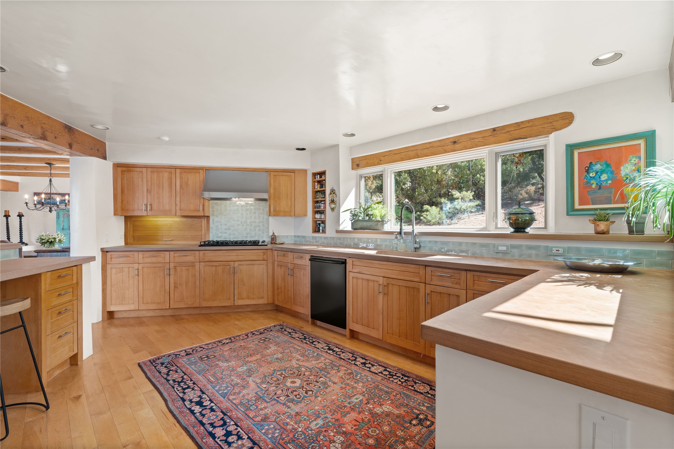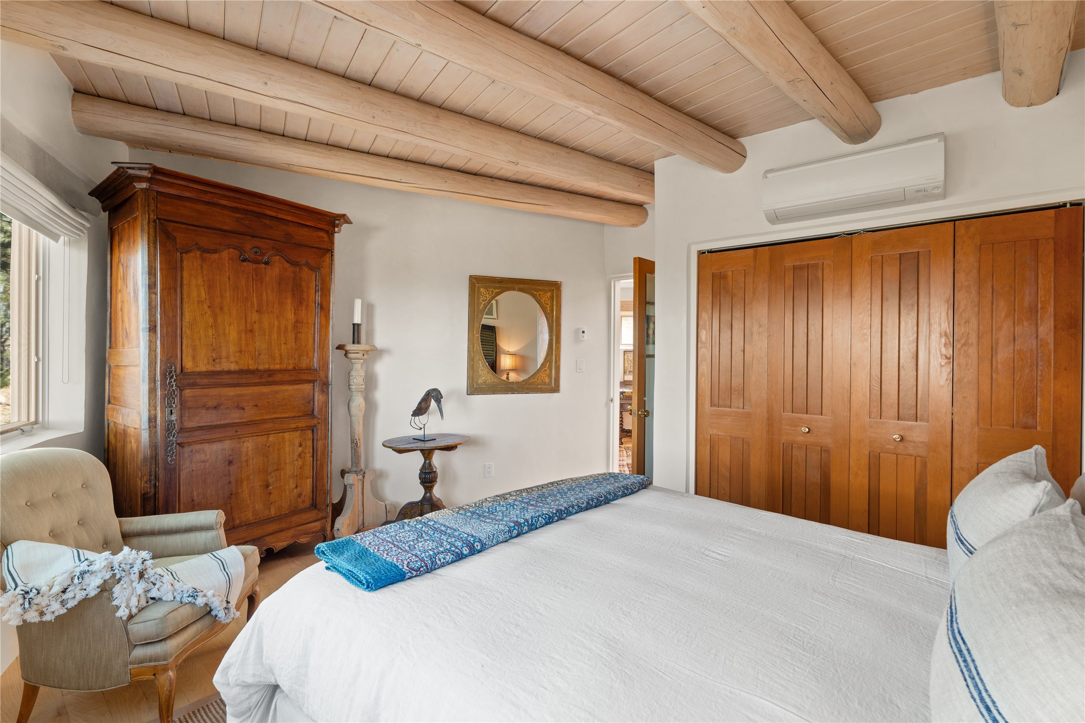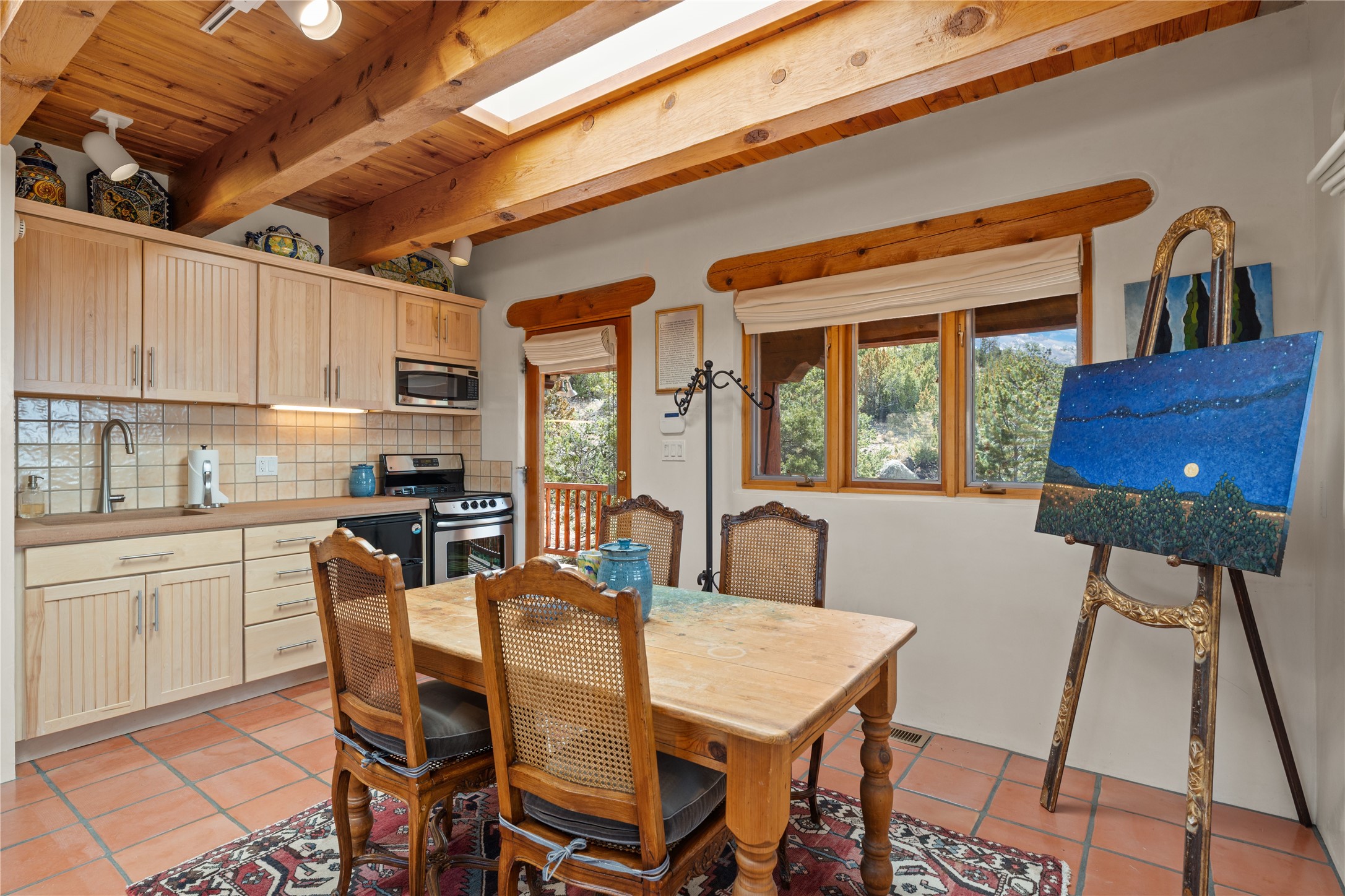 Nestled at the base of Sun and Moon Mountains, this exquisite adobe residence designed by Ken Mackenzie, and its charming casita, offer unparalleled views and masterful craftsmanship. Set amidst dramatic rock outcroppings, the home is accessed via a flagstone staircase surrounded by mature landscaping and a cascading water feature.Inside, curvaceous adobe walls create a seamless flow between distinct living areas. The cozy family room, featuring built-in bookshelves, banco seating, and a wood-burning fireplace, opens to a chef's kitchen with generous storage and ample prep-space. Adjacent to the kitchen, an intimate dining room is elevated above the living area, providing both a sense of architectural interest and breathtaking views of the Jemez Mountains and city lights. Two sets of sliding doors open to a mahogany deck, extending the living space and inviting you to enjoy the airy interplay between interior and exterior spaces.The primary suite offers a tranquil retreat with two bedrooms, one of which enjoys a kiva fireplace and a secluded flagstone patio, while the other can serve as a versatile office, den, or exercise space, with access to a private deck and incredible views. Both bedrooms share a spa-inspired bathroom with a double vanity and soaking tub, as well as a half bath. On the opposite side of the home, two additional bedrooms share a stylish 3/4-bath. Coved ceilings, plaster walls, built-ins and nichos enhance the charm and warmth of the home.An elevated 624-square-foot casita captures stunning views from its large windows and west-facing deck. The light-filled floor plan includes a kitchenette and 3/4-bath. An additional 130-square foot studio can be used for a variety of purposes. The exceptional foothill location provides immediate access to hiking trails and nearby Museum Hill. The property is well-maintained with pride of ownership reflected in the newer roof, stucco and mini-splits for cooling. Sited on 4.7 acres, this property is the perfect blend of peaceful living, stunning design, and unmatched views--truly a one-of-a-kind home.