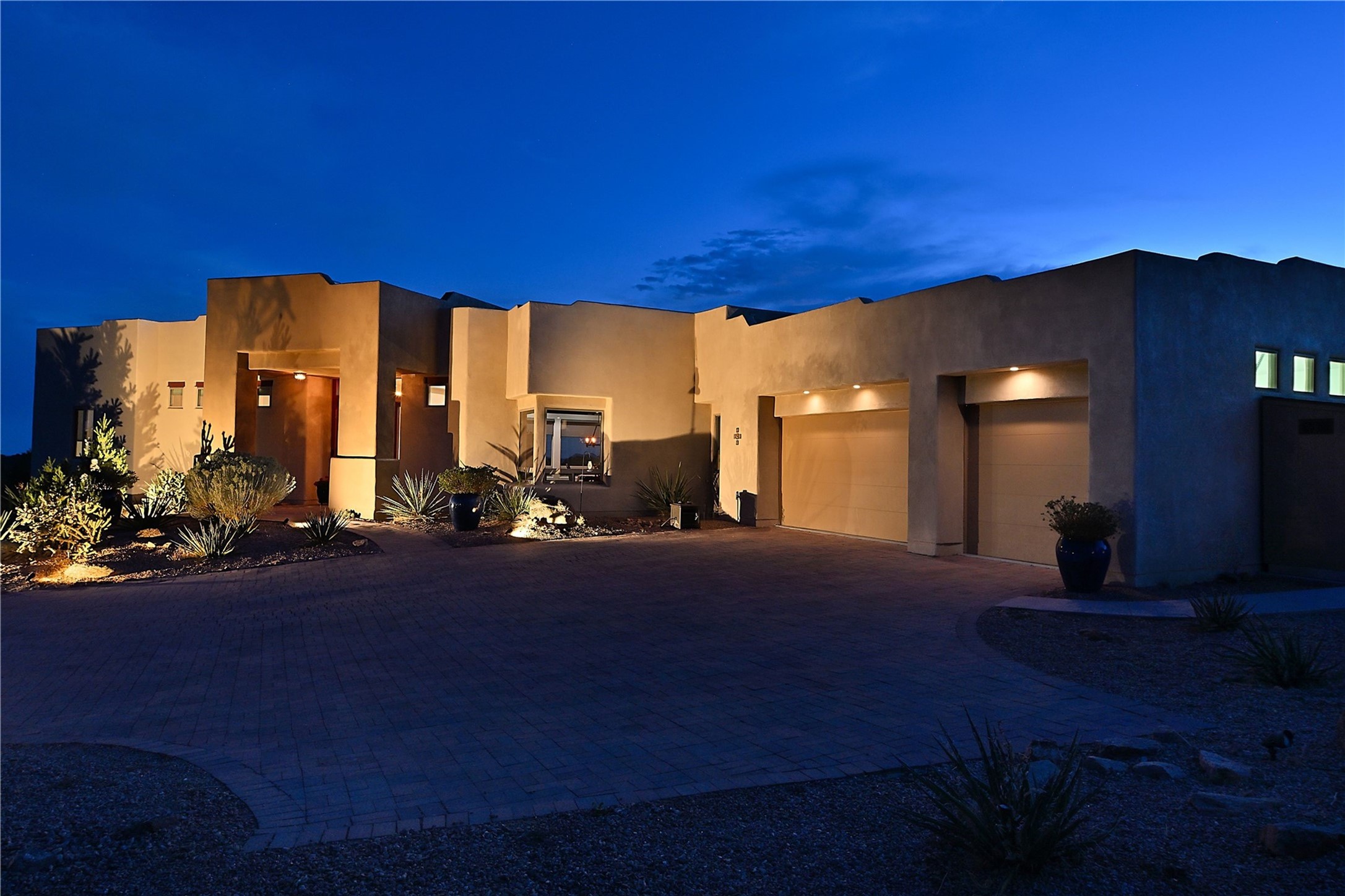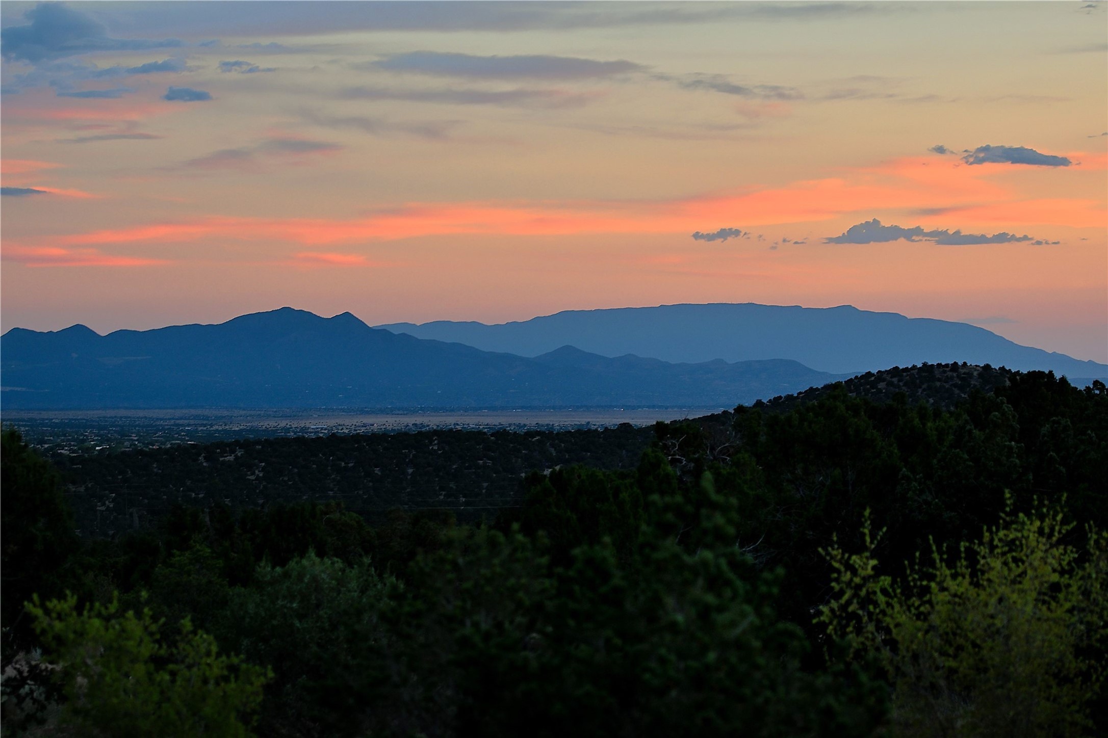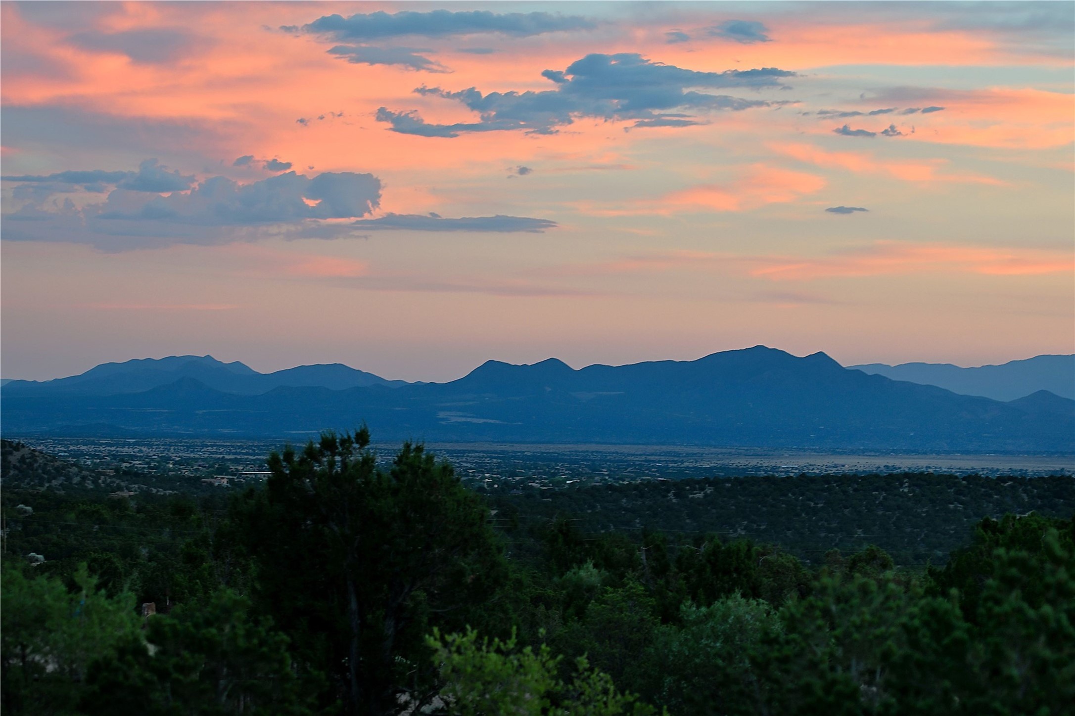 Immaculate newer home nestled on a hilltop with nature and mountain views from every window and only minutes from town. Tall archways, custom wood doors, attractive tile plank floors and superb separation of bedrooms greet you in this light and airy home. Spacious eat in kitchen with large stone counters, high end appliances and a fabulous pantry combine with the living area and tall ceilings to offer a magnificent open space. Rear portal with views of the Galisteo Basin invite you outside to take in the breathtaking expanse. Savor the primary bedroom with charming fireplace and bathroom suite made for royalty with separate vanities, wardrobes and water closets. Oversized three car garage, California closet systems in garage and all three bedroom closets as well as a sizeable walk in linen closet. Come home to plenty of storage, magnificent views, acreage and serenity all just minutes from the city of Santa Fe. Truly the perfect, pristinely maintained home that offers a peaceful country feel without being too far out. Gated community, two storage sheds and a heated meditation studio. Come and see!