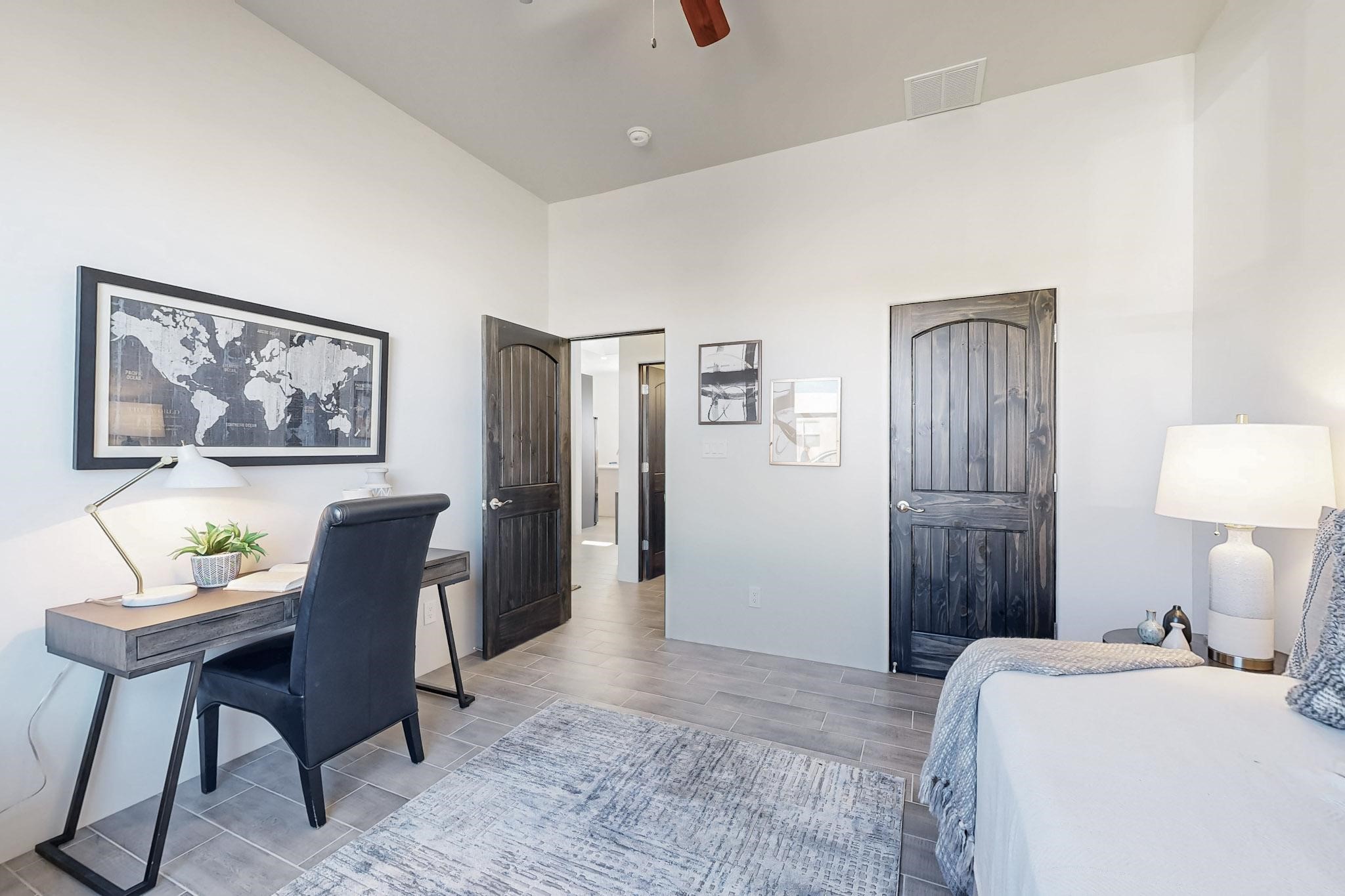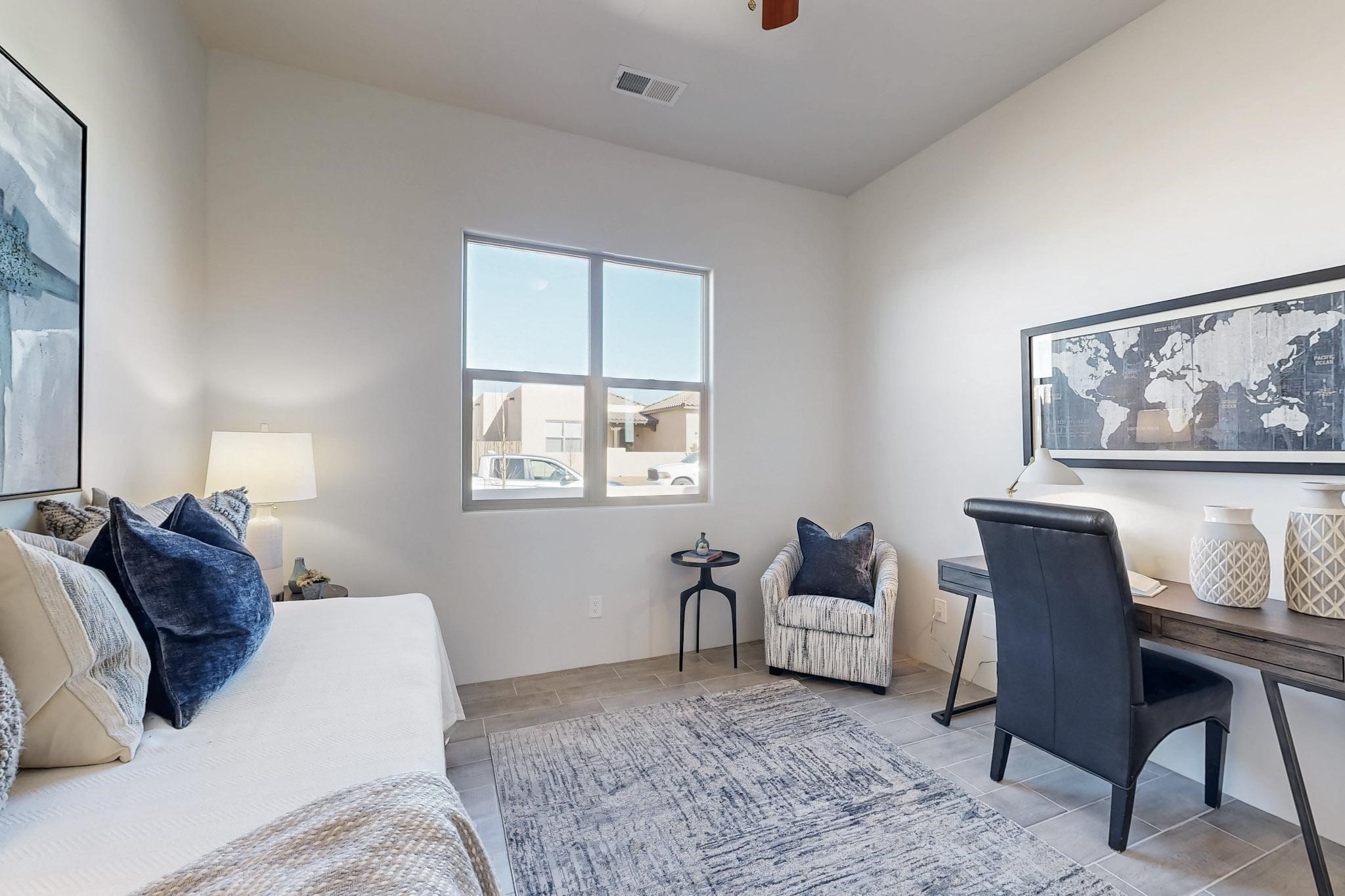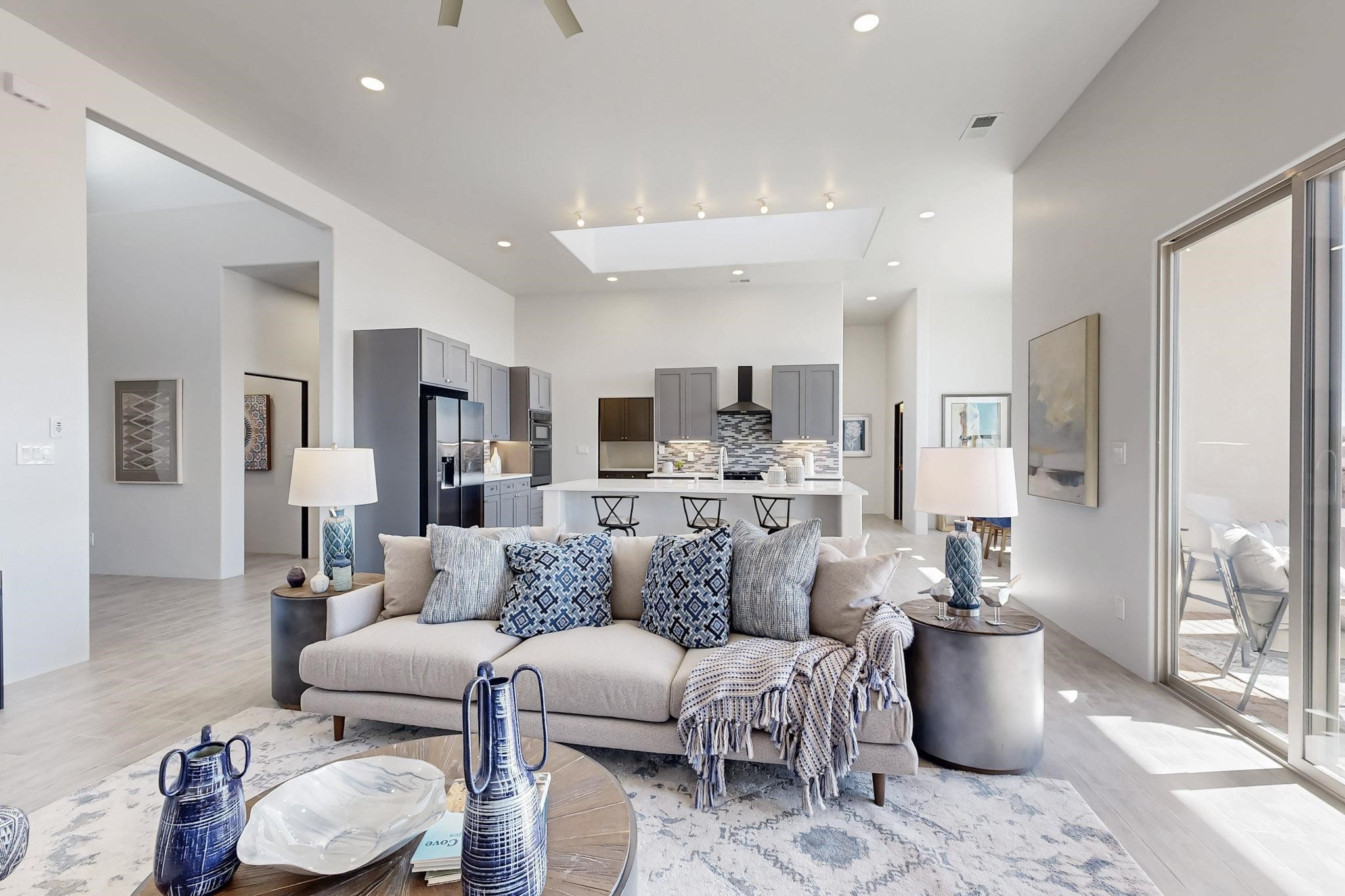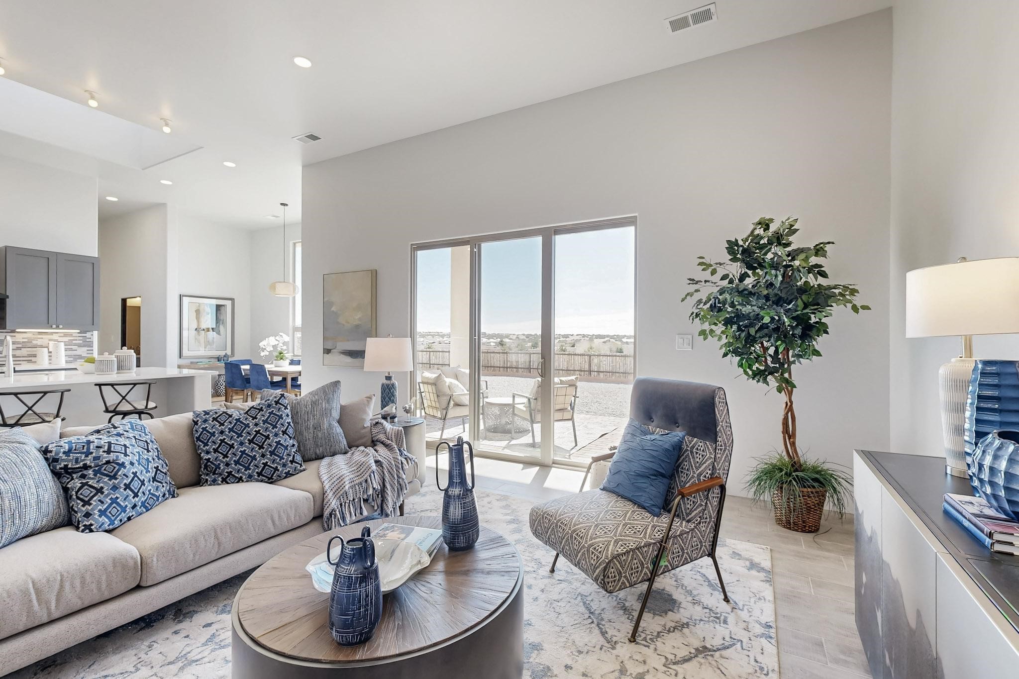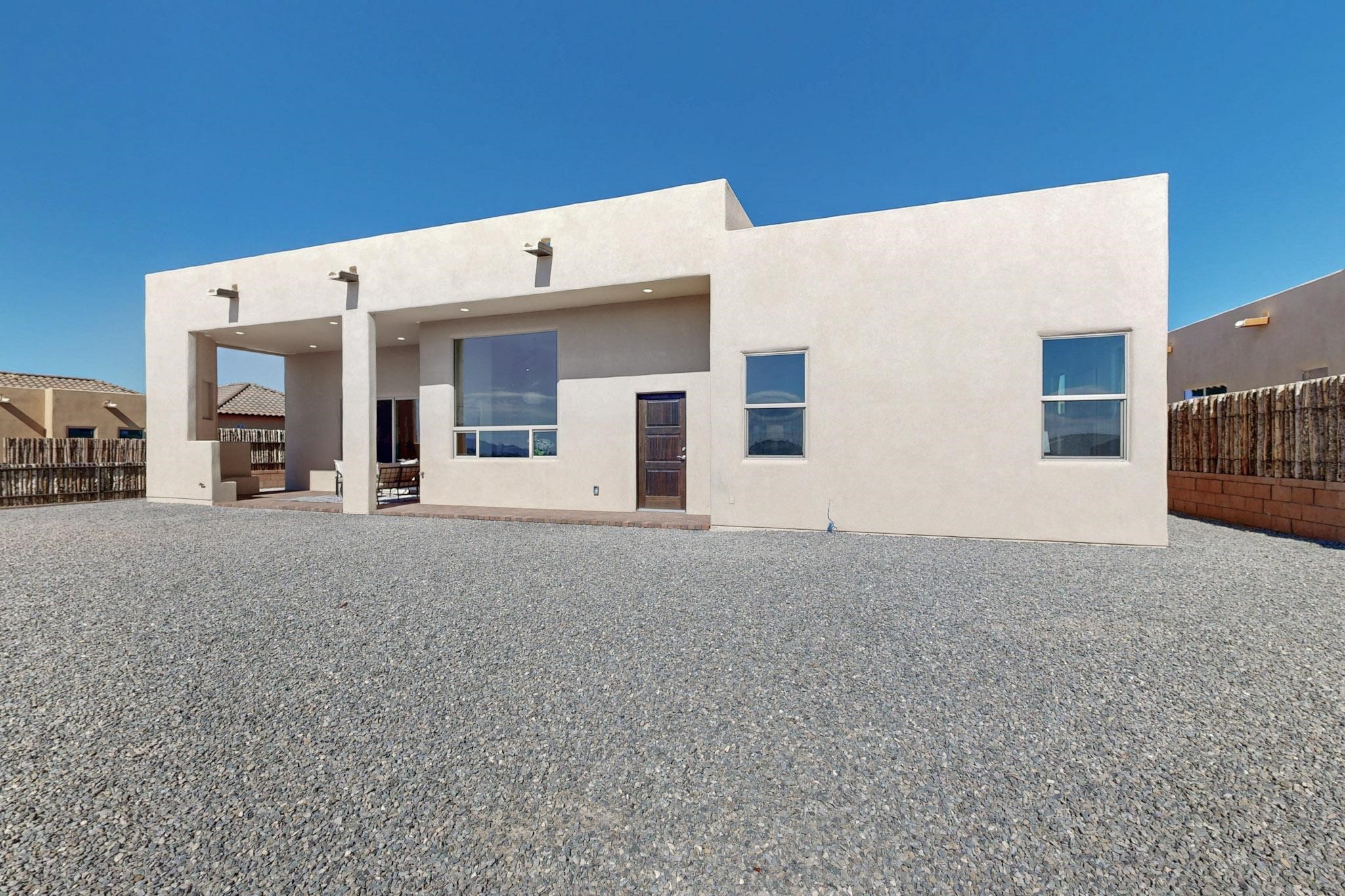 Step into luxury at 28 La Pradera, a 2350 square foot contemporary home designed for comfort, entertaining and breathtaking 180-degree territorial views. A brick-paved covered entry leads to an eight-foot high solid wood door opening into a soaring atrium with clerestory windows. To the right of the entry is a bedroom with a full bath that would be perfect for a home office. To the left is a second bedroom with a walk-in closet. A hall closet provides extra storage. Across is a sliding barn door accessing a large butler's pantry that connects to the kitchen with a swinging door. Open kitchen design with quartz countertops, 17-foot-tall skylight with clerestory windows on all four sides and wired for a chandelier. A powder room has direct access to the rear portal. Also, a secure room for a safe and storage of valuables. The generous owner's suite has wonderful views and double counters and sinks, a free-standing tub, a separate shower with marble and rainfall tile, linen closet, and a 72 sq. ft. walk-in closet. The two-car garage has an epoxied floor and a large room for holiday storage or gift wrapping.