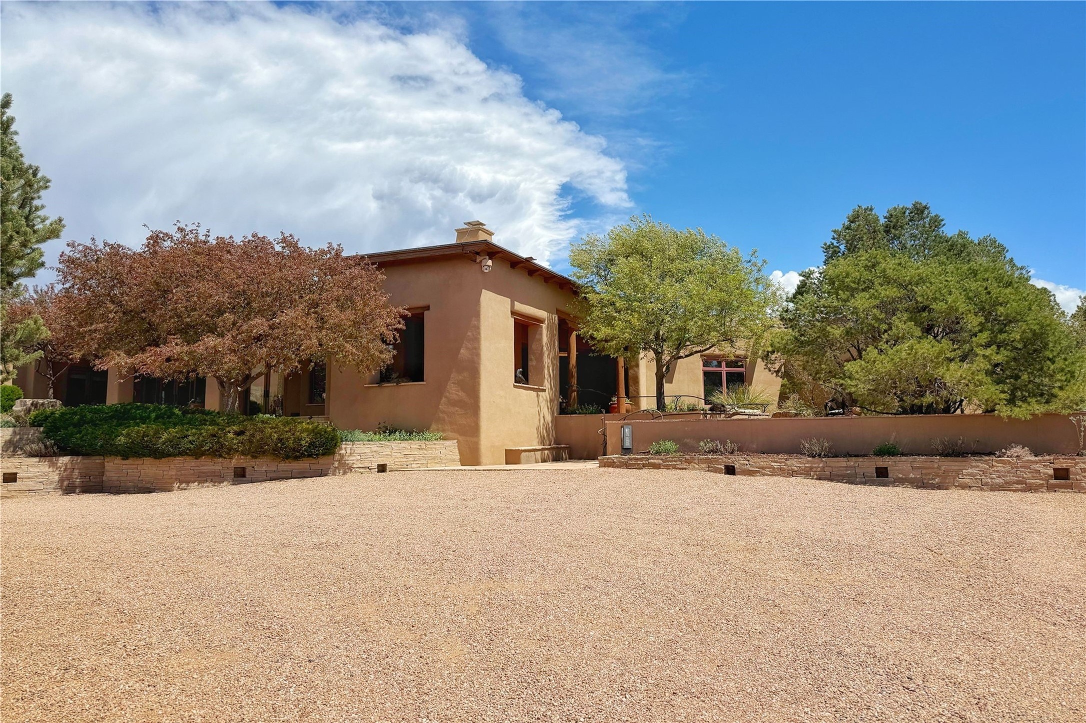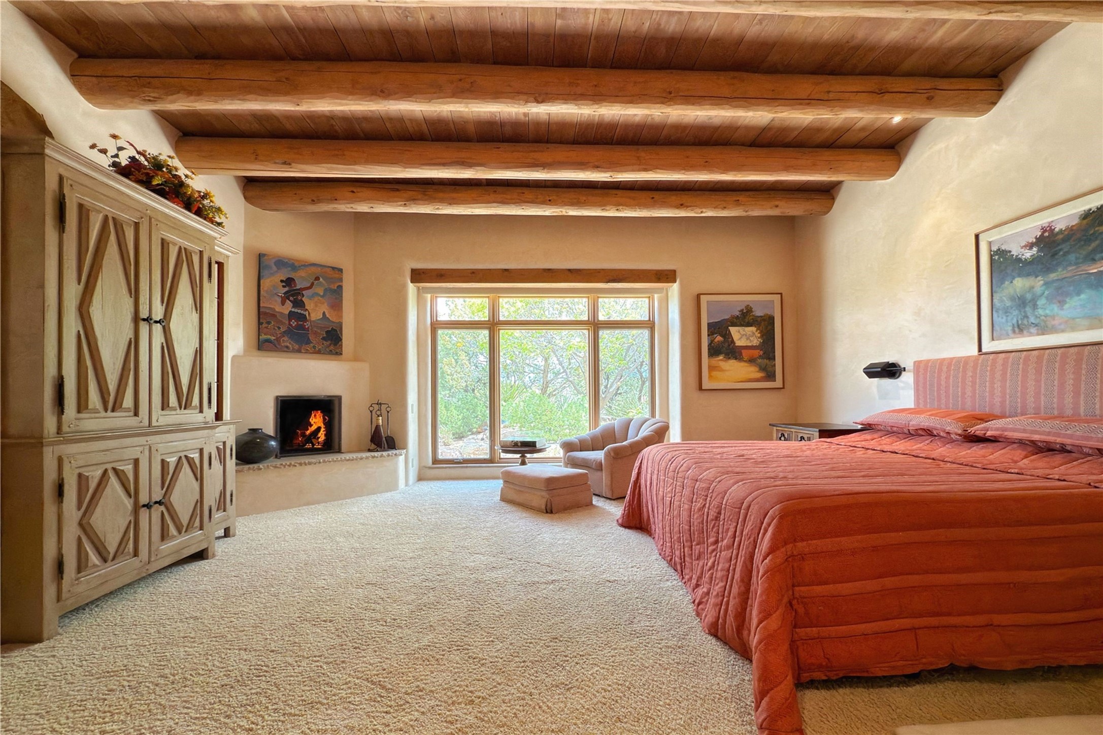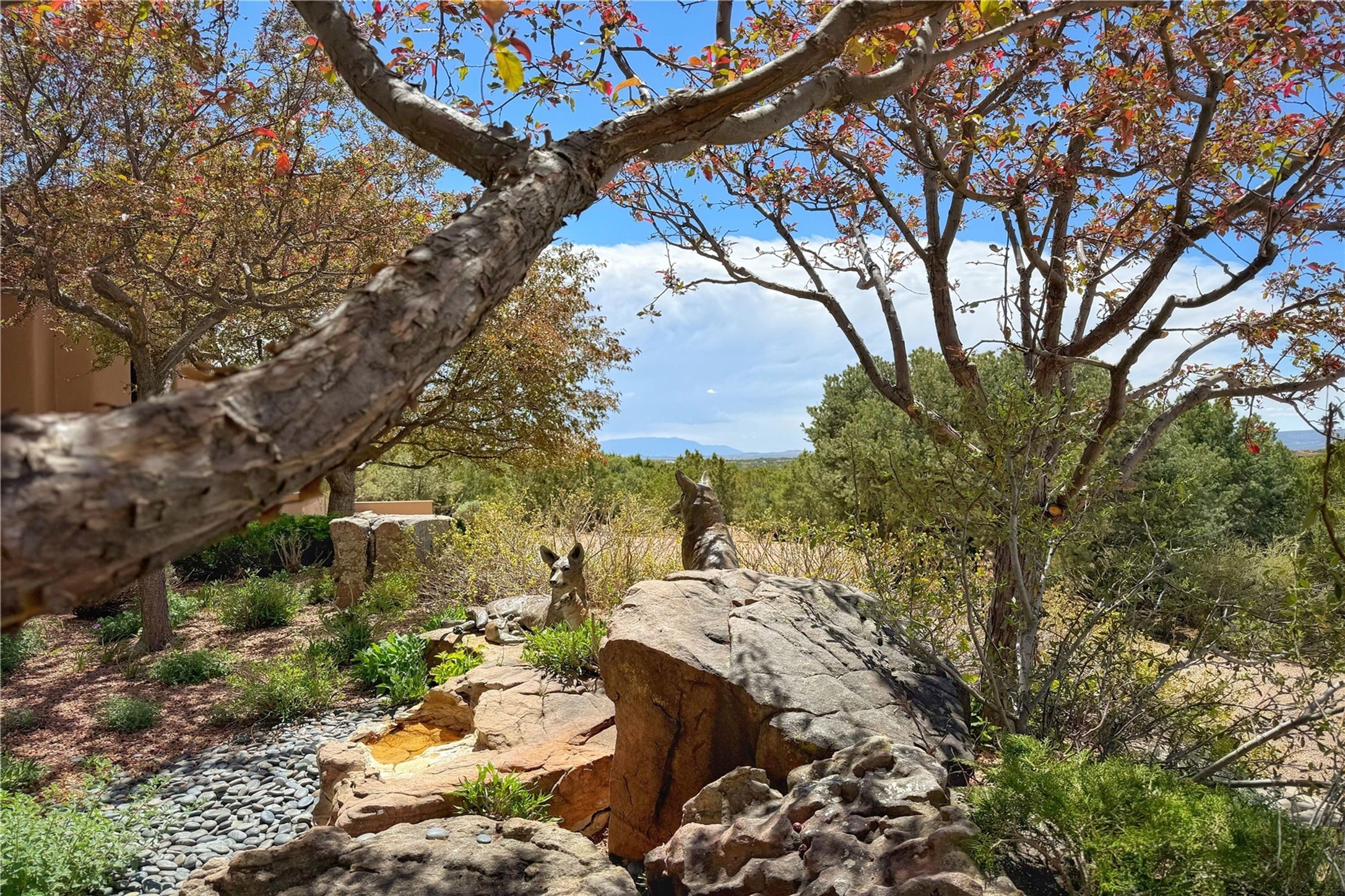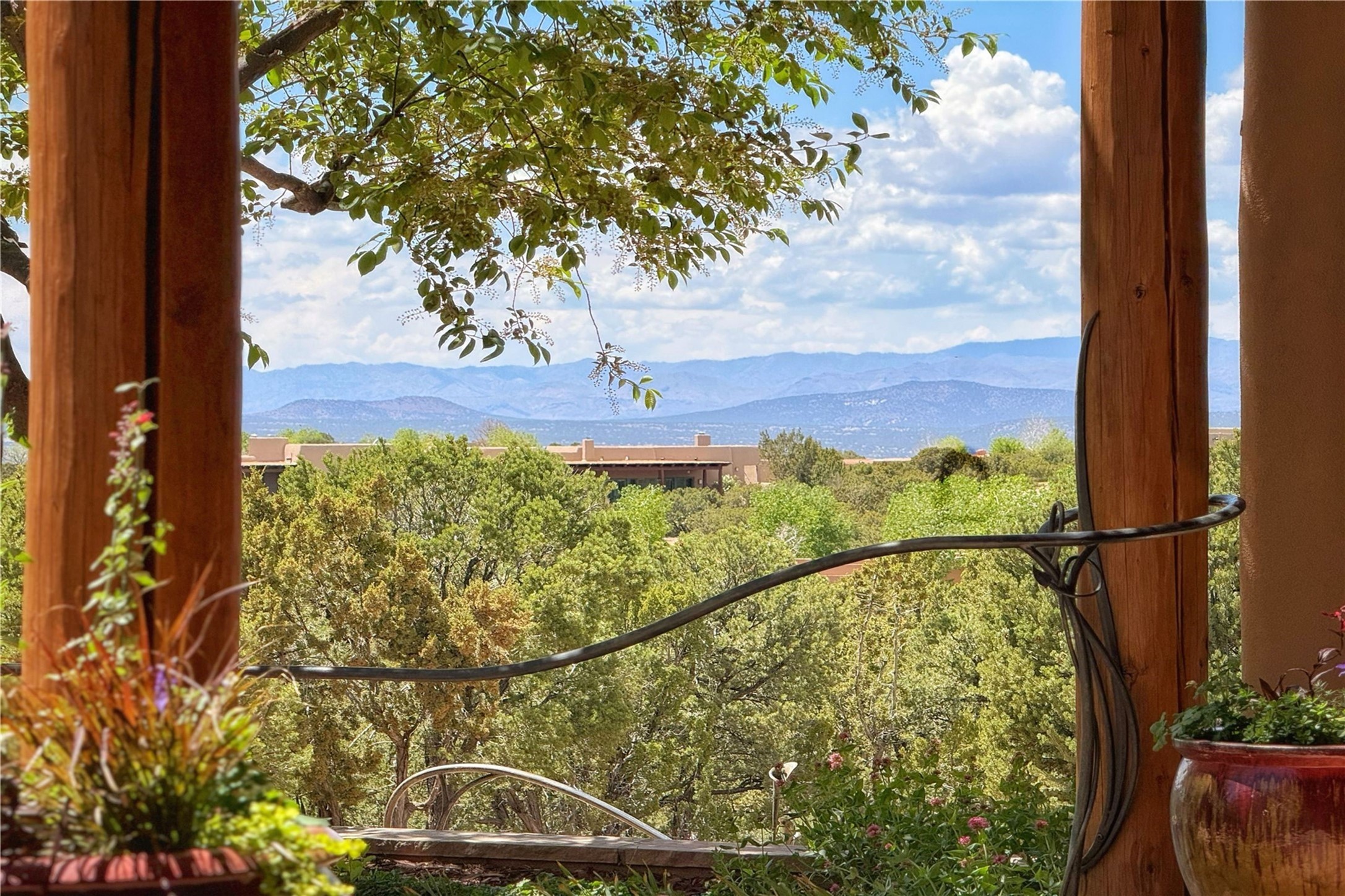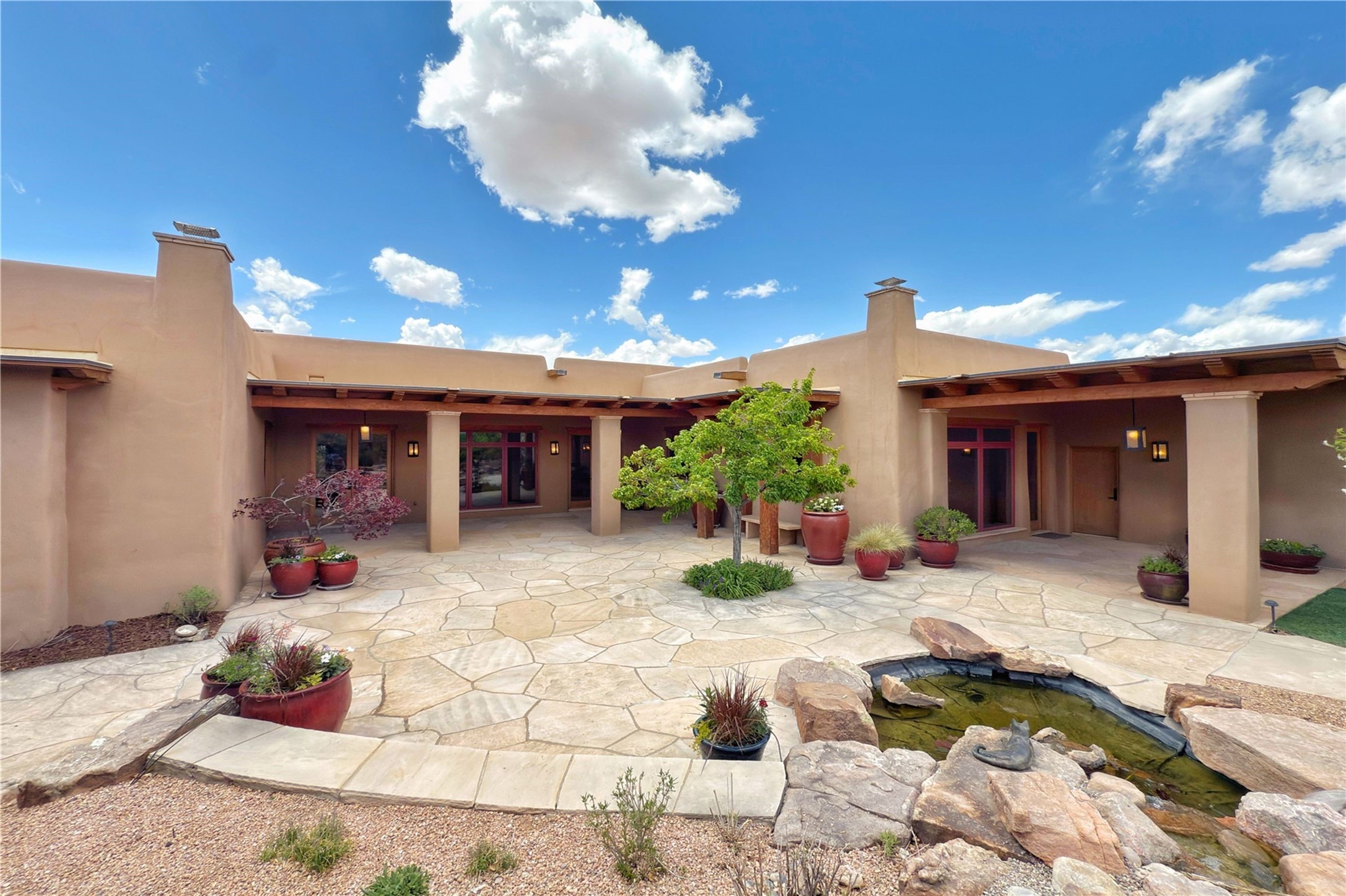 Welcome to a stunning Southwest-style home offering the perfect blend of elegance, warmth, and artistic expression. Built on an elevated lot to capture breathtaking Jemez Mountain views, this property is ideal for showcasing your art collection and entertaining in Santa Fe style.Warm earth tones complement the vigas and stone floors, creating a soft contemporary Southwest ambiance with timeless charm. A pond welcomes you and leads you to the wrap-around portal, complete with wood-burning fireplace, perfect for large gatherings. Enter through double Spanish doors that create a dramatic entry, setting the tone for the home. The foyer offers direct views to the back garden. Flow easily into the grand living room, featuring mountain views, wood-burning kiva fireplace, and cozy Banco seating. Made for entertaining, this home includes an elegant dining room with built-in cabinetry and portal access. The massive kitchen has an equally massive island, sitting room, and gas fireplace. The built in storage is impressive. The kitchen leads into the back garden with waterfall feature. 45 Violet Circle features an office, large media room and separate family room, for extra work, entertainment and relaxation spaces. A gas fireplace and large windows in the spacious primary suite highlight the back garden. The primary bath has his/hers showers and toilets. The primary closet is home to a walk in safe. Adjacent to the suite is a bonus/rec room with access to an underground space, perfect to turn into a dedicated wine cellar. The separate casita boasts high ceilings, decorative tiles, and a gas fireplace. Exquisite landscaping showcases 3 water features, adding elegance and peacefulness. This residence is designed around multiple outdoor spaces for true indoor/outdoor living.With the water feature sounds, art displays spaces, and large rooms, this home is peaceful, impressive and substantial.Please note, fires in fireplaces may be digitally added