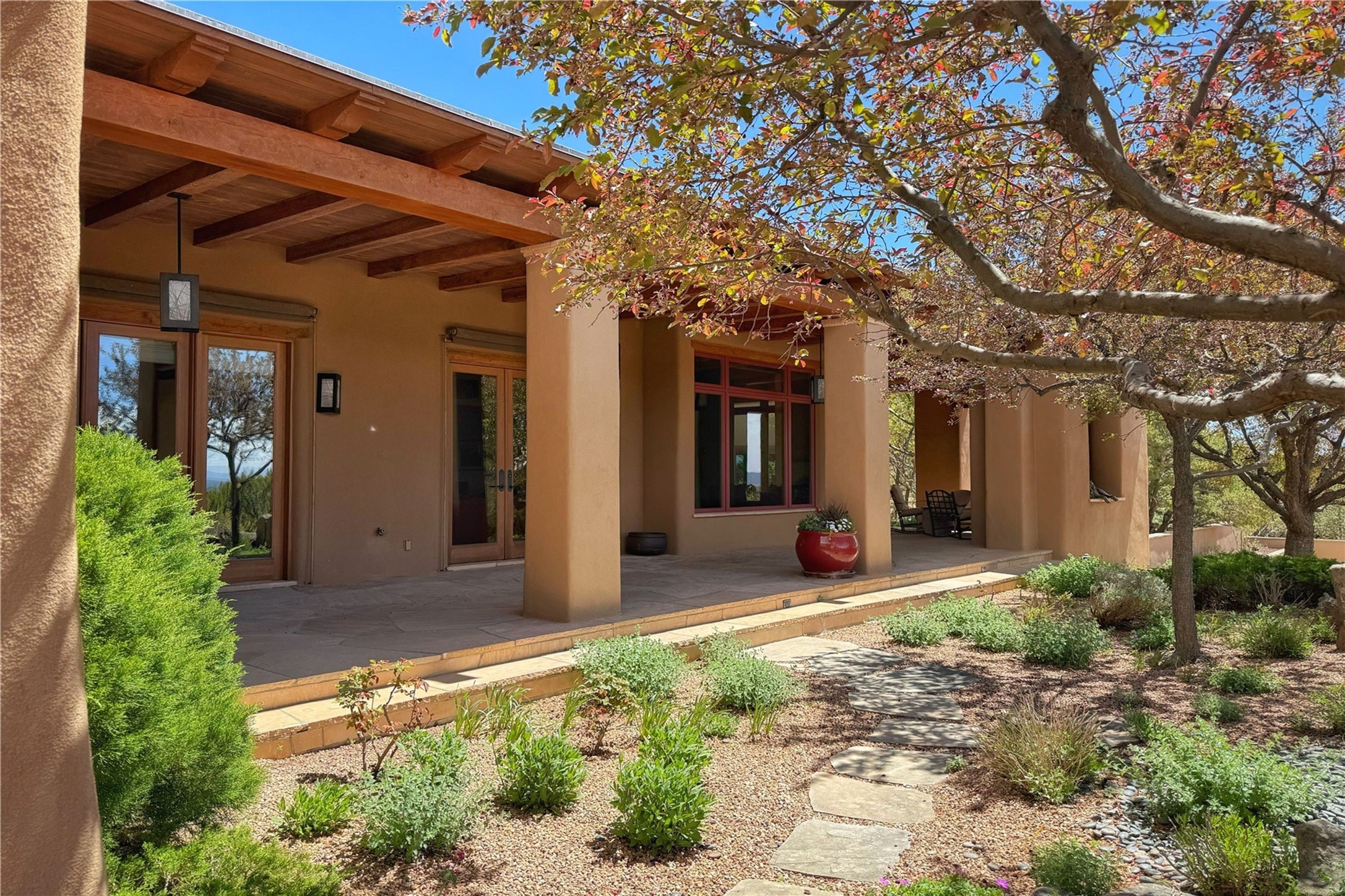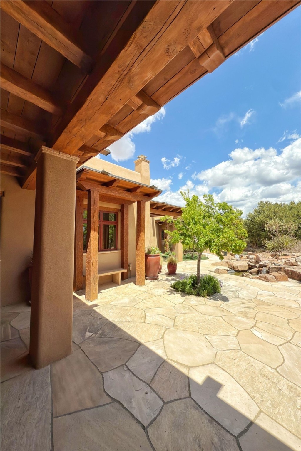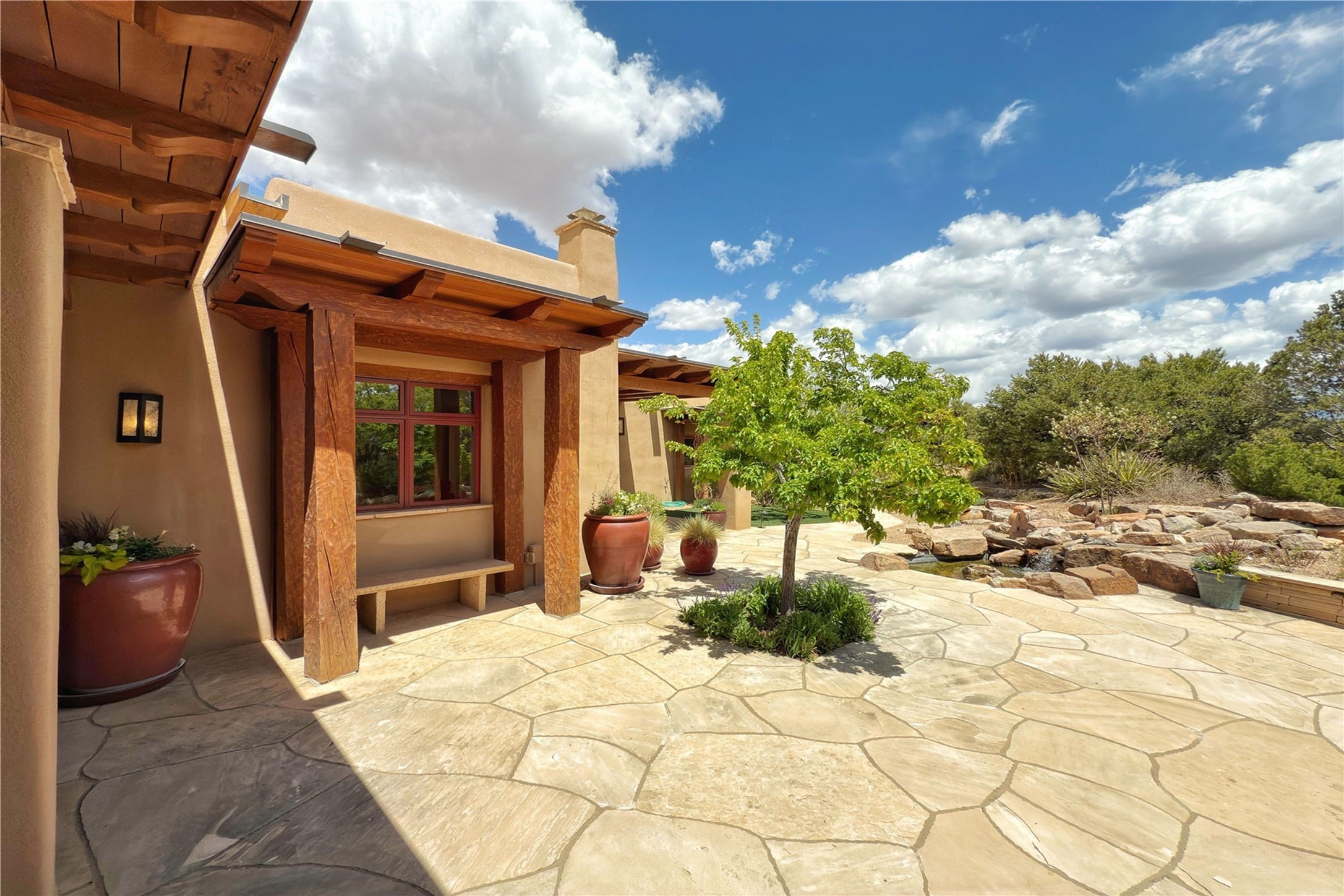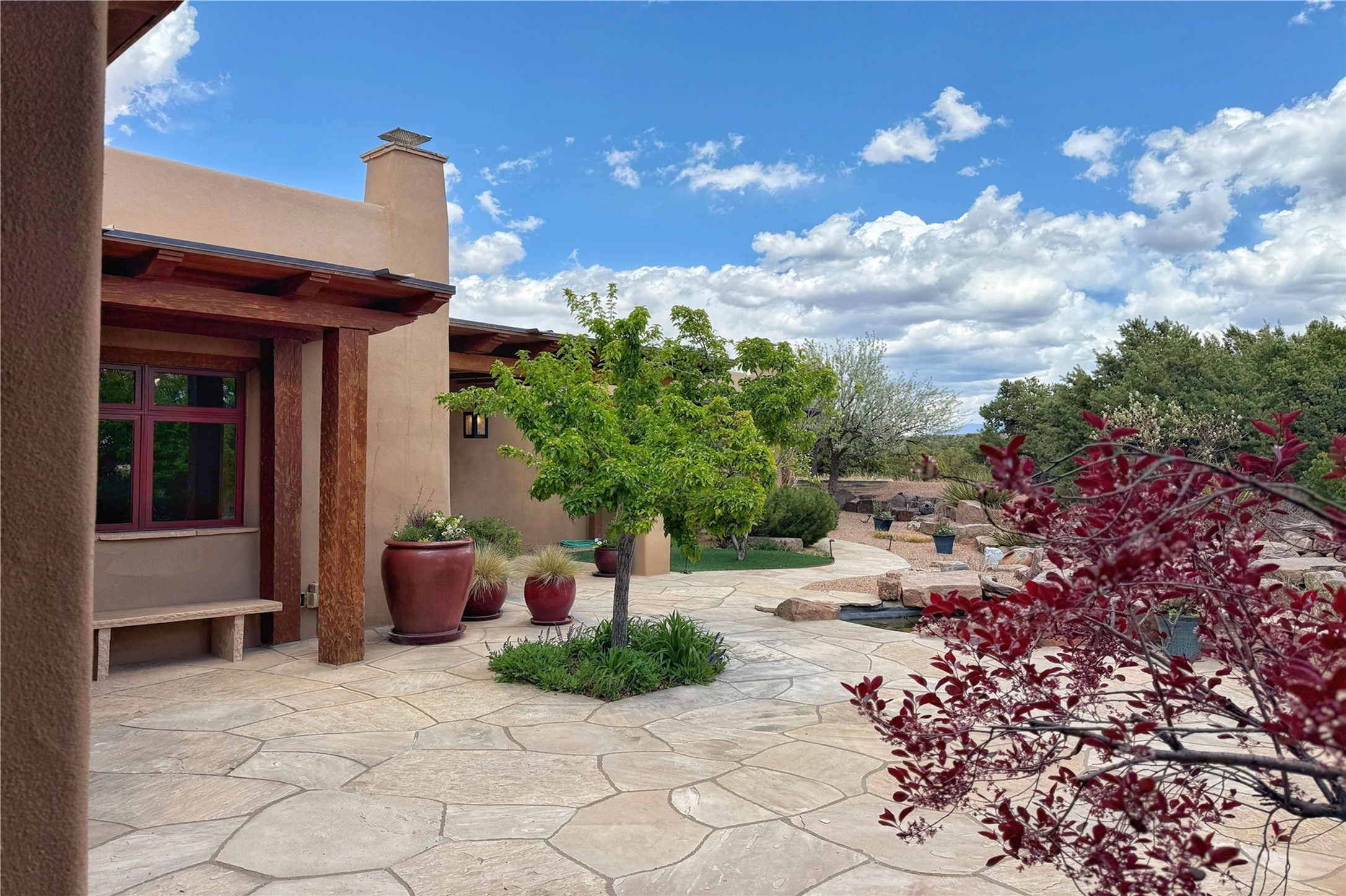 Welcome to a stunning Southwest-style home offering the perfect blend of elegance, warmth, and artistic expression. Built on an elevated lot to capture breathtaking Jemez Mountain views, this property is ideal for showcasing your art collection and entertaining in Santa Fe style.Warm earth tones complement the vigas and stone floors, creating a soft contemporary Southwest ambiance with timeless charm. A pond welcomes you and leads you to the wrap-around portal, complete with wood-burning fireplace, perfect for large gatherings. Enter through double Spanish doors that create a dramatic entry, setting the tone for the home. The foyer offers direct views to the back garden. Flow easily into the grand living room, featuring mountain views, wood-burning kiva fireplace, and cozy Banco seating. Made for entertaining, this home includes an elegant dining room with built-in cabinetry and portal access. The massive kitchen has an equally massive island, sitting room, and gas fireplace. The built in storage is impressive. The kitchen leads into the back garden with waterfall feature. 45 Violet Circle features an office, large media room and separate family room, for extra work, entertainment and relaxation spaces. A gas fireplace and large windows in the spacious primary suite highlight the back garden. The primary bath has his/hers showers and toilets. The primary closet is home to a walk in safe. Adjacent to the suite is a bonus/rec room with access to an underground space, perfect to turn into a dedicated wine cellar. The separate casita boasts high ceilings, decorative tiles, and a gas fireplace. Exquisite landscaping showcases 3 water features, adding elegance and peacefulness. This residence is designed around multiple outdoor spaces for true indoor/outdoor living.With the water feature sounds, art displays spaces, and large rooms, this home is peaceful, impressive and substantial.Please note, fires in fireplaces may be digitally added