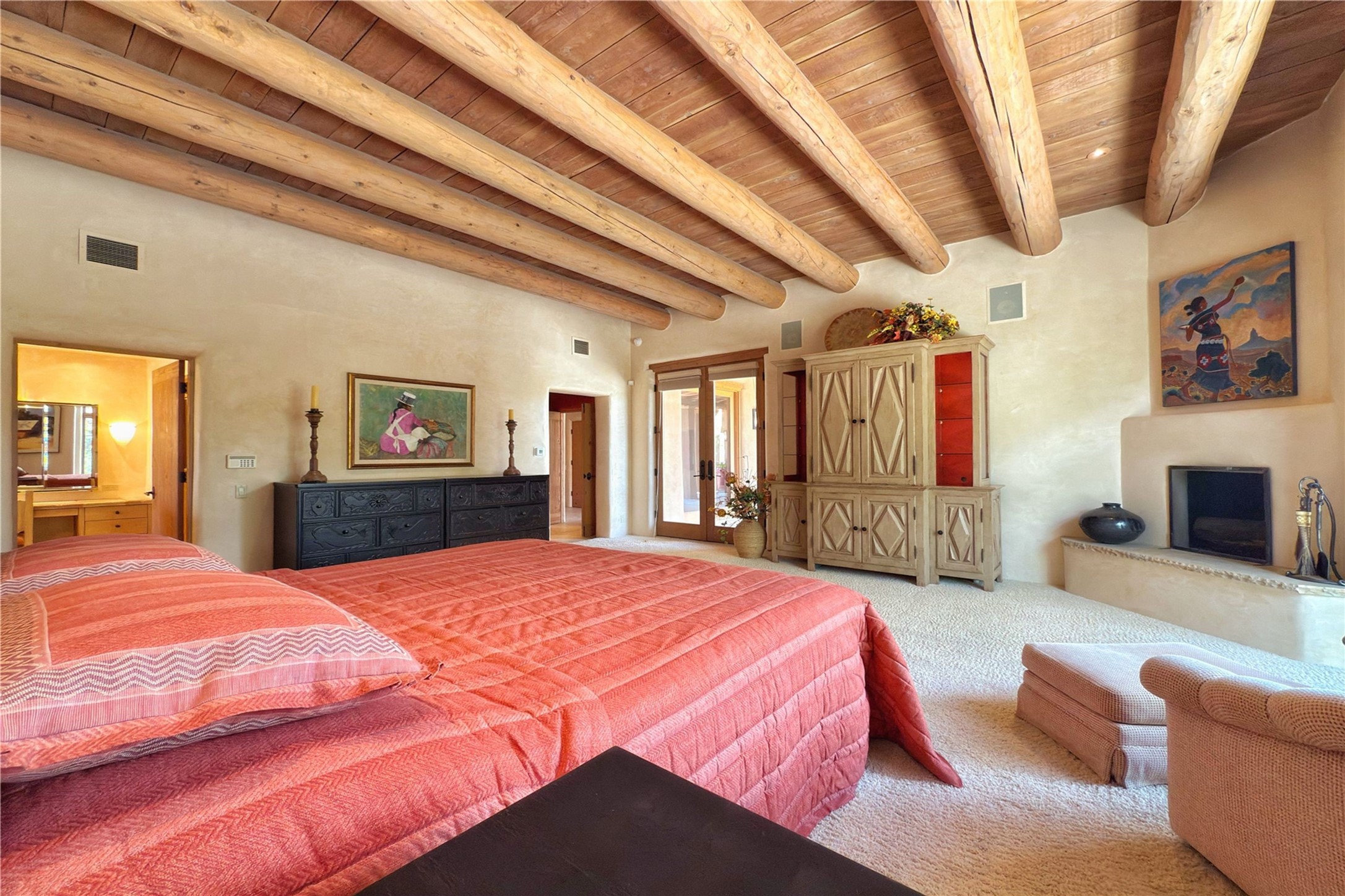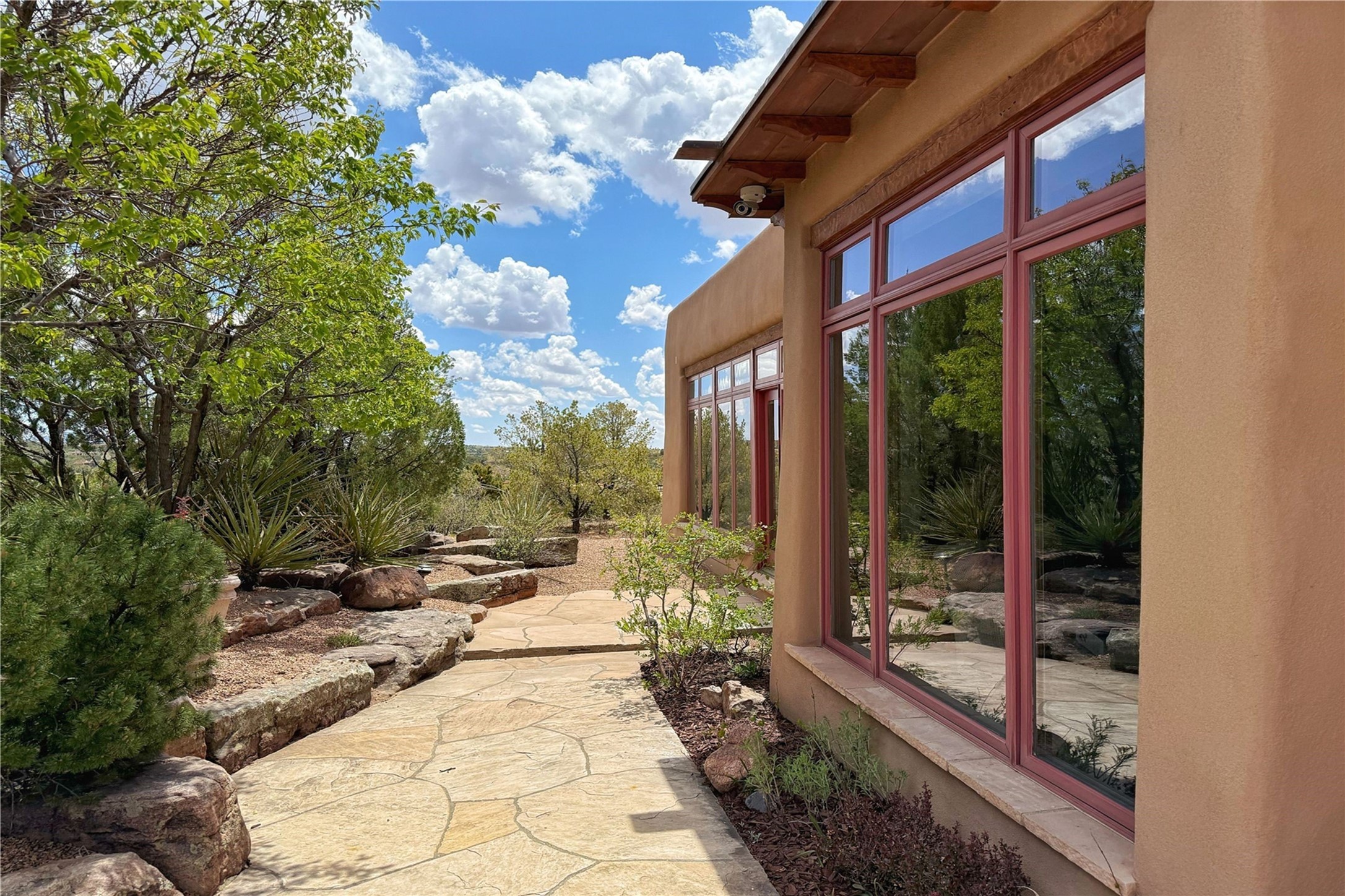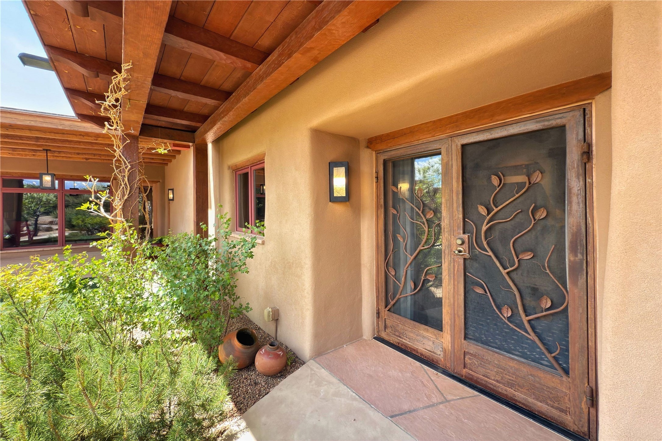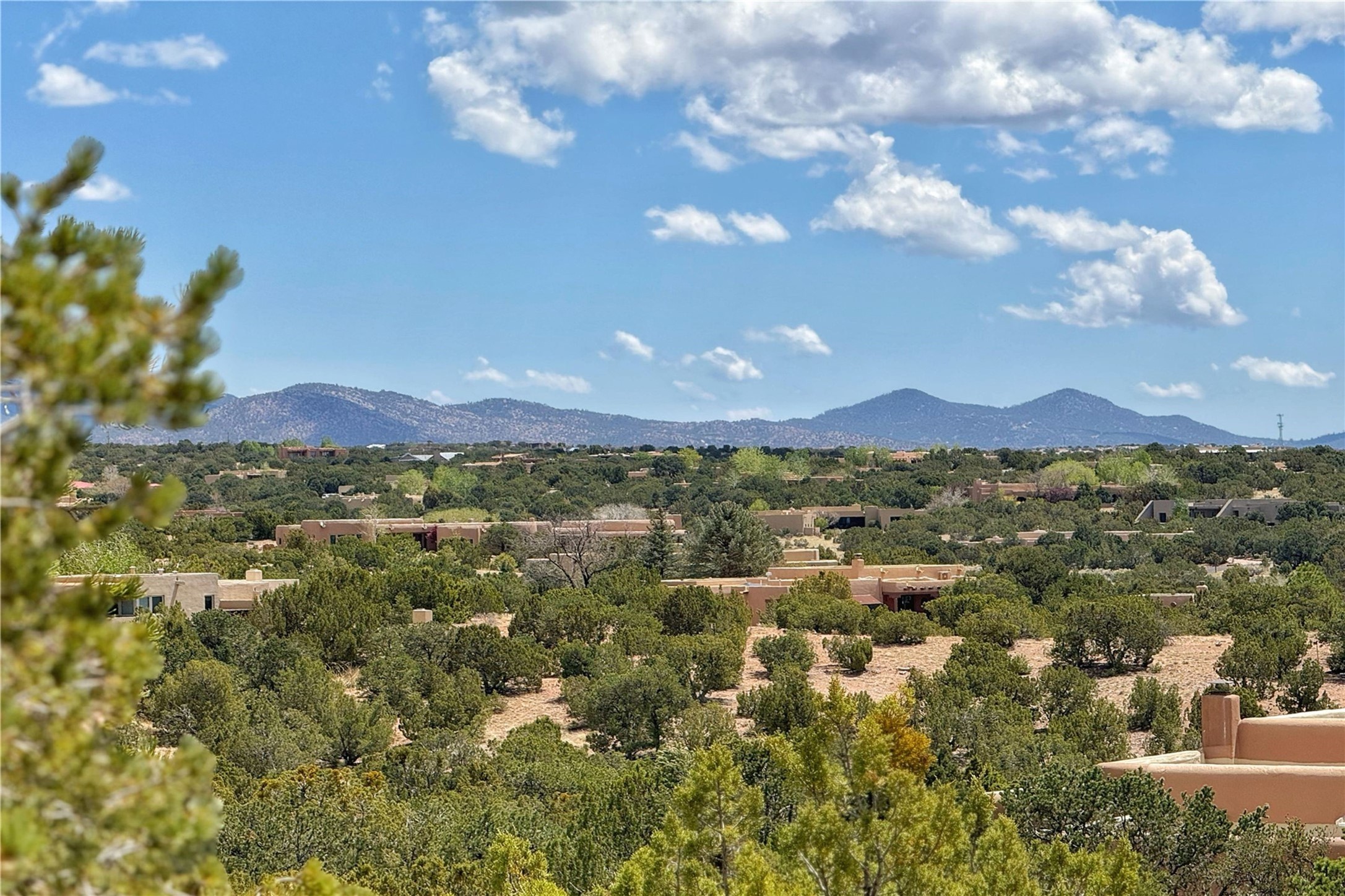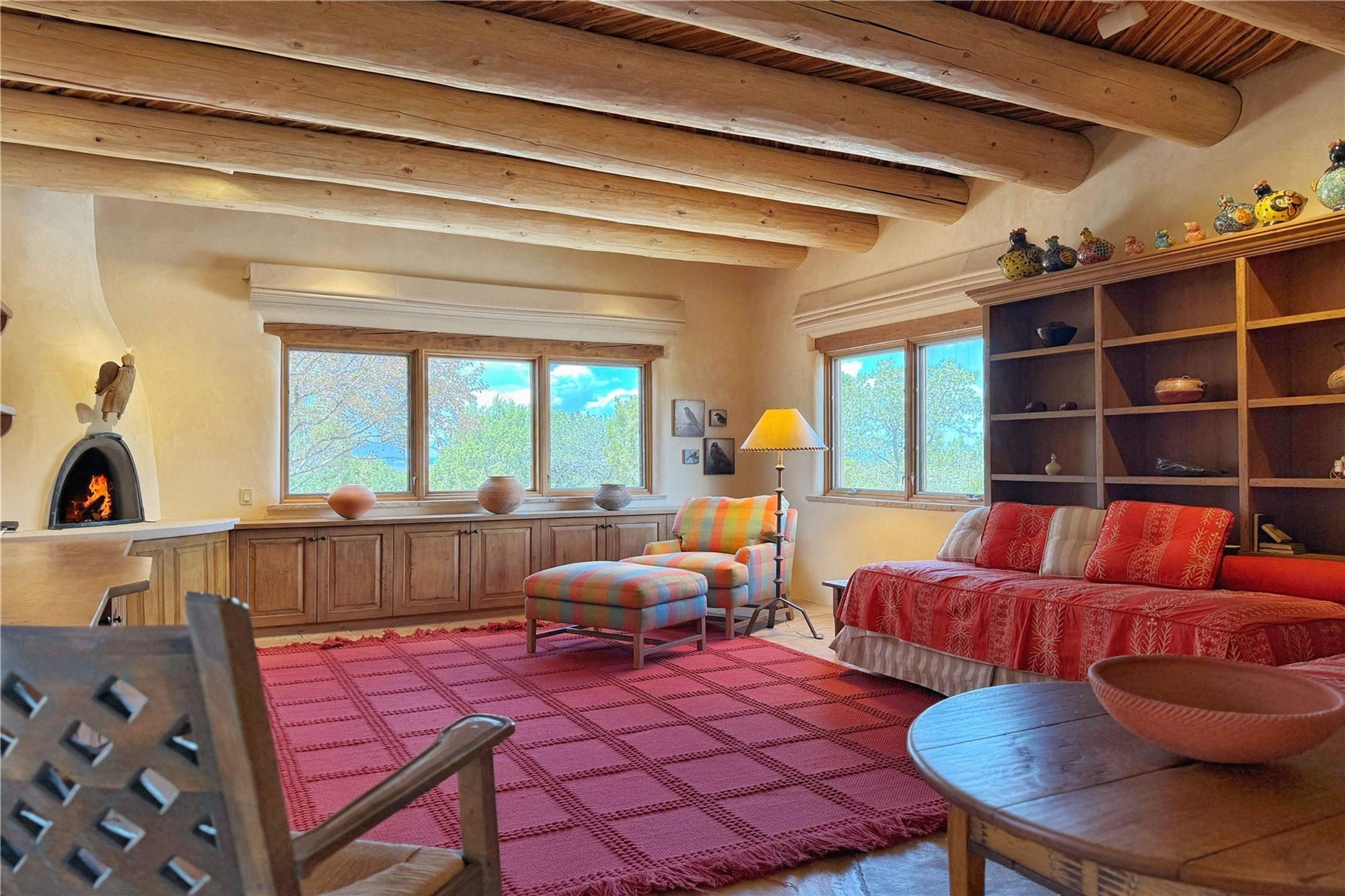 Welcome to a stunning Southwest-style home offering the perfect blend of elegance, warmth, and artistic expression. Built on an elevated lot to capture breathtaking Jemez Mountain views, this property is ideal for showcasing your art collection and entertaining in Santa Fe style.Warm earth tones complement the vigas and stone floors, creating a soft contemporary Southwest ambiance with timeless charm. A pond welcomes you and leads you to the wrap-around portal, complete with wood-burning fireplace, perfect for large gatherings. Enter through double Spanish doors that create a dramatic entry, setting the tone for the home. The foyer offers direct views to the back garden. Flow easily into the grand living room, featuring mountain views, wood-burning kiva fireplace, and cozy Banco seating. Made for entertaining, this home includes an elegant dining room with built-in cabinetry and portal access. The massive kitchen has an equally massive island, sitting room, and gas fireplace. The built in storage is impressive. The kitchen leads into the back garden with waterfall feature. 45 Violet Circle features an office, large media room and separate family room, for extra work, entertainment and relaxation spaces. A gas fireplace and large windows in the spacious primary suite highlight the back garden. The primary bath has his/hers showers and toilets. The primary closet is home to a walk in safe. Adjacent to the suite is a bonus/rec room with access to an underground space, perfect to turn into a dedicated wine cellar. The separate casita boasts high ceilings, decorative tiles, and a gas fireplace. Exquisite landscaping showcases 3 water features, adding elegance and peacefulness. This residence is designed around multiple outdoor spaces for true indoor/outdoor living.With the water feature sounds, art displays spaces, and large rooms, this home is peaceful, impressive and substantial.Please note, fires in fireplaces may be digitally added