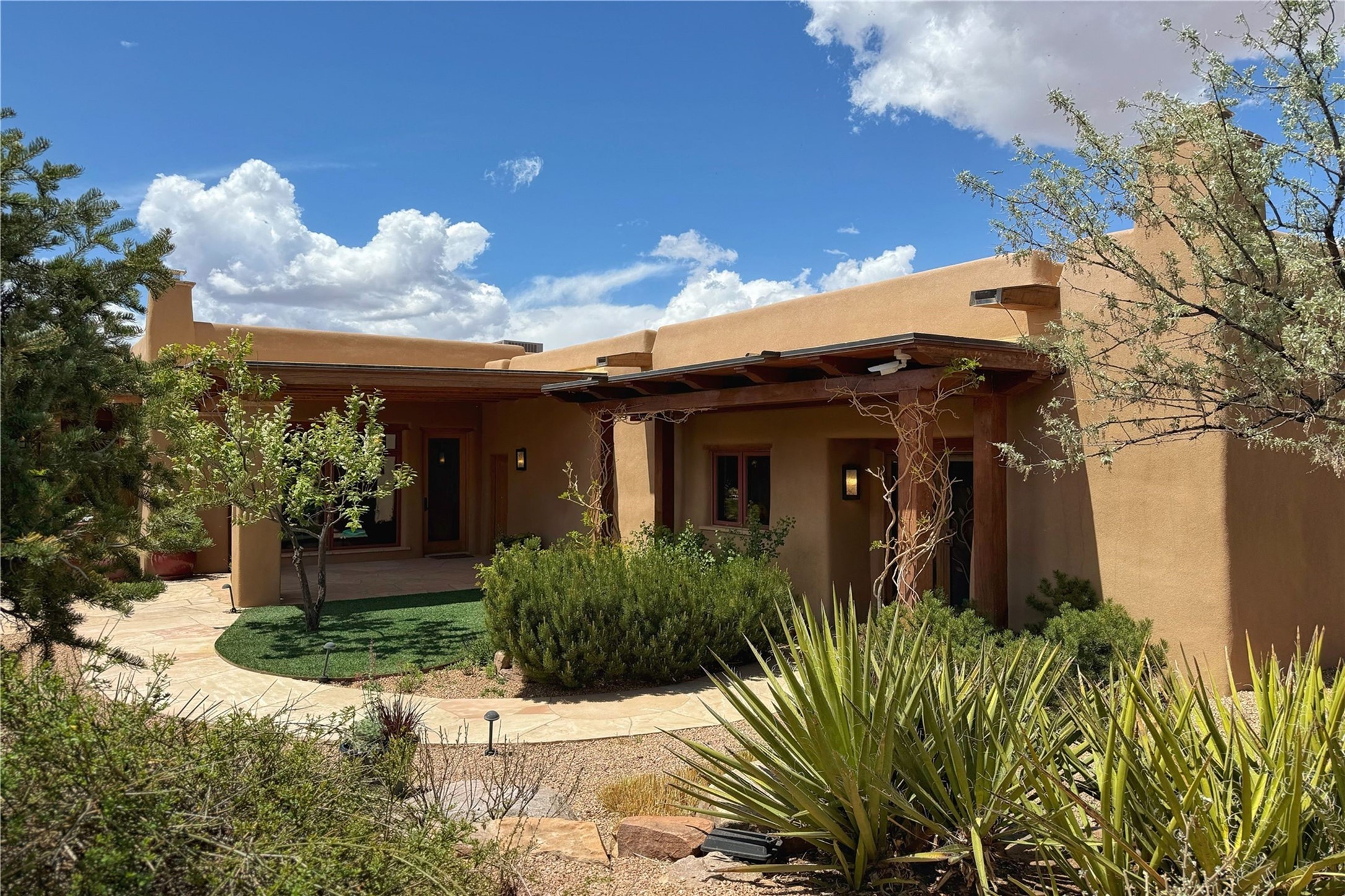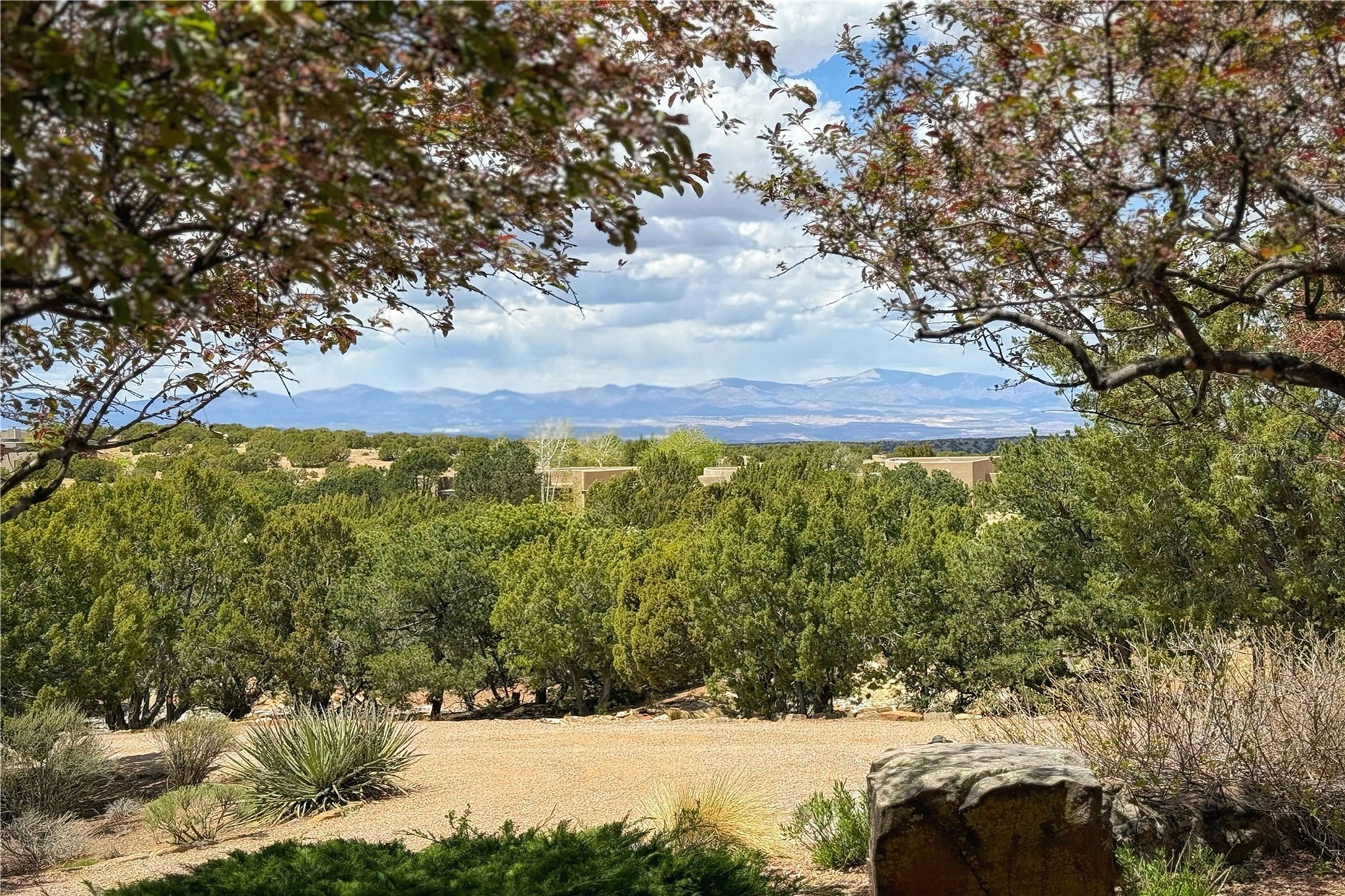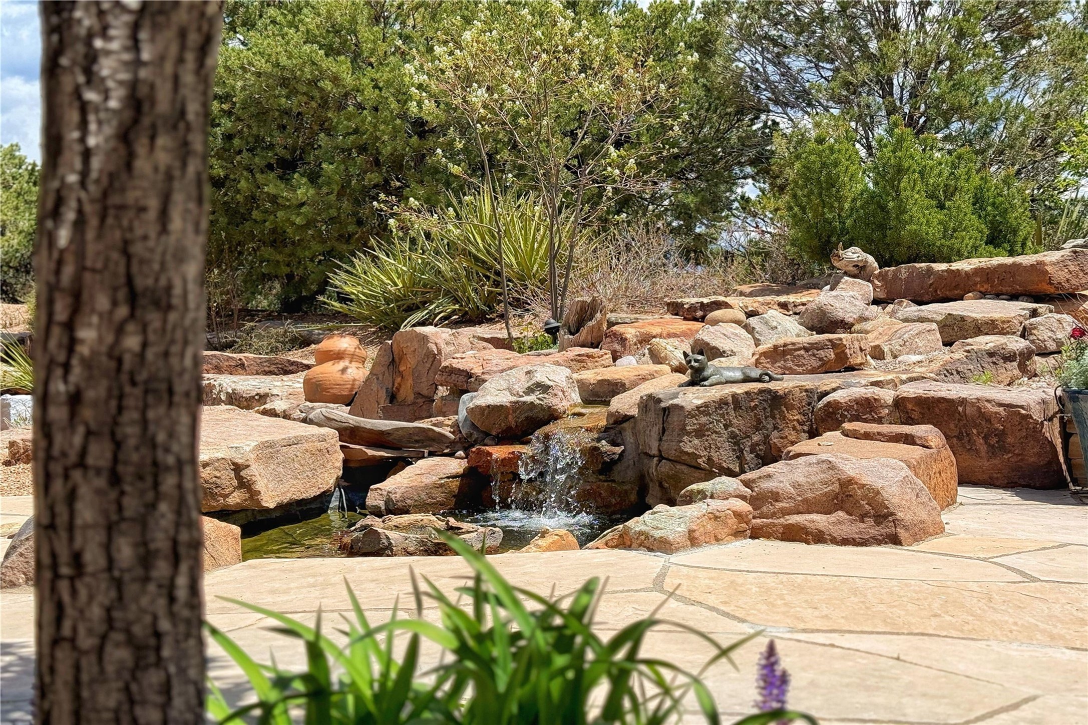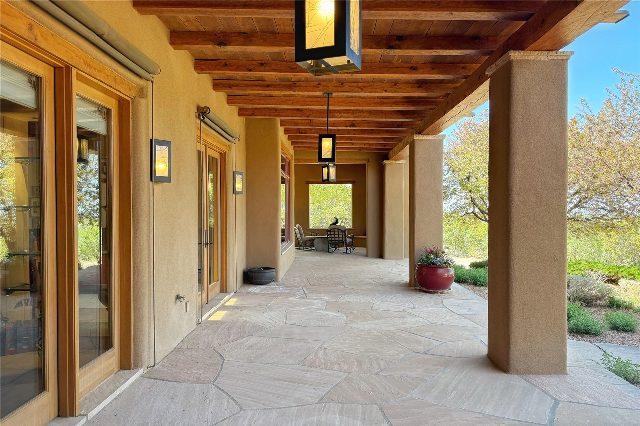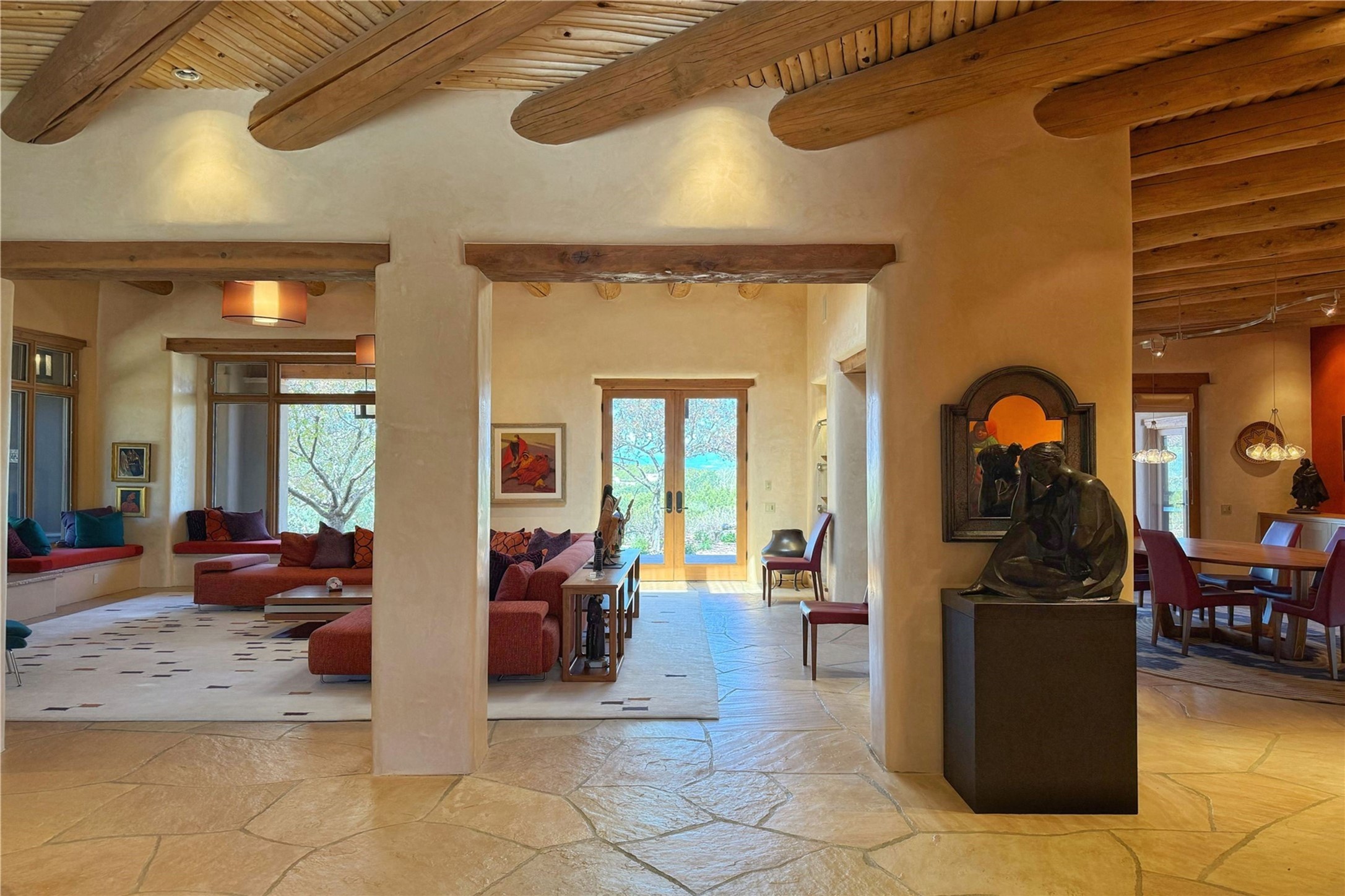 Welcome to a stunning Southwest-style home offering the perfect blend of elegance, warmth, and artistic expression. Built on an elevated lot to capture breathtaking Jemez Mountain views, this property is ideal for showcasing your art collection and entertaining in Santa Fe style.Warm earth tones complement the vigas and stone floors, creating a soft contemporary Southwest ambiance with timeless charm. A pond welcomes you and leads you to the wrap-around portal, complete with wood-burning fireplace, perfect for large gatherings. Enter through double Spanish doors that create a dramatic entry, setting the tone for the home. The foyer offers direct views to the back garden. Flow easily into the grand living room, featuring mountain views, wood-burning kiva fireplace, and cozy Banco seating. Made for entertaining, this home includes an elegant dining room with built-in cabinetry and portal access. The massive kitchen has an equally massive island, sitting room, and gas fireplace. The built in storage is impressive. The kitchen leads into the back garden with waterfall feature. 45 Violet Circle features an office, large media room and separate family room, for extra work, entertainment and relaxation spaces. A gas fireplace and large windows in the spacious primary suite highlight the back garden. The primary bath has his/hers showers and toilets. The primary closet is home to a walk in safe. Adjacent to the suite is a bonus/rec room with access to an underground space, perfect to turn into a dedicated wine cellar. The separate casita boasts high ceilings, decorative tiles, and a gas fireplace. Exquisite landscaping showcases 3 water features, adding elegance and peacefulness. This residence is designed around multiple outdoor spaces for true indoor/outdoor living.With the water feature sounds, art displays spaces, and large rooms, this home is peaceful, impressive and substantial.Please note, fires in fireplaces may be digitally added