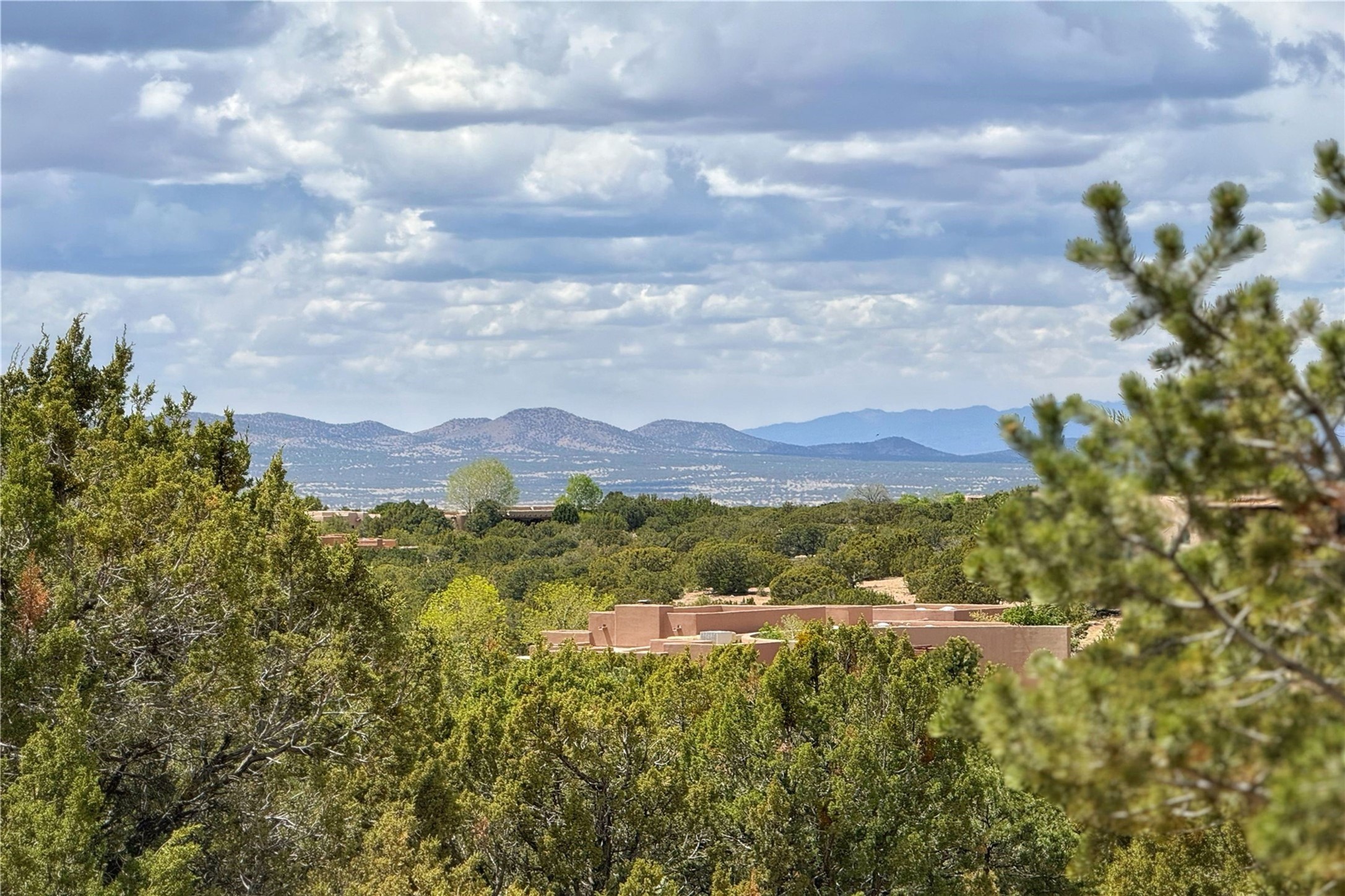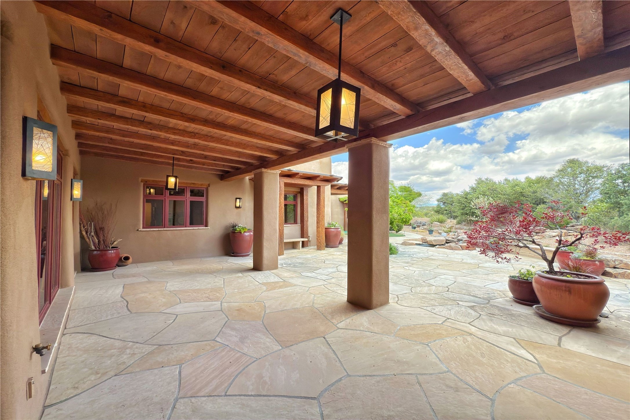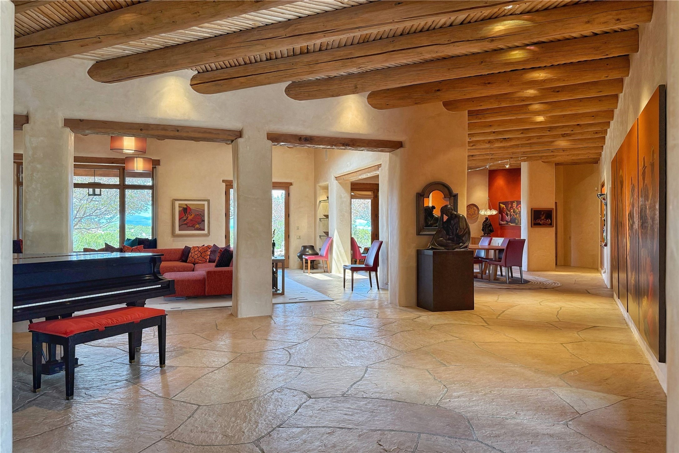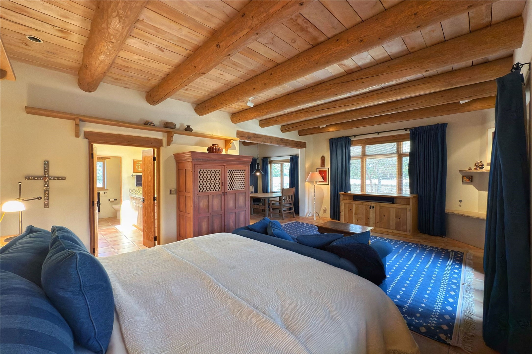Welcome to a stunning Southwest-style home offering the perfect blend of elegance, warmth, and artistic expression. Built on an elevated lot to capture breathtaking Jemez Mountain views, this property is ideal for showcasing your art collection and entertaining in Santa Fe style.Warm earth tones complement the vigas and stone floors, creating a soft contemporary Southwest ambiance with timeless charm. A pond welcomes you and leads you to the wrap-around portal, complete with wood-burning fireplace, perfect for large gatherings. Enter through double Spanish doors that create a dramatic entry, setting the tone for the home. The foyer offers direct views to the back garden. Flow easily into the grand living room, featuring mountain views, wood-burning kiva fireplace, and cozy Banco seating. Made for entertaining, this home includes an elegant dining room with built-in cabinetry and portal access. The massive kitchen has an equally massive island, sitting room, and gas fireplace. The built in storage is impressive. The kitchen leads into the back garden with waterfall feature. 45 Violet Circle features an office, large media room and separate family room, for extra work, entertainment and relaxation spaces. A gas fireplace and large windows in the spacious primary suite highlight the back garden. The primary bath has his/hers showers and toilets. The primary closet is home to a walk in safe. Adjacent to the suite is a bonus/rec room with access to an underground space, perfect to turn into a dedicated wine cellar. The separate casita boasts high ceilings, decorative tiles, and a gas fireplace. Exquisite landscaping showcases 3 water features, adding elegance and peacefulness. This residence is designed around multiple outdoor spaces for true indoor/outdoor living.With the water feature sounds, art displays spaces, and large rooms, this home is peaceful, impressive and substantial.Please note, fires in fireplaces may be digitally added