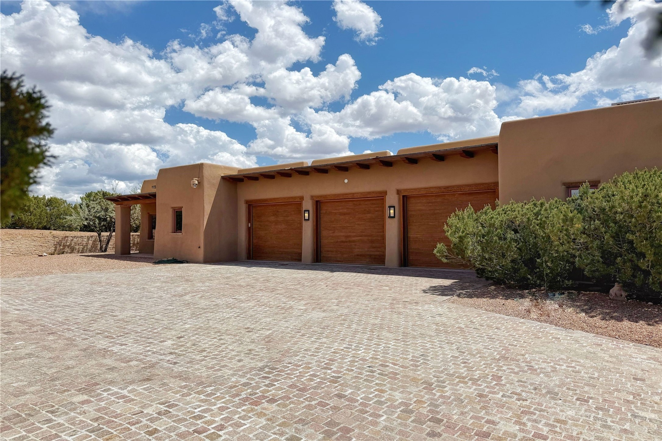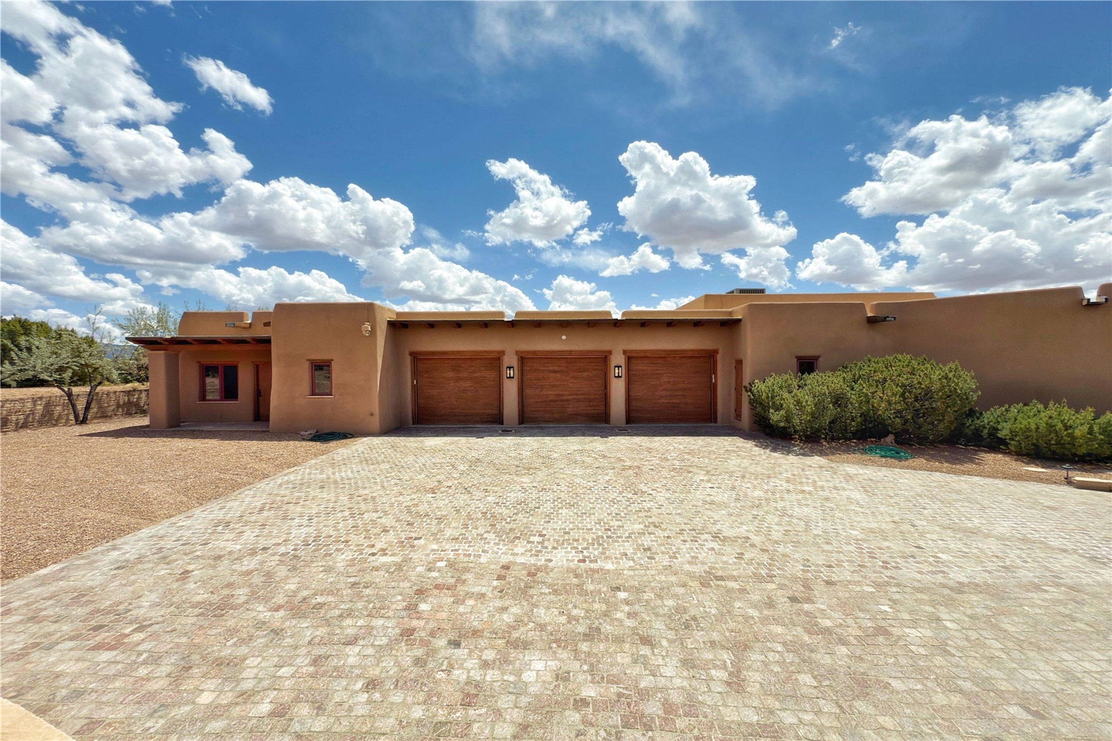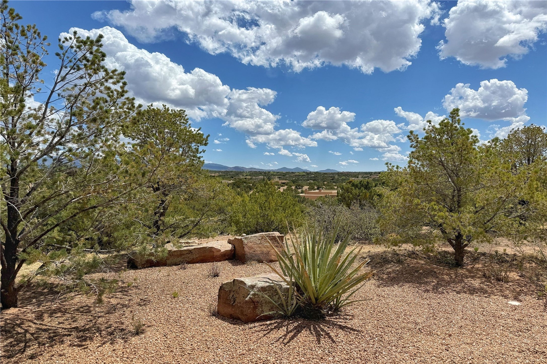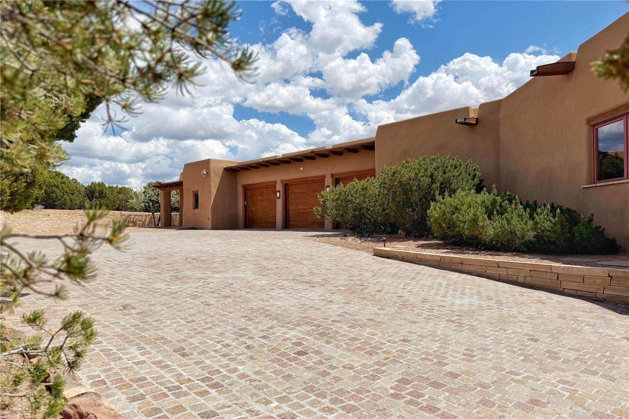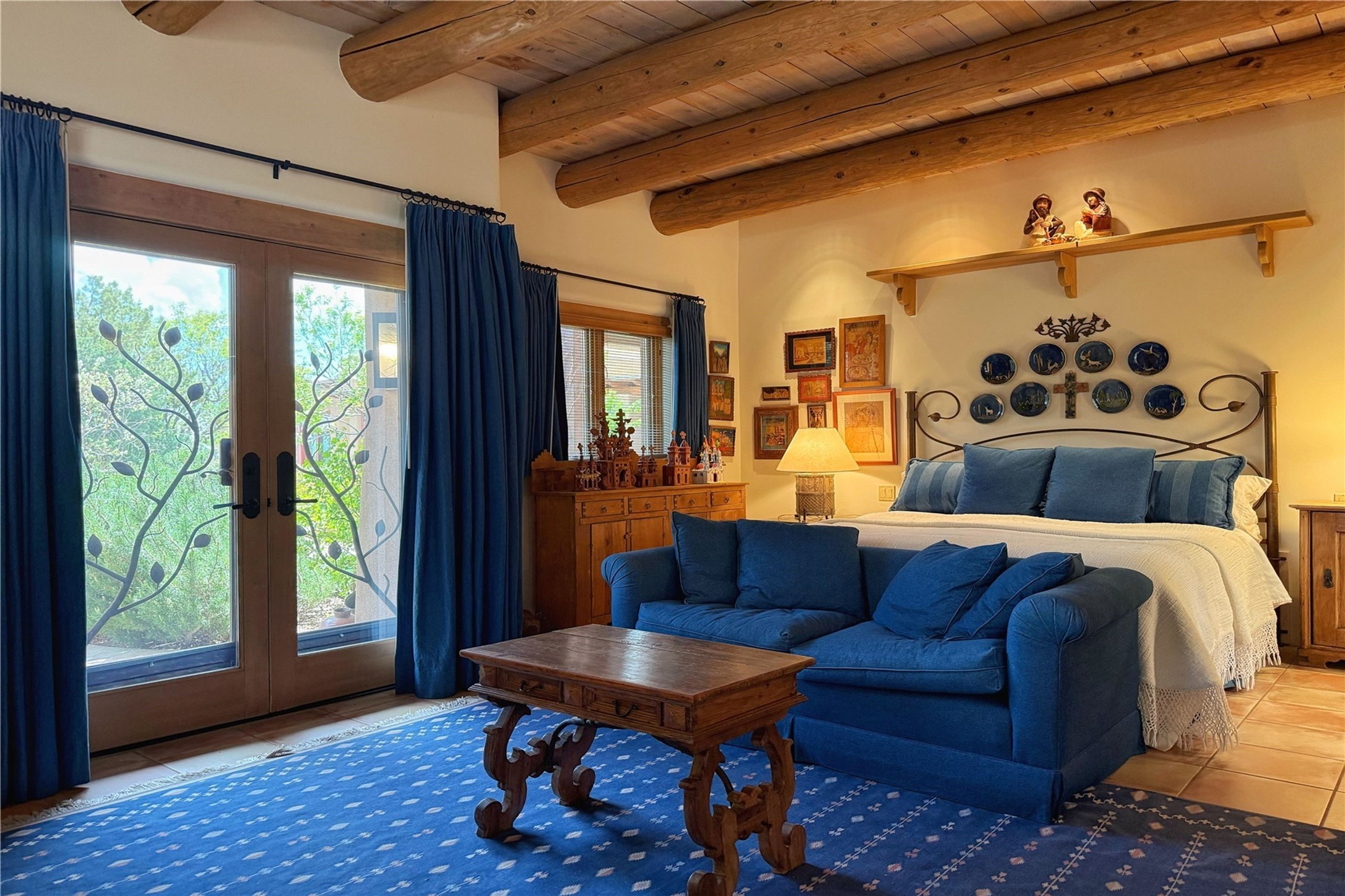 Welcome to a stunning Southwest-style home offering the perfect blend of elegance, warmth, and artistic expression. Built on an elevated lot to capture breathtaking Jemez Mountain views, this property is ideal for showcasing your art collection and entertaining in Santa Fe style.Warm earth tones complement the vigas and stone floors, creating a soft contemporary Southwest ambiance with timeless charm. A pond welcomes you and leads you to the wrap-around portal, complete with wood-burning fireplace, perfect for large gatherings. Enter through double Spanish doors that create a dramatic entry, setting the tone for the home. The foyer offers direct views to the back garden. Flow easily into the grand living room, featuring mountain views, wood-burning kiva fireplace, and cozy Banco seating. Made for entertaining, this home includes an elegant dining room with built-in cabinetry and portal access. The massive kitchen has an equally massive island, sitting room, and gas fireplace. The built in storage is impressive. The kitchen leads into the back garden with waterfall feature. 45 Violet Circle features an office, large media room and separate family room, for extra work, entertainment and relaxation spaces. A gas fireplace and large windows in the spacious primary suite highlight the back garden. The primary bath has his/hers showers and toilets. The primary closet is home to a walk in safe. Adjacent to the suite is a bonus/rec room with access to an underground space, perfect to turn into a dedicated wine cellar. The separate casita boasts high ceilings, decorative tiles, and a gas fireplace. Exquisite landscaping showcases 3 water features, adding elegance and peacefulness. This residence is designed around multiple outdoor spaces for true indoor/outdoor living.With the water feature sounds, art displays spaces, and large rooms, this home is peaceful, impressive and substantial.Please note, fires in fireplaces may be digitally added