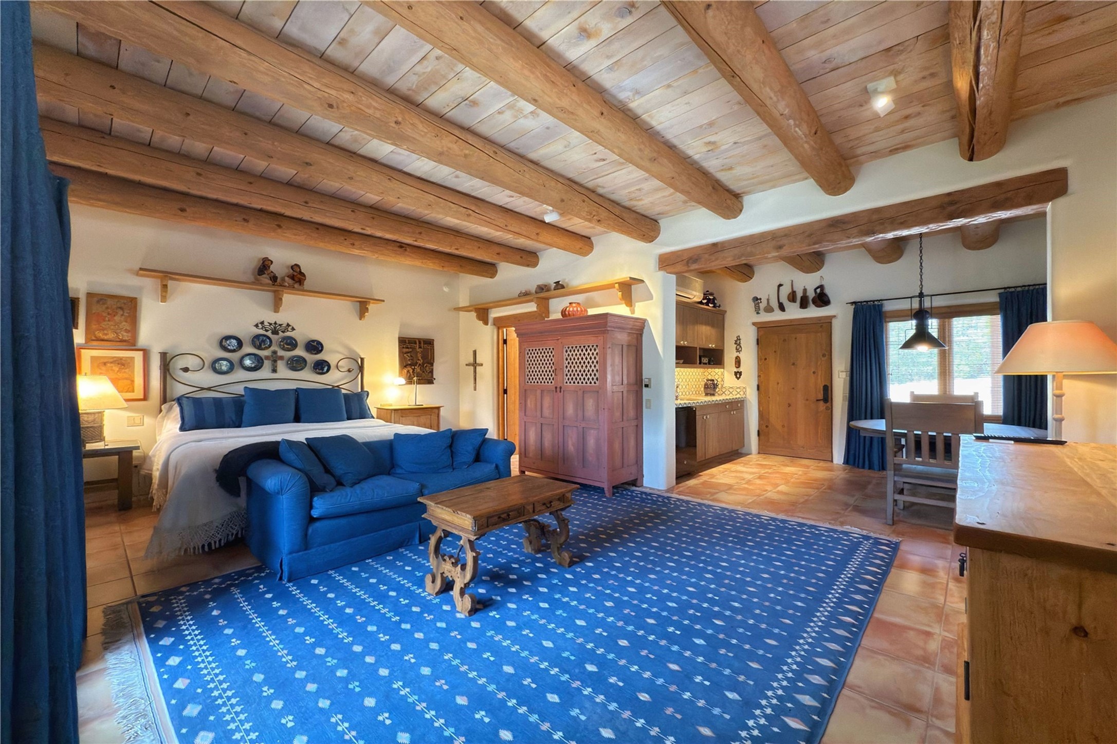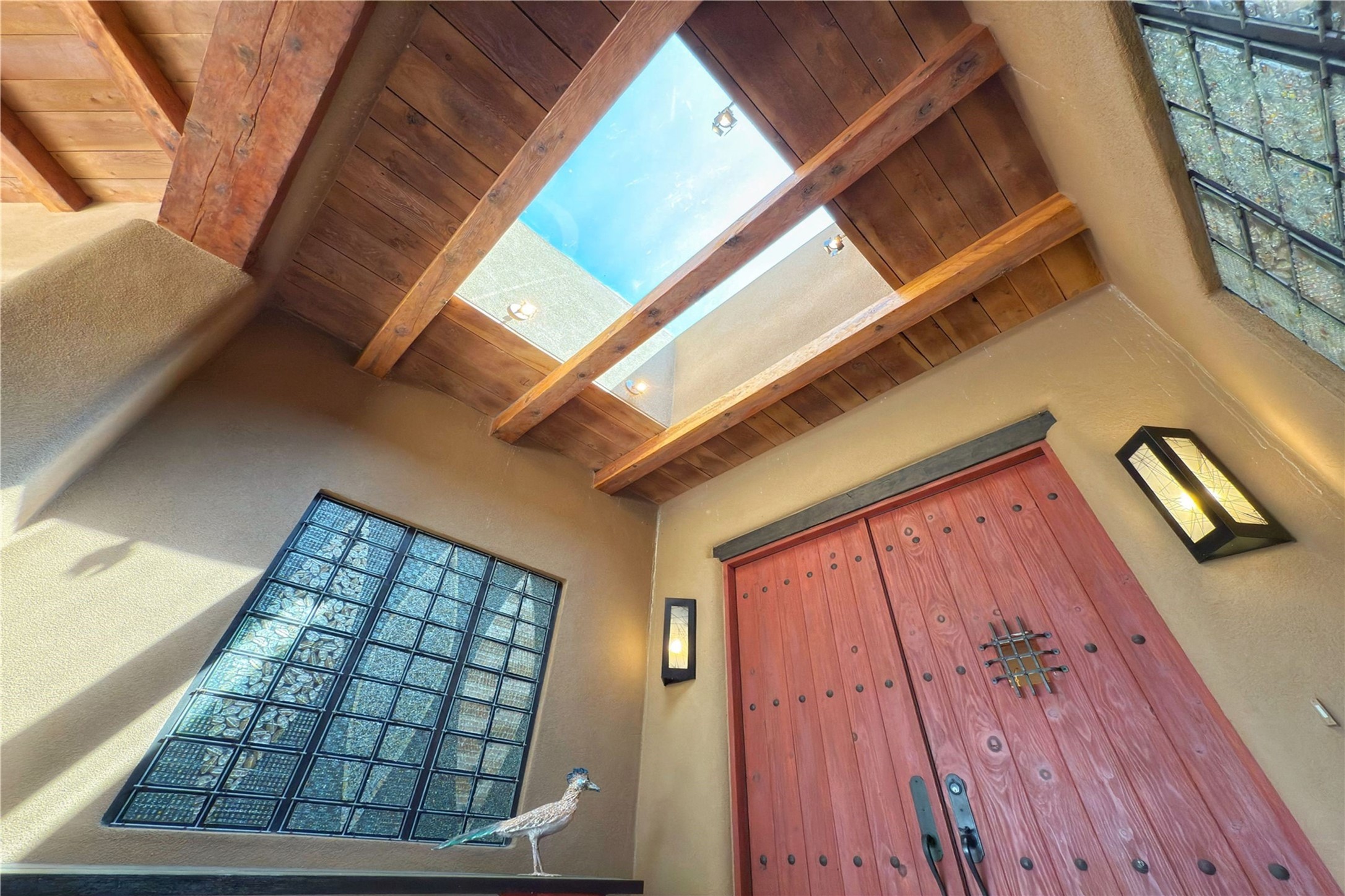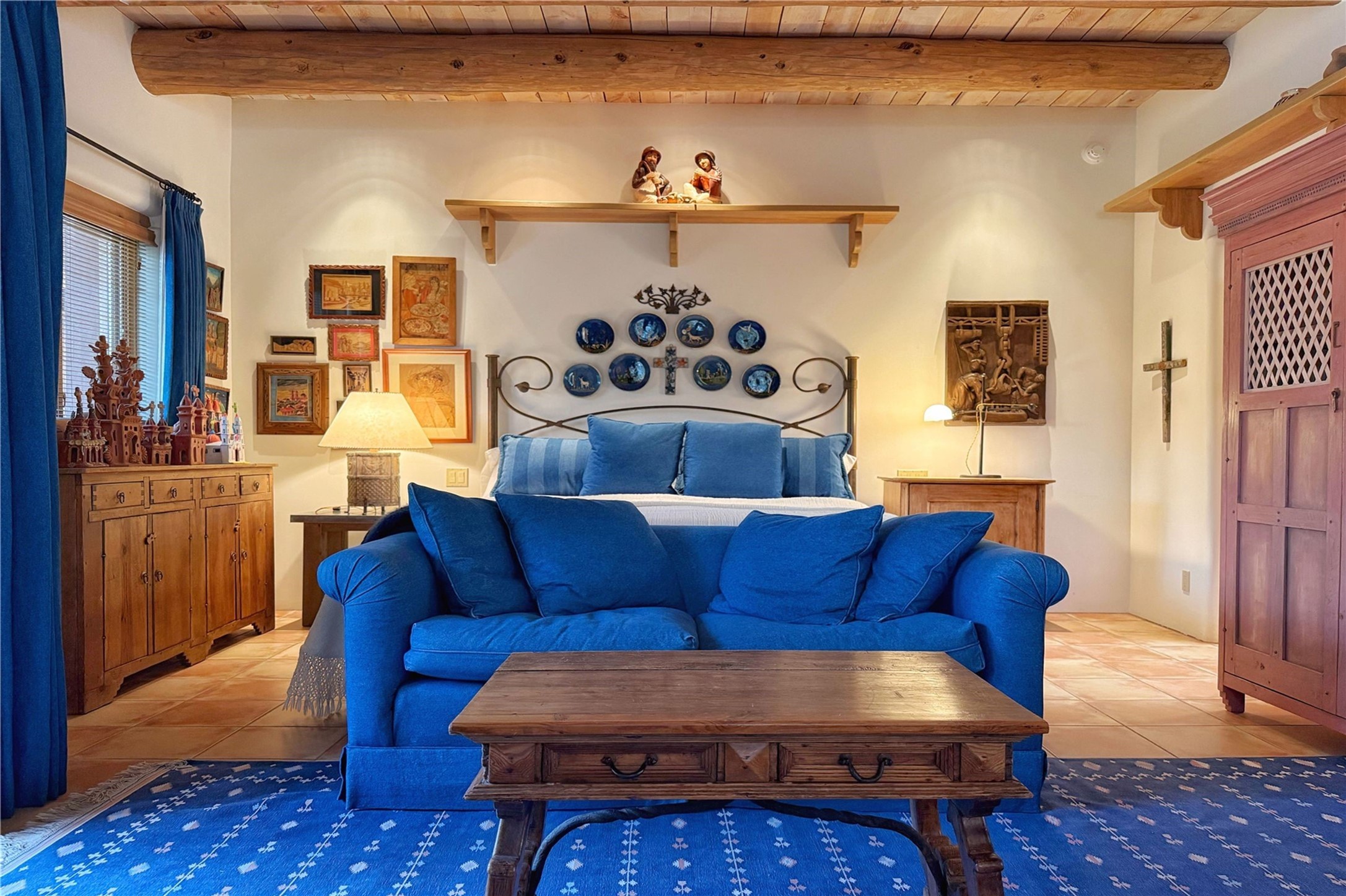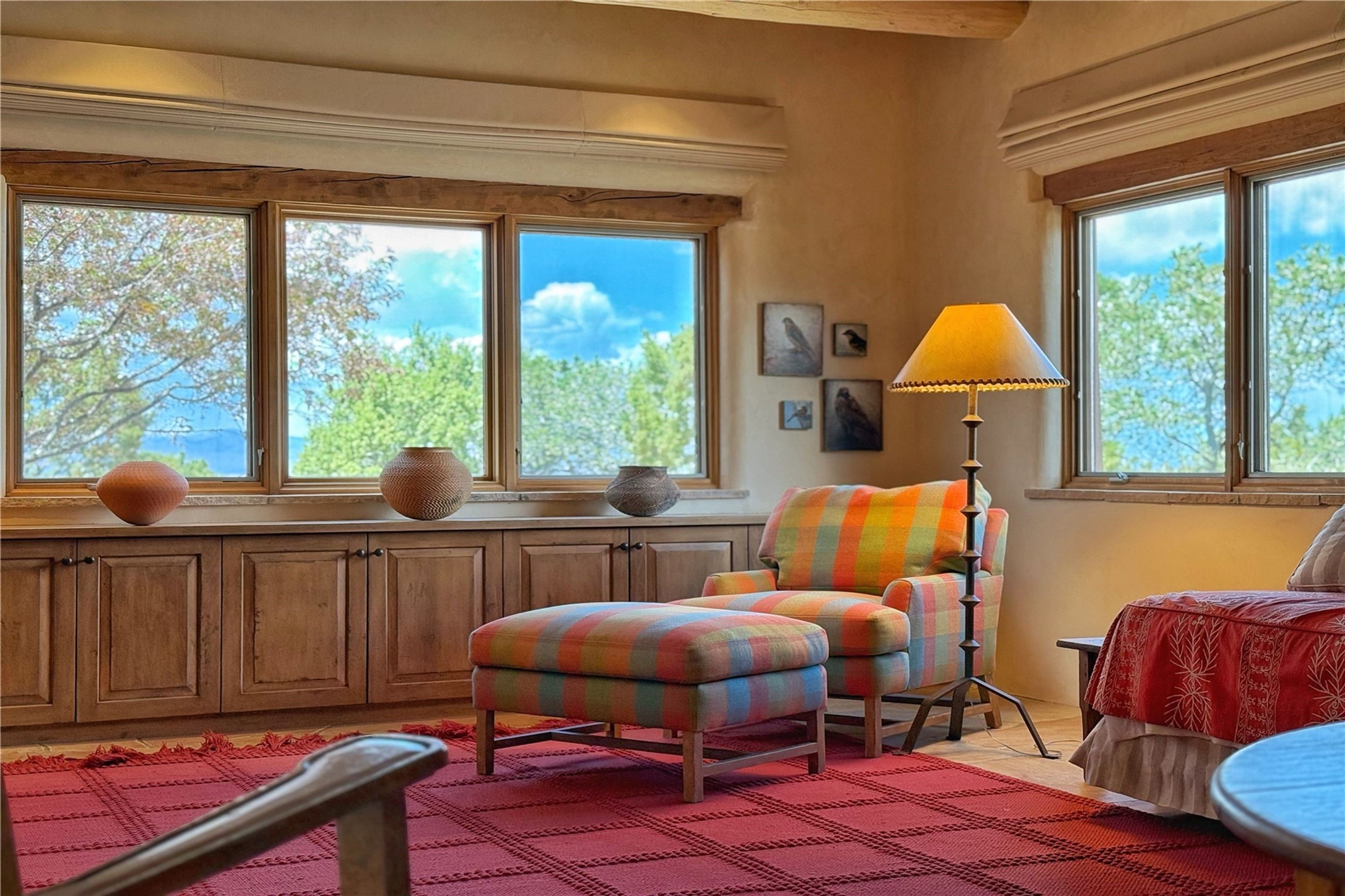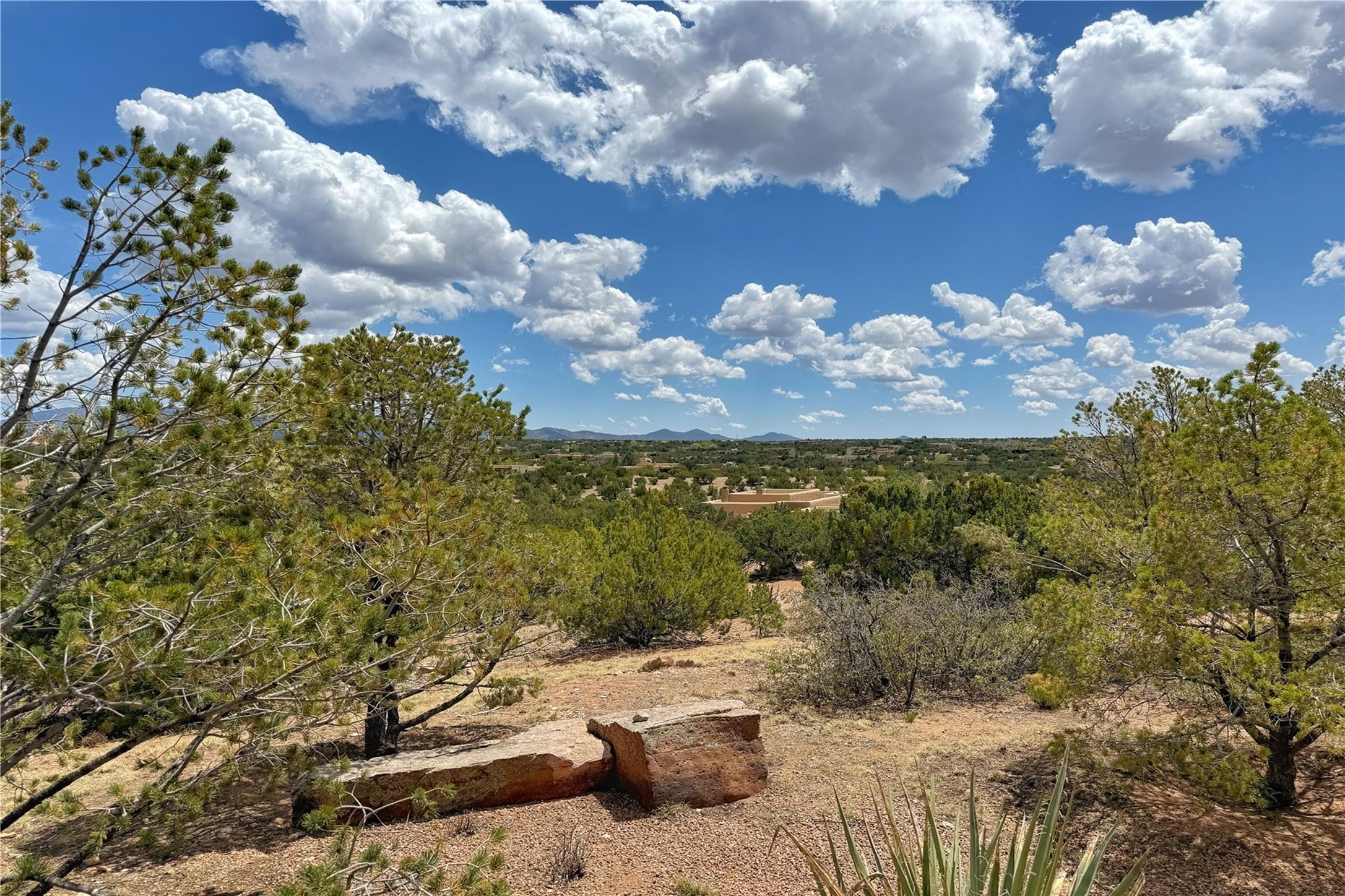 Welcome to a stunning Southwest-style home offering the perfect blend of elegance, warmth, and artistic expression. Built on an elevated lot to capture breathtaking Jemez Mountain views, this property is ideal for showcasing your art collection and entertaining in Santa Fe style.Warm earth tones complement the vigas and stone floors, creating a soft contemporary Southwest ambiance with timeless charm. A pond welcomes you and leads you to the wrap-around portal, complete with wood-burning fireplace, perfect for large gatherings. Enter through double Spanish doors that create a dramatic entry, setting the tone for the home. The foyer offers direct views to the back garden. Flow easily into the grand living room, featuring mountain views, wood-burning kiva fireplace, and cozy Banco seating. Made for entertaining, this home includes an elegant dining room with built-in cabinetry and portal access. The massive kitchen has an equally massive island, sitting room, and gas fireplace. The built in storage is impressive. The kitchen leads into the back garden with waterfall feature. 45 Violet Circle features an office, large media room and separate family room, for extra work, entertainment and relaxation spaces. A gas fireplace and large windows in the spacious primary suite highlight the back garden. The primary bath has his/hers showers and toilets. The primary closet is home to a walk in safe. Adjacent to the suite is a bonus/rec room with access to an underground space, perfect to turn into a dedicated wine cellar. The separate casita boasts high ceilings, decorative tiles, and a gas fireplace. Exquisite landscaping showcases 3 water features, adding elegance and peacefulness. This residence is designed around multiple outdoor spaces for true indoor/outdoor living.With the water feature sounds, art displays spaces, and large rooms, this home is peaceful, impressive and substantial.Please note, fires in fireplaces may be digitally added