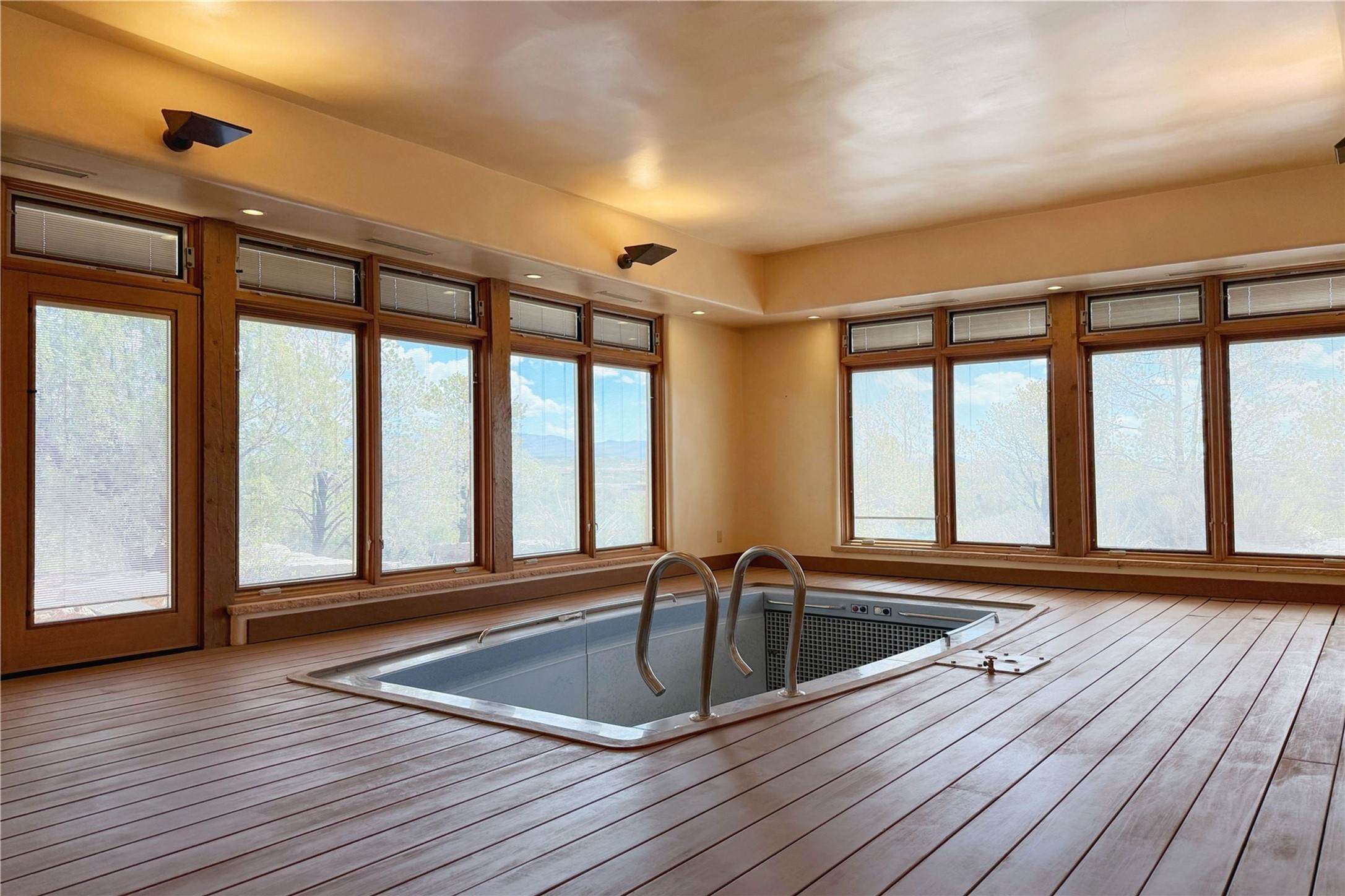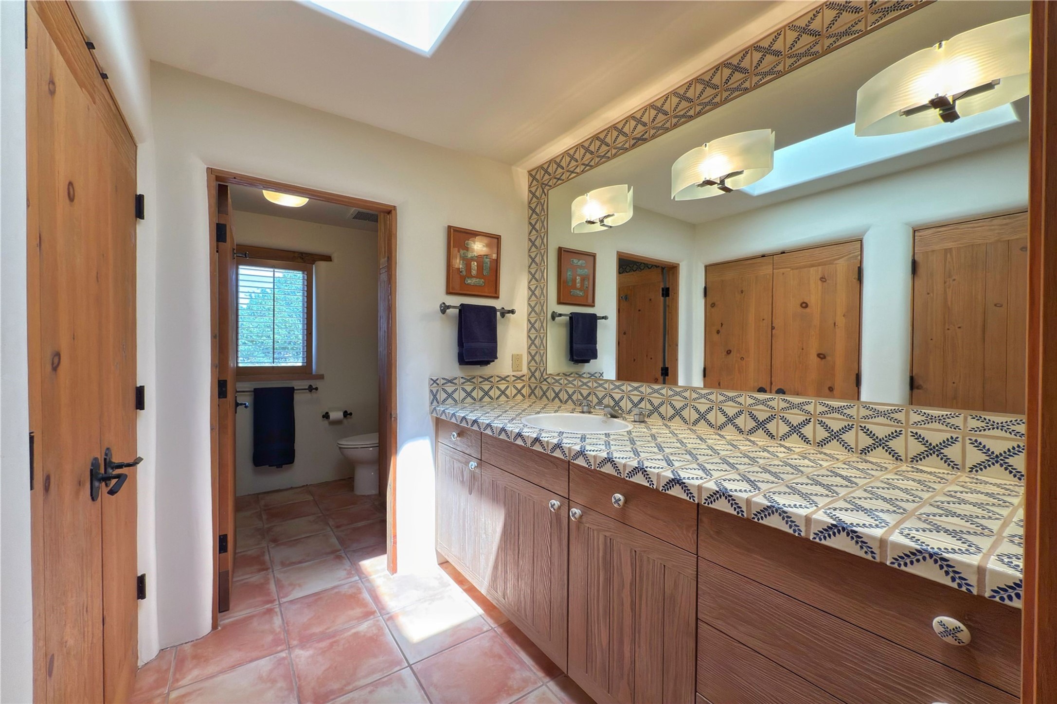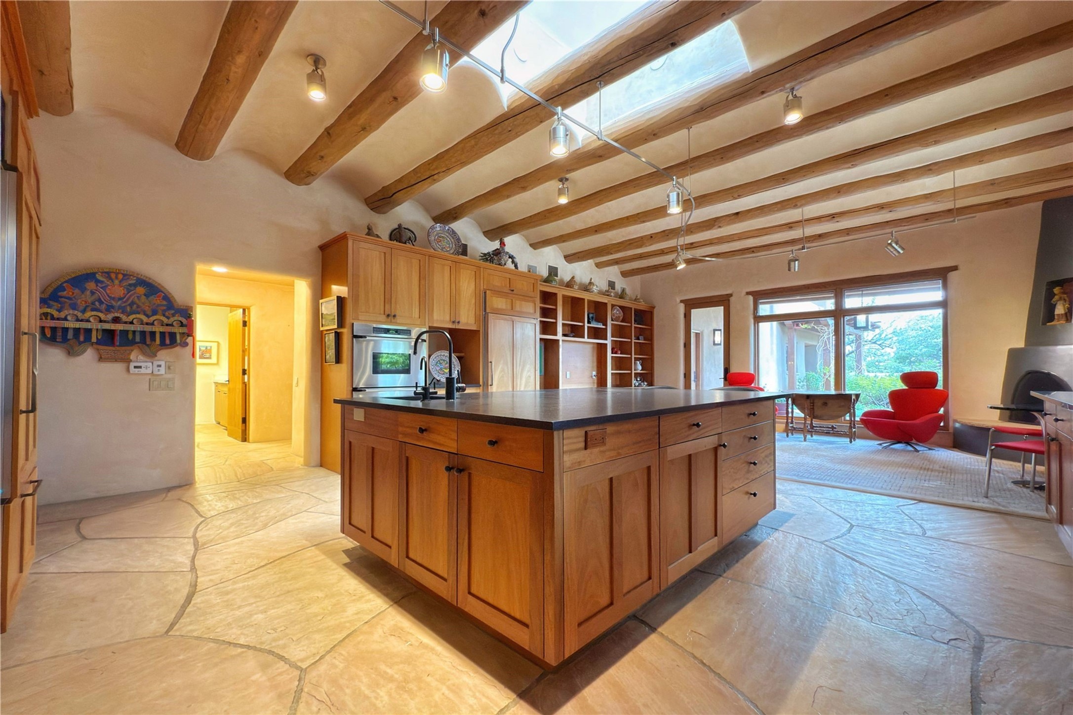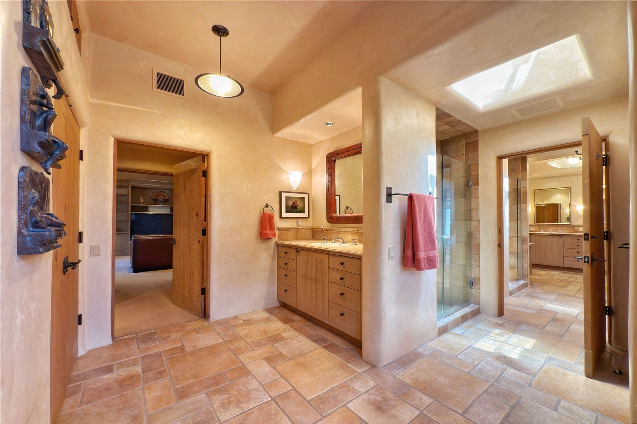 Welcome to a stunning Southwest-style home offering the perfect blend of elegance, warmth, and artistic expression. Built on an elevated lot to capture breathtaking Jemez Mountain views, this property is ideal for showcasing your art collection and entertaining in Santa Fe style.Warm earth tones complement the vigas and stone floors, creating a soft contemporary Southwest ambiance with timeless charm. A pond welcomes you and leads you to the wrap-around portal, complete with wood-burning fireplace, perfect for large gatherings. Enter through double Spanish doors that create a dramatic entry, setting the tone for the home. The foyer offers direct views to the back garden. Flow easily into the grand living room, featuring mountain views, wood-burning kiva fireplace, and cozy Banco seating. Made for entertaining, this home includes an elegant dining room with built-in cabinetry and portal access. The massive kitchen has an equally massive island, sitting room, and gas fireplace. The built in storage is impressive. The kitchen leads into the back garden with waterfall feature. 45 Violet Circle features an office, large media room and separate family room, for extra work, entertainment and relaxation spaces. A gas fireplace and large windows in the spacious primary suite highlight the back garden. The primary bath has his/hers showers and toilets. The primary closet is home to a walk in safe. Adjacent to the suite is a bonus/rec room with access to an underground space, perfect to turn into a dedicated wine cellar. The separate casita boasts high ceilings, decorative tiles, and a gas fireplace. Exquisite landscaping showcases 3 water features, adding elegance and peacefulness. This residence is designed around multiple outdoor spaces for true indoor/outdoor living.With the water feature sounds, art displays spaces, and large rooms, this home is peaceful, impressive and substantial.Please note, fires in fireplaces may be digitally added