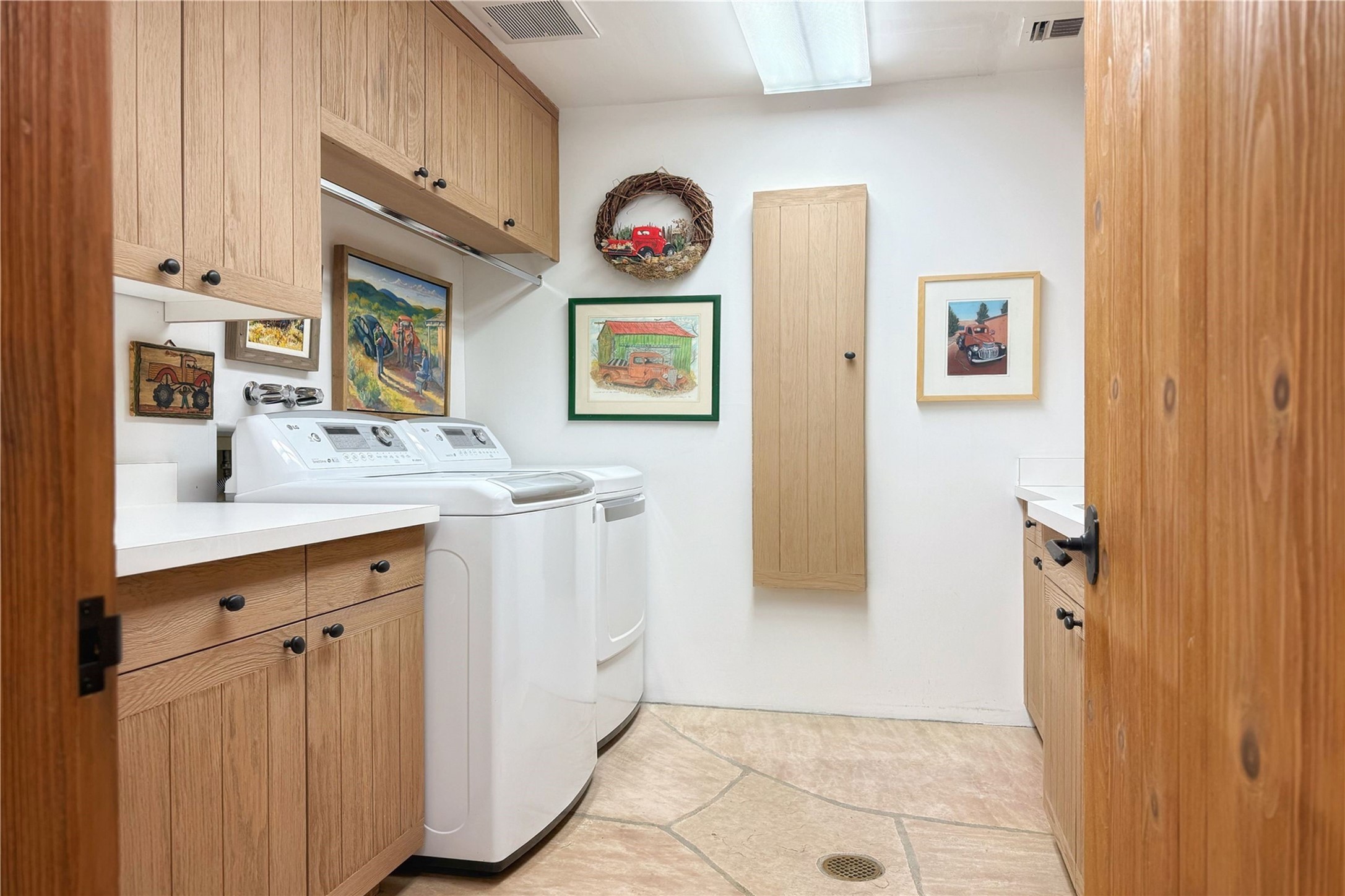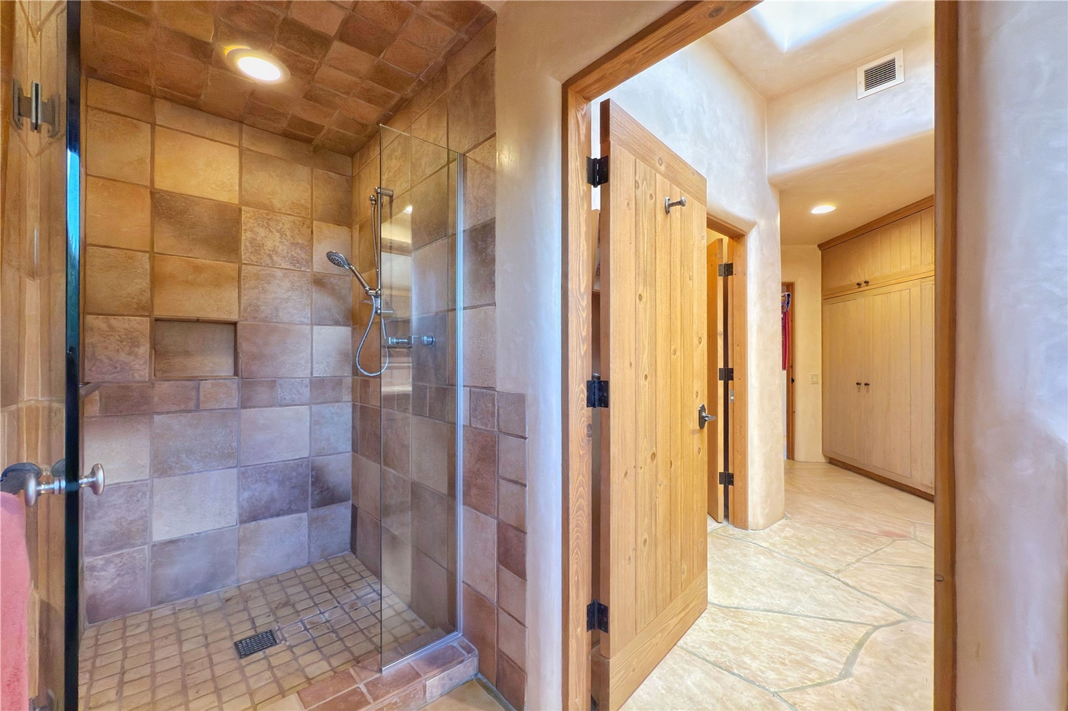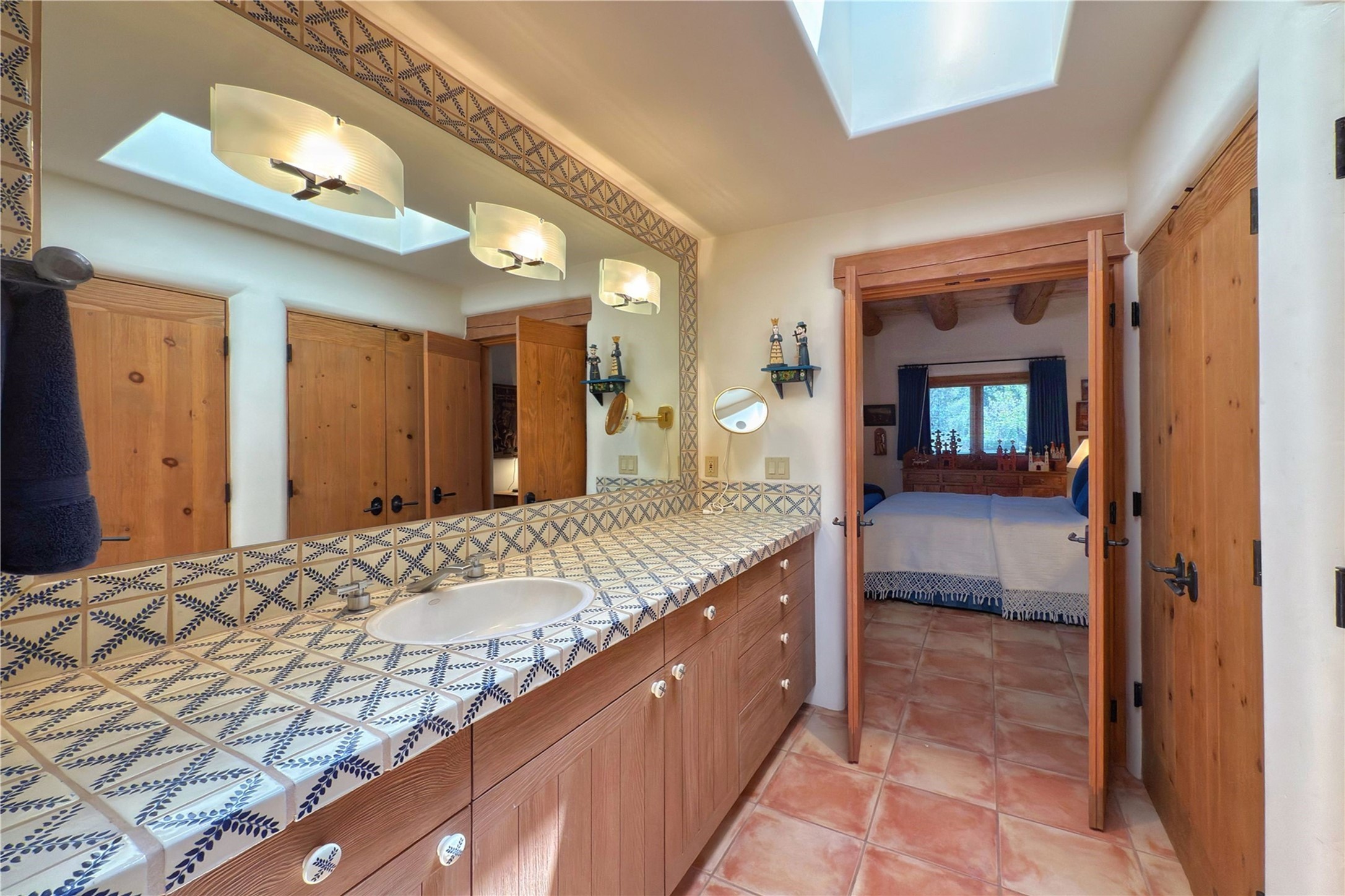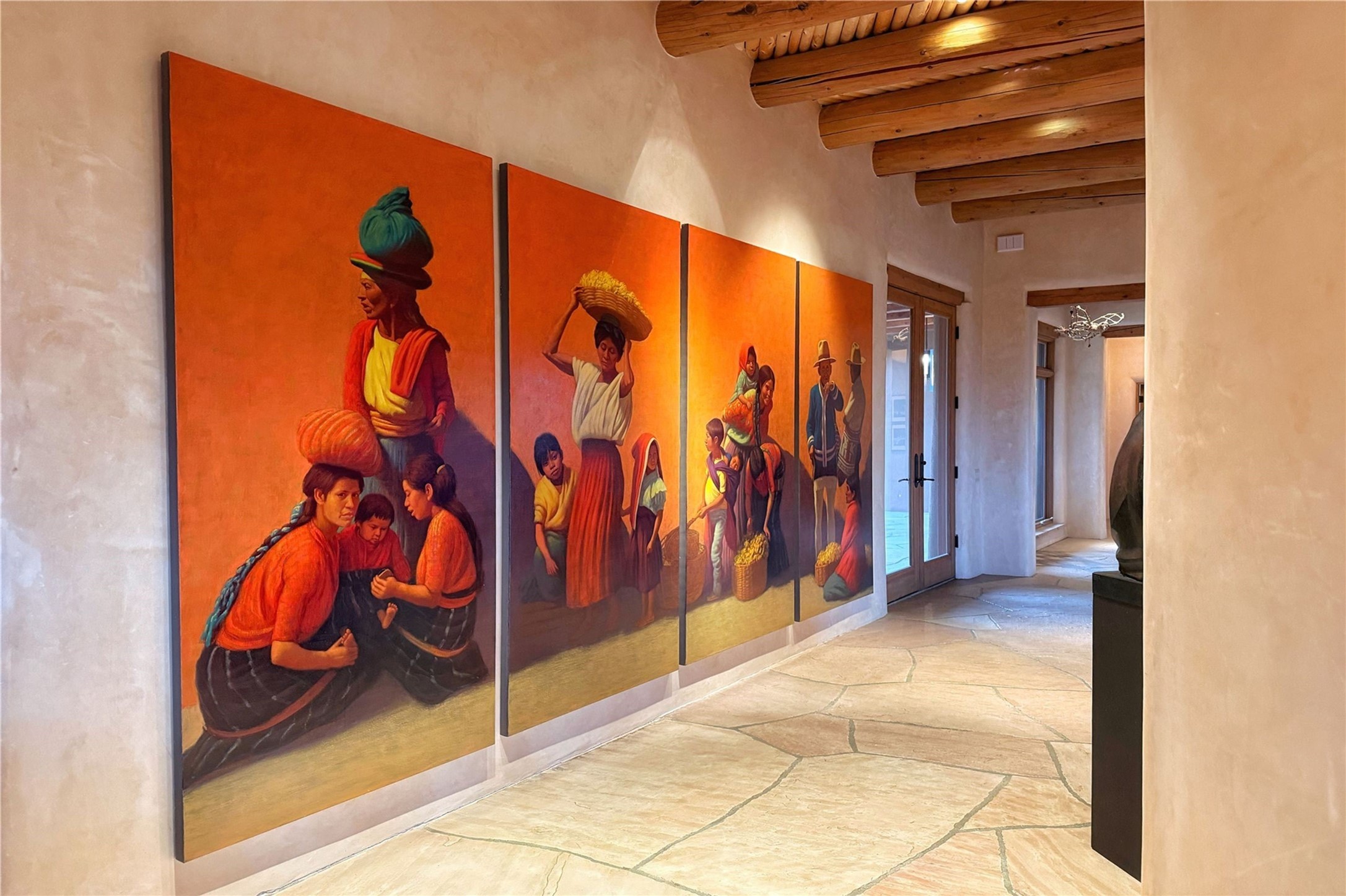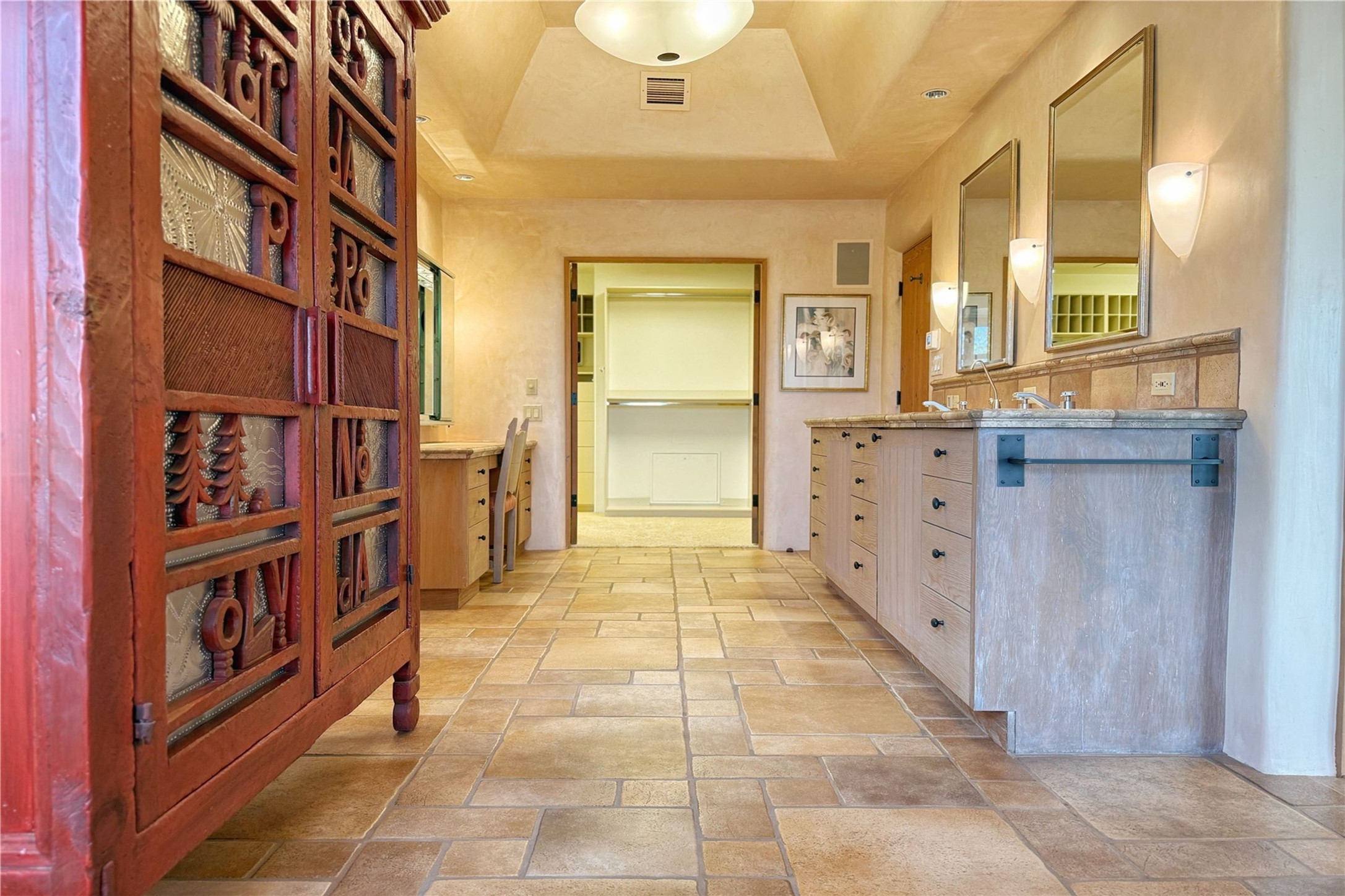Welcome to a stunning Southwest-style home offering the perfect blend of elegance, warmth, and artistic expression. Built on an elevated lot to capture breathtaking Jemez Mountain views, this property is ideal for showcasing your art collection and entertaining in Santa Fe style.Warm earth tones complement the vigas and stone floors, creating a soft contemporary Southwest ambiance with timeless charm. A pond welcomes you and leads you to the wrap-around portal, complete with wood-burning fireplace, perfect for large gatherings. Enter through double Spanish doors that create a dramatic entry, setting the tone for the home. The foyer offers direct views to the back garden. Flow easily into the grand living room, featuring mountain views, wood-burning kiva fireplace, and cozy Banco seating. Made for entertaining, this home includes an elegant dining room with built-in cabinetry and portal access. The massive kitchen has an equally massive island, sitting room, and gas fireplace. The built in storage is impressive. The kitchen leads into the back garden with waterfall feature. 45 Violet Circle features an office, large media room and separate family room, for extra work, entertainment and relaxation spaces. A gas fireplace and large windows in the spacious primary suite highlight the back garden. The primary bath has his/hers showers and toilets. The primary closet is home to a walk in safe. Adjacent to the suite is a bonus/rec room with access to an underground space, perfect to turn into a dedicated wine cellar. The separate casita boasts high ceilings, decorative tiles, and a gas fireplace. Exquisite landscaping showcases 3 water features, adding elegance and peacefulness. This residence is designed around multiple outdoor spaces for true indoor/outdoor living.With the water feature sounds, art displays spaces, and large rooms, this home is peaceful, impressive and substantial.Please note, fires in fireplaces may be digitally added