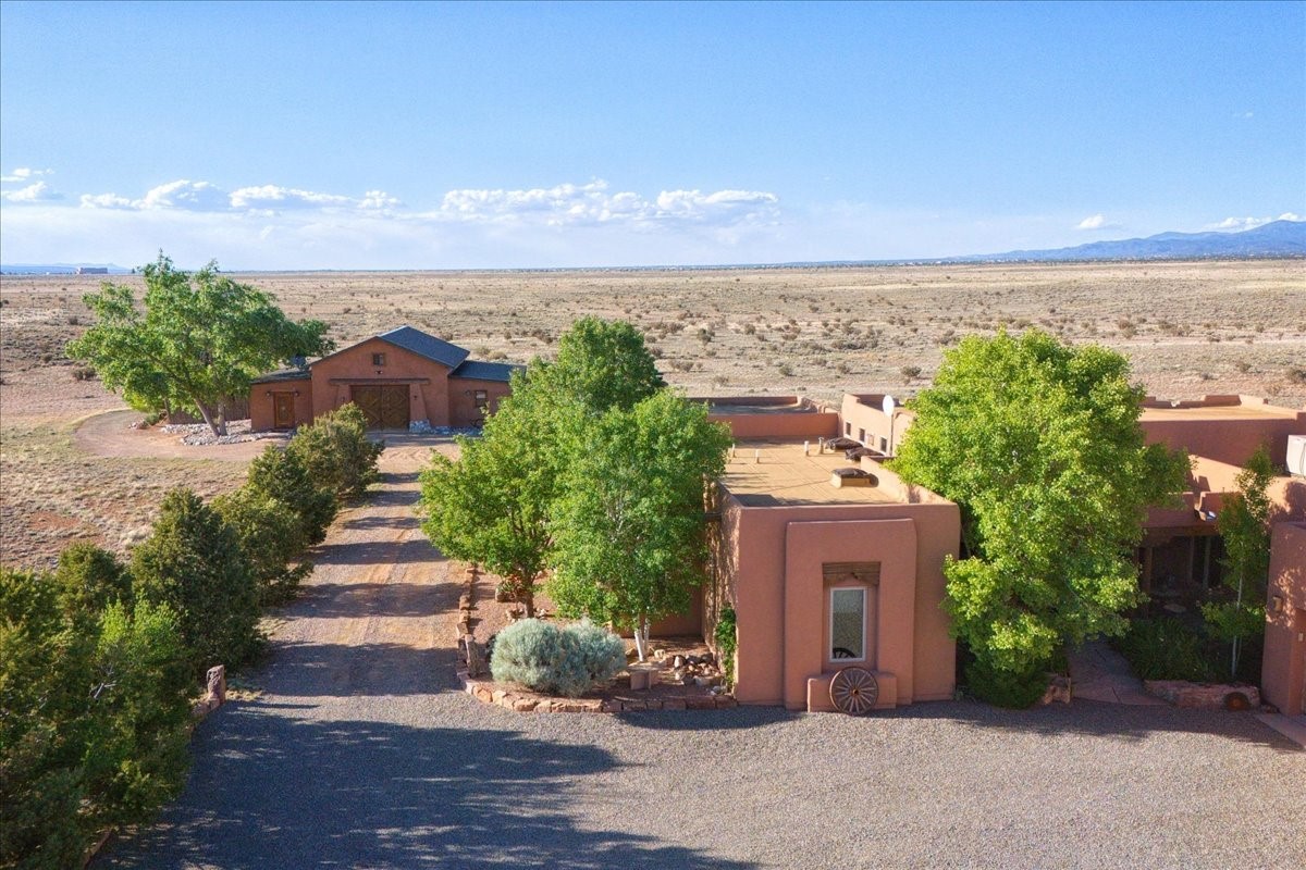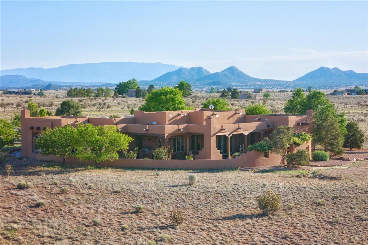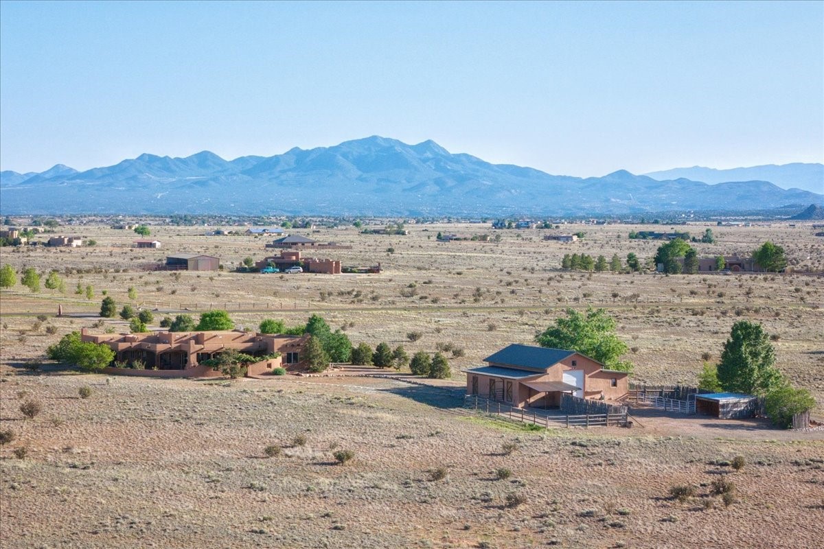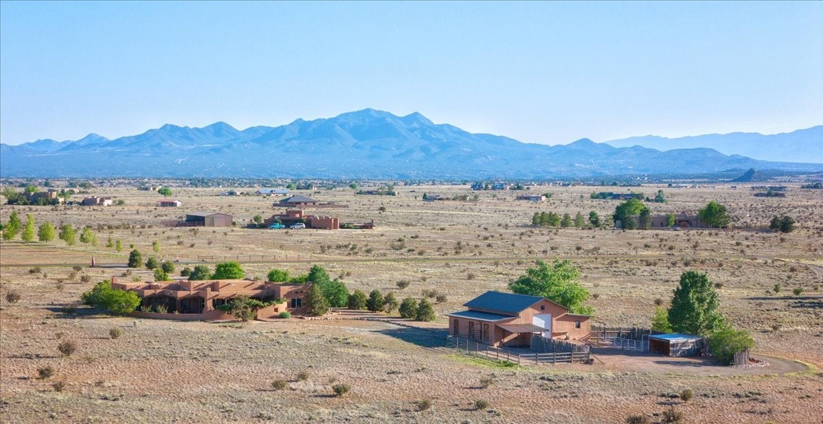 Welcome to the gated community of Rancho San Marcos. This stunning Pueblo-style custom built home sits on 12.51 acres & offers breathtaking 360 views of the Ortiz, Sangre De Cristo Mountains and the Cerrillos Hills. This expansive 2611 sq. ft. single-level residence features 3 bedrooms and 3 bathrooms, Primary Bath has full-size jet tub; two separated living areas; Chef's Kitchen has granite countertops, island, custom-built cabinets; Separate Dining Room; custom & recessed lighting; Hand-troweled diamond plaster finish walls with lighted nichos; 4 Fireplaces, Kiva, Shepard style; Pella Windows at high and low walls; Oversized vigas; Ceramic tile and colored concrete floors; In floor radiant heat; Outside living includes large portal with Spanish corbels, latillas and colored cement floors, large Kiva fireplace; flagstone and river-rock flower-lined patio, stucco privacy wall with archways, wall windows, draped in grapevines. Native Xeriscape grounds are drought-resistant plantings, mature fruit trees and pion trees fed by an underground automatic drip irrigation system.Heated 3-car garage, finished walls; wash sink area.This remarkable property boasts a 354 sq. ft. detached studio, complete with an open bedroom, living area, and a full bath. It is an ideal space for guests seeking a peaceful getaway. Additionally, the property boasts an impressive 1,824 sq. ft. horse barn/outbuilding.This property is ideal for equestrian enthusiasts and those wanting to be close to Santa Fe's vibrant culture and entertainment. Just 30 minutes from the Santa Fe Plaza, museums, and galleries. It's a 55 minute drive to Ski either Santa Fe or Sandia Peak. 10 minutes to I-25 and the Rail Runner. Don't miss this opportunity!