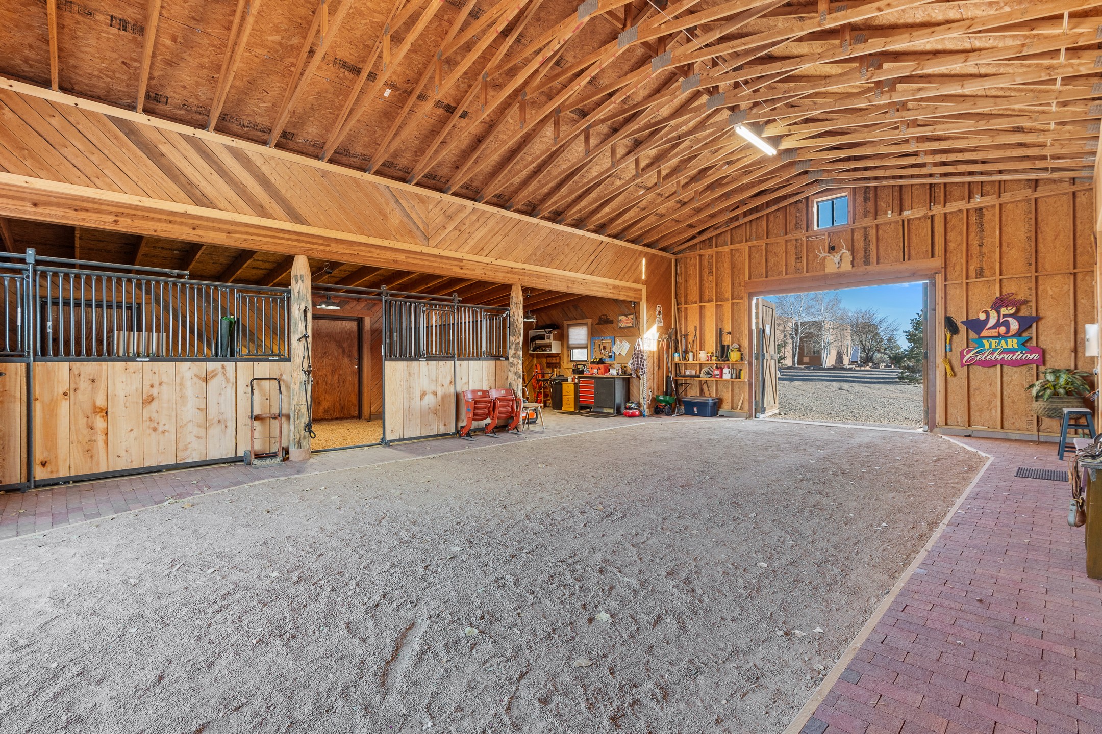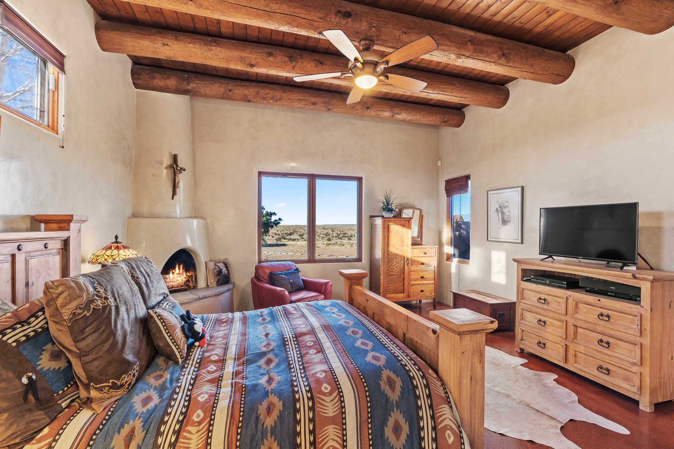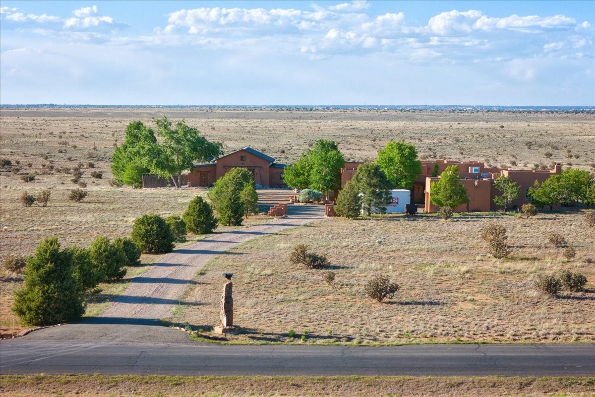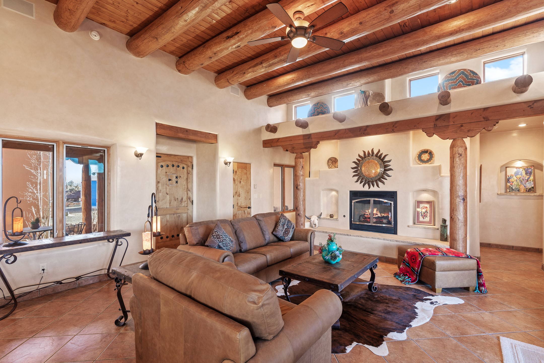 Welcome to the gated community of Rancho San Marcos. This stunning Pueblo-style custom built home sits on 12.51 acres & offers breathtaking 360 views of the Ortiz, Sangre De Cristo Mountains and the Cerrillos Hills. This expansive 2611 sq. ft. single-level residence features 3 bedrooms and 3 bathrooms, Primary Bath has full-size jet tub; two separated living areas; Chef's Kitchen has granite countertops, island, custom-built cabinets; Separate Dining Room; custom & recessed lighting; Hand-troweled diamond plaster finish walls with lighted nichos; 4 Fireplaces, Kiva, Shepard style; Pella Windows at high and low walls; Oversized vigas; Ceramic tile and colored concrete floors; In floor radiant heat; Outside living includes large portal with Spanish corbels, latillas and colored cement floors, large Kiva fireplace; flagstone and river-rock flower-lined patio, stucco privacy wall with archways, wall windows, draped in grapevines. Native Xeriscape grounds are drought-resistant plantings, mature fruit trees and pion trees fed by an underground automatic drip irrigation system.Heated 3-car garage, finished walls; wash sink area.This remarkable property boasts a 354 sq. ft. detached studio, complete with an open bedroom, living area, and a full bath. It is an ideal space for guests seeking a peaceful getaway. Additionally, the property boasts an impressive 1,824 sq. ft. horse barn/outbuilding.This property is ideal for equestrian enthusiasts and those wanting to be close to Santa Fe's vibrant culture and entertainment. Just 30 minutes from the Santa Fe Plaza, museums, and galleries. It's a 55 minute drive to Ski either Santa Fe or Sandia Peak. 10 minutes to I-25 and the Rail Runner. Don't miss this opportunity!