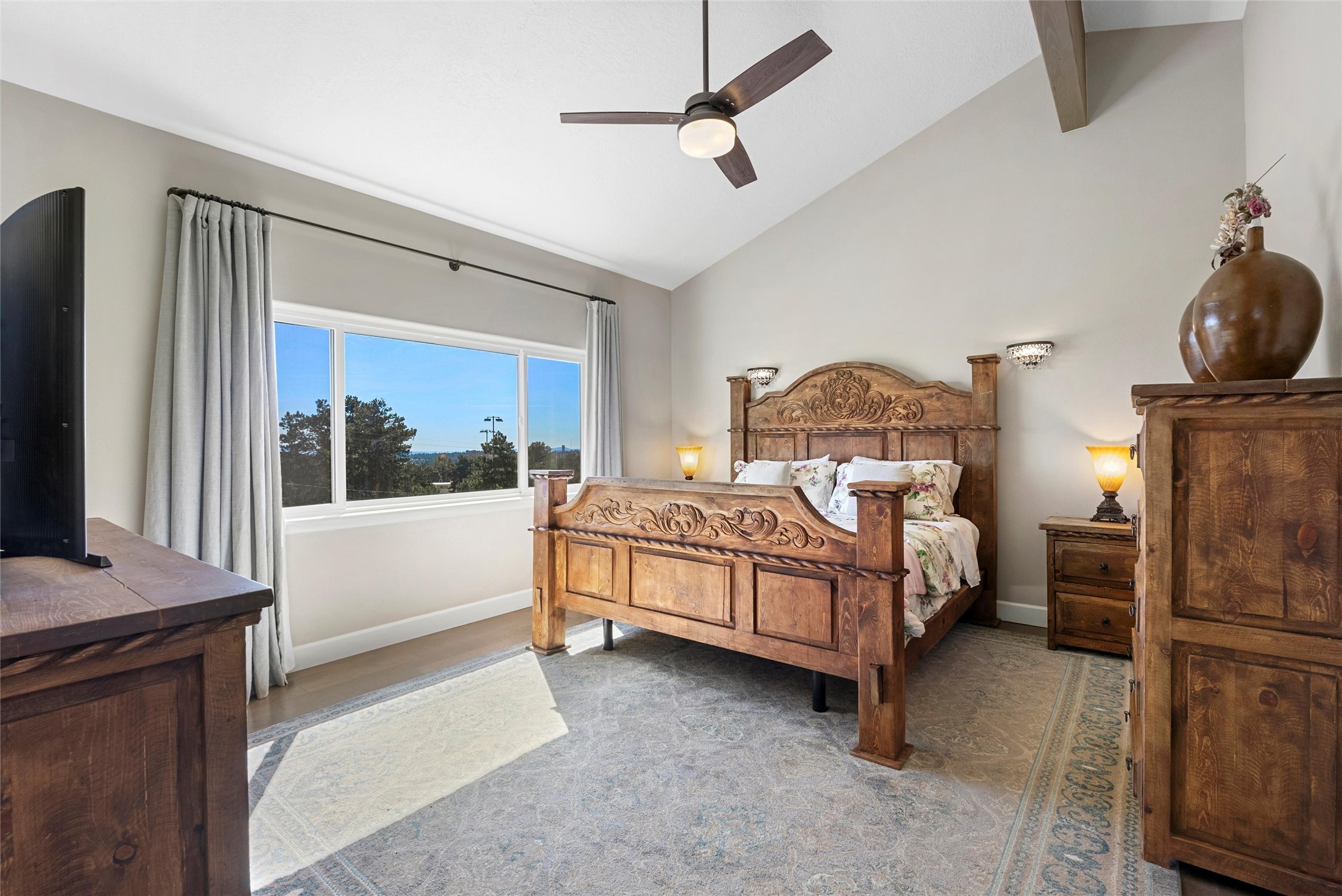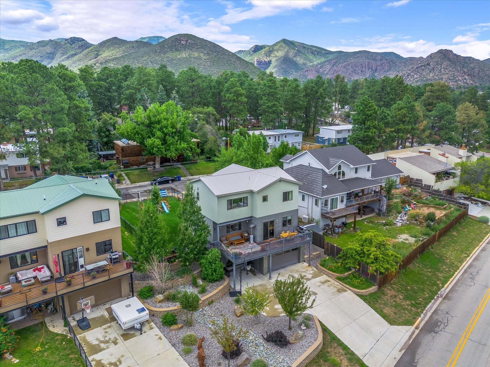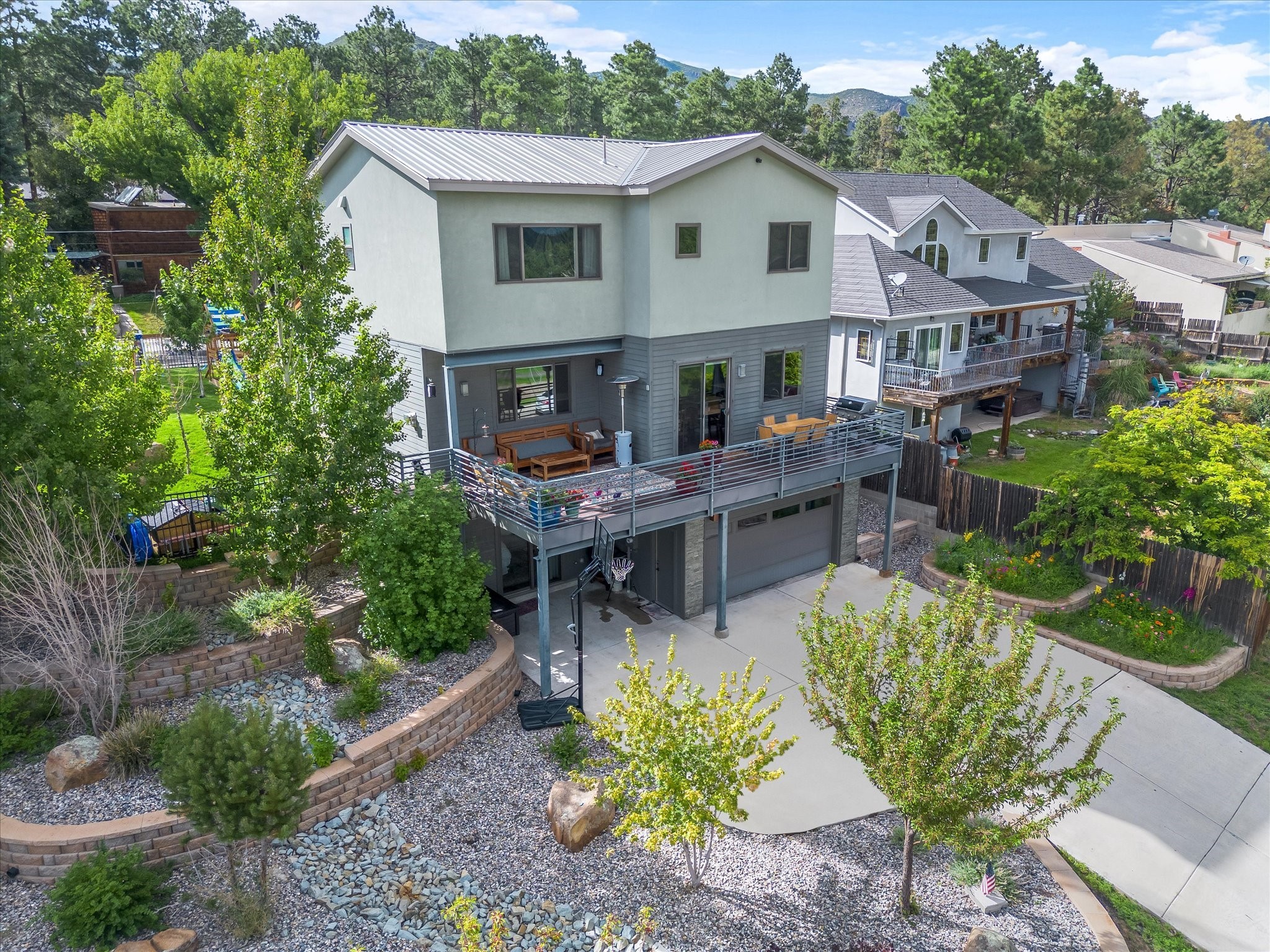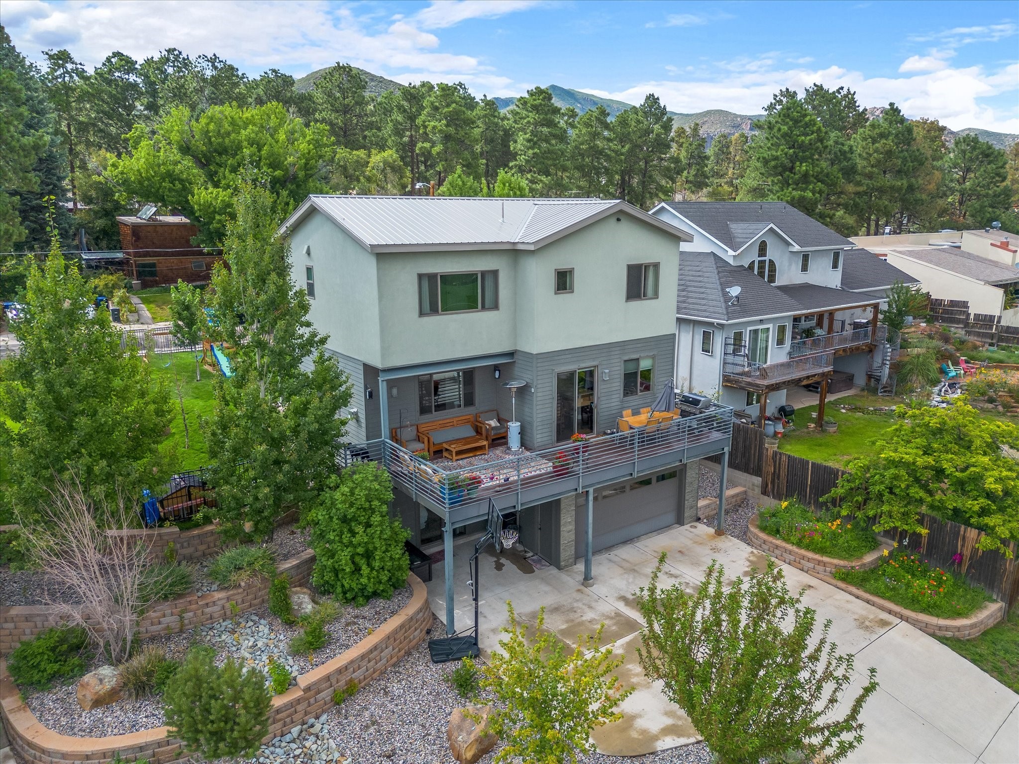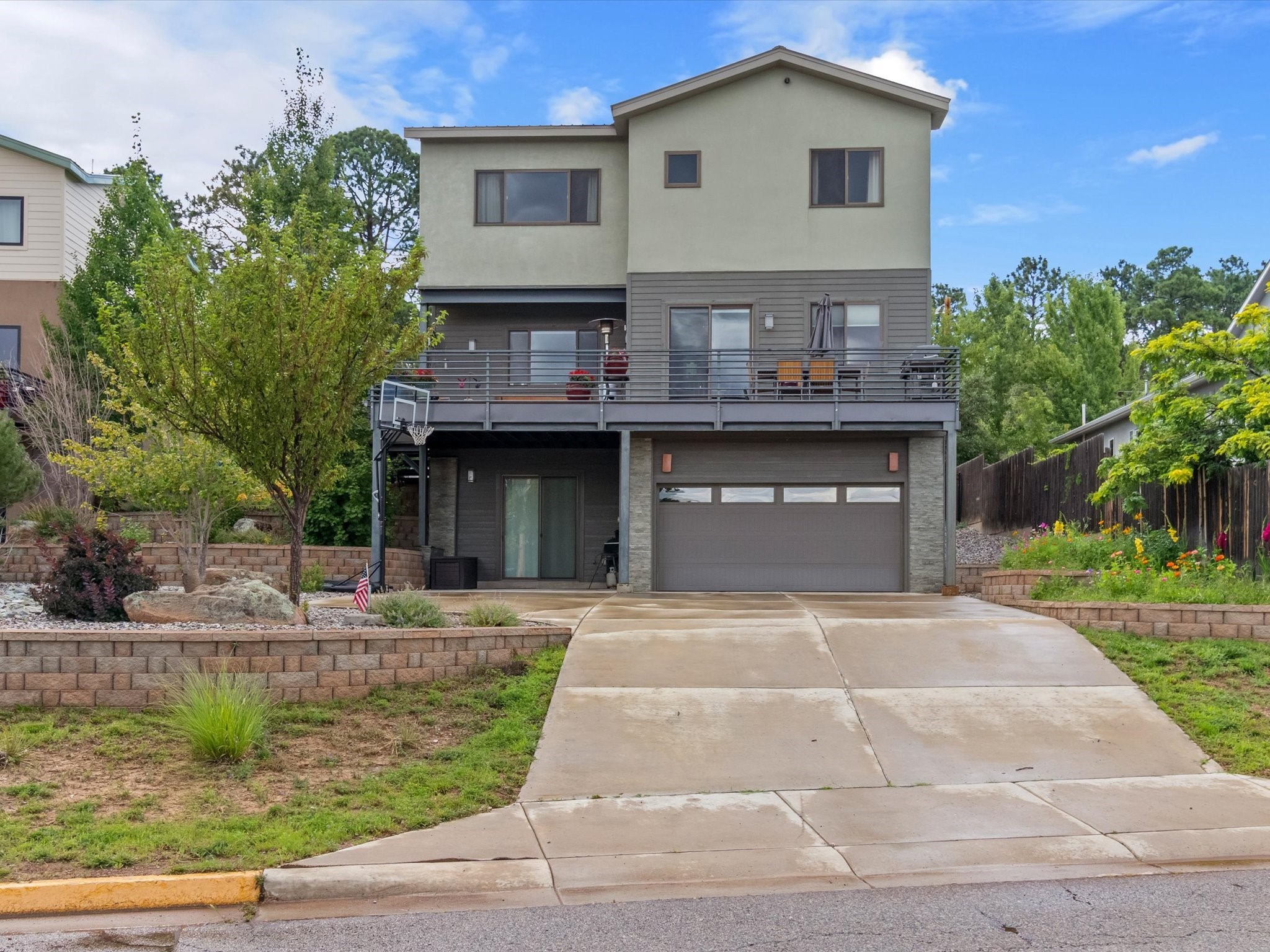 **SELLER OFFERING BONUS 5K CONCESSION (RATE BUY-DOWN) ** with acceptable offer! READY for breathtaking views of the Sangre de Cristo Mountains and Jemez Mountains, this custom 5-bedroom, 4 bath home has it all. Nestled in a family-friendly neighborhood within the highly sought-after Mountain Elementary School District, this modern home built in 2017 by Alan Mascord Design Associates Inc.--offers the perfect blend of contemporary style and functional amenities.The home features a stone veneer exterior and a meticulously kept fenced-in front yard with a drip irrigation system. Inside, cathedral vaulted ceilings with wood beams create a spacious, airy ambiance throughout. The layout includes five bedrooms and 2 full, 1 three quarter and one-half bath, enhanced by a versatile triplex configuration that offers two primary bedrooms or mother-in-law suite--each with its own en-suite bathroom for added luxury and privacy. The living room boasts a striking stacked stone fireplace as its focal point, complemented by large windows that fill the space with natural light and frame the stunning mountain views. A spacious elevated deck extends the living area outdoors, providing an ideal spot for entertaining or simply enjoying the scenery. Luxury wood floors, no carpet other than interior steps! The gourmet kitchen features quartz countertops, upgraded appliances, high-profile cabinets, and a custom architectural pass-through with built-in cabinetry that seamlessly connects to the living space. Elegant quartz accents continue into the bathrooms, and lavish overhead lighting paired with custom copper touches adds warmth and unique character throughout. BEAUTIFULLY SEPARATED ENTRANCE FOR MOTHER IN LAW QUARTERS lower level access!For added convenience, utility sinks are included in both the laundry room and the garage. The 3-car tandem garage provides ample parking and storage, accessible from North Road by Urban Park. Additional features include refrigerated air, a durable metal roof, a tankless water heater, and an electric vehicle charging station. This exceptional custom home offers everything you need--from form to function. Contact us today for your private showing!