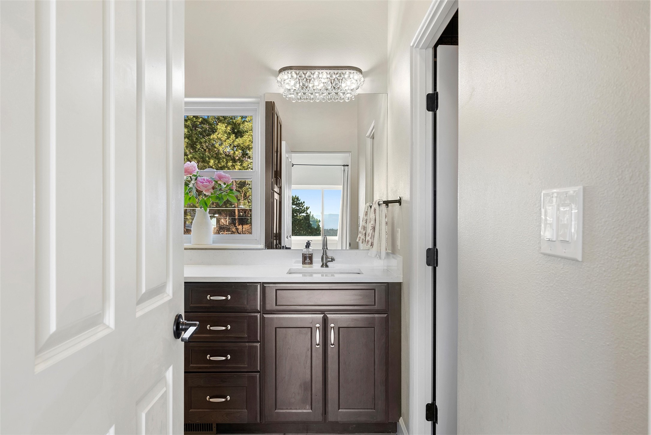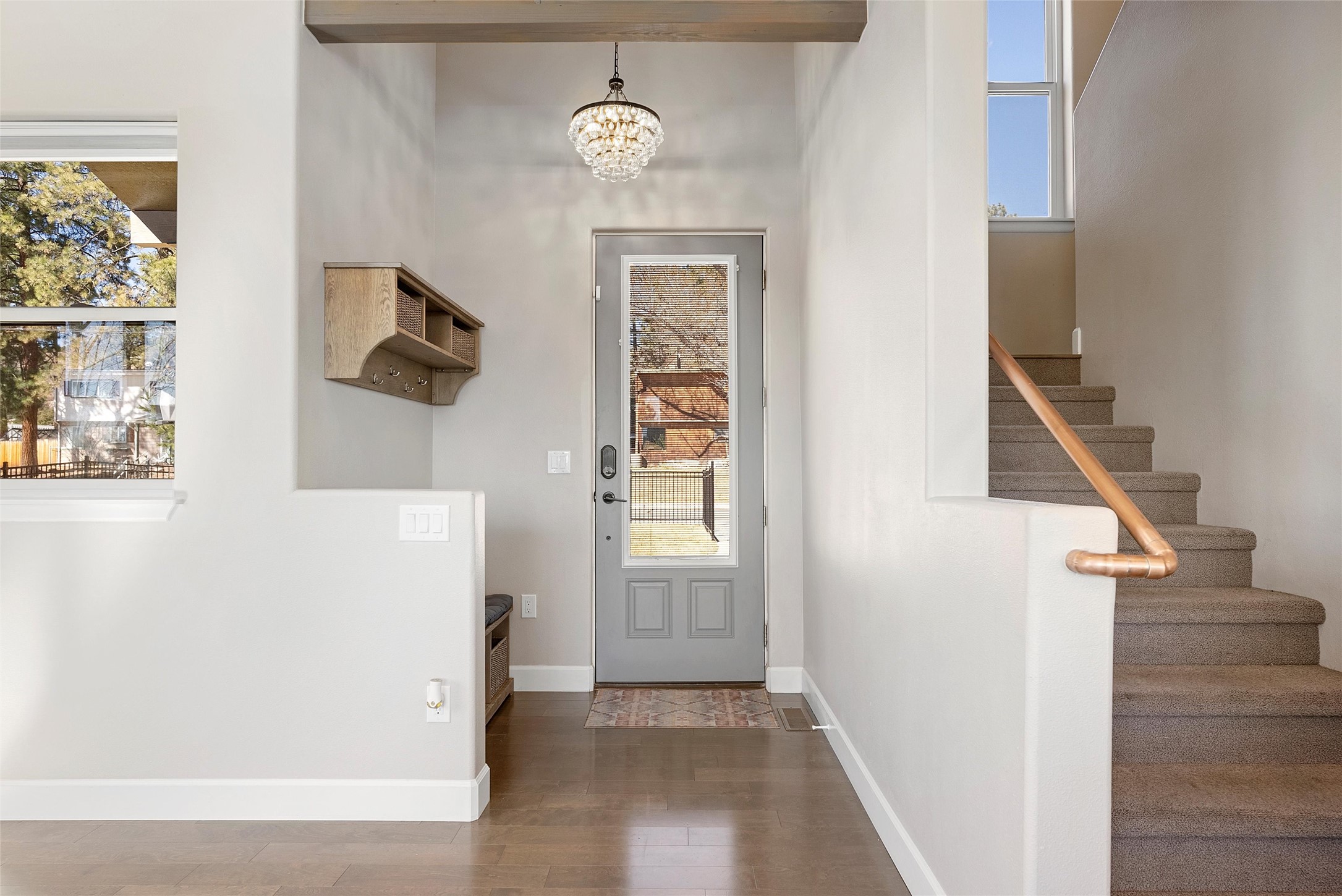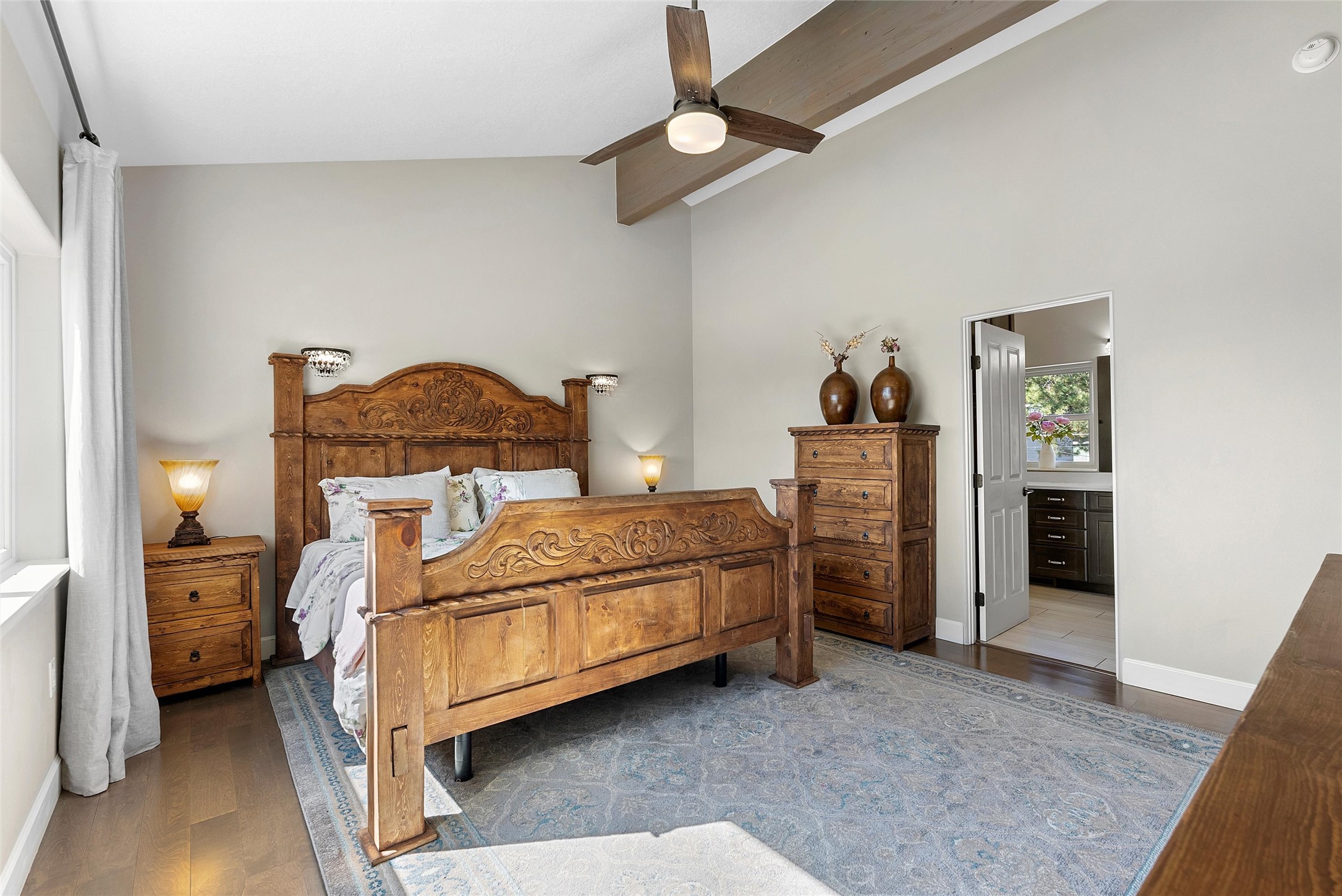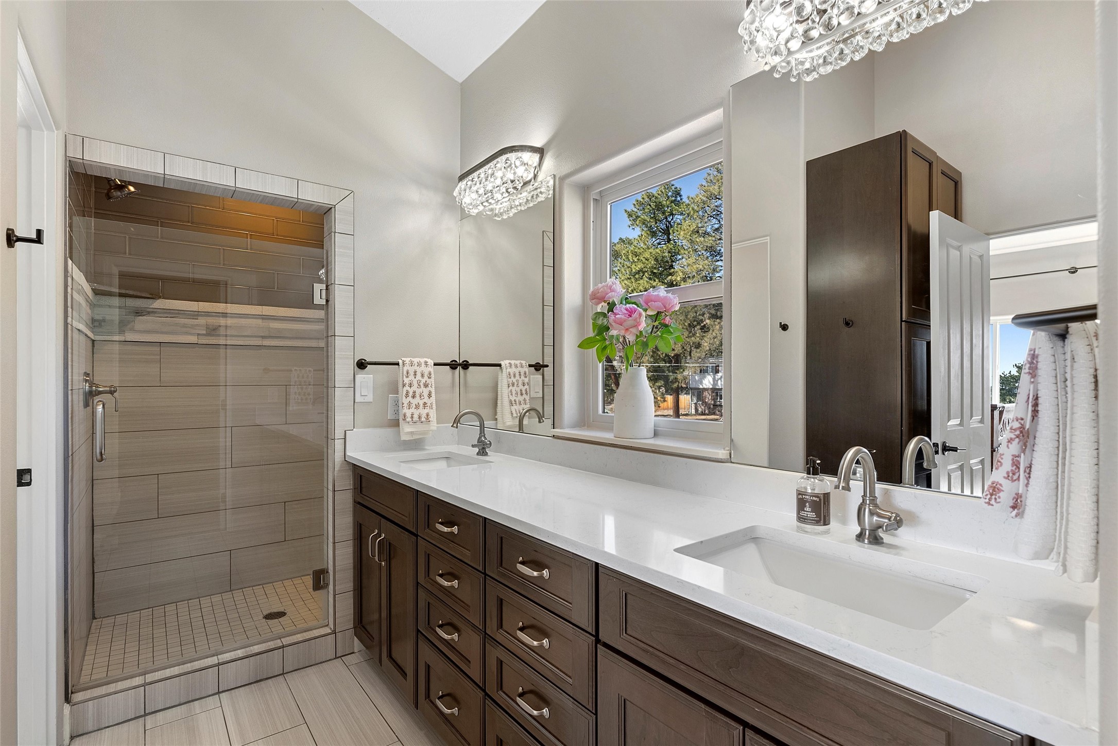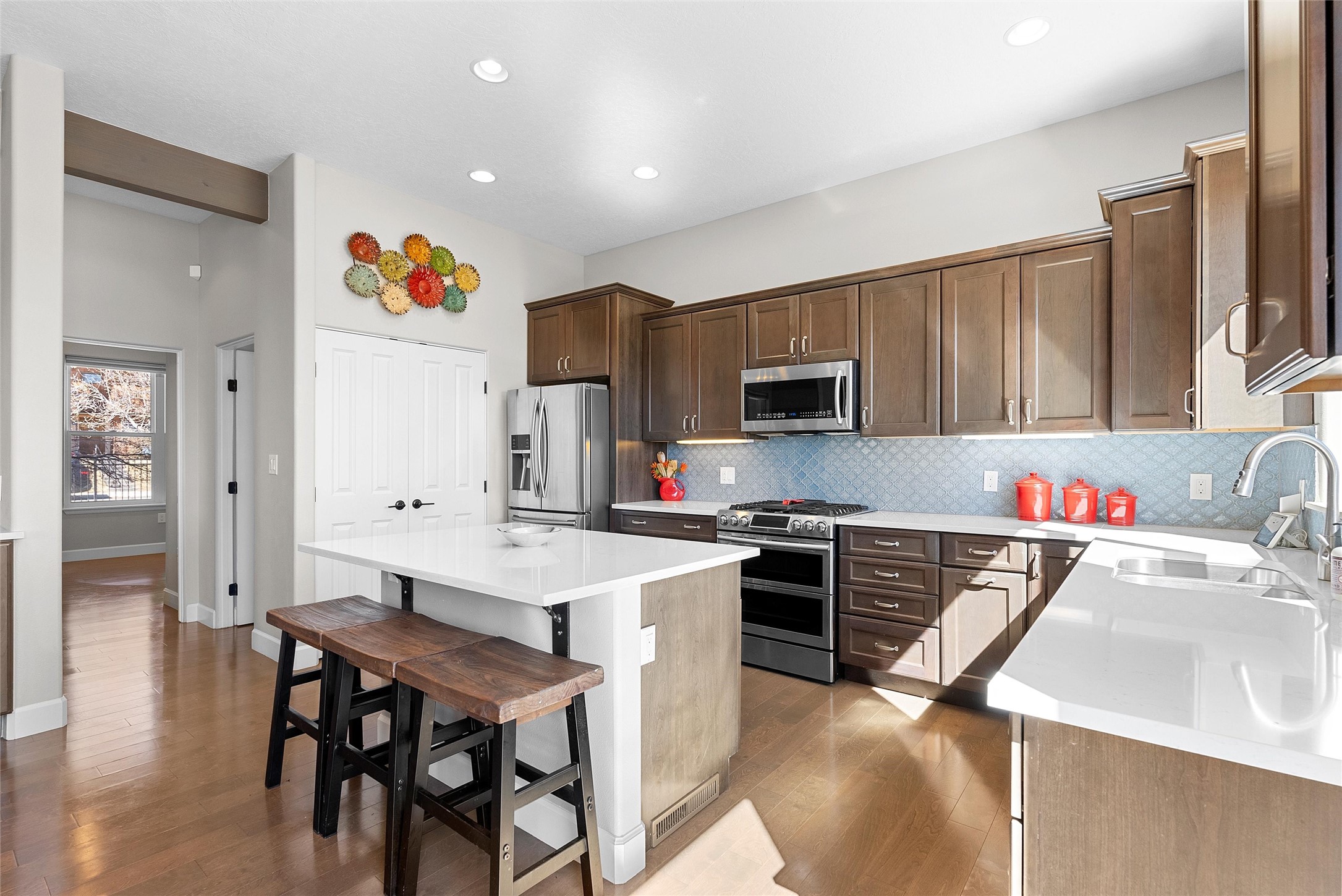 **SELLER OFFERING BONUS 5K CONCESSION (RATE BUY-DOWN) ** with acceptable offer! READY for breathtaking views of the Sangre de Cristo Mountains and Jemez Mountains, this custom 5-bedroom, 4 bath home has it all. Nestled in a family-friendly neighborhood within the highly sought-after Mountain Elementary School District, this modern home built in 2017 by Alan Mascord Design Associates Inc.--offers the perfect blend of contemporary style and functional amenities.The home features a stone veneer exterior and a meticulously kept fenced-in front yard with a drip irrigation system. Inside, cathedral vaulted ceilings with wood beams create a spacious, airy ambiance throughout. The layout includes five bedrooms and 2 full, 1 three quarter and one-half bath, enhanced by a versatile triplex configuration that offers two primary bedrooms or mother-in-law suite--each with its own en-suite bathroom for added luxury and privacy. The living room boasts a striking stacked stone fireplace as its focal point, complemented by large windows that fill the space with natural light and frame the stunning mountain views. A spacious elevated deck extends the living area outdoors, providing an ideal spot for entertaining or simply enjoying the scenery. Luxury wood floors, no carpet other than interior steps! The gourmet kitchen features quartz countertops, upgraded appliances, high-profile cabinets, and a custom architectural pass-through with built-in cabinetry that seamlessly connects to the living space. Elegant quartz accents continue into the bathrooms, and lavish overhead lighting paired with custom copper touches adds warmth and unique character throughout. BEAUTIFULLY SEPARATED ENTRANCE FOR MOTHER IN LAW QUARTERS lower level access!For added convenience, utility sinks are included in both the laundry room and the garage. The 3-car tandem garage provides ample parking and storage, accessible from North Road by Urban Park. Additional features include refrigerated air, a durable metal roof, a tankless water heater, and an electric vehicle charging station. This exceptional custom home offers everything you need--from form to function. Contact us today for your private showing!