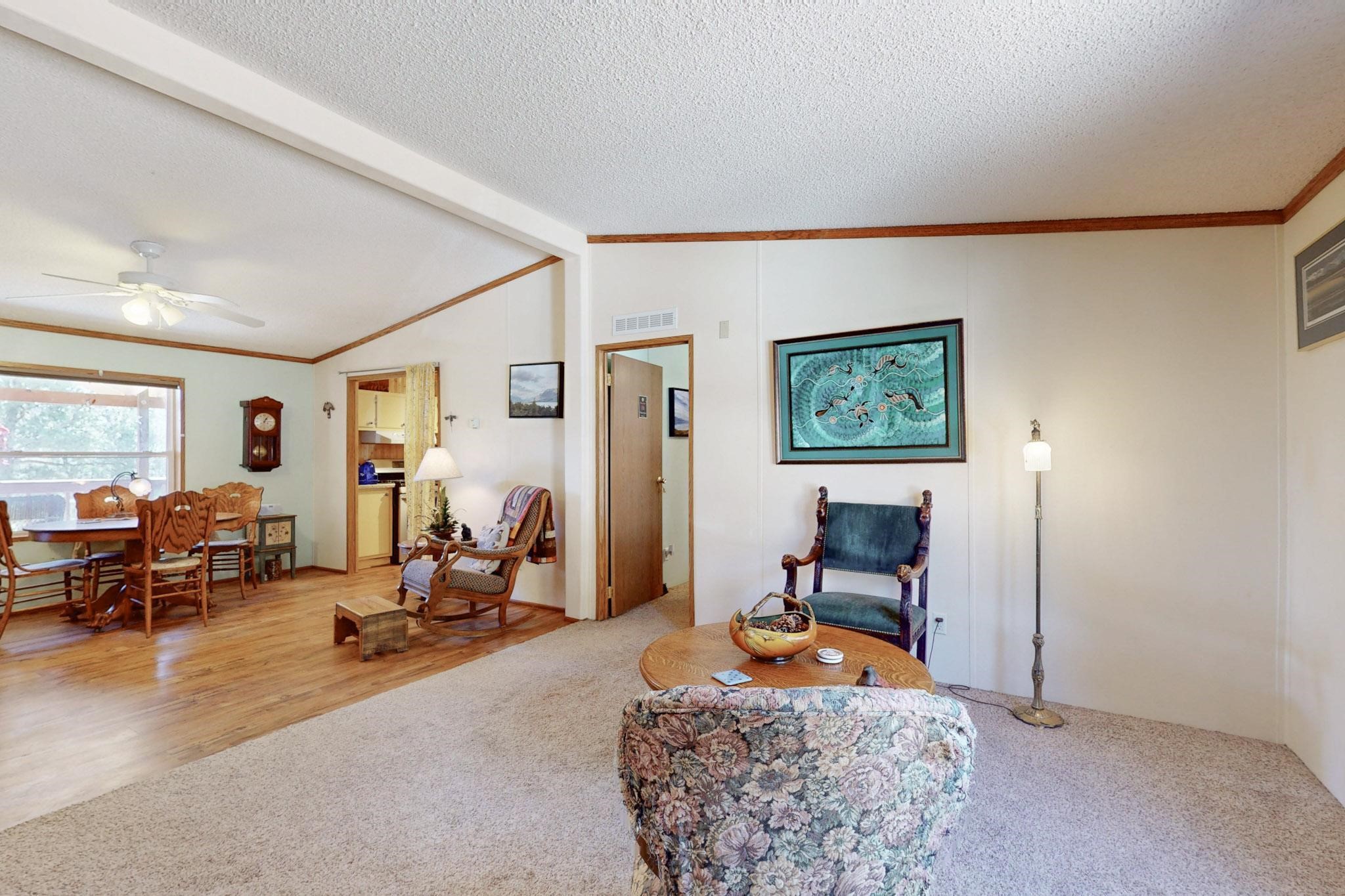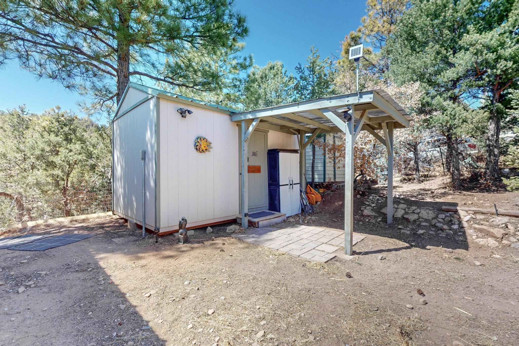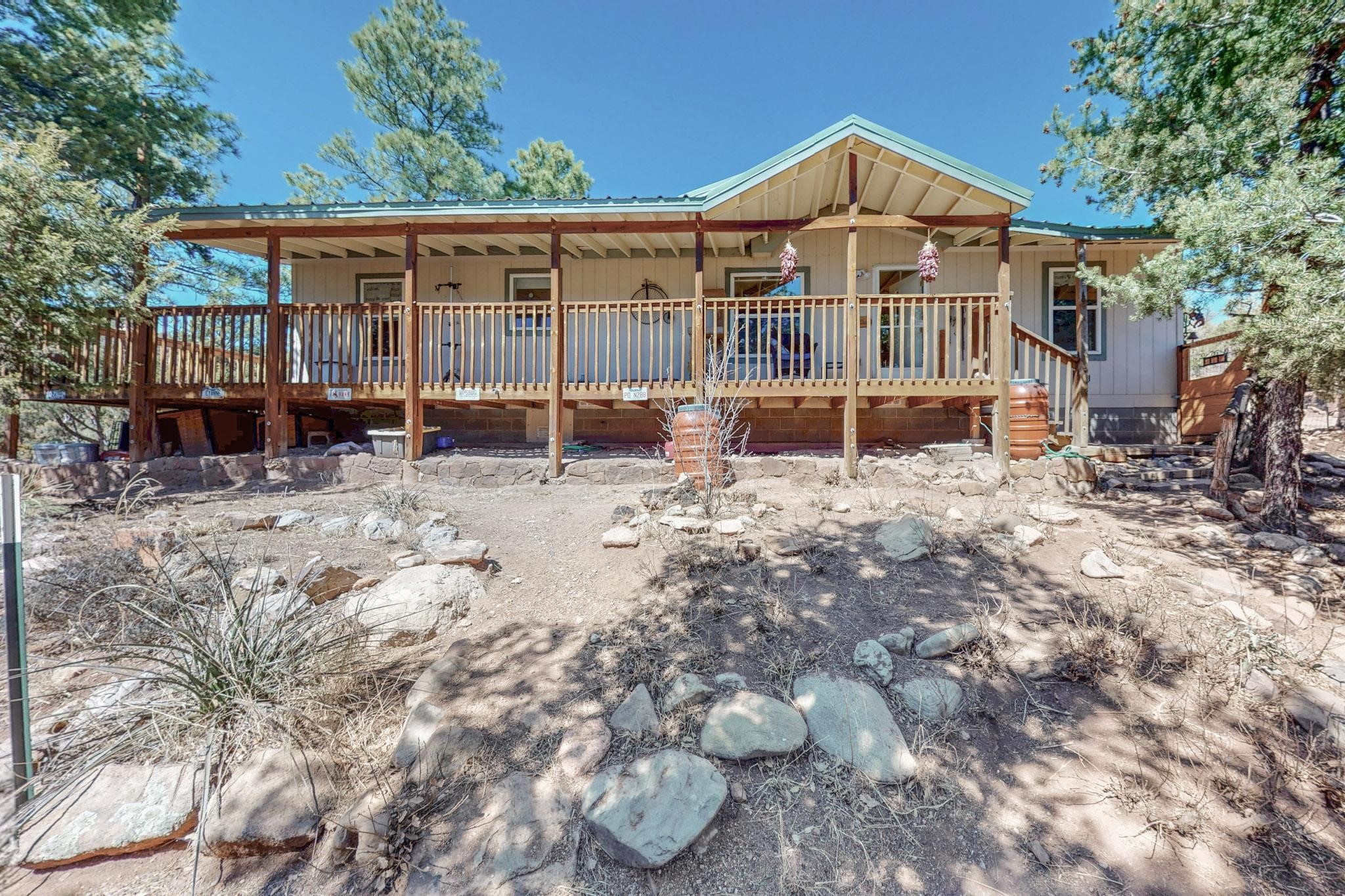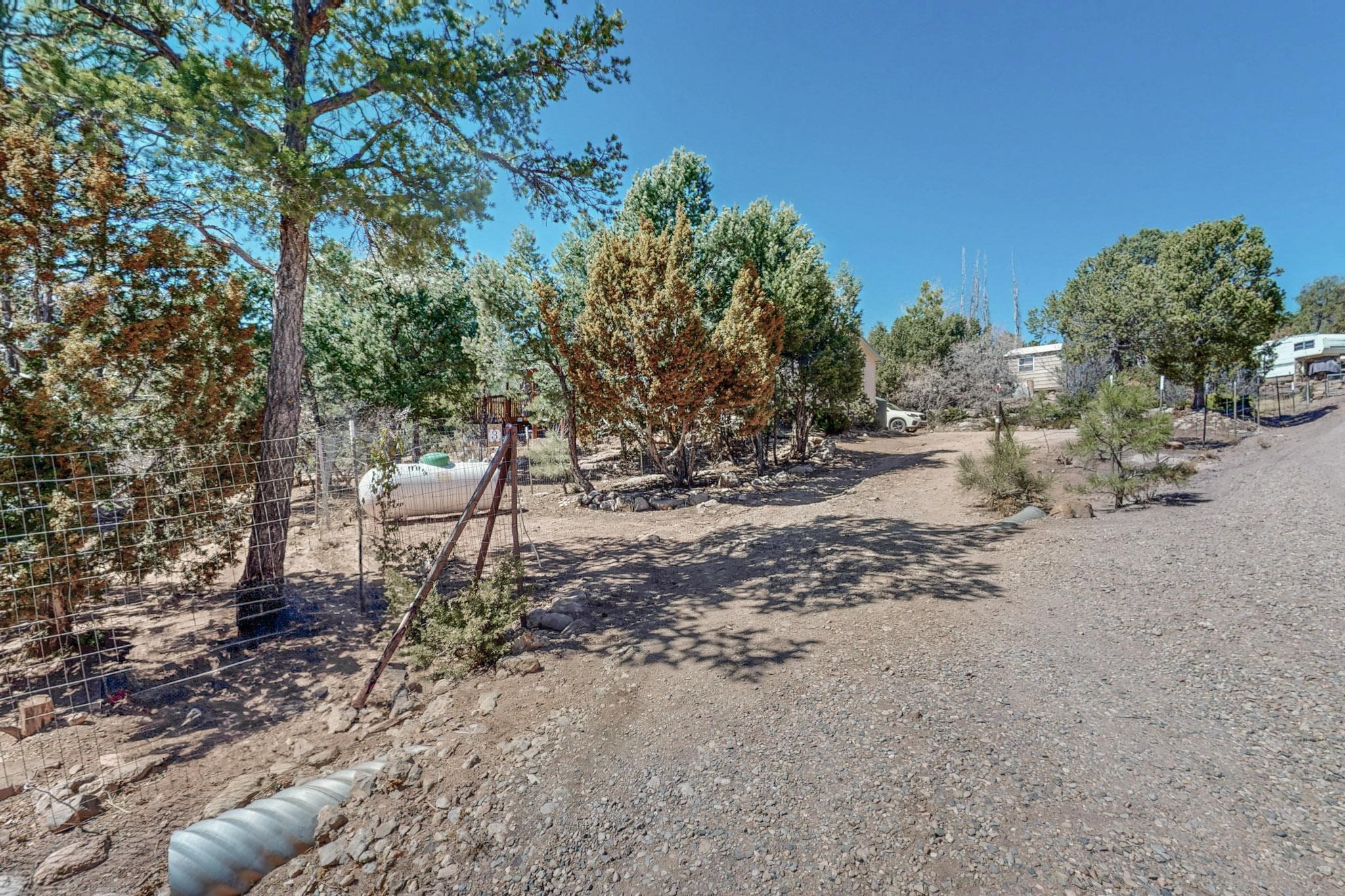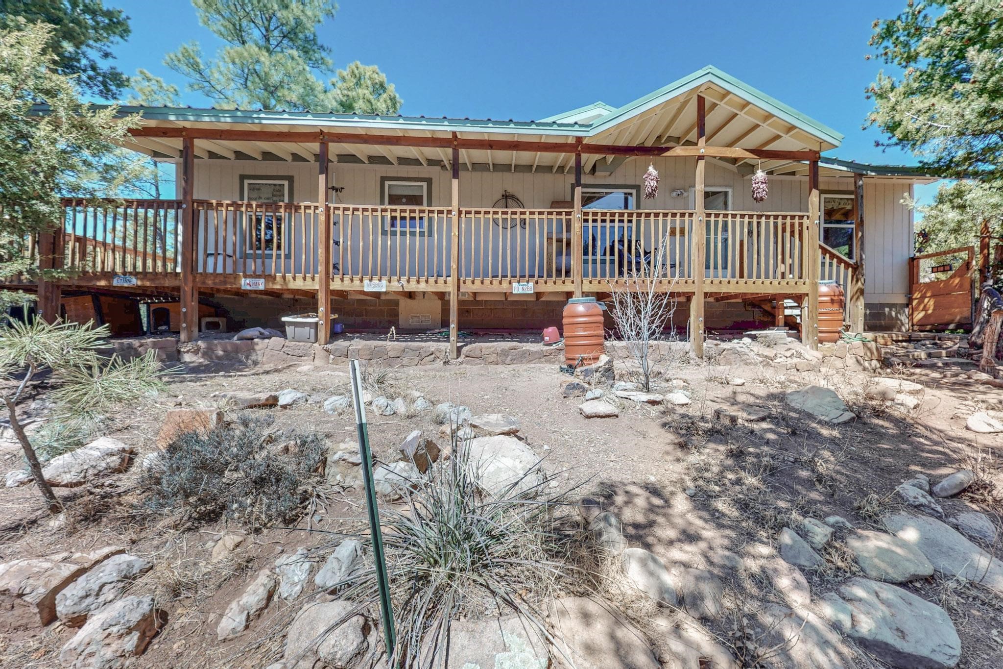 MOTIVATED SELLER and a great opportunity for the adventurous cash Buyer who will be happy in a partially off grid living situation, close to the open spaces and nature. Manufactured home on the permanent fundation with 3 bedrooms and 2 baths nestled in the beautiful Pecos/Glorieta area. Private and independent living surrounded by nature provides a place to escape from daily "hustle and bustle" just a short drive from Santa Fe. Covered deck wrapping the front of the house provides a great spot with a view of Glorieta Mesa. A place to rest and reminisce. The seller replaced the water heater (2018), furnace (2021), roof (2022, now metal), and garbage disposal (2024). Other improvements of the property include a workshop with fire resistant dry wall, wired for both 120v and 240v. The studio can be used for many artistic activities. There is also a shed for additional storage. Part of the property is fenced so your pets can have their freedom while outside. There is a water cistern, which is a main source of water. Ready to be used. Seller is offering $1000 towards water hauling services with the local service. Please read Supplemental Disclosure. Price to sell. Septic was inspected and it is good to go.