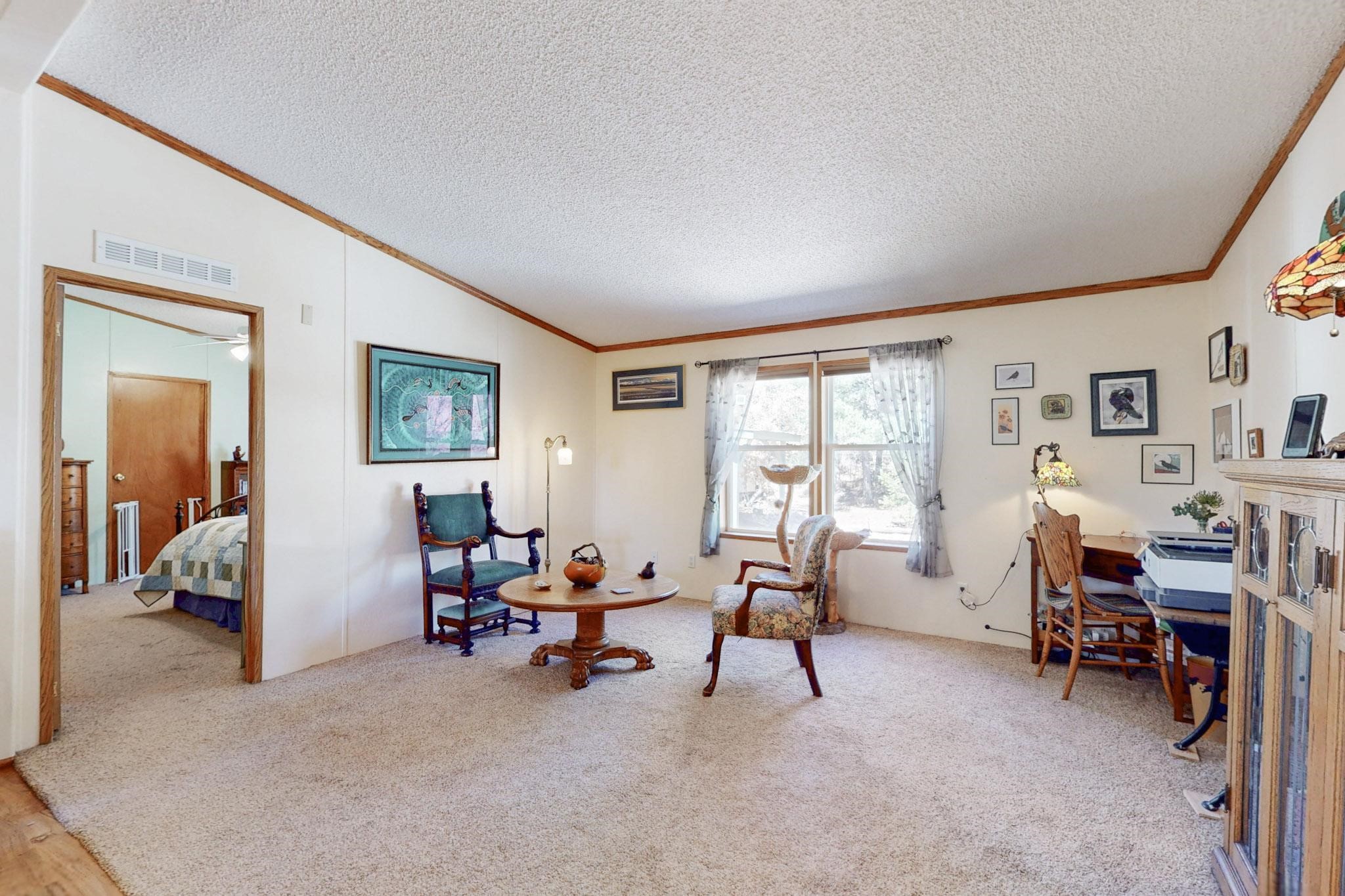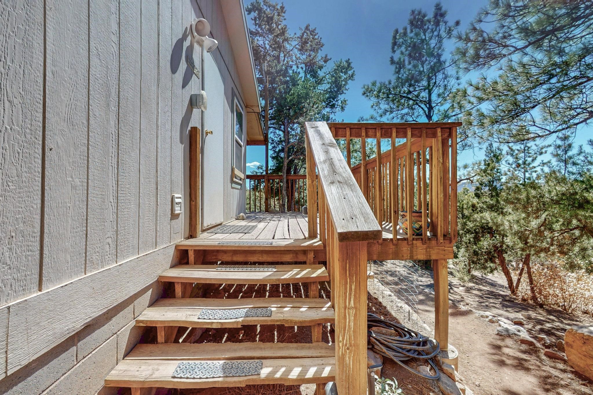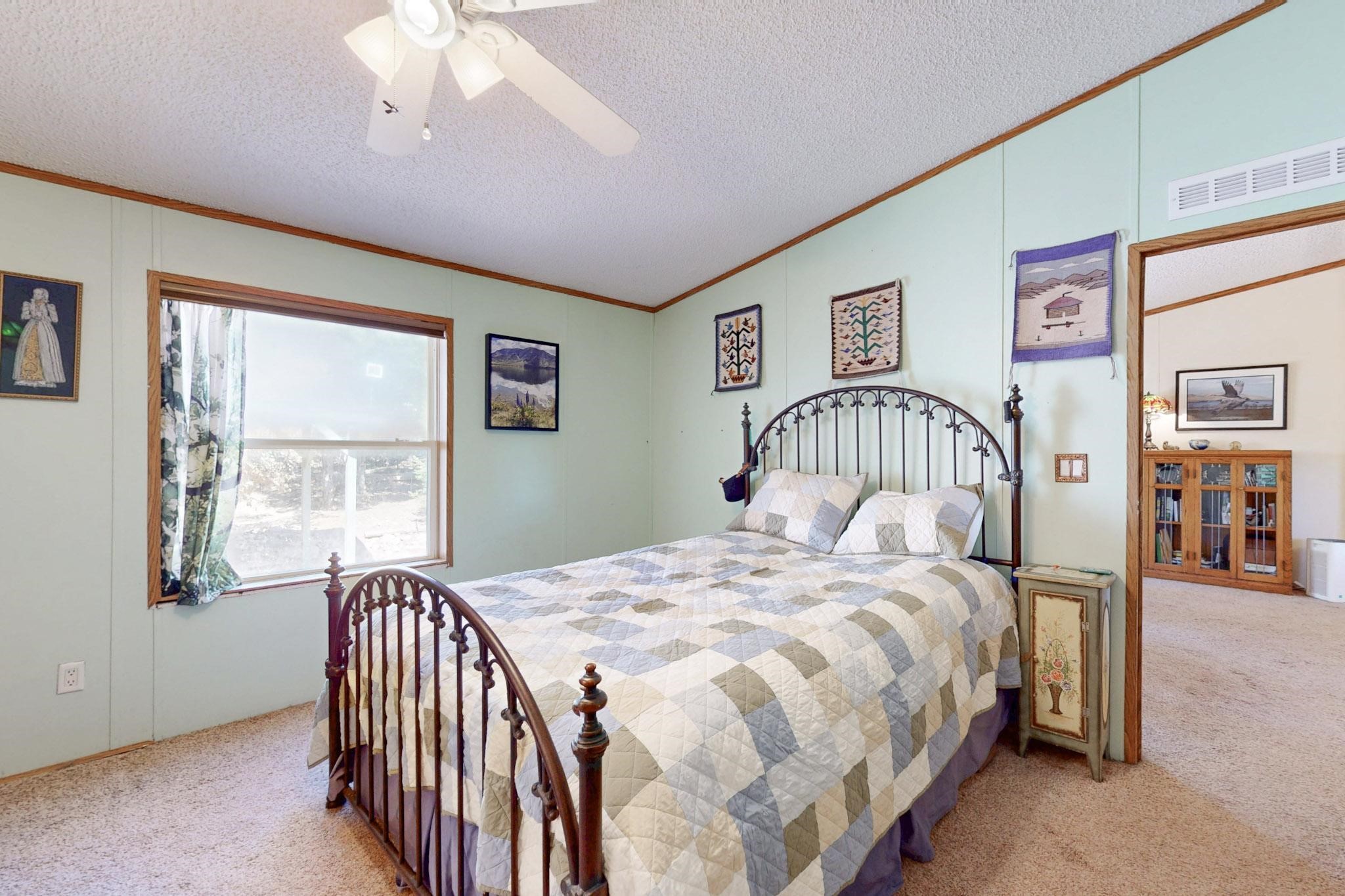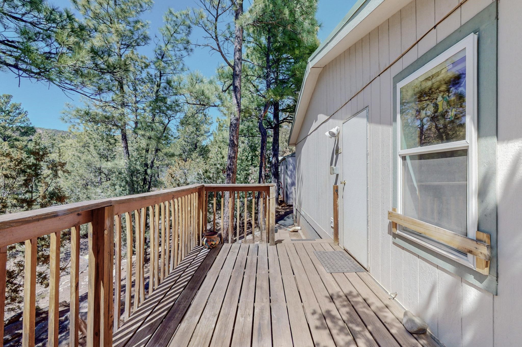 MOTIVATED SELLER and a great opportunity for the adventurous cash Buyer who will be happy in a partially off grid living situation, close to the open spaces and nature. Manufactured home on the permanent fundation with 3 bedrooms and 2 baths nestled in the beautiful Pecos/Glorieta area. Private and independent living surrounded by nature provides a place to escape from daily "hustle and bustle" just a short drive from Santa Fe. Covered deck wrapping the front of the house provides a great spot with a view of Glorieta Mesa. A place to rest and reminisce. The seller replaced the water heater (2018), furnace (2021), roof (2022, now metal), and garbage disposal (2024). Other improvements of the property include a workshop with fire resistant dry wall, wired for both 120v and 240v. The studio can be used for many artistic activities. There is also a shed for additional storage. Part of the property is fenced so your pets can have their freedom while outside. There is a water cistern, which is a main source of water. Ready to be used. Seller is offering $1000 towards water hauling services with the local service. Please read Supplemental Disclosure. Price to sell. Septic was inspected and it is good to go.
