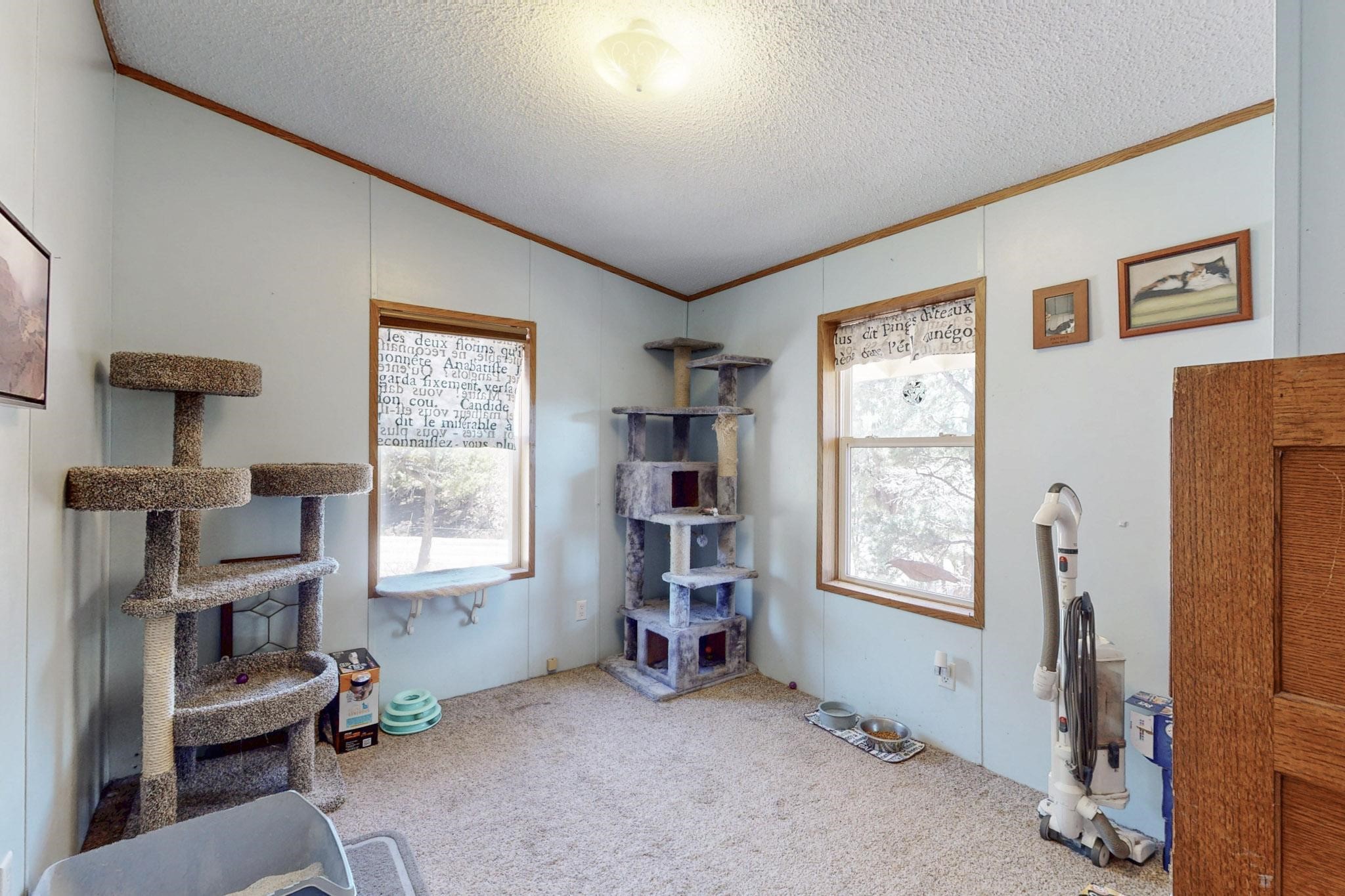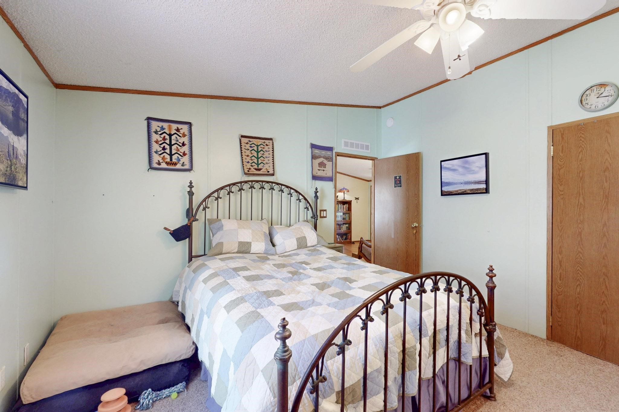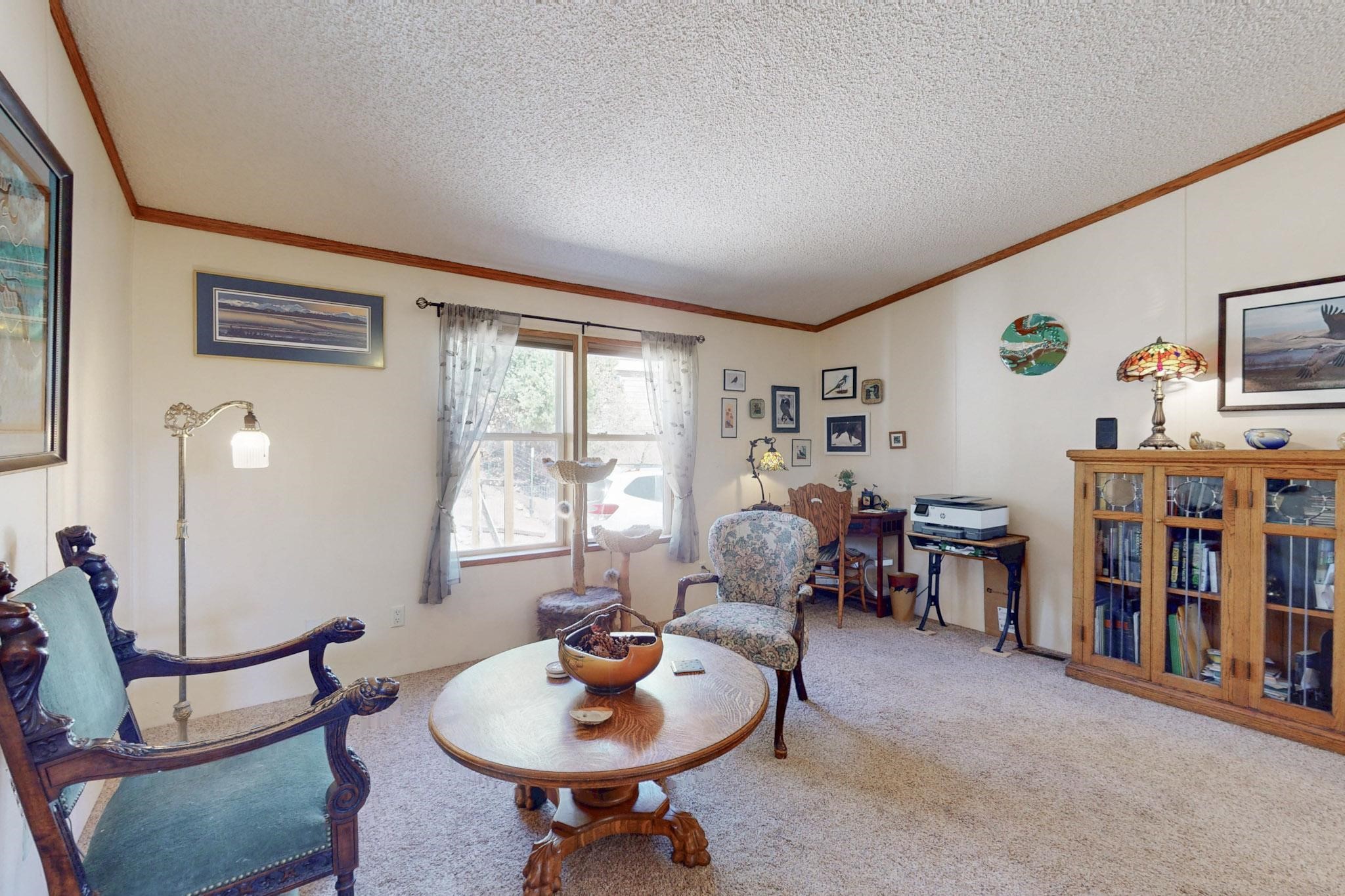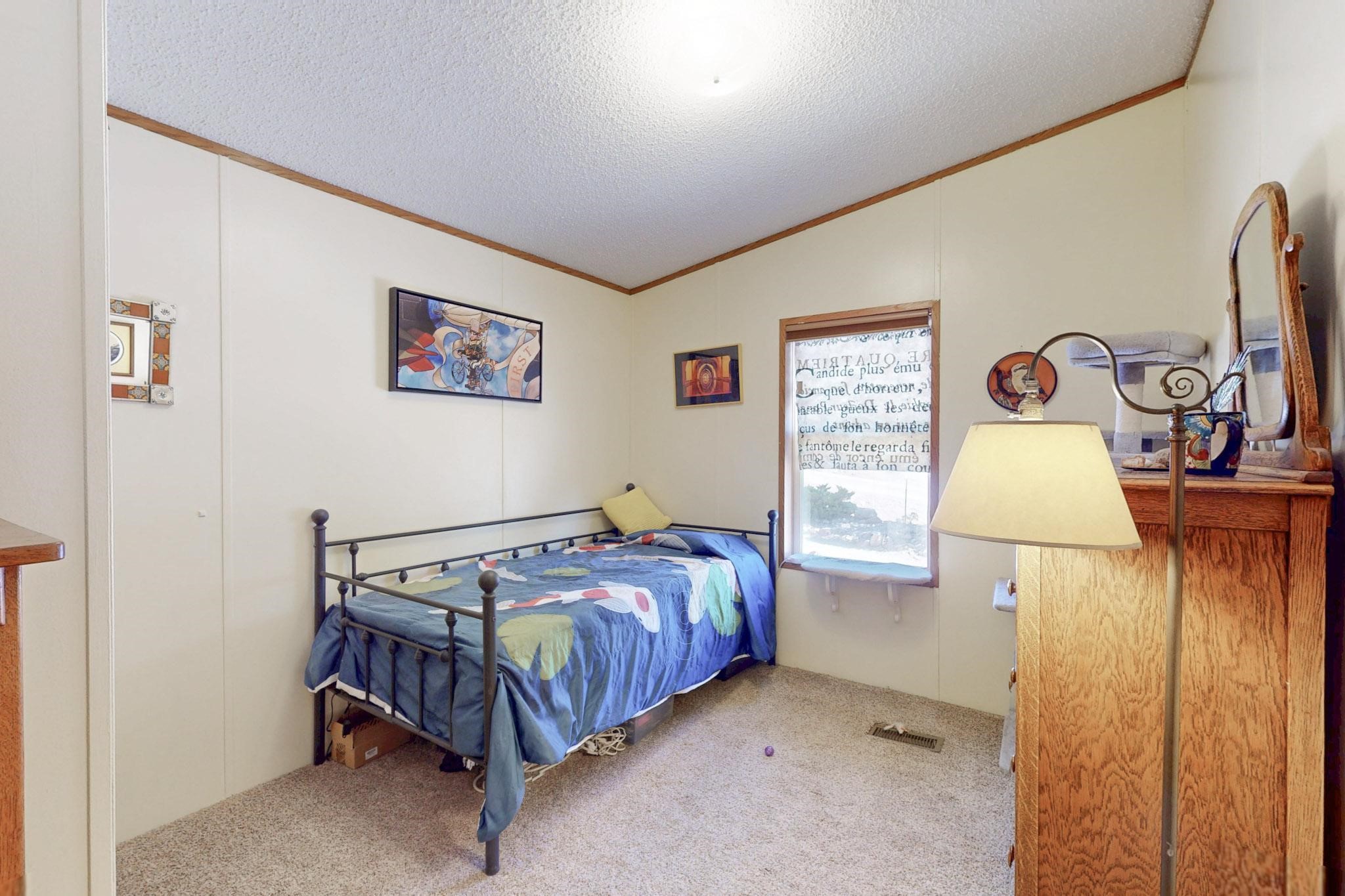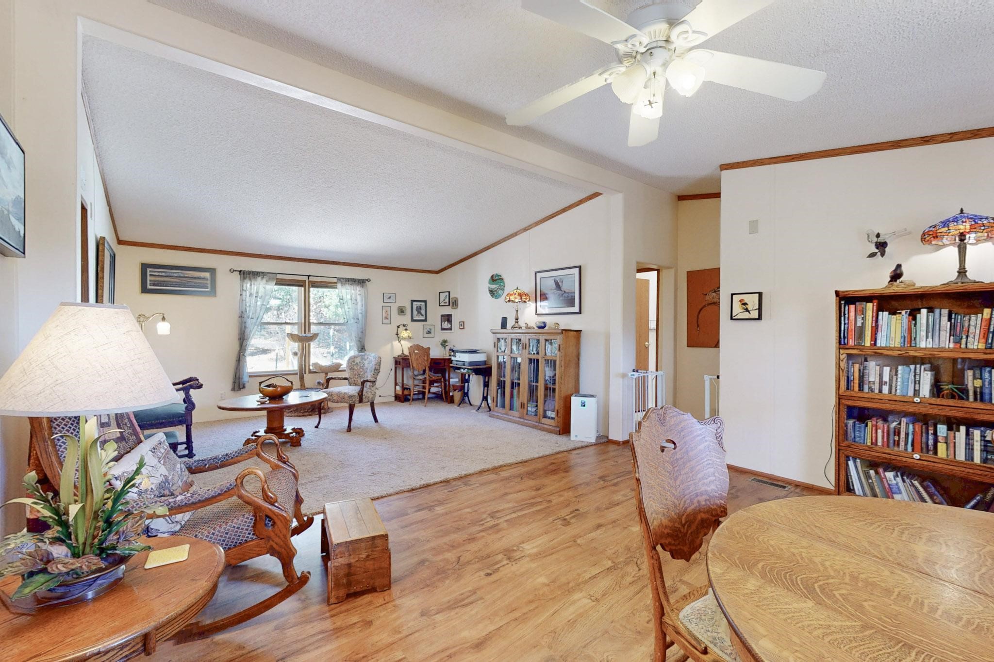 MOTIVATED SELLER and a great opportunity for the adventurous cash Buyer who will be happy in a partially off grid living situation, close to the open spaces and nature. Manufactured home on the permanent fundation with 3 bedrooms and 2 baths nestled in the beautiful Pecos/Glorieta area. Private and independent living surrounded by nature provides a place to escape from daily "hustle and bustle" just a short drive from Santa Fe. Covered deck wrapping the front of the house provides a great spot with a view of Glorieta Mesa. A place to rest and reminisce. The seller replaced the water heater (2018), furnace (2021), roof (2022, now metal), and garbage disposal (2024). Other improvements of the property include a workshop with fire resistant dry wall, wired for both 120v and 240v. The studio can be used for many artistic activities. There is also a shed for additional storage. Part of the property is fenced so your pets can have their freedom while outside. There is a water cistern, which is a main source of water. Ready to be used. Seller is offering $1000 towards water hauling services with the local service. Please read Supplemental Disclosure. Price to sell. Septic was inspected and it is good to go.