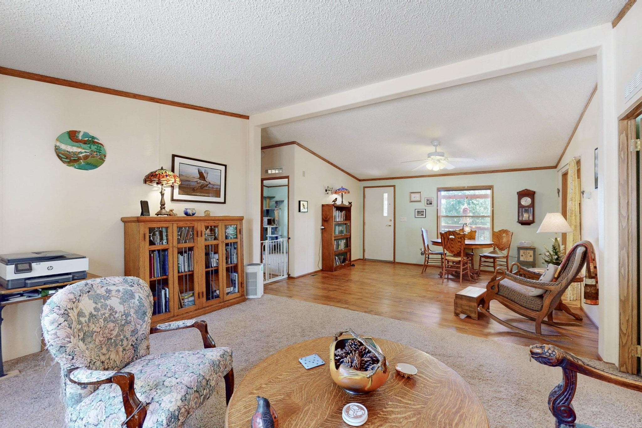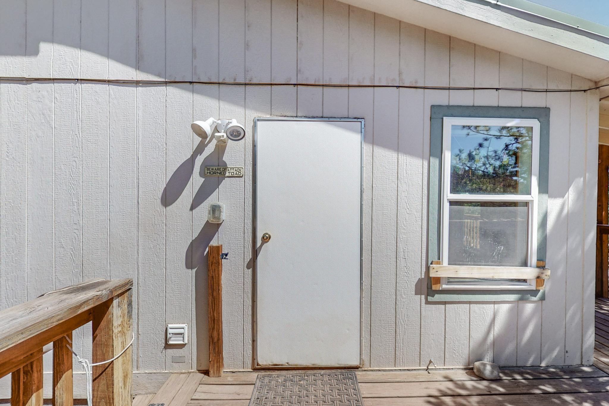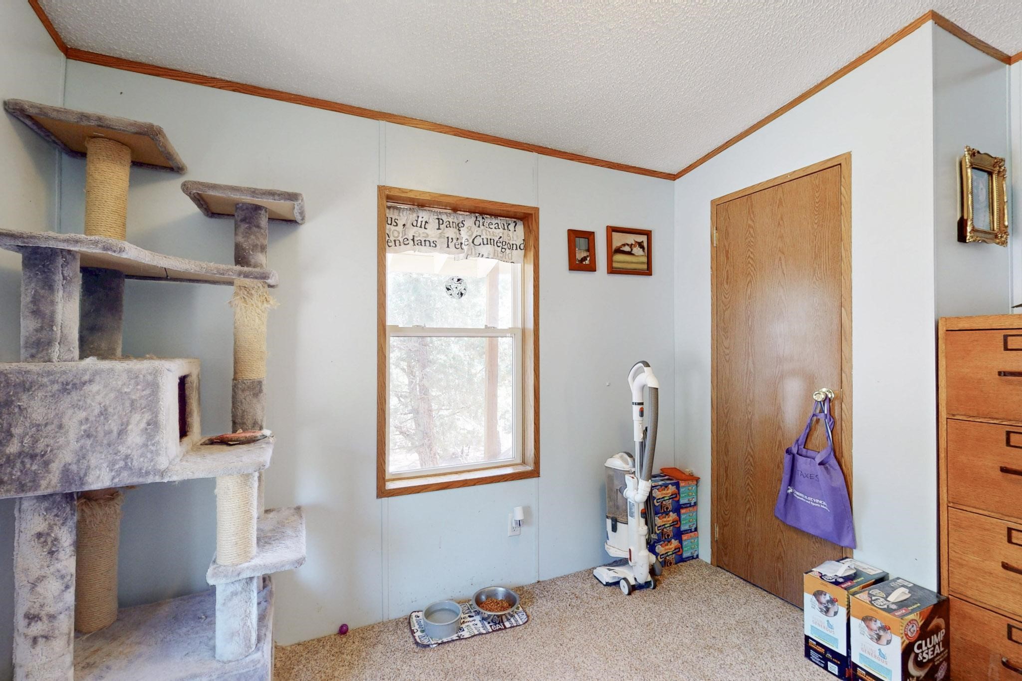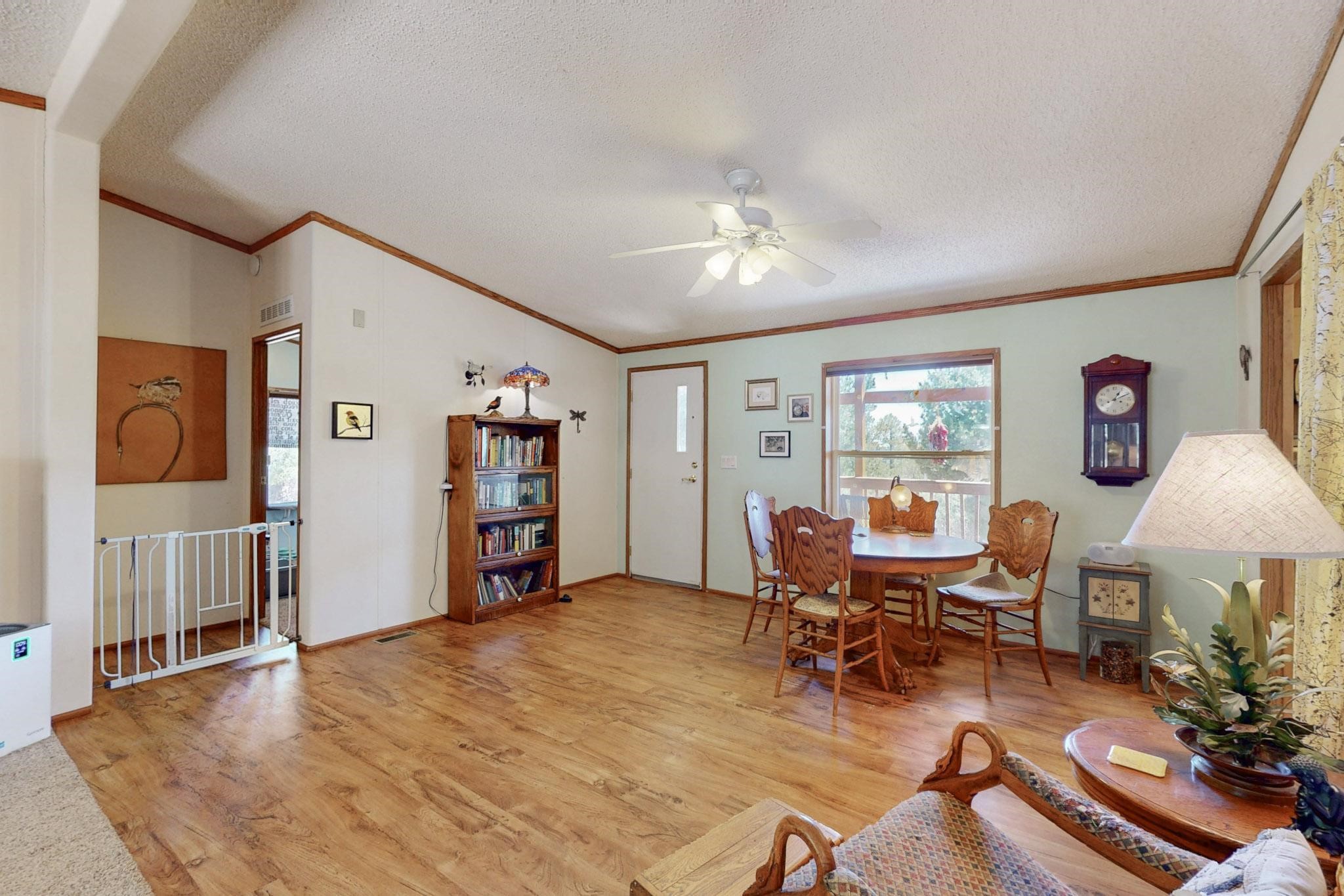 MOTIVATED SELLER and a great opportunity for the adventurous cash Buyer who will be happy in a partially off grid living situation, close to the open spaces and nature. Manufactured home on the permanent fundation with 3 bedrooms and 2 baths nestled in the beautiful Pecos/Glorieta area. Private and independent living surrounded by nature provides a place to escape from daily "hustle and bustle" just a short drive from Santa Fe. Covered deck wrapping the front of the house provides a great spot with a view of Glorieta Mesa. A place to rest and reminisce. The seller replaced the water heater (2018), furnace (2021), roof (2022, now metal), and garbage disposal (2024). Other improvements of the property include a workshop with fire resistant dry wall, wired for both 120v and 240v. The studio can be used for many artistic activities. There is also a shed for additional storage. Part of the property is fenced so your pets can have their freedom while outside. There is a water cistern, which is a main source of water. Ready to be used. Seller is offering $1000 towards water hauling services with the local service. Please read Supplemental Disclosure. Price to sell. Septic was inspected and it is good to go.