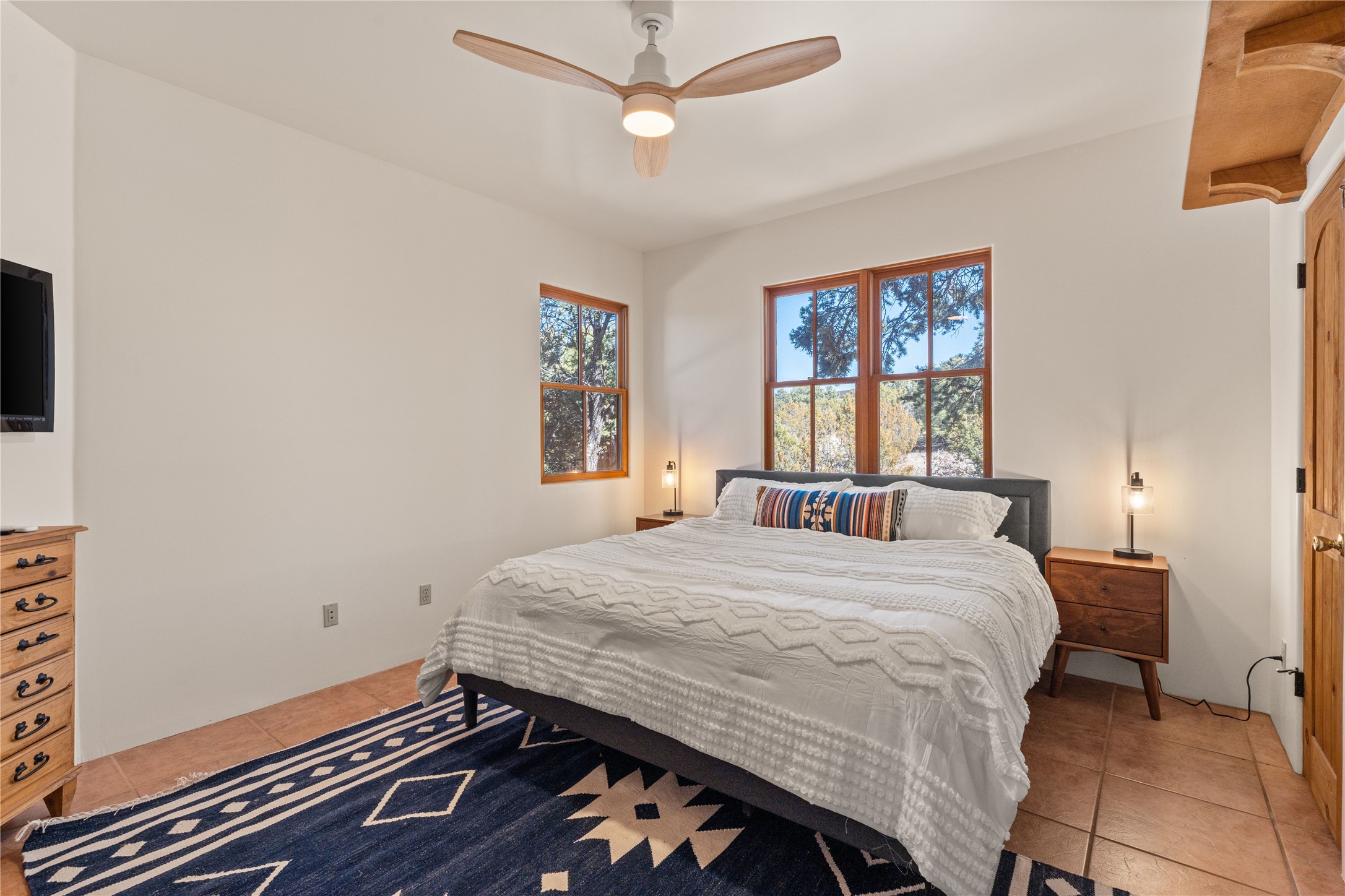 Santa Fe Sanctuary - located in the gated community of Alteza Estates just 20 minutes from the Historic Santa Fe Plaza. This stunning home boasts a living room with soaring ceilings, exposed Vigas and cozy wood-burning fireplace, perfect for gathering on chilly evenings or a blue sky summer's day. The recently remodeled kitchen is a chef's delight featuring sparkling quartz countertops, a designer tile backsplash, convenient island, electric induction range (propane stub in place), custom cabinetry with pullout shelves and undermount lighting. Enjoy casual meals in the eat-in kitchen or host elegant dinners in the formal dining room just off the kitchen and living area. The thoughtfully designed split floor plan offers privacy and comfort. A secondary bedroom and bath plus office are situated on a separate wing from the primary suite. Retreat to your private luxurious suite, featuring a wood-burning Kiva fireplace and french doors leading to a covered patio. Spa like primary bathroom with jacuzzi tub, oversized walk-in shower, dual sinks, and spacious walk-in closet. Custom details throughout this home: classic plaster walls in select areas, solid wood custom doors, ample built-in cabinetry, additional storage, and hard floor surfaces throughout. Two additional bedrooms with shared hallway bathroom. Laundry room with sink and built-ins. Property includes El Dorado water and access to Xfinity services. Stay comfortable year-round with new mini-split units installed in 2024, new boiler installed in 2025, and new tankless water heater in 2024. Outdoor living with expansive covered patio and enclosed yard, stunning views and unparalleled privacy. A front enclosed courtyard offers a welcoming entrance with lush landscaping. Oversized 2-car garage includes a workspace, storage room and EV receptacle. Experience Santa Fe living at its very finest!
