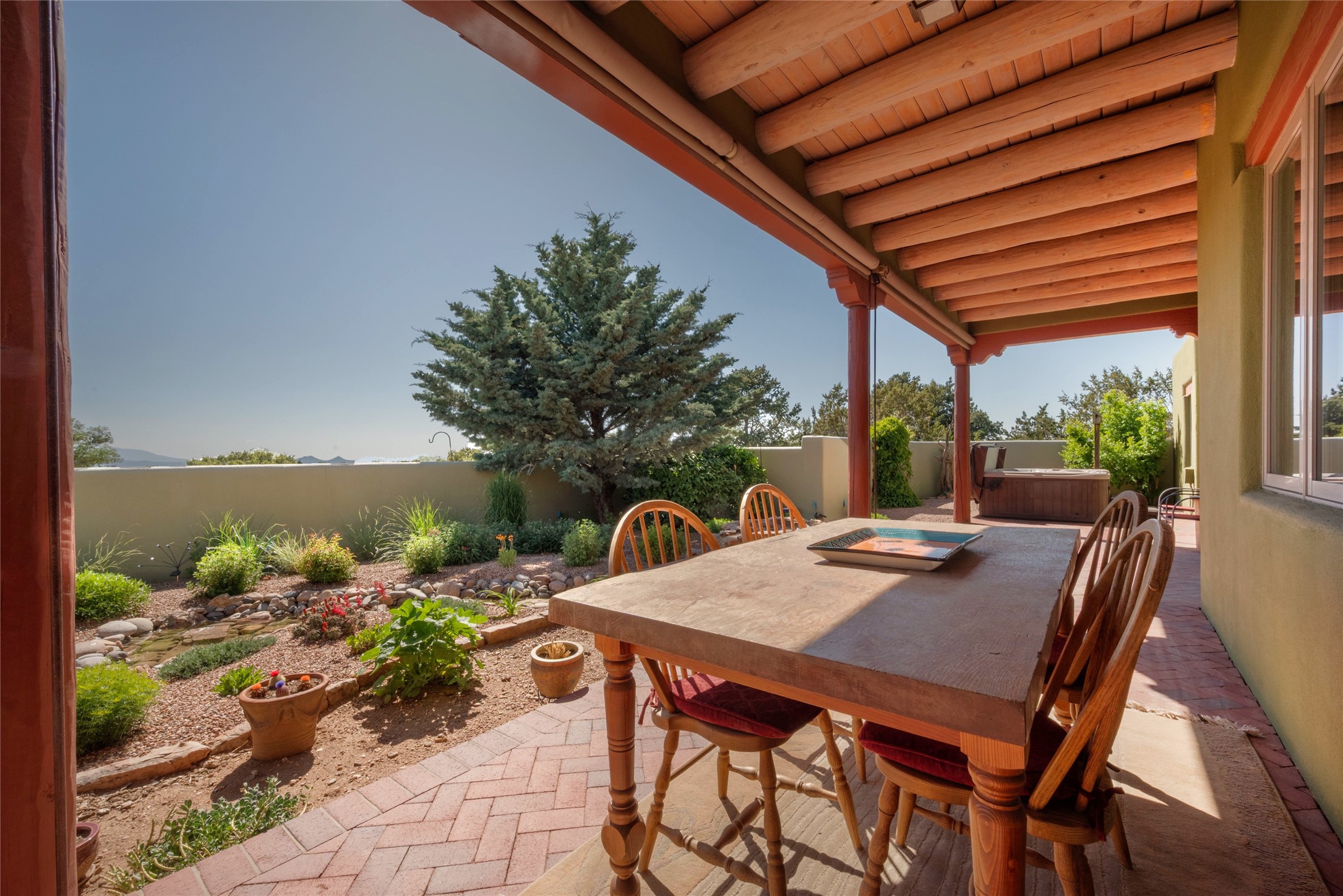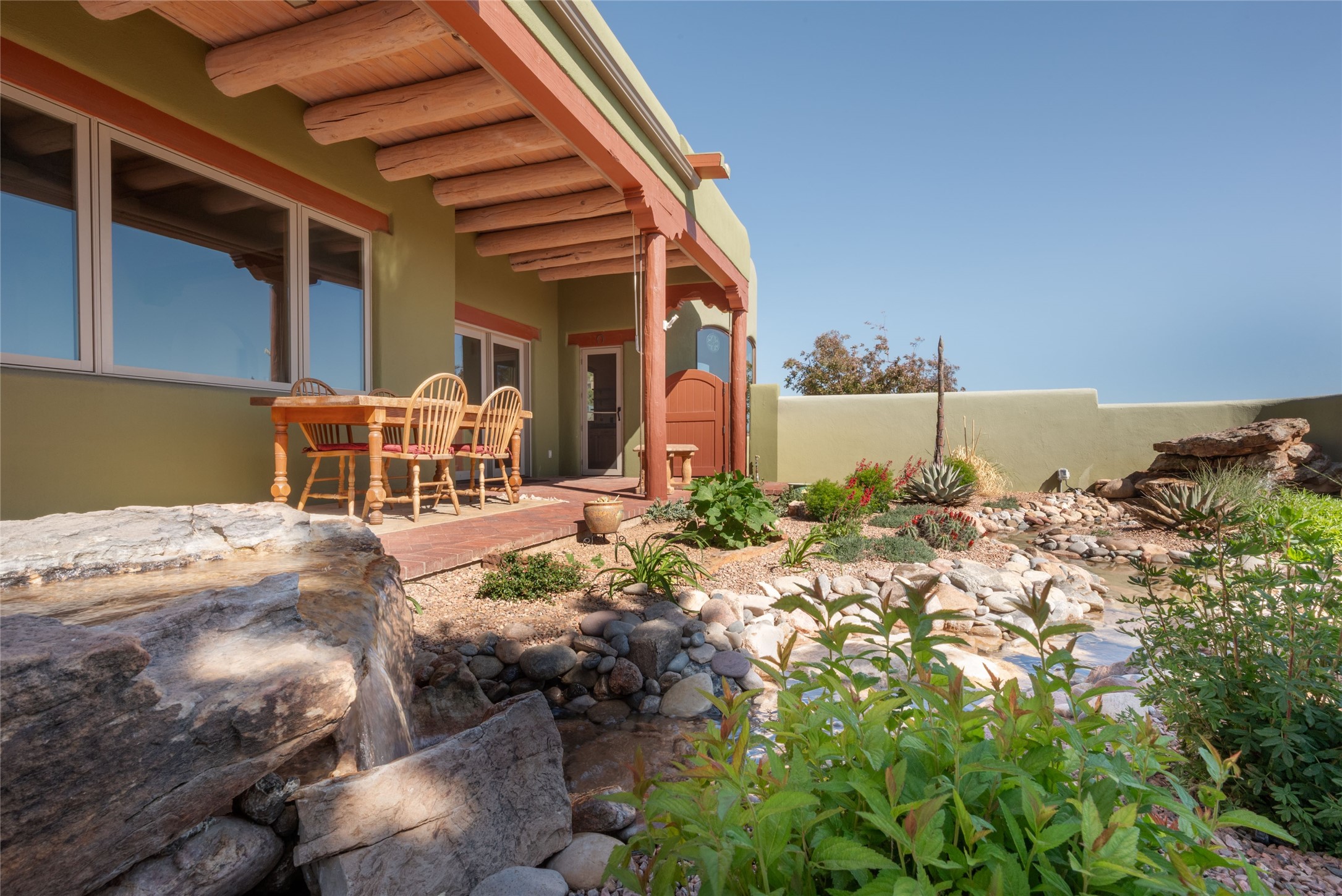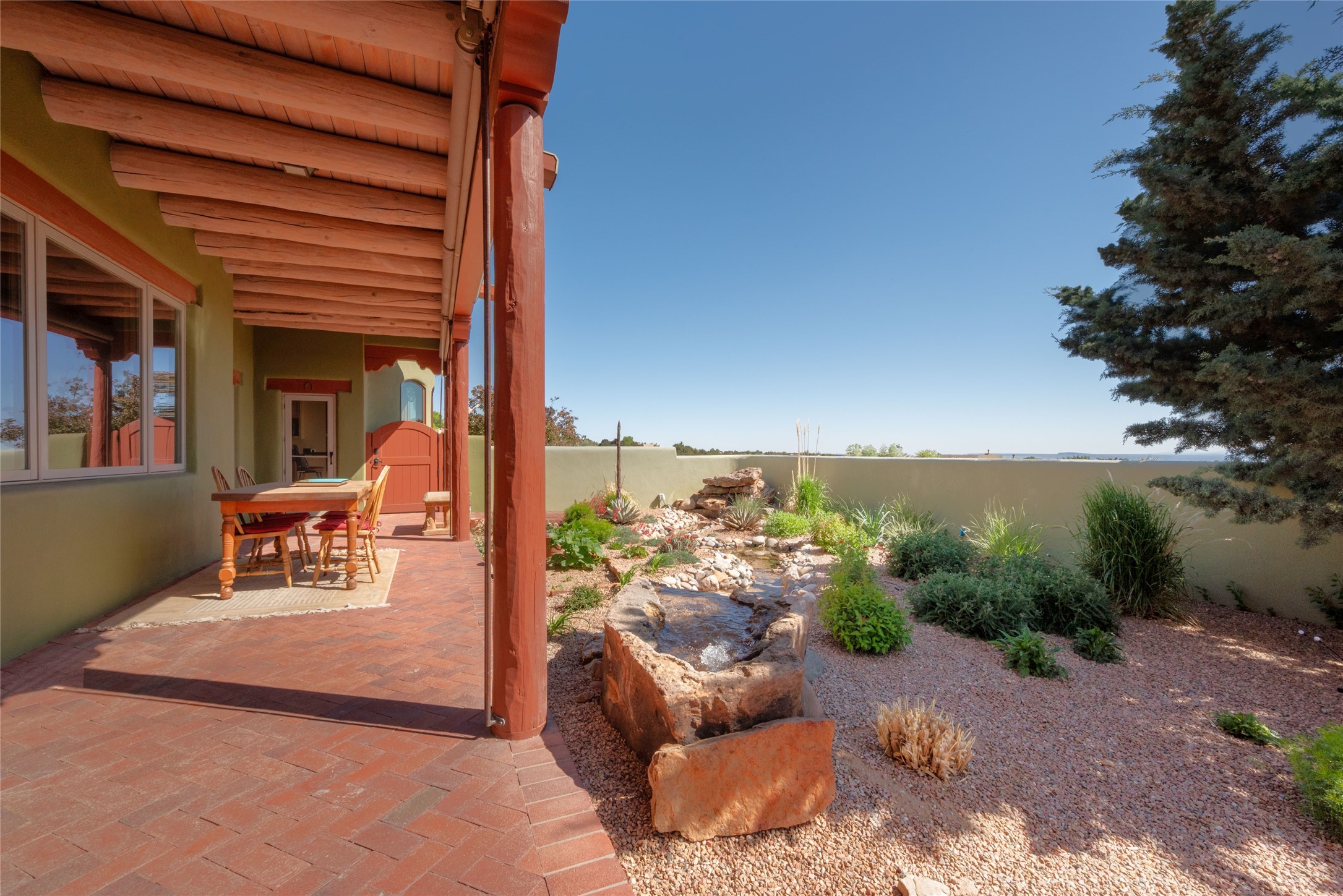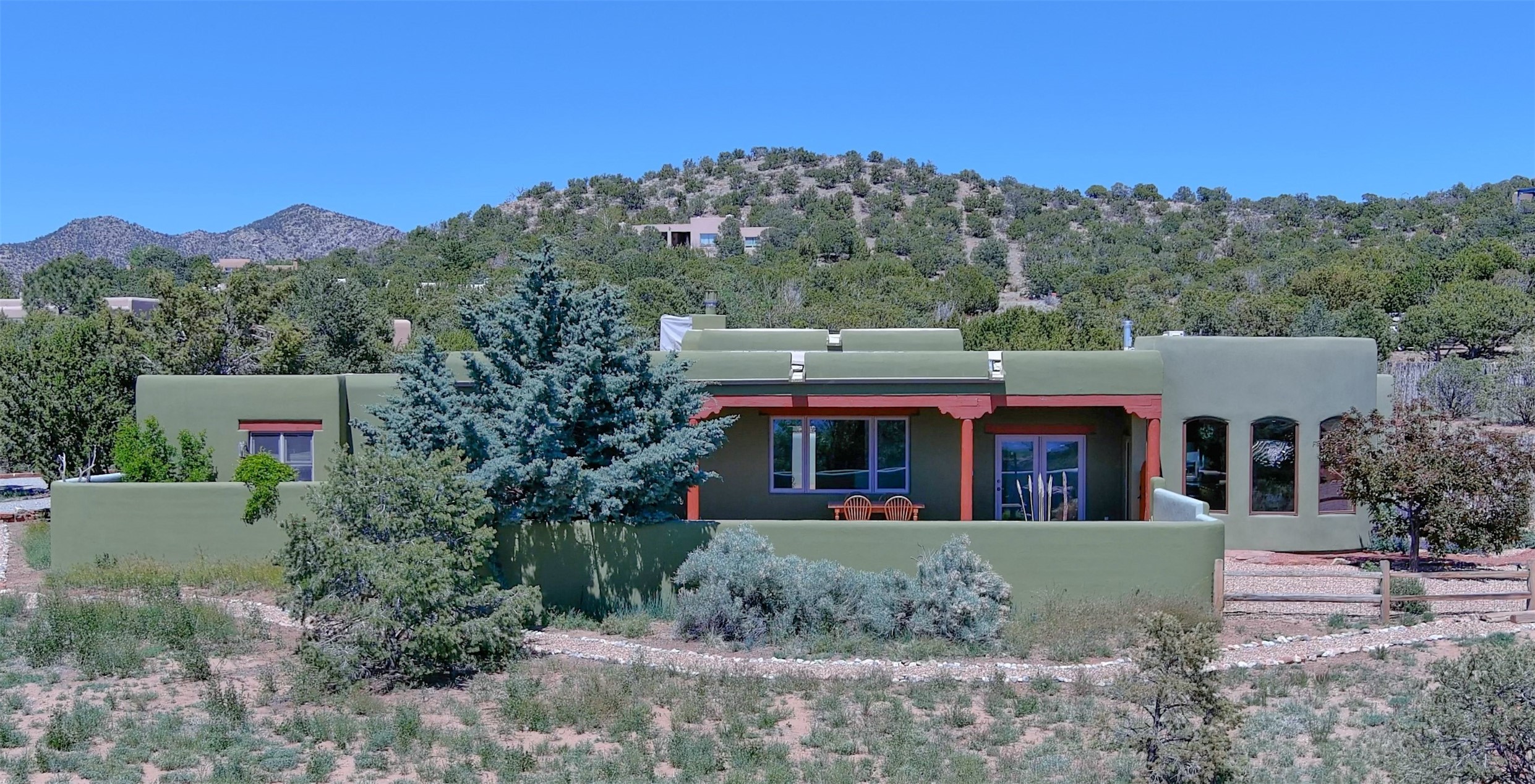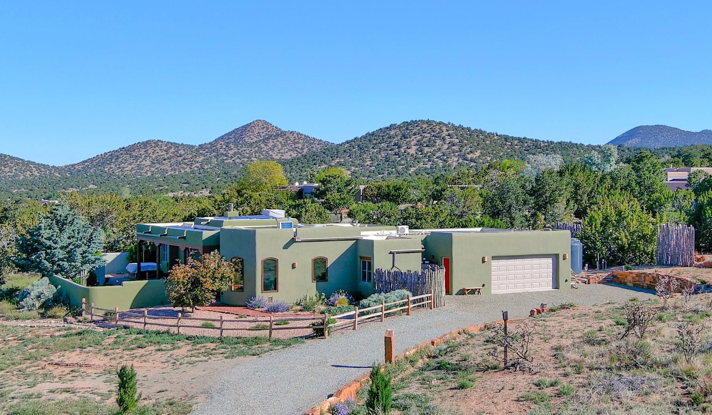 Nestled in the foothills on 1.83 acres with spectacular views, La Sierra is ideally situated between Dos Griegos and Eldorado. This stunning home offers a blend of traditional Southwest charm and modern updates, featuring 3 bedrooms, 3 baths, an attached guest quarters with kitchen, 2 offices, and an 868 sq. ft. heated garage. Constructed with Insulated Concrete Forms (ICF), the home boasts thick adobe-style finished walls, plastered interiors, vigas, and beams.The home has undergone an extensive remodel, including updates to the kitchen, primary bedroom and bath, guest bath, guest quarters, interior and exterior paint, landscaping, mechanical systems, and a new TPO roof. The kitchen features brand-new custom cabinets with pullouts, granite countertops, tile floors, a handmade island wood countertop with tile inlay, new appliances, updated lighting, and picturesque windows framing breathtaking views.The primary suite is elegantly updated with new hardware, granite countertops, stone sinks, faucets, lighting, paint, and tile flooring. It includes a separate bathtub, a walk-in shower, and a private door leading to the outdoor spa. Additionally, the suite offers two spacious walk-in closets. The guest bath has been enhanced with fresh paint, new tile, a vanity, sink, faucet, and mirror.The attached guest quarters provide a separate courtyard entrance and interior access for guest flexibility. This space includes a full bath, one bedroom, and a newly remodeled kitchen with updated cabinets, countertops, sink, appliances, wood and laminate flooring, and fresh interior paint.The home is equipped with a cutting-edge mechanical system, including boiler for radiant floor heating and exchange system for domestic hot water, powered by a 17.5 kW photovoltaic solar system, which is owned (not leased) and designed to achieve a "net-zero" PNM bill. The property is completely electric, including a stylish southwestern fireplace.The oversized 868 sq. ft. heated garage includes a designated workspace with power for a wood shop or hobby area, a private office with inside access, electric outlet ready for electric vehicle charging station, and a freezer.The thoughtfully designed xeriscaping features stone walls, lined driveways, gravel, and drip irrigation, all sustained by 9,000 gallons of rainwater harvesting tanks. The outdoor living spaces include a beautifully landscaped courtyard entry and a backyard patio with stunning views, retractable wind screens, and newly installed stone fountains and a stream.Conveniently located just minutes from La Tienda shopping center and less than a 10-minute drive on I-25 to Santa Fe, this remarkable home offers an unbeatable combination of elegance, sustainability, and convenience.
