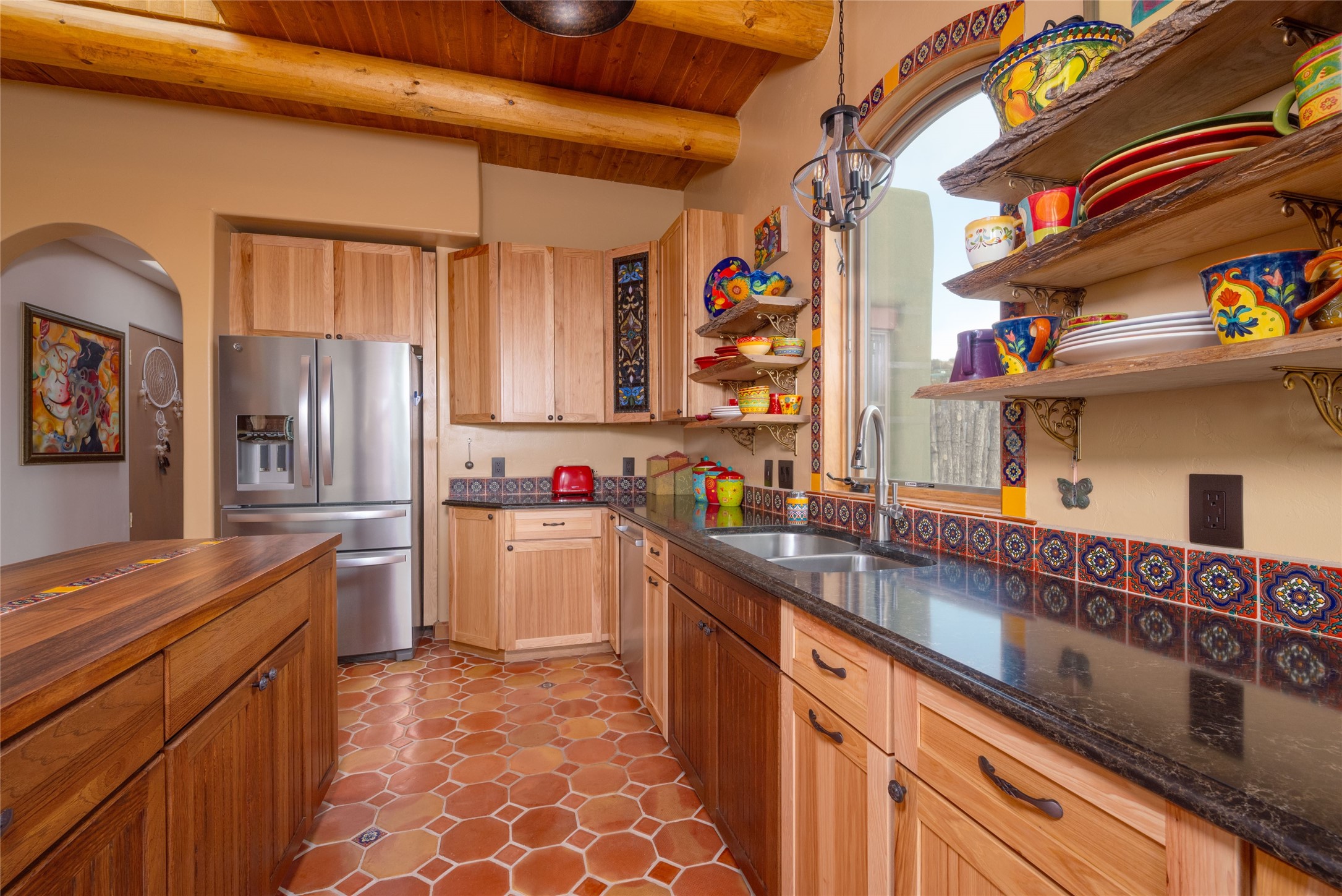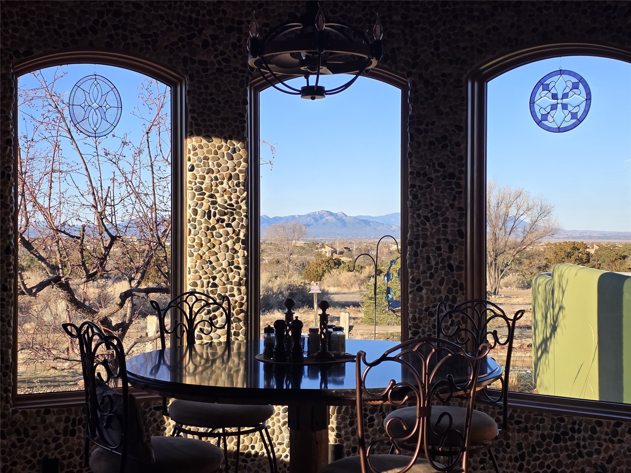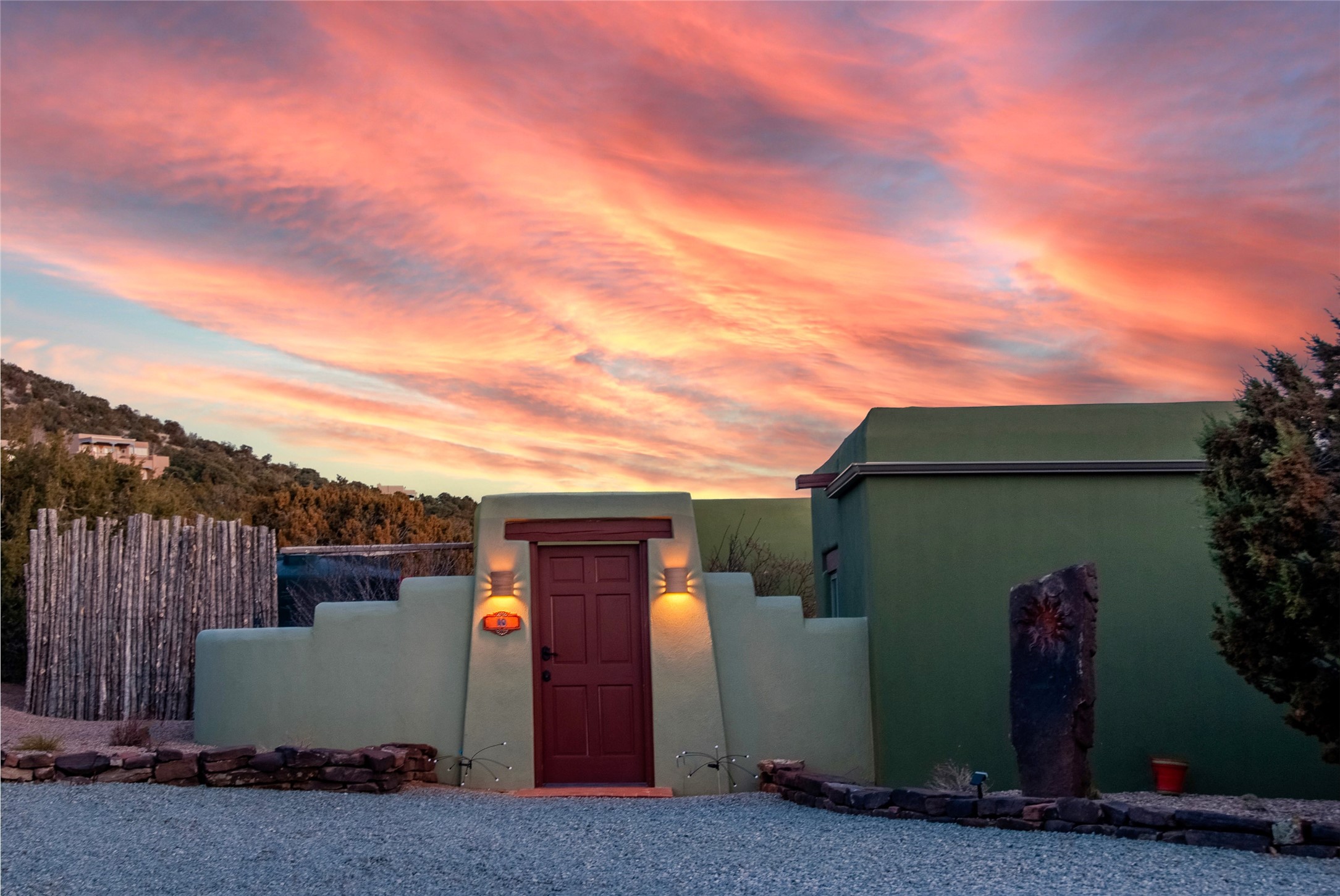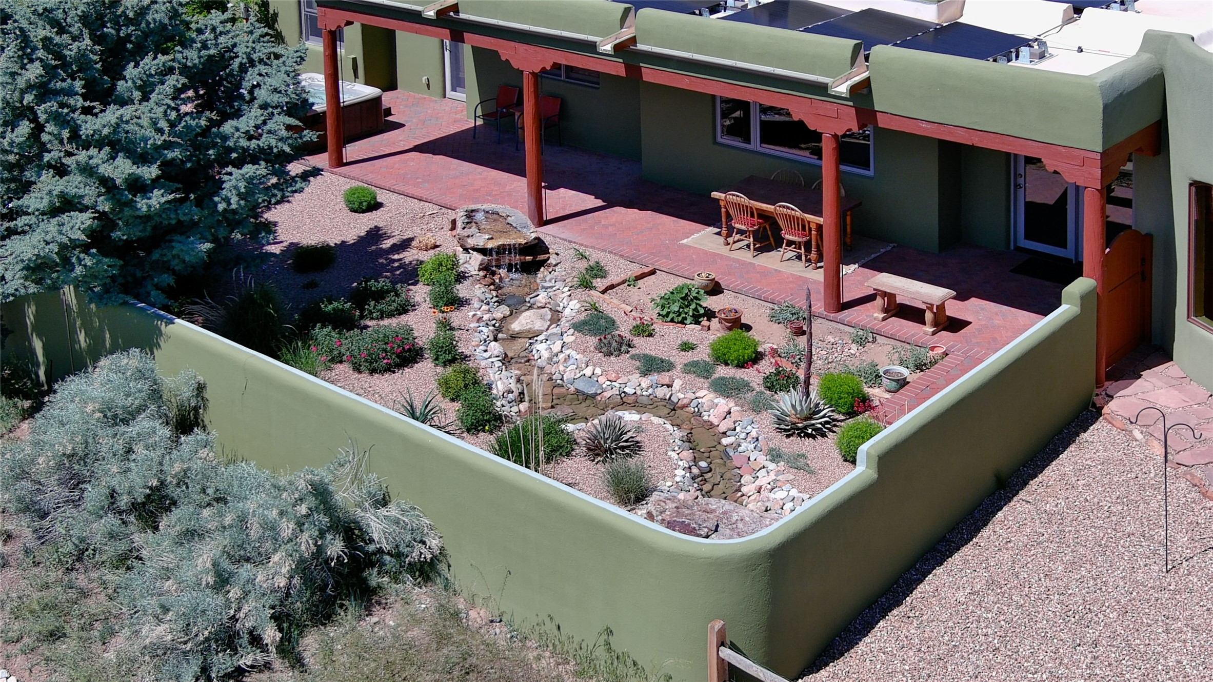 Nestled in the foothills on 1.83 acres with spectacular views, La Sierra is ideally situated between Dos Griegos and Eldorado. This stunning home offers a blend of traditional Southwest charm and modern updates, featuring 3 bedrooms, 3 baths, an attached guest quarters with kitchen, 2 offices, and an 868 sq. ft. heated garage. Constructed with Insulated Concrete Forms (ICF), the home boasts thick adobe-style finished walls, plastered interiors, vigas, and beams.The home has undergone an extensive remodel, including updates to the kitchen, primary bedroom and bath, guest bath, guest quarters, interior and exterior paint, landscaping, mechanical systems, and a new TPO roof. The kitchen features brand-new custom cabinets with pullouts, granite countertops, tile floors, a handmade island wood countertop with tile inlay, new appliances, updated lighting, and picturesque windows framing breathtaking views.The primary suite is elegantly updated with new hardware, granite countertops, stone sinks, faucets, lighting, paint, and tile flooring. It includes a separate bathtub, a walk-in shower, and a private door leading to the outdoor spa. Additionally, the suite offers two spacious walk-in closets. The guest bath has been enhanced with fresh paint, new tile, a vanity, sink, faucet, and mirror.The attached guest quarters provide a separate courtyard entrance and interior access for guest flexibility. This space includes a full bath, one bedroom, and a newly remodeled kitchen with updated cabinets, countertops, sink, appliances, wood and laminate flooring, and fresh interior paint.The home is equipped with a cutting-edge mechanical system, including boiler for radiant floor heating and exchange system for domestic hot water, powered by a 17.5 kW photovoltaic solar system, which is owned (not leased) and designed to achieve a "net-zero" PNM bill. The property is completely electric, including a stylish southwestern fireplace.The oversized 868 sq. ft. heated garage includes a designated workspace with power for a wood shop or hobby area, a private office with inside access, electric outlet ready for electric vehicle charging station, and a freezer.The thoughtfully designed xeriscaping features stone walls, lined driveways, gravel, and drip irrigation, all sustained by 9,000 gallons of rainwater harvesting tanks. The outdoor living spaces include a beautifully landscaped courtyard entry and a backyard patio with stunning views, retractable wind screens, and newly installed stone fountains and a stream.Conveniently located just minutes from La Tienda shopping center and less than a 10-minute drive on I-25 to Santa Fe, this remarkable home offers an unbeatable combination of elegance, sustainability, and convenience.