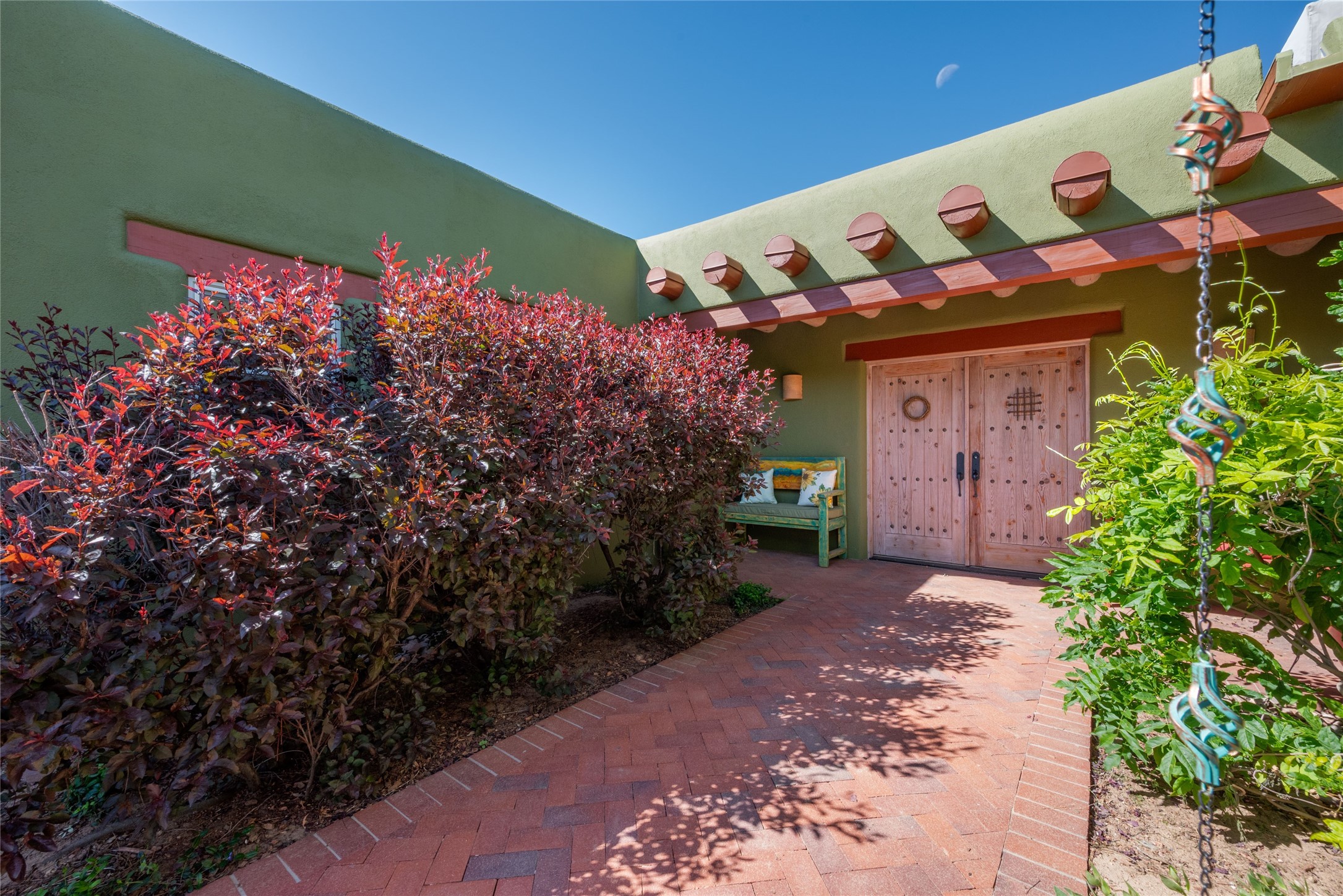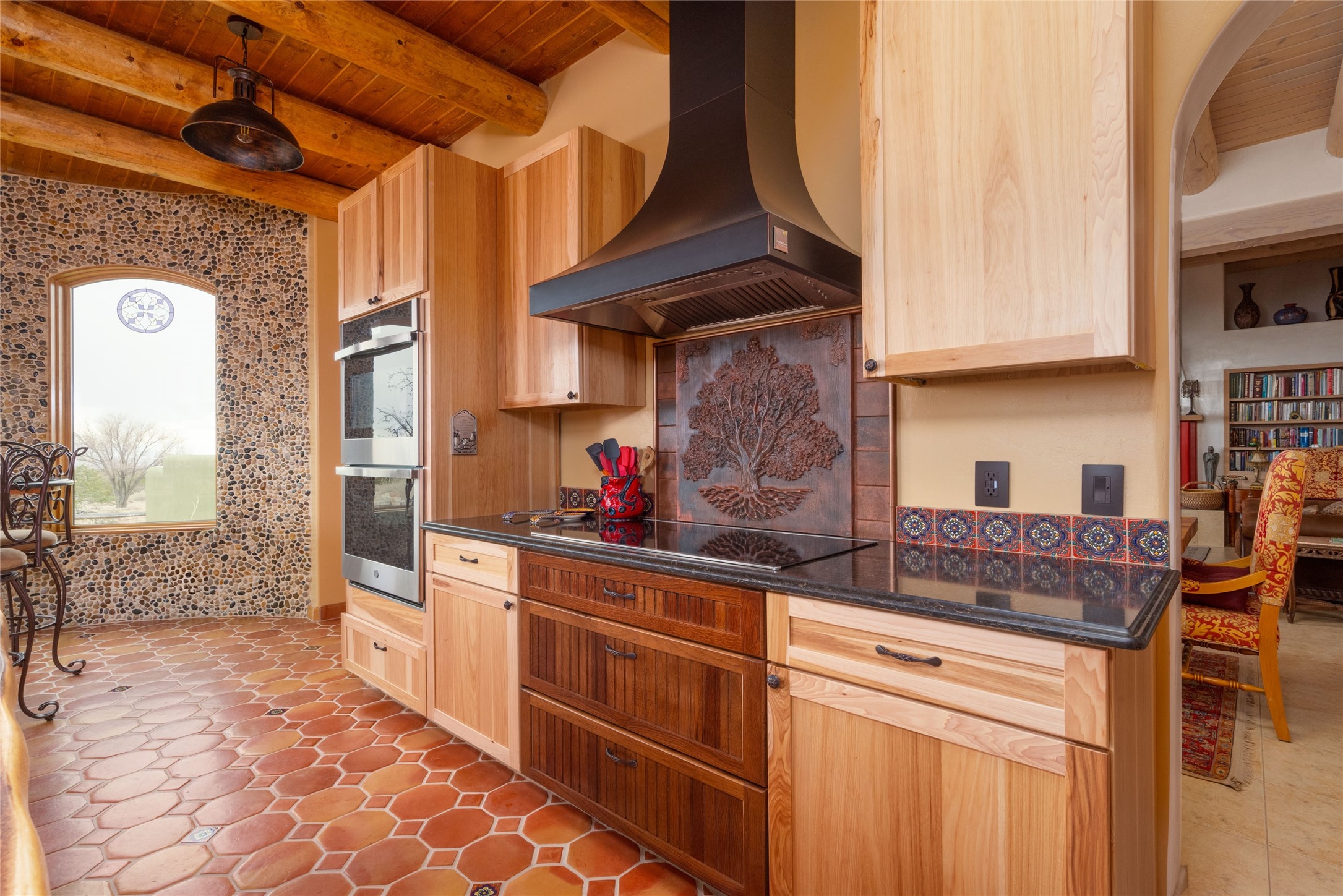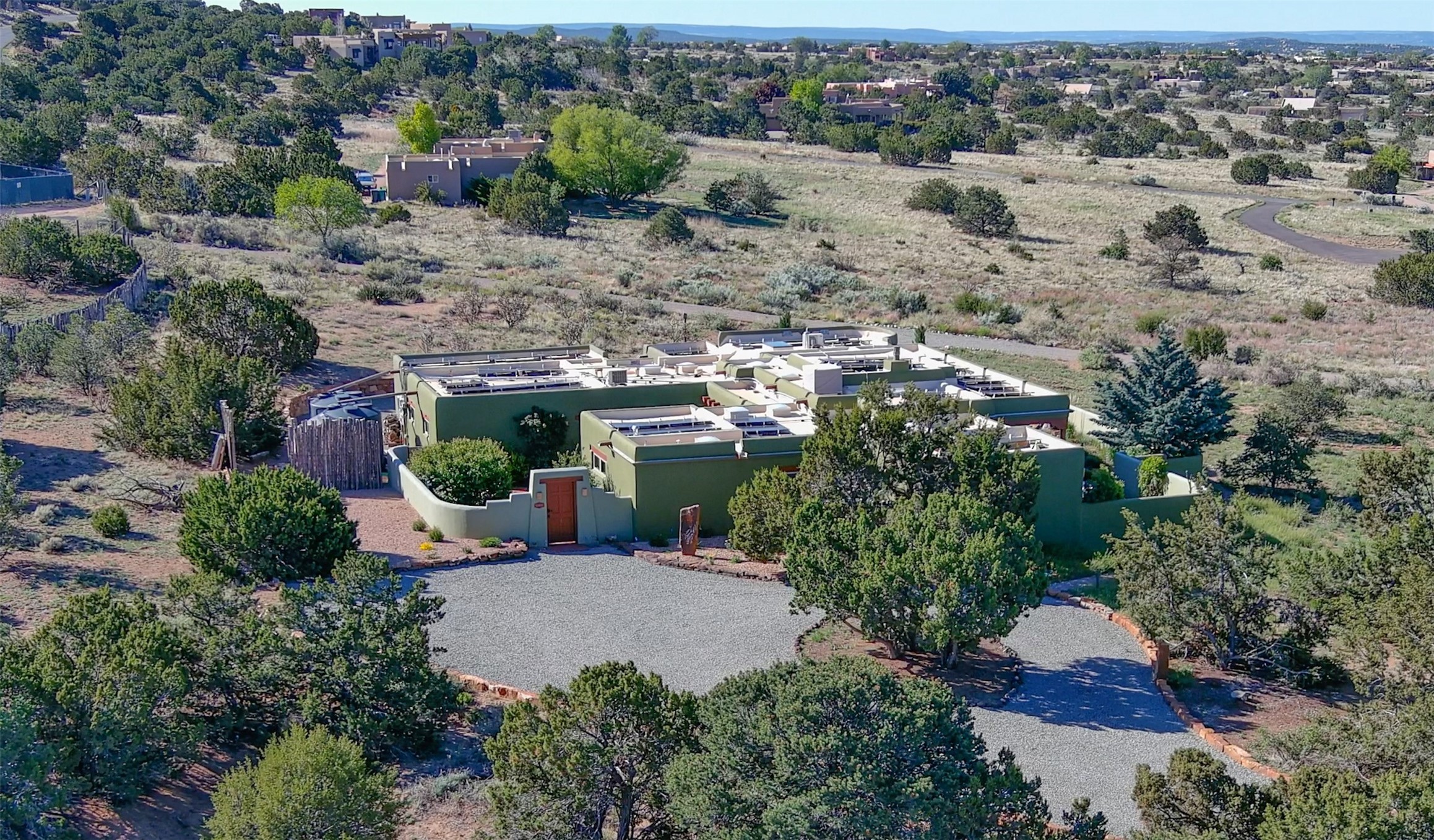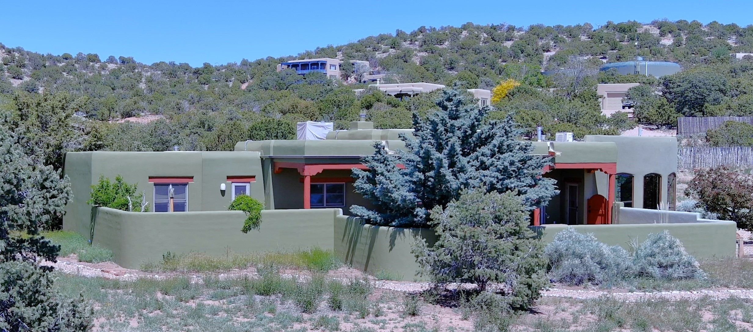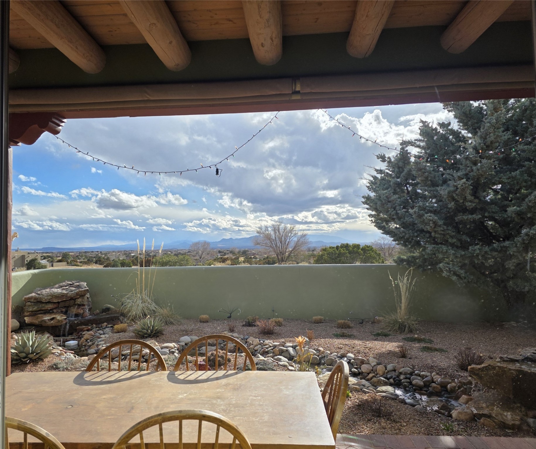 Nestled in the foothills on 1.83 acres with spectacular views, La Sierra is ideally situated between Dos Griegos and Eldorado. This stunning home offers a blend of traditional Southwest charm and modern updates, featuring 3 bedrooms, 3 baths, an attached guest quarters with kitchen, 2 offices, and an 868 sq. ft. heated garage. Constructed with Insulated Concrete Forms (ICF), the home boasts thick adobe-style finished walls, plastered interiors, vigas, and beams.The home has undergone an extensive remodel, including updates to the kitchen, primary bedroom and bath, guest bath, guest quarters, interior and exterior paint, landscaping, mechanical systems, and a new TPO roof. The kitchen features brand-new custom cabinets with pullouts, granite countertops, tile floors, a handmade island wood countertop with tile inlay, new appliances, updated lighting, and picturesque windows framing breathtaking views.The primary suite is elegantly updated with new hardware, granite countertops, stone sinks, faucets, lighting, paint, and tile flooring. It includes a separate bathtub, a walk-in shower, and a private door leading to the outdoor spa. Additionally, the suite offers two spacious walk-in closets. The guest bath has been enhanced with fresh paint, new tile, a vanity, sink, faucet, and mirror.The attached guest quarters provide a separate courtyard entrance and interior access for guest flexibility. This space includes a full bath, one bedroom, and a newly remodeled kitchen with updated cabinets, countertops, sink, appliances, wood and laminate flooring, and fresh interior paint.The home is equipped with a cutting-edge mechanical system, including boiler for radiant floor heating and exchange system for domestic hot water, powered by a 17.5 kW photovoltaic solar system, which is owned (not leased) and designed to achieve a "net-zero" PNM bill. The property is completely electric, including a stylish southwestern fireplace.The oversized 868 sq. ft. heated garage includes a designated workspace with power for a wood shop or hobby area, a private office with inside access, electric outlet ready for electric vehicle charging station, and a freezer.The thoughtfully designed xeriscaping features stone walls, lined driveways, gravel, and drip irrigation, all sustained by 9,000 gallons of rainwater harvesting tanks. The outdoor living spaces include a beautifully landscaped courtyard entry and a backyard patio with stunning views, retractable wind screens, and newly installed stone fountains and a stream.Conveniently located just minutes from La Tienda shopping center and less than a 10-minute drive on I-25 to Santa Fe, this remarkable home offers an unbeatable combination of elegance, sustainability, and convenience.