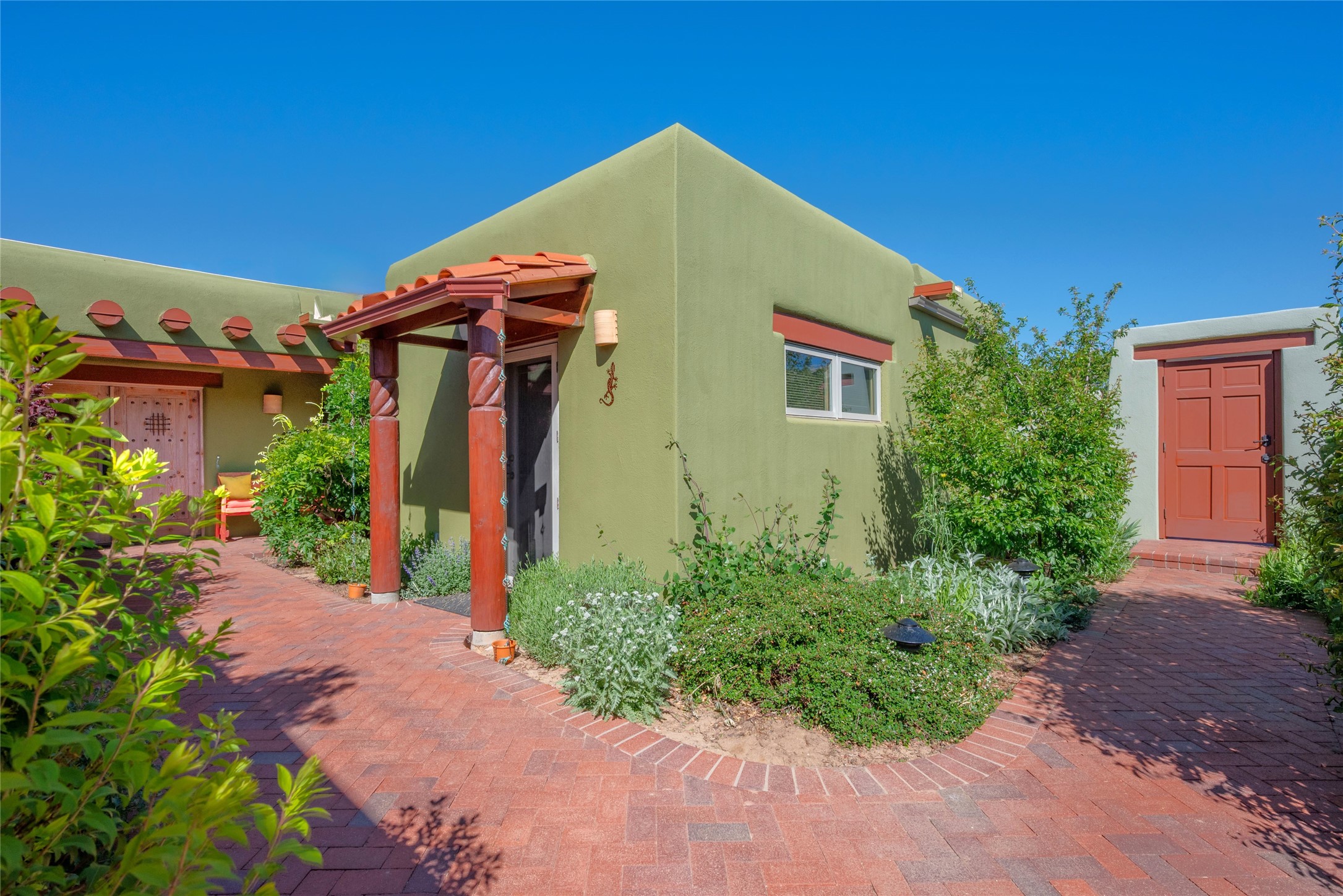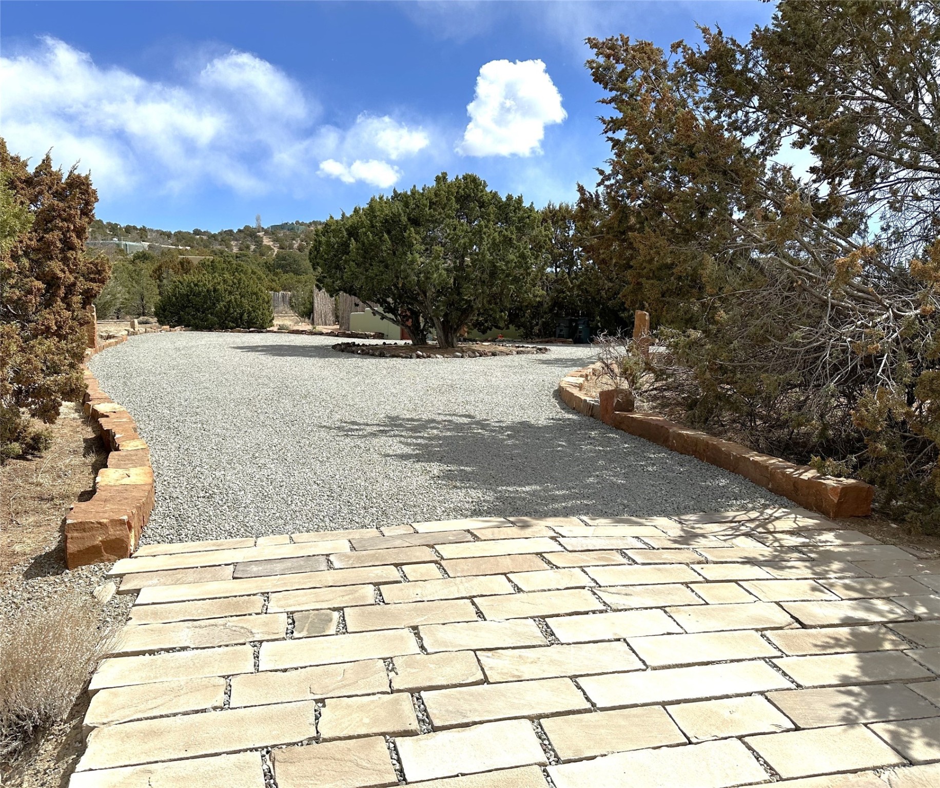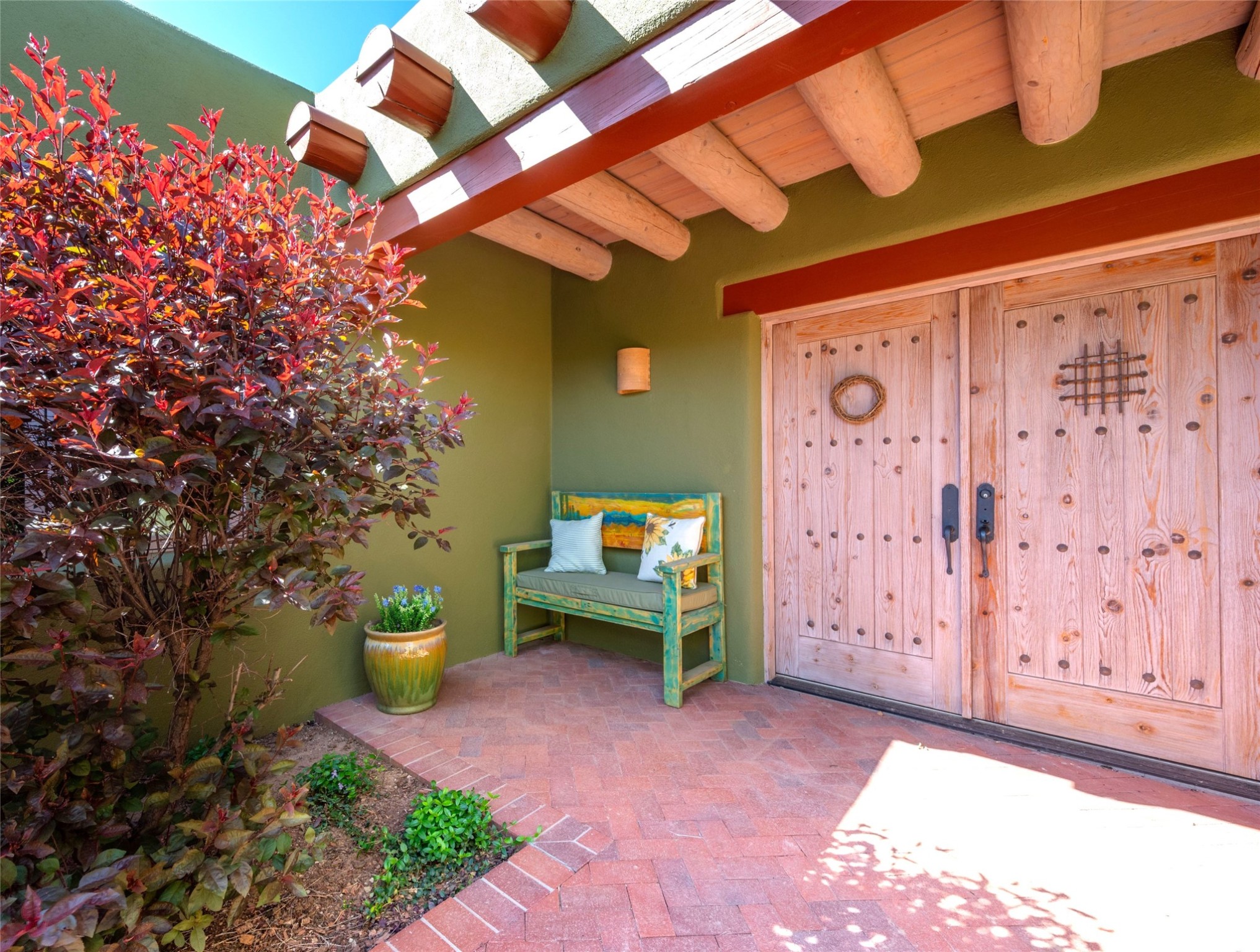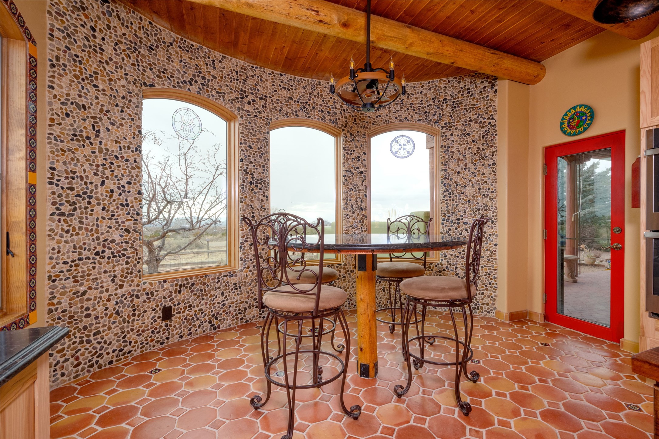Nestled in the foothills on 1.83 acres with spectacular views, La Sierra is ideally situated between Dos Griegos and Eldorado. This stunning home offers a blend of traditional Southwest charm and modern updates, featuring 3 bedrooms, 3 baths, an attached guest quarters with kitchen, 2 offices, and an 868 sq. ft. heated garage. Constructed with Insulated Concrete Forms (ICF), the home boasts thick adobe-style finished walls, plastered interiors, vigas, and beams.The home has undergone an extensive remodel, including updates to the kitchen, primary bedroom and bath, guest bath, guest quarters, interior and exterior paint, landscaping, mechanical systems, and a new TPO roof. The kitchen features brand-new custom cabinets with pullouts, granite countertops, tile floors, a handmade island wood countertop with tile inlay, new appliances, updated lighting, and picturesque windows framing breathtaking views.The primary suite is elegantly updated with new hardware, granite countertops, stone sinks, faucets, lighting, paint, and tile flooring. It includes a separate bathtub, a walk-in shower, and a private door leading to the outdoor spa. Additionally, the suite offers two spacious walk-in closets. The guest bath has been enhanced with fresh paint, new tile, a vanity, sink, faucet, and mirror.The attached guest quarters provide a separate courtyard entrance and interior access for guest flexibility. This space includes a full bath, one bedroom, and a newly remodeled kitchen with updated cabinets, countertops, sink, appliances, wood and laminate flooring, and fresh interior paint.The home is equipped with a cutting-edge mechanical system, including boiler for radiant floor heating and exchange system for domestic hot water, powered by a 17.5 kW photovoltaic solar system, which is owned (not leased) and designed to achieve a "net-zero" PNM bill. The property is completely electric, including a stylish southwestern fireplace.The oversized 868 sq. ft. heated garage includes a designated workspace with power for a wood shop or hobby area, a private office with inside access, electric outlet ready for electric vehicle charging station, and a freezer.The thoughtfully designed xeriscaping features stone walls, lined driveways, gravel, and drip irrigation, all sustained by 9,000 gallons of rainwater harvesting tanks. The outdoor living spaces include a beautifully landscaped courtyard entry and a backyard patio with stunning views, retractable wind screens, and newly installed stone fountains and a stream.Conveniently located just minutes from La Tienda shopping center and less than a 10-minute drive on I-25 to Santa Fe, this remarkable home offers an unbeatable combination of elegance, sustainability, and convenience.