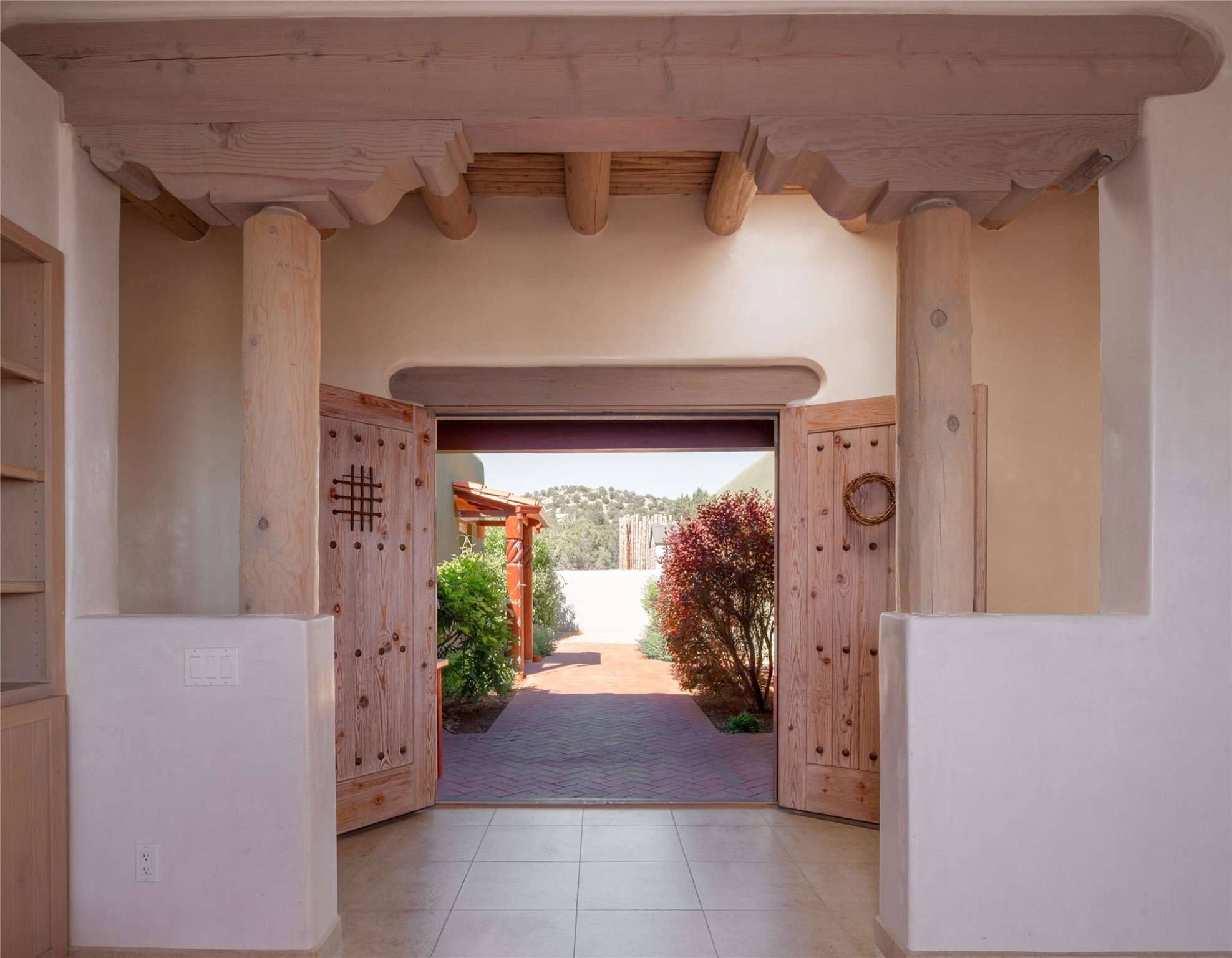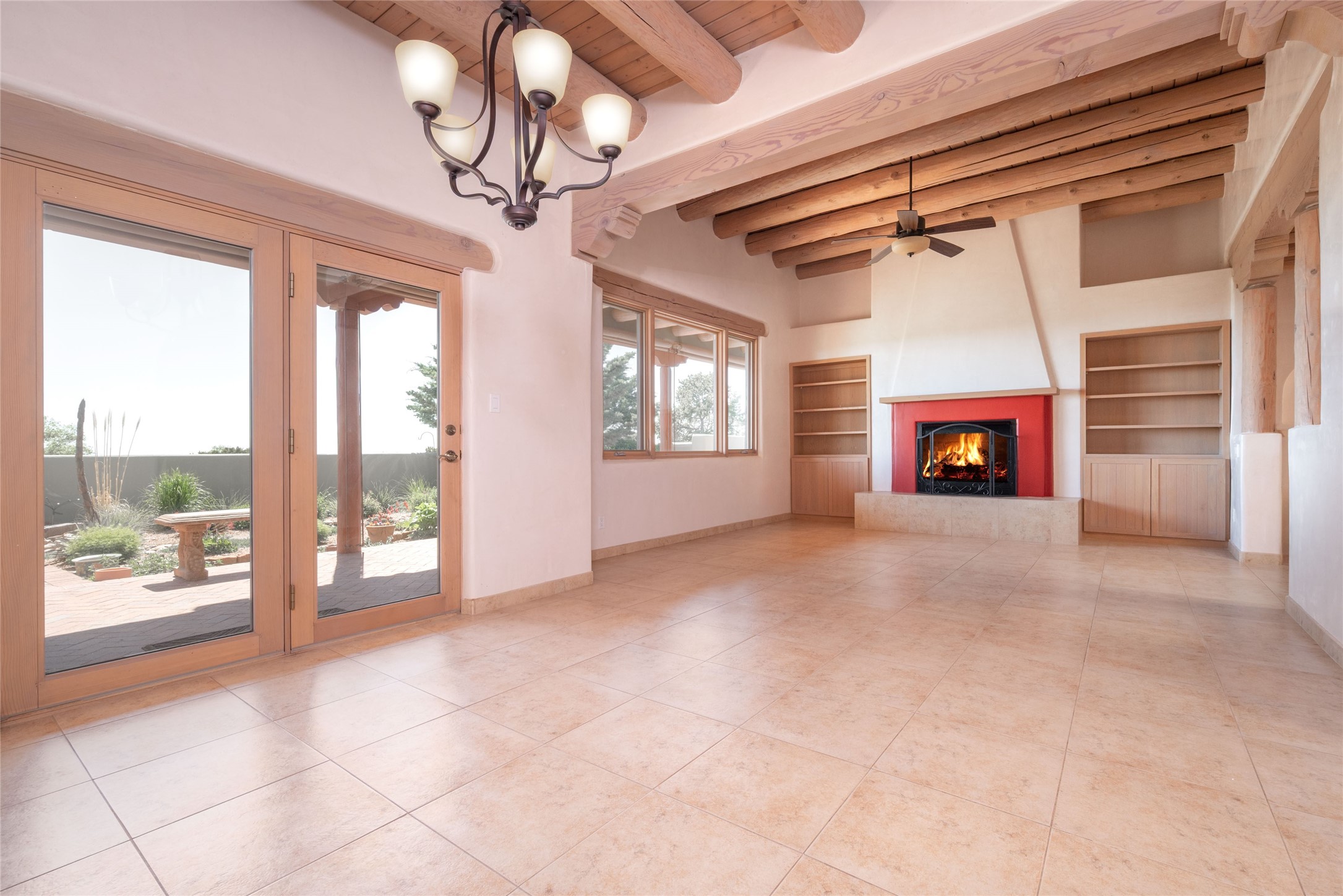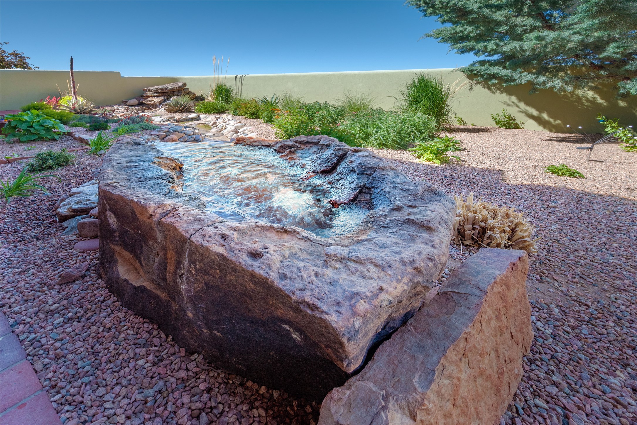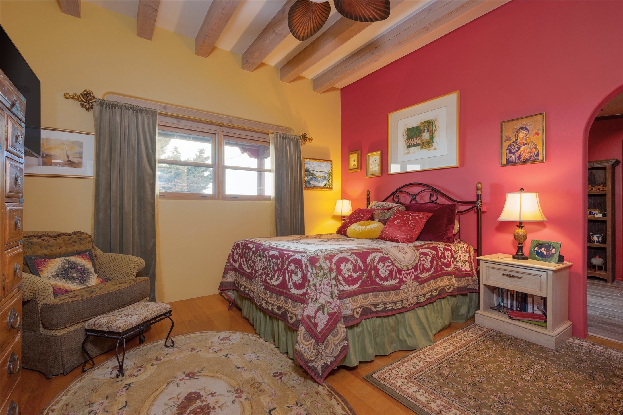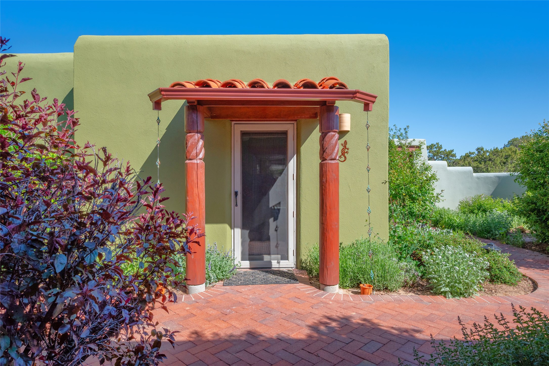 Nestled in the foothills on 1.83 acres with spectacular views, La Sierra is ideally situated between Dos Griegos and Eldorado. This stunning home offers a blend of traditional Southwest charm and modern updates, featuring 3 bedrooms, 3 baths, an attached guest quarters with kitchen, 2 offices, and an 868 sq. ft. heated garage. Constructed with Insulated Concrete Forms (ICF), the home boasts thick adobe-style finished walls, plastered interiors, vigas, and beams.The home has undergone an extensive remodel, including updates to the kitchen, primary bedroom and bath, guest bath, guest quarters, interior and exterior paint, landscaping, mechanical systems, and a new TPO roof. The kitchen features brand-new custom cabinets with pullouts, granite countertops, tile floors, a handmade island wood countertop with tile inlay, new appliances, updated lighting, and picturesque windows framing breathtaking views.The primary suite is elegantly updated with new hardware, granite countertops, stone sinks, faucets, lighting, paint, and tile flooring. It includes a separate bathtub, a walk-in shower, and a private door leading to the outdoor spa. Additionally, the suite offers two spacious walk-in closets. The guest bath has been enhanced with fresh paint, new tile, a vanity, sink, faucet, and mirror.The attached guest quarters provide a separate courtyard entrance and interior access for guest flexibility. This space includes a full bath, one bedroom, and a newly remodeled kitchen with updated cabinets, countertops, sink, appliances, wood and laminate flooring, and fresh interior paint.The home is equipped with a cutting-edge mechanical system, including boiler for radiant floor heating and exchange system for domestic hot water, powered by a 17.5 kW photovoltaic solar system, which is owned (not leased) and designed to achieve a "net-zero" PNM bill. The property is completely electric, including a stylish southwestern fireplace.The oversized 868 sq. ft. heated garage includes a designated workspace with power for a wood shop or hobby area, a private office with inside access, electric outlet ready for electric vehicle charging station, and a freezer.The thoughtfully designed xeriscaping features stone walls, lined driveways, gravel, and drip irrigation, all sustained by 9,000 gallons of rainwater harvesting tanks. The outdoor living spaces include a beautifully landscaped courtyard entry and a backyard patio with stunning views, retractable wind screens, and newly installed stone fountains and a stream.Conveniently located just minutes from La Tienda shopping center and less than a 10-minute drive on I-25 to Santa Fe, this remarkable home offers an unbeatable combination of elegance, sustainability, and convenience.