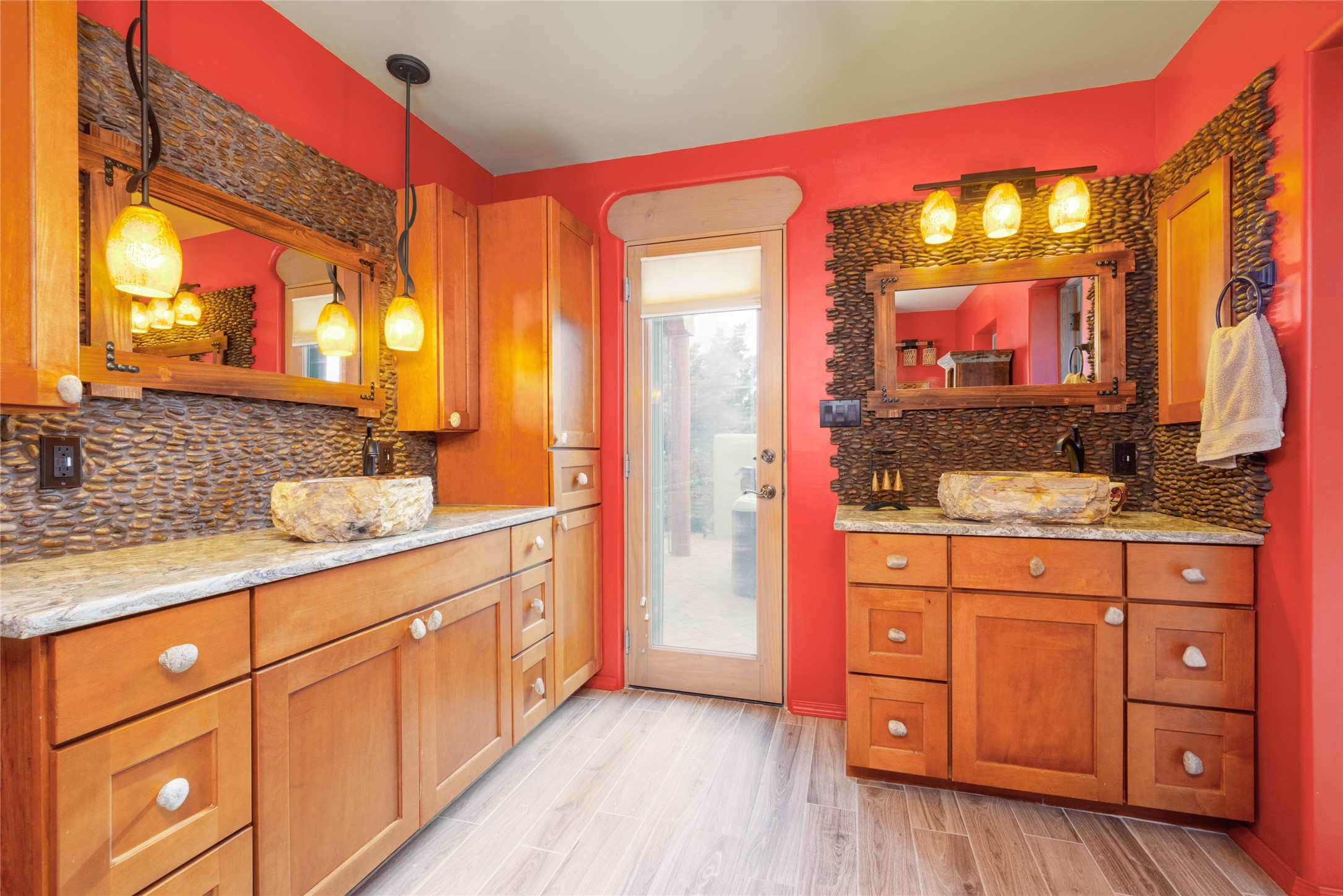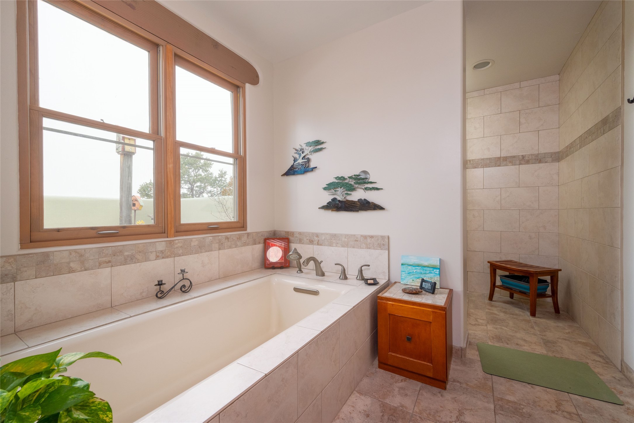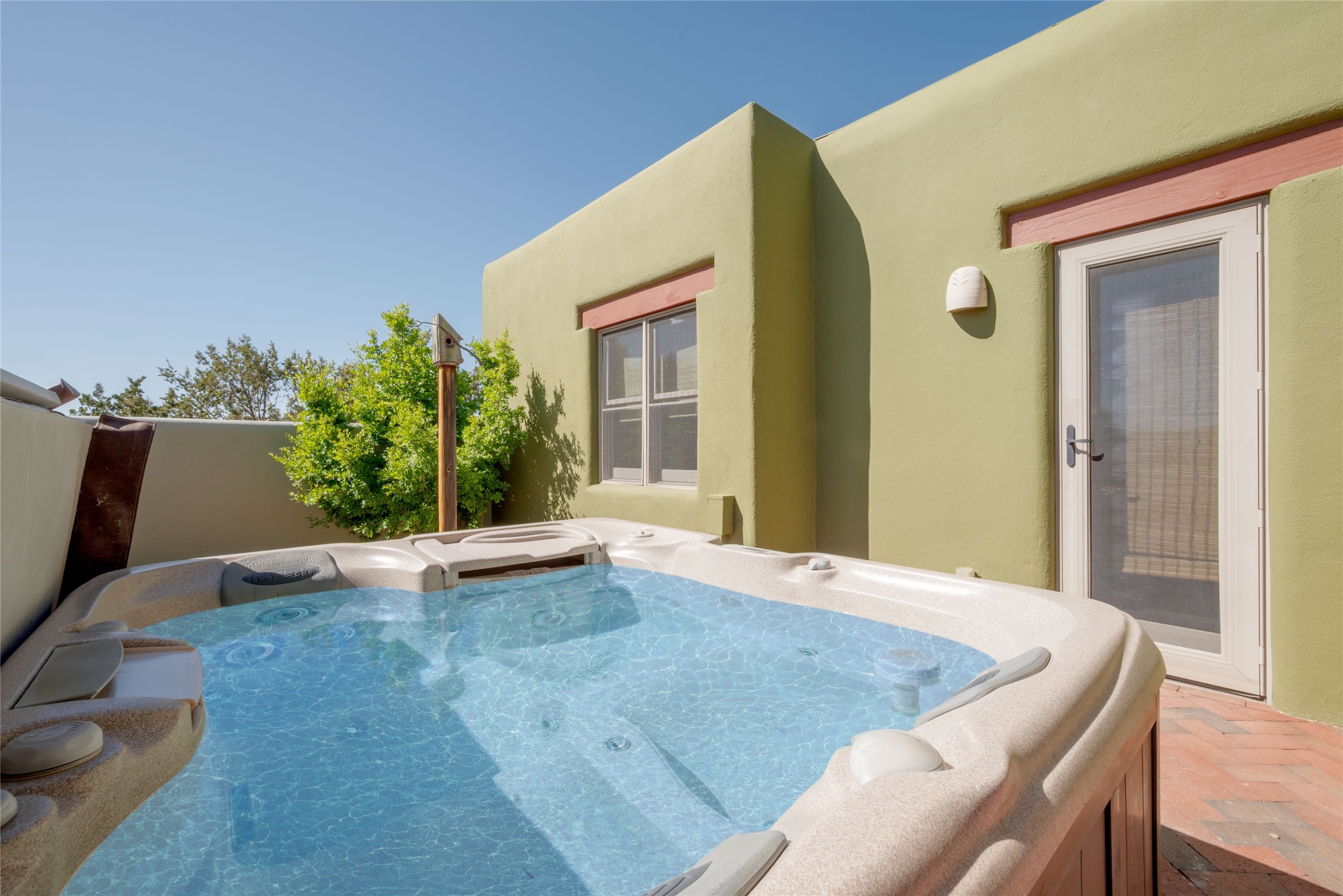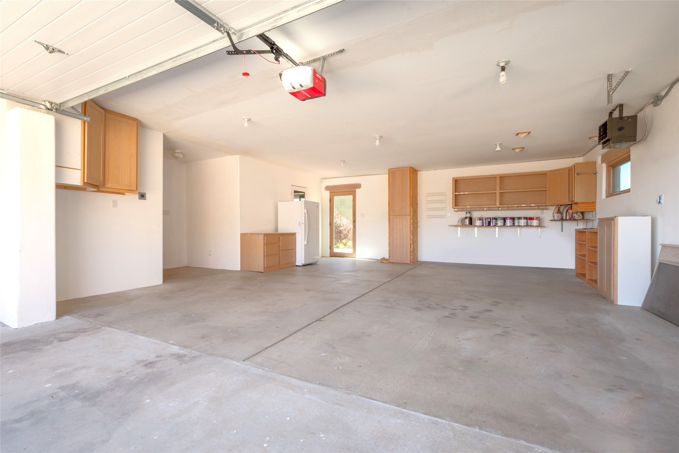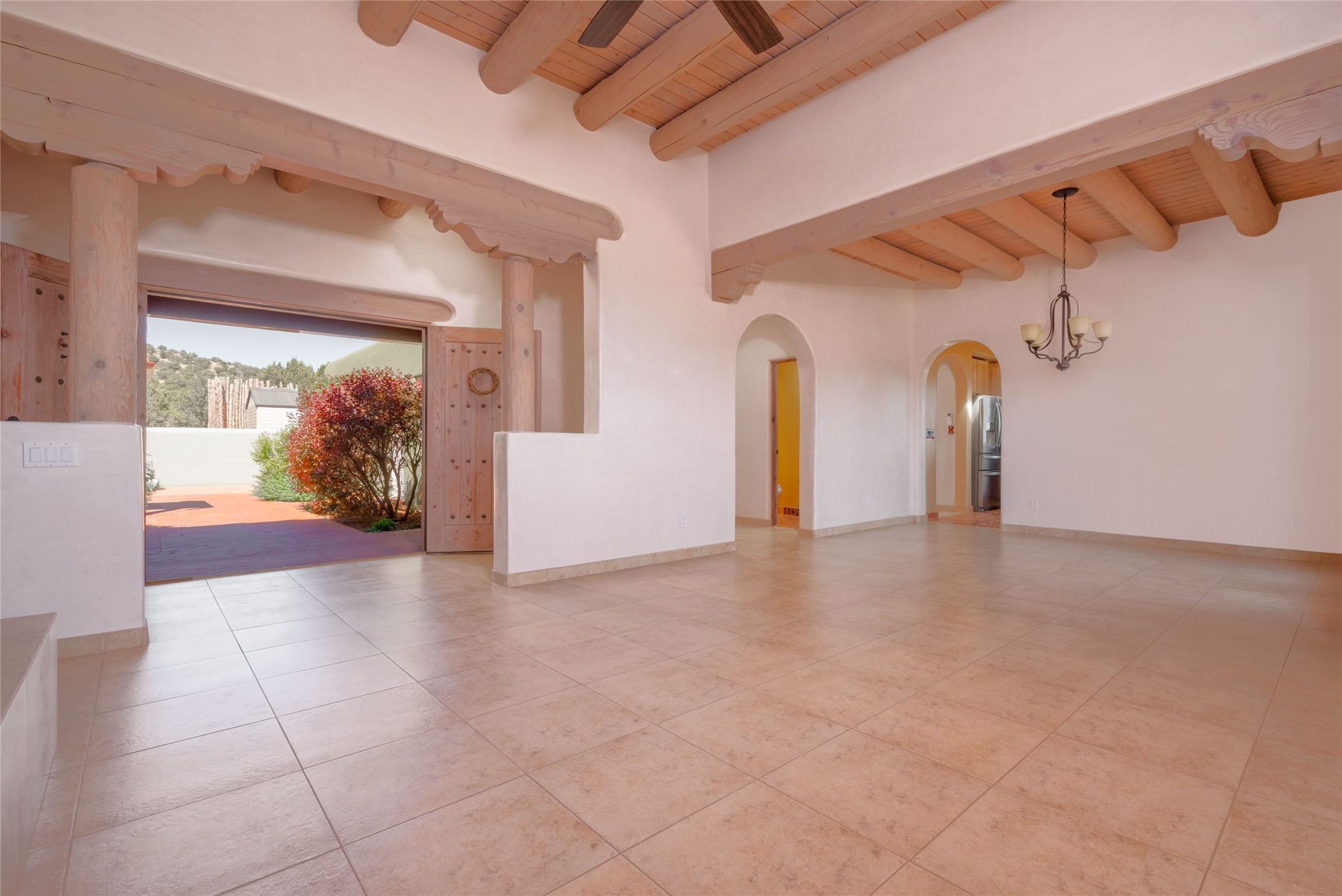 Nestled in the foothills on 1.83 acres with spectacular views, La Sierra is ideally situated between Dos Griegos and Eldorado. This stunning home offers a blend of traditional Southwest charm and modern updates, featuring 3 bedrooms, 3 baths, an attached guest quarters with kitchen, 2 offices, and an 868 sq. ft. heated garage. Constructed with Insulated Concrete Forms (ICF), the home boasts thick adobe-style finished walls, plastered interiors, vigas, and beams.The home has undergone an extensive remodel, including updates to the kitchen, primary bedroom and bath, guest bath, guest quarters, interior and exterior paint, landscaping, mechanical systems, and a new TPO roof. The kitchen features brand-new custom cabinets with pullouts, granite countertops, tile floors, a handmade island wood countertop with tile inlay, new appliances, updated lighting, and picturesque windows framing breathtaking views.The primary suite is elegantly updated with new hardware, granite countertops, stone sinks, faucets, lighting, paint, and tile flooring. It includes a separate bathtub, a walk-in shower, and a private door leading to the outdoor spa. Additionally, the suite offers two spacious walk-in closets. The guest bath has been enhanced with fresh paint, new tile, a vanity, sink, faucet, and mirror.The attached guest quarters provide a separate courtyard entrance and interior access for guest flexibility. This space includes a full bath, one bedroom, and a newly remodeled kitchen with updated cabinets, countertops, sink, appliances, wood and laminate flooring, and fresh interior paint.The home is equipped with a cutting-edge mechanical system, including boiler for radiant floor heating and exchange system for domestic hot water, powered by a 17.5 kW photovoltaic solar system, which is owned (not leased) and designed to achieve a "net-zero" PNM bill. The property is completely electric, including a stylish southwestern fireplace.The oversized 868 sq. ft. heated garage includes a designated workspace with power for a wood shop or hobby area, a private office with inside access, electric outlet ready for electric vehicle charging station, and a freezer.The thoughtfully designed xeriscaping features stone walls, lined driveways, gravel, and drip irrigation, all sustained by 9,000 gallons of rainwater harvesting tanks. The outdoor living spaces include a beautifully landscaped courtyard entry and a backyard patio with stunning views, retractable wind screens, and newly installed stone fountains and a stream.Conveniently located just minutes from La Tienda shopping center and less than a 10-minute drive on I-25 to Santa Fe, this remarkable home offers an unbeatable combination of elegance, sustainability, and convenience.
