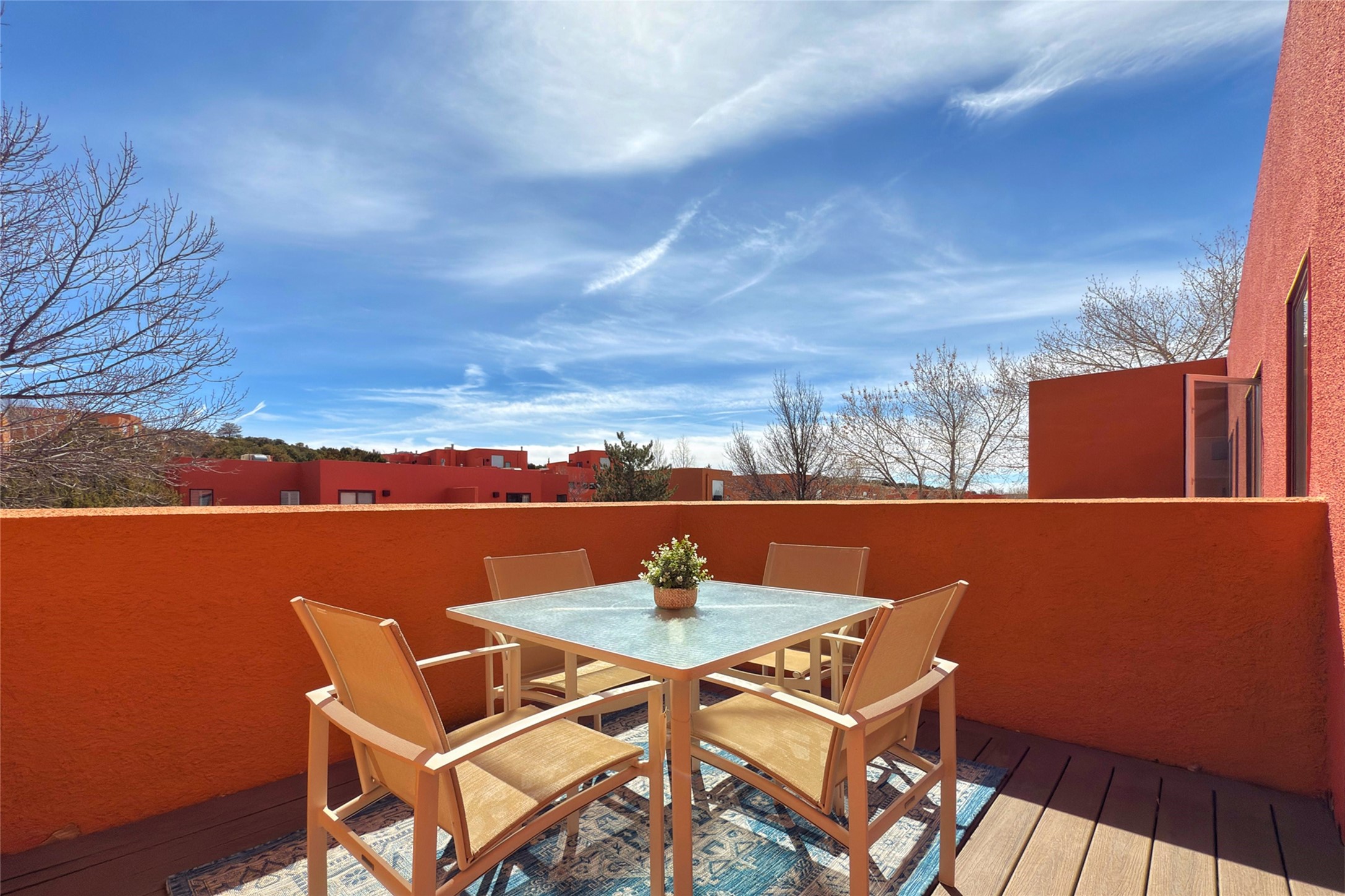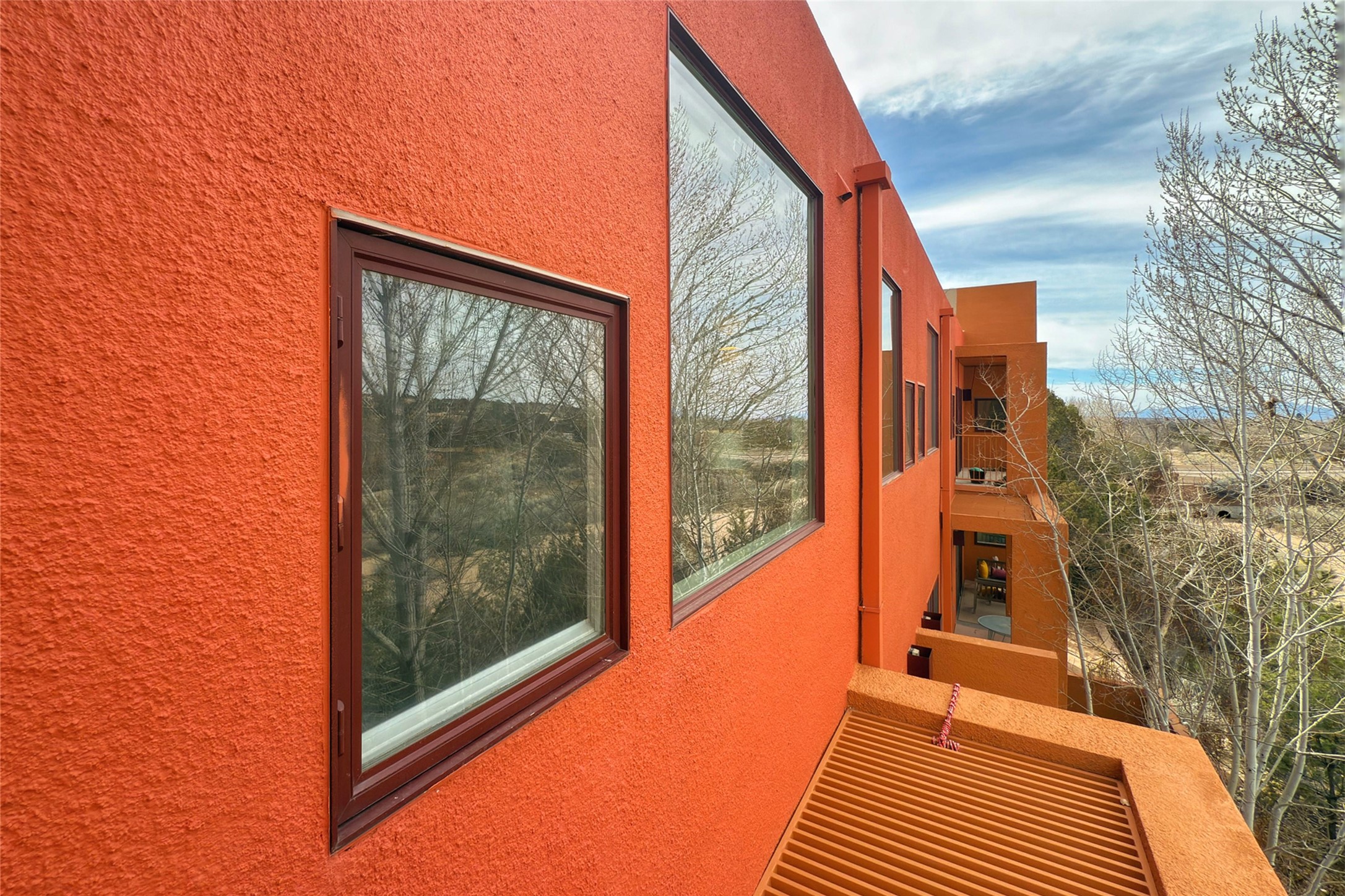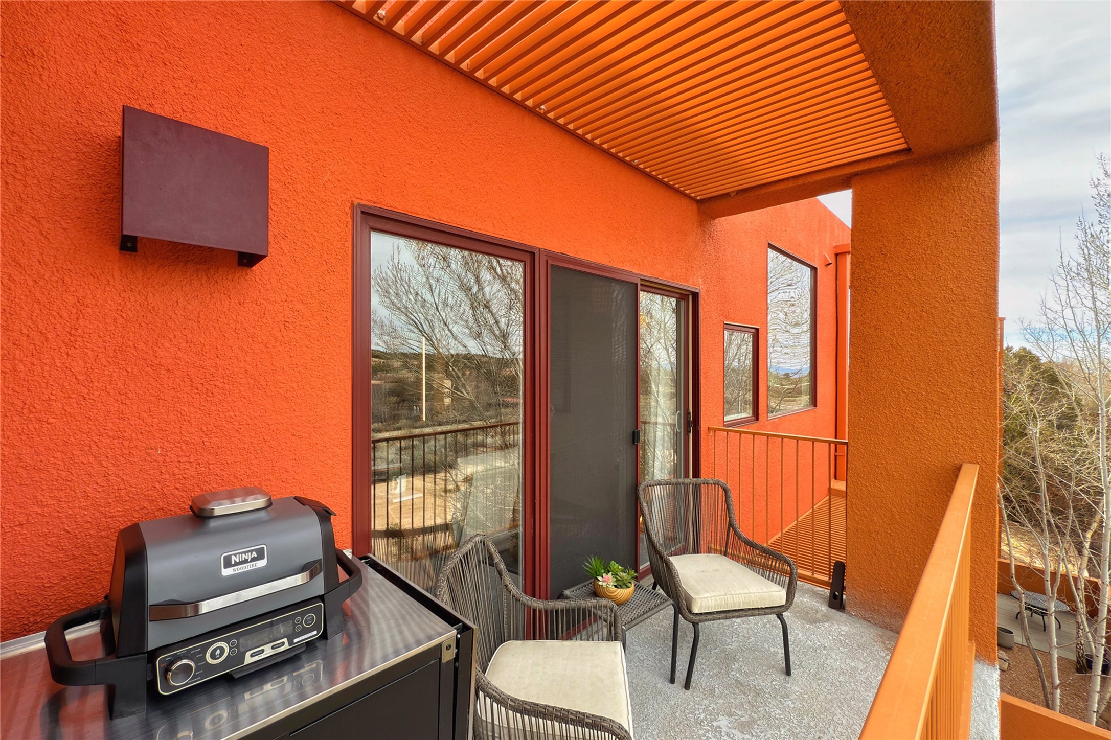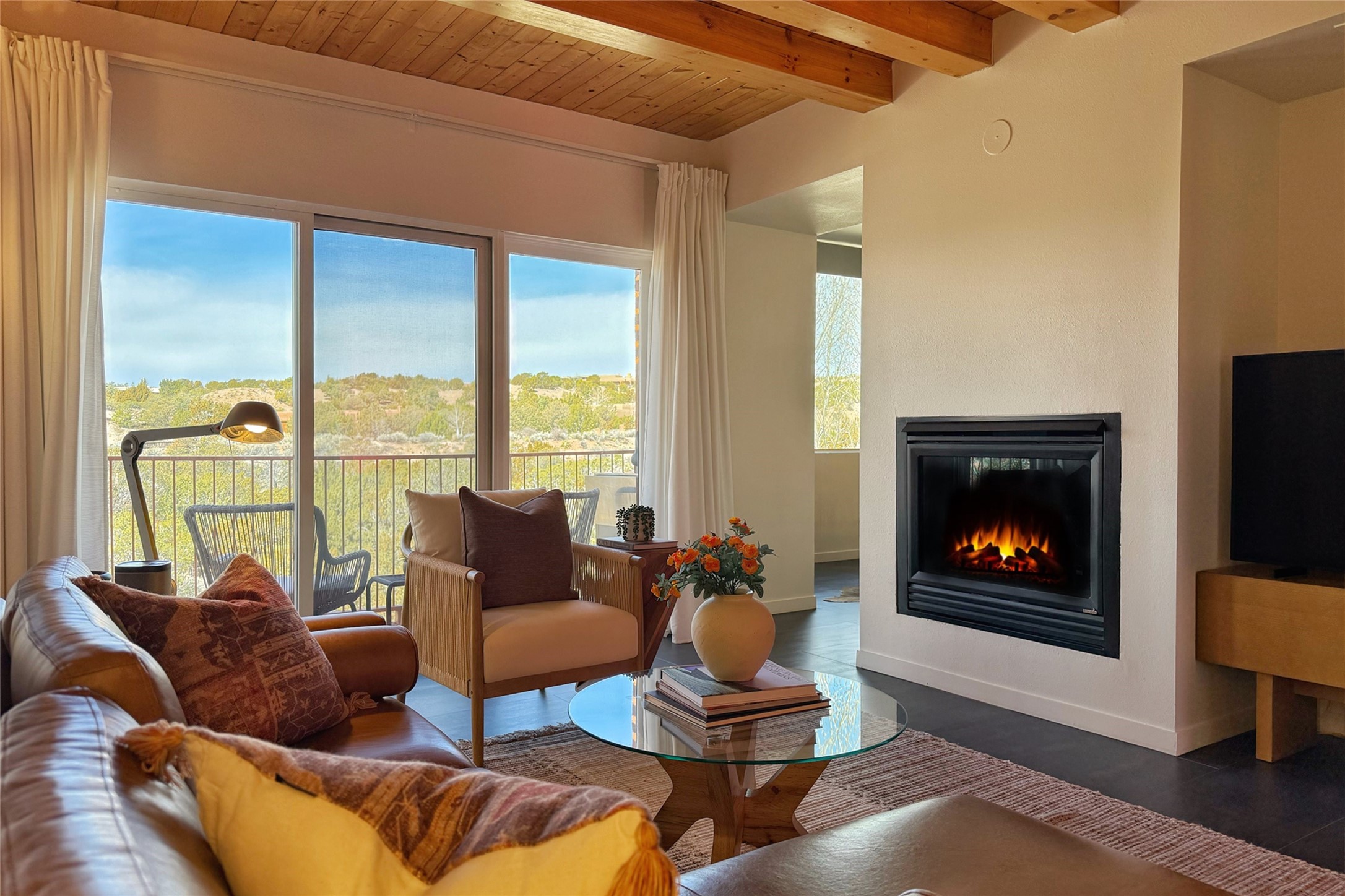 The nicest unit in Zocalo, spectacular views, superior patios, tastefully updated contemporary three bedroom, two bath condominium in Zocalo designed by award-winning architect Ricardo Legorreta. Light-filled, second-level home offers massive western views overlooking the natural arroyo and hillsides and eastern views that include Atalaya peak in the distance. New, giant picture windows do indeed make pictures of the surrounding classic Santa Fe colored landscape and skies so close you can almost touch! Updates include new insulated windows, remote controlled shades, new flooring and paint throughout, new stainless steel appliances and washer and dryer, updated kitchen with chef's appliances and bathrooms with solid surface counters, programmable lighting, Legrand switch and outlet covers, on-demand tankless hot water heater, new deck and refinished balcony. Community amenities include two fitness facilities, pool, hot tub, and clubhouse. Newly completed trail for walking and biking connects to the city trail system. Large garage with EV charger. Close to town yet far from the hustle and bustle, quiet and serene yet vibrant and alive! Check out the video and take the virtual tour!