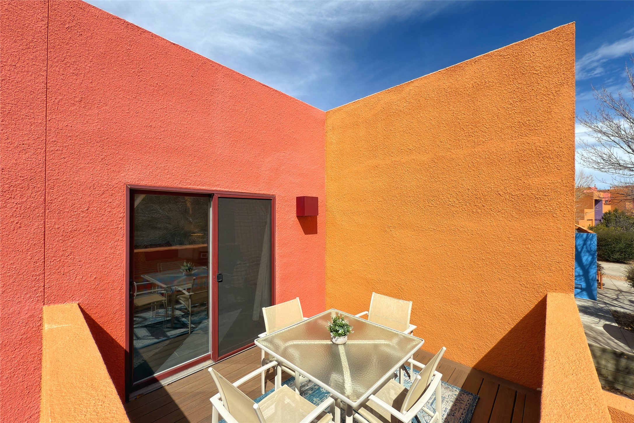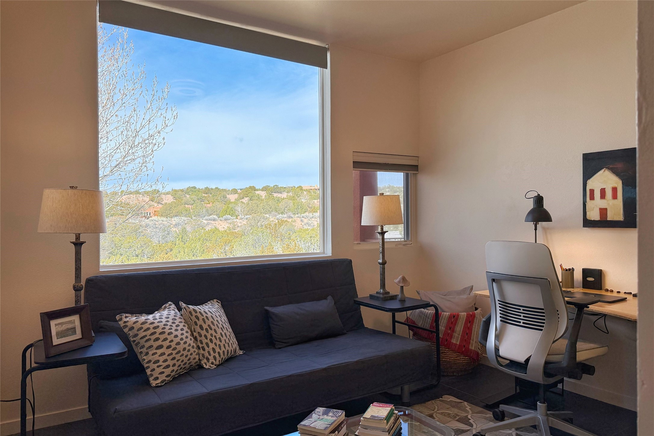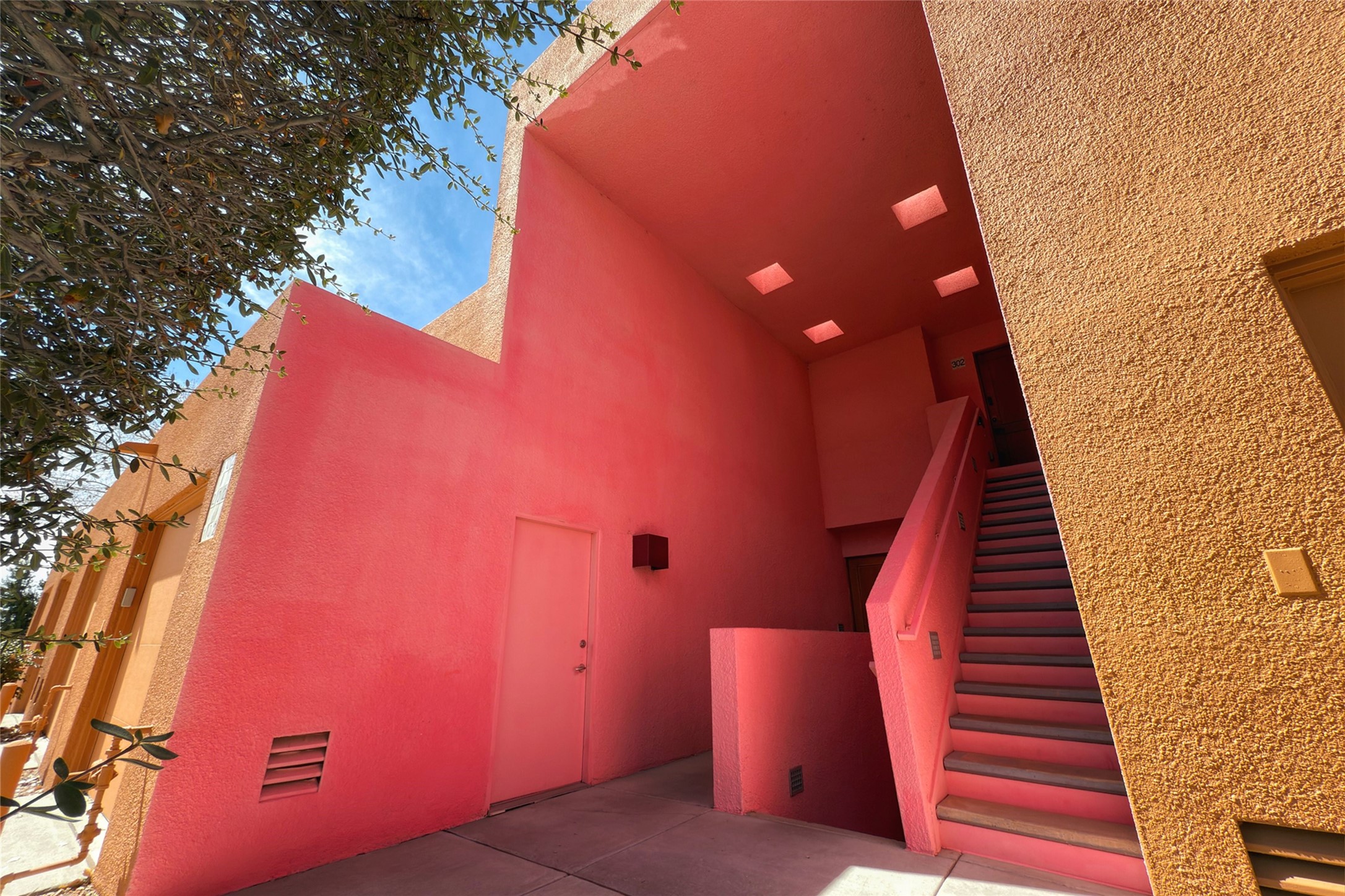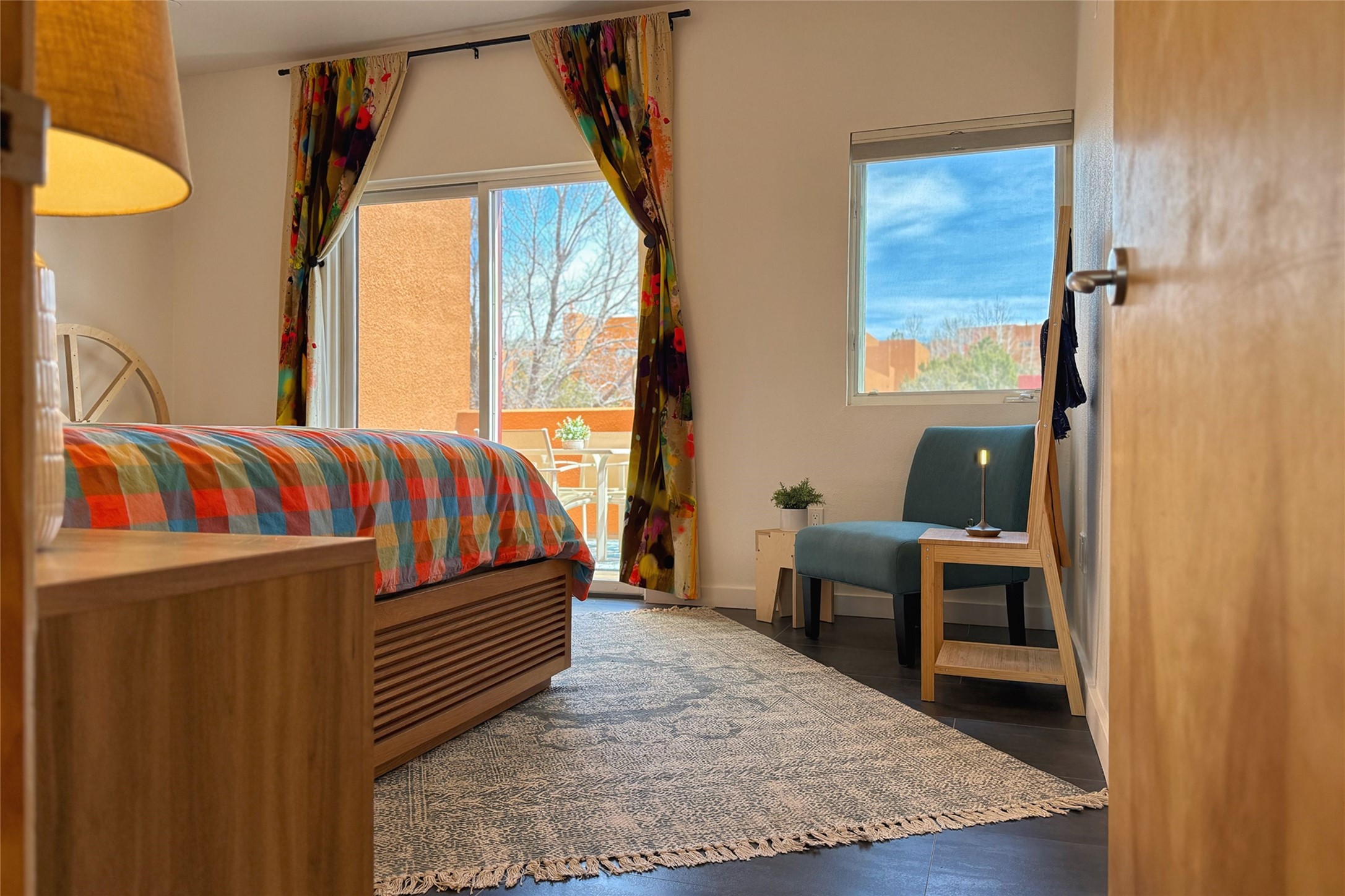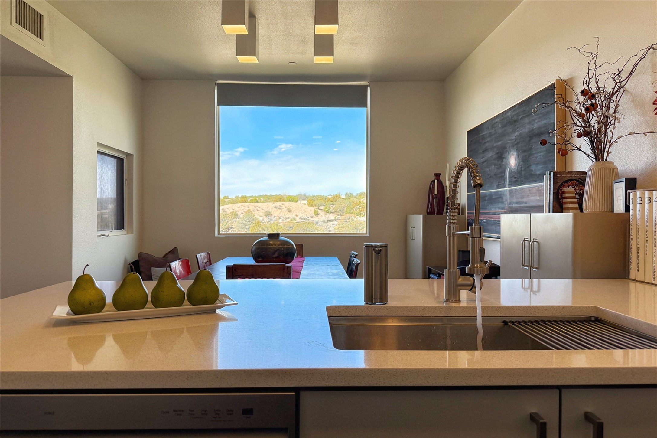 The nicest unit in Zocalo, spectacular views, superior patios, tastefully updated contemporary three bedroom, two bath condominium in Zocalo designed by award-winning architect Ricardo Legorreta. Light-filled, second-level home offers massive western views overlooking the natural arroyo and hillsides and eastern views that include Atalaya peak in the distance. New, giant picture windows do indeed make pictures of the surrounding classic Santa Fe colored landscape and skies so close you can almost touch! Updates include new insulated windows, remote controlled shades, new flooring and paint throughout, new stainless steel appliances and washer and dryer, updated kitchen with chef's appliances and bathrooms with solid surface counters, programmable lighting, Legrand switch and outlet covers, on-demand tankless hot water heater, new deck and refinished balcony. Community amenities include two fitness facilities, pool, hot tub, and clubhouse. Newly completed trail for walking and biking connects to the city trail system. Large garage with EV charger. Close to town yet far from the hustle and bustle, quiet and serene yet vibrant and alive! Check out the video and take the virtual tour!