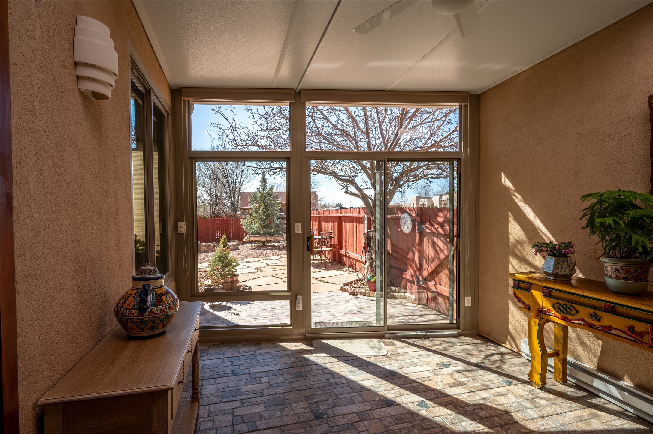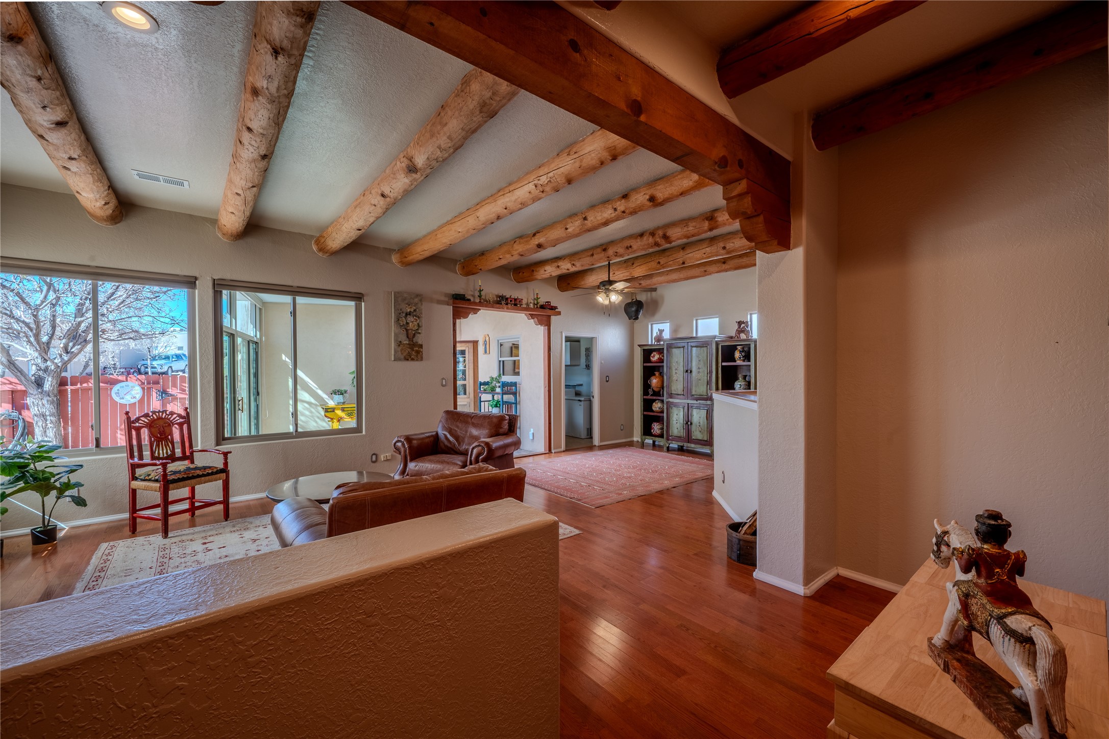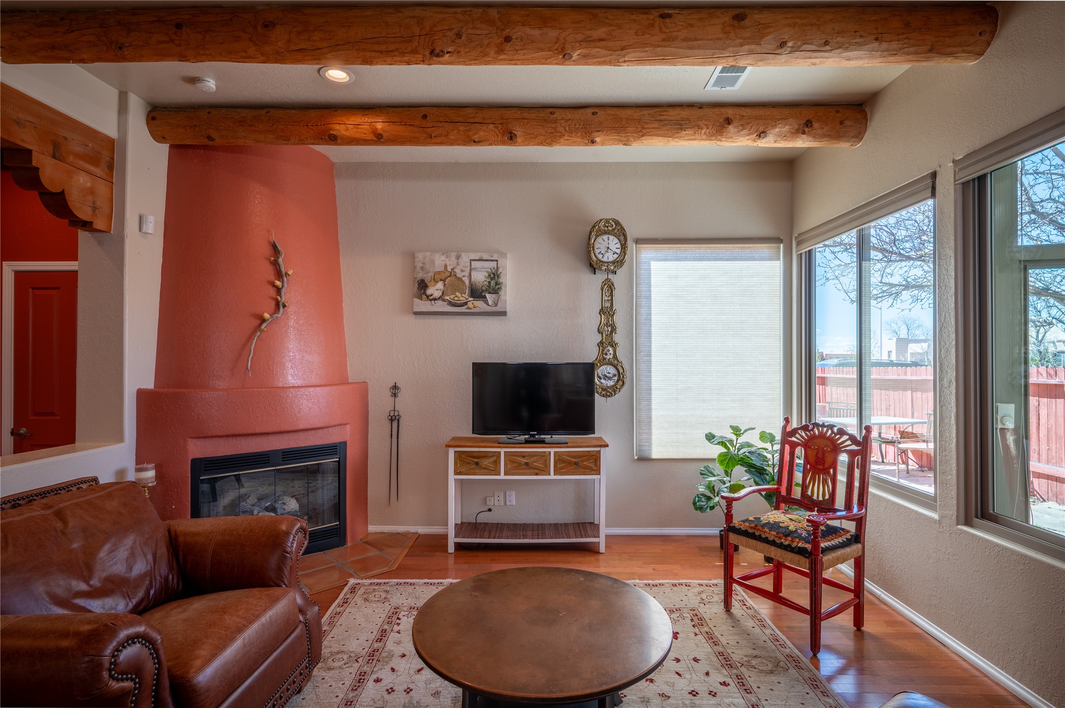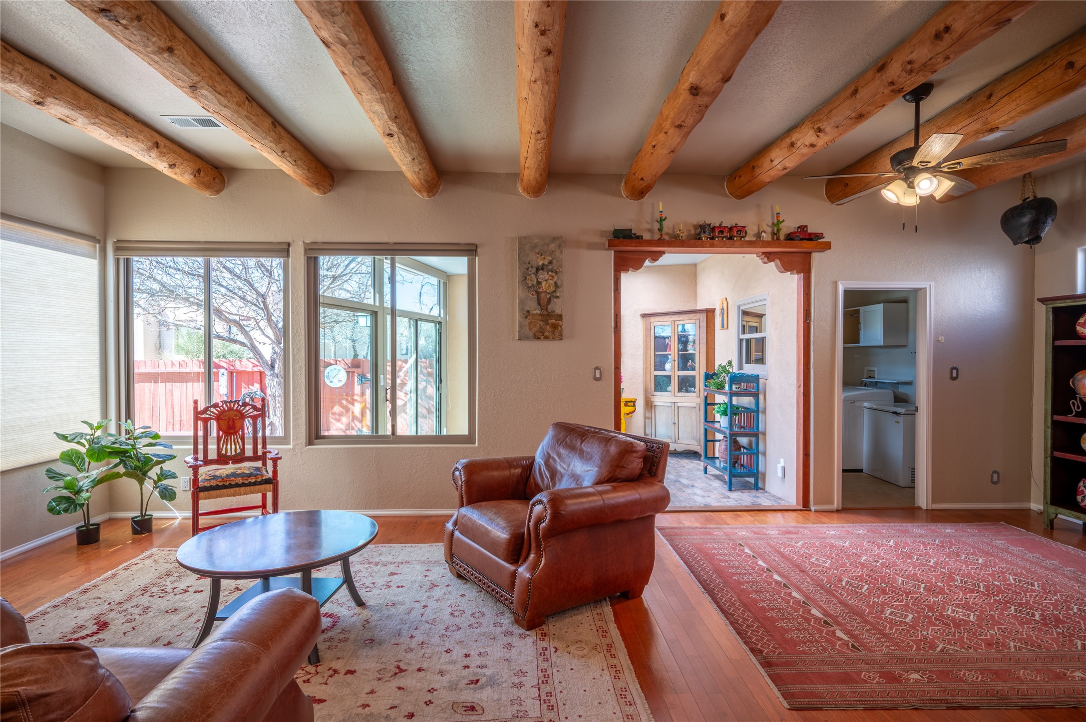 Extrordinary single level home with beautiful custom finishes which includes an open concept floor plan, an enclosed and heated sunroom, large corner windows in the livingroom adding warmth and light with a view of a beautiful and spacious back yard, vigas, a kiva fireplace, custom colors and frontage on two streets for easy back or front entry. Also active solar conveys with the home. Maximum comfort and style in rare affordable home. Make an offer while you can. This will not be available long.