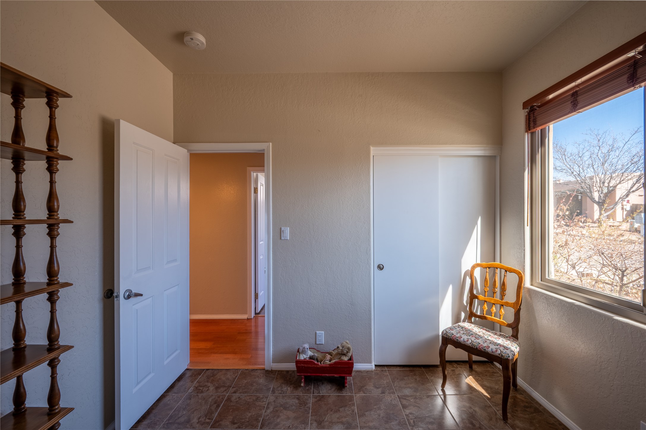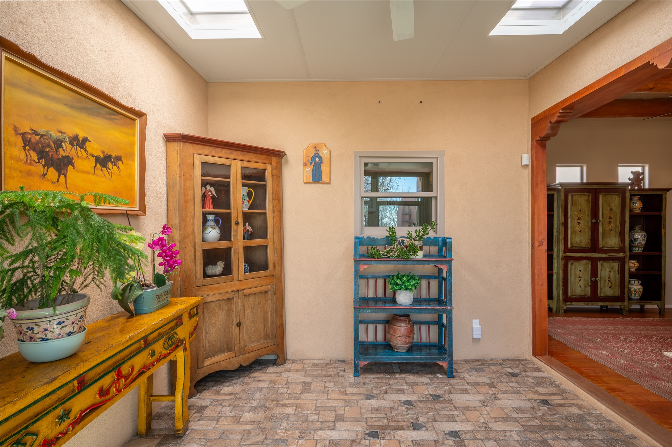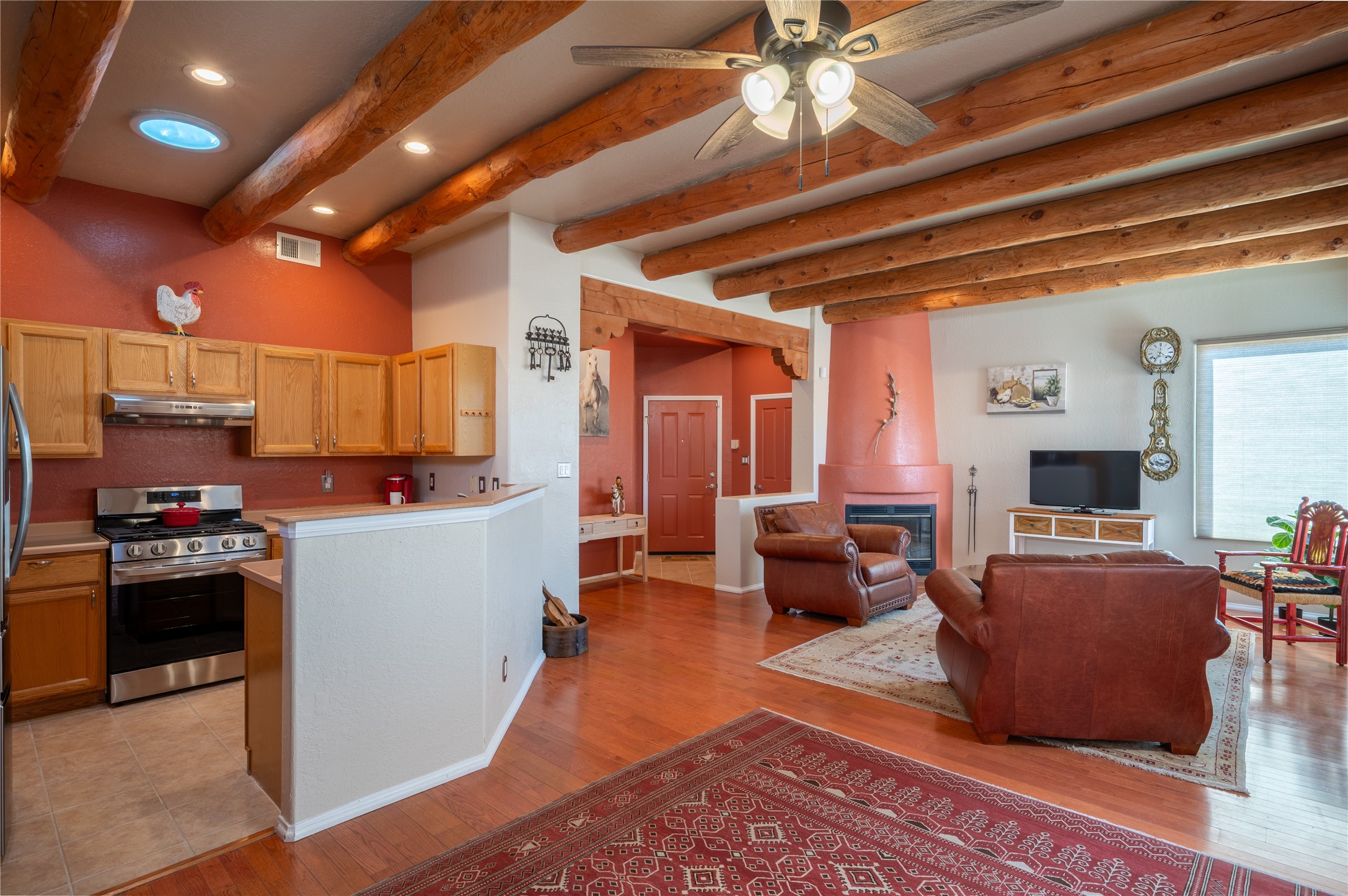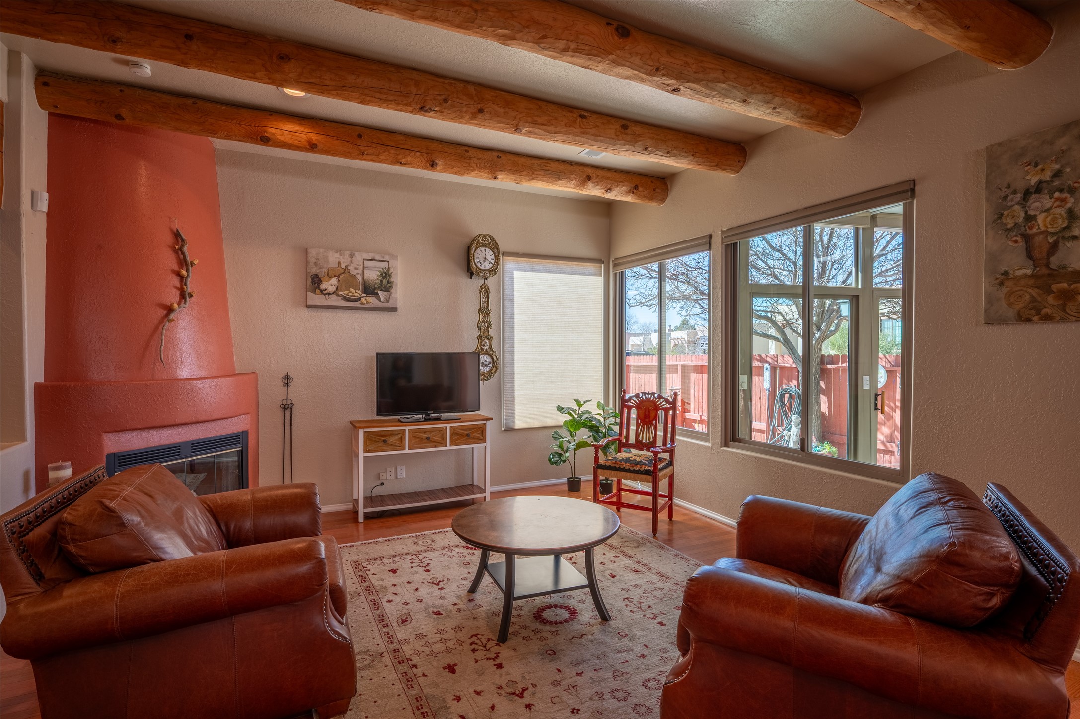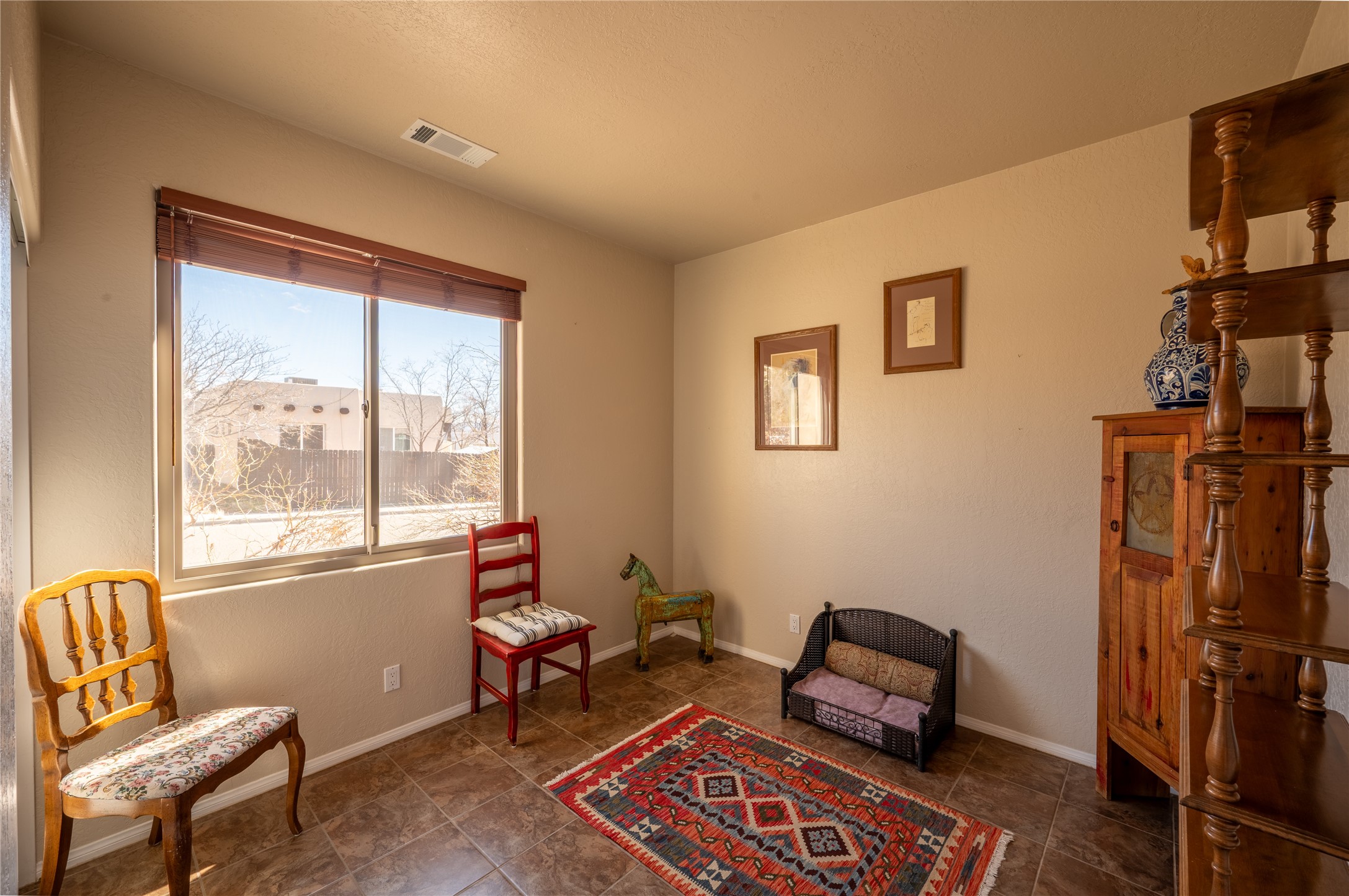Extrordinary single level home with beautiful custom finishes which includes an open concept floor plan, an enclosed and heated sunroom, large corner windows in the livingroom adding warmth and light with a view of a beautiful and spacious back yard, vigas, a kiva fireplace, custom colors and frontage on two streets for easy back or front entry. Also active solar conveys with the home. Maximum comfort and style in rare affordable home. Make an offer while you can. This will not be available long.