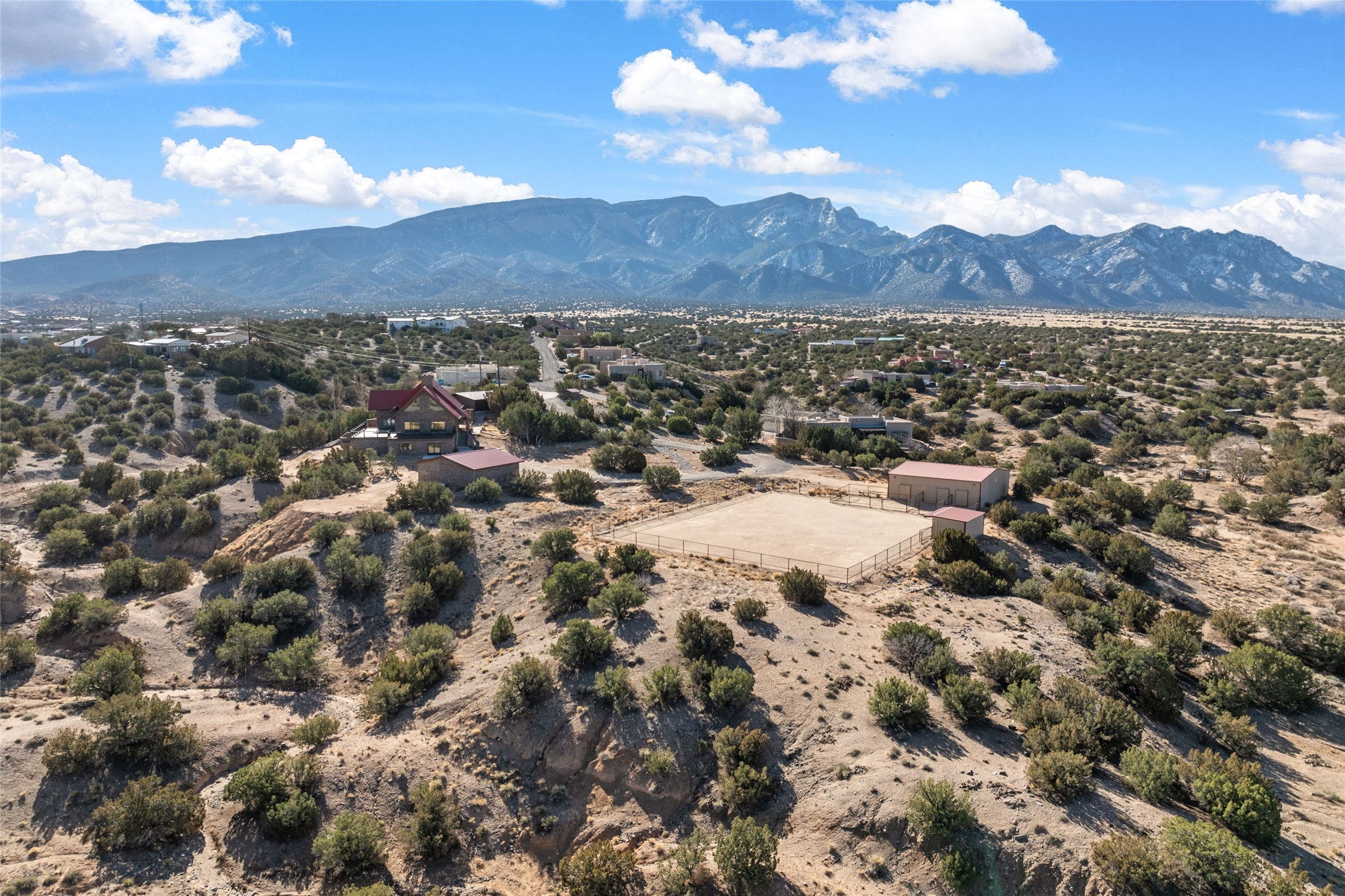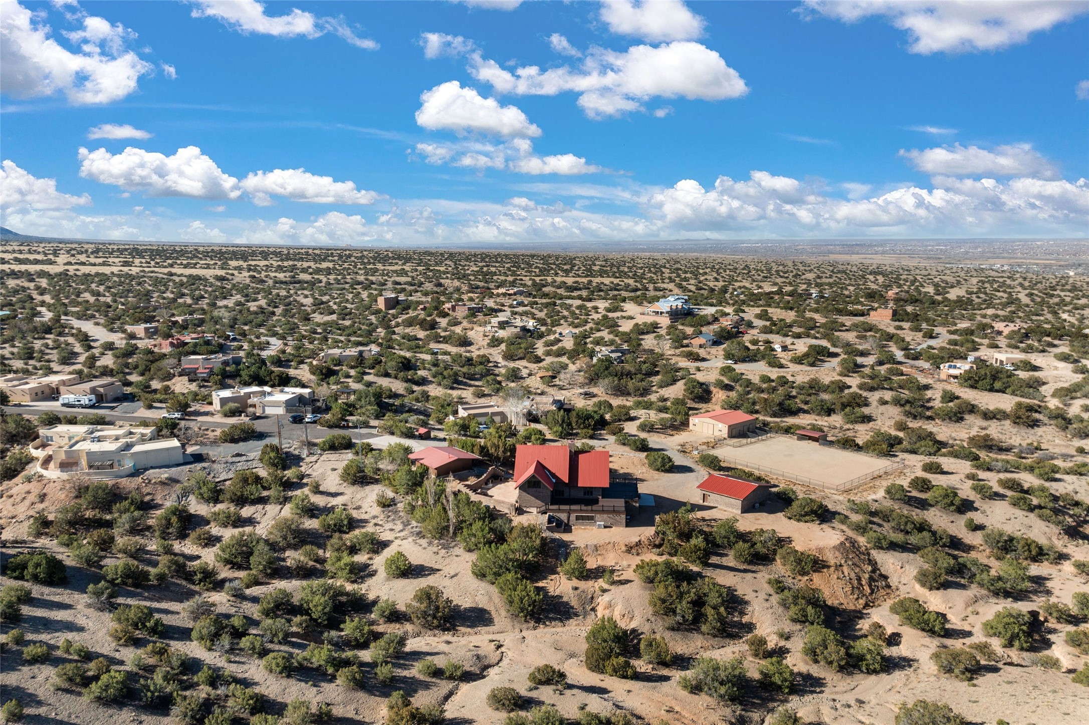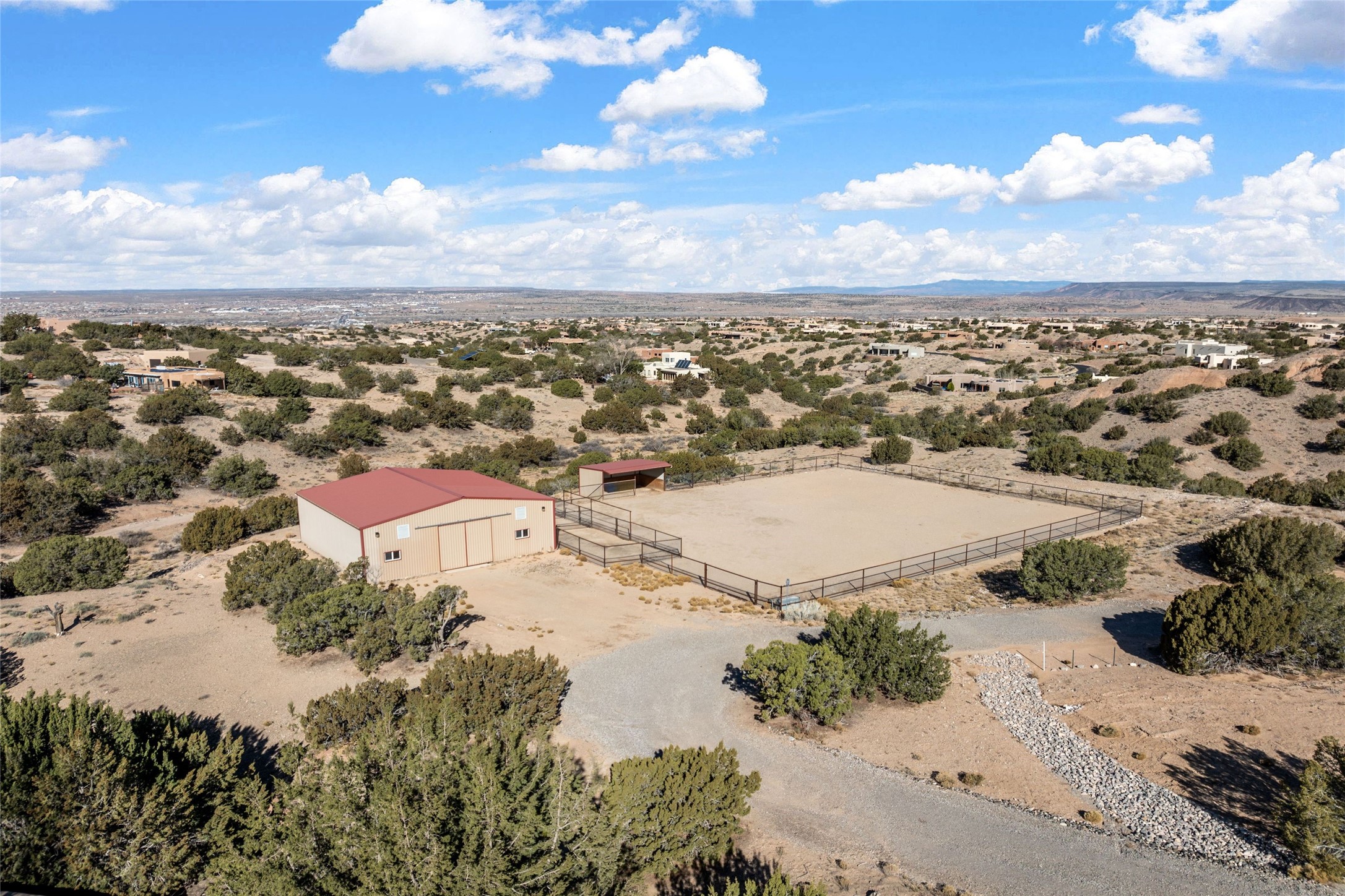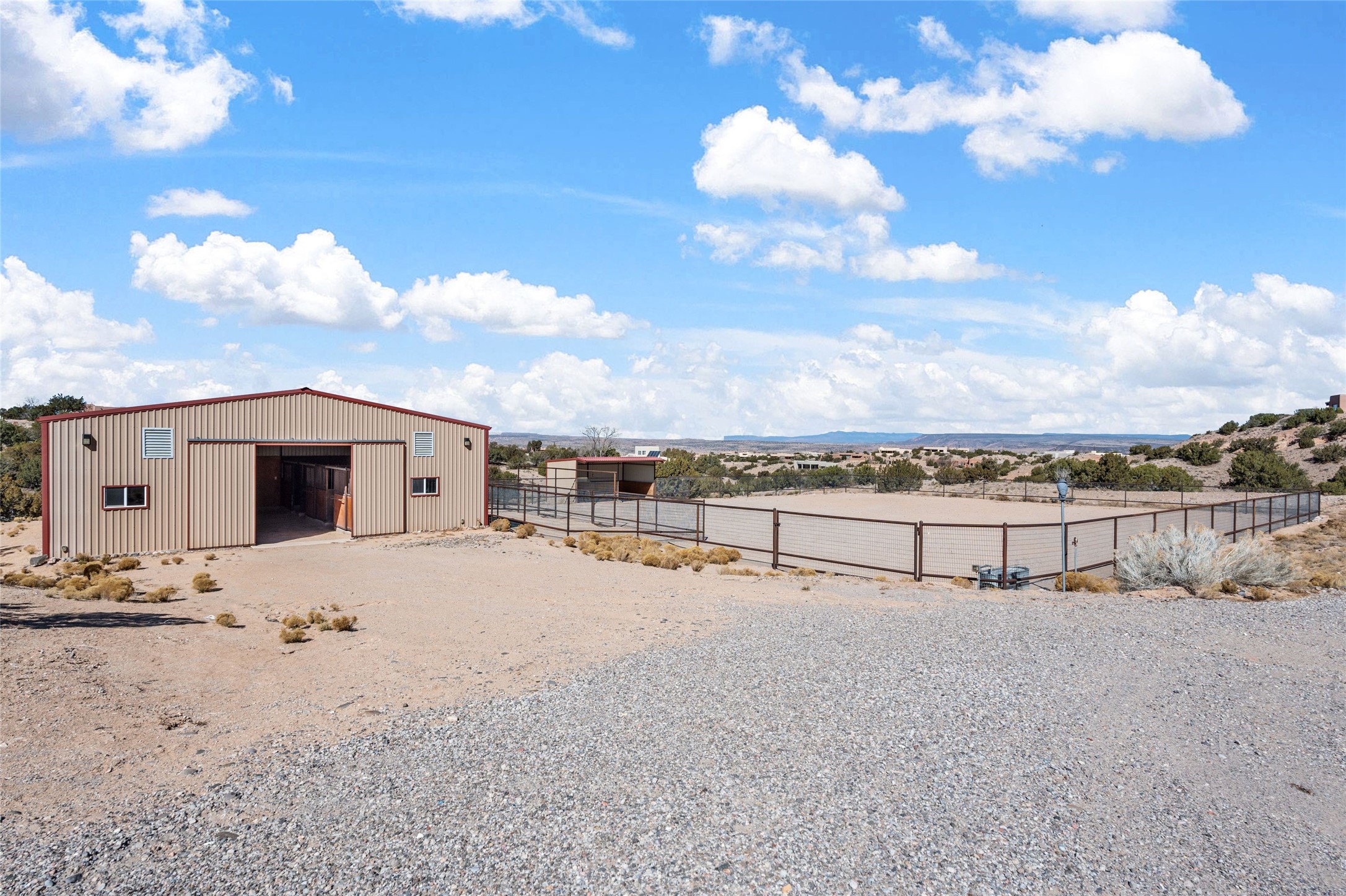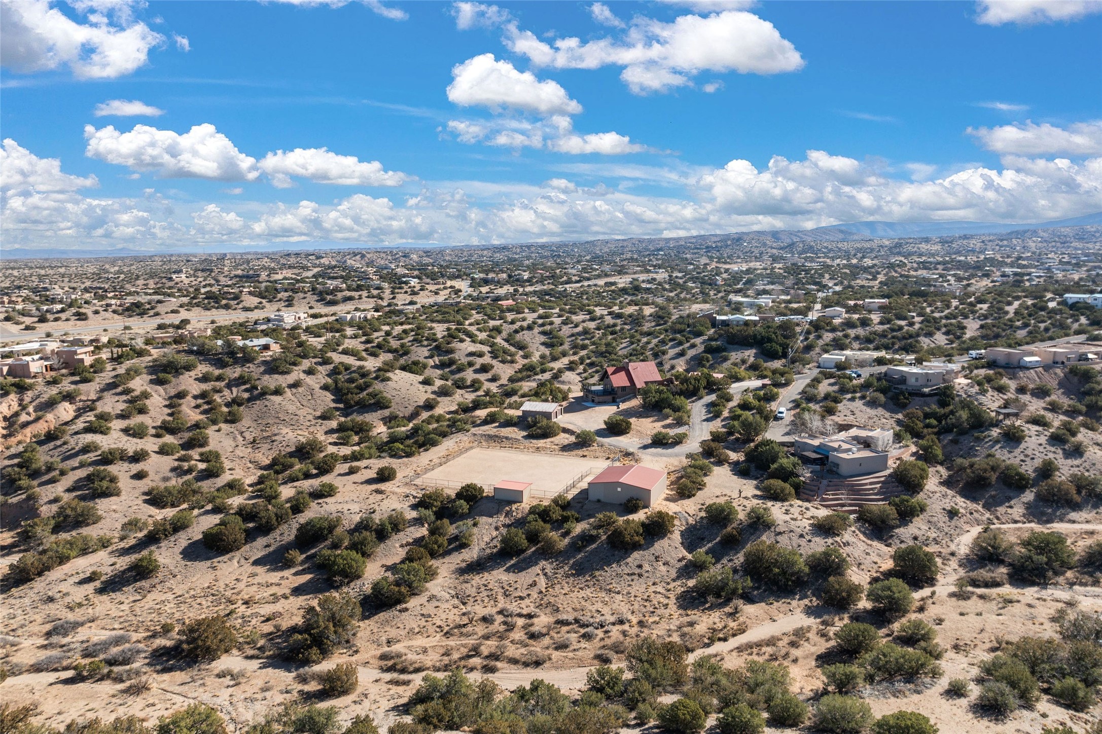 Fabulous family compound and horse property! 4.98 acres of space, views, and a lifestyle that invites multi family living, excellent horse facilities, two separate garages, one with heat/cool, room for lift, other with heat/cool plus bathroom. Must see this well maintained Northern NM brick beauty. Main house 3952 sf plus the 1 BR connected guest house is 1304 sf., total heated is 5256 sf. Main level of home features a living room, formal dining, on suite BR, spacious kitchen, nook for informal dining, half bath, and over 1300sf of open trex deck! Upstairs features primary suite, 3rd BR, loft which is open to main level. Lower level offers family room, 4th BR or office, bath, laundry and a 1304 sf attached 1 BR guest house included in the 5256 sf w/full kitchen, living, plus a 18 X 22 BR w/washer dryer hook ups, and separate entry also. Refrigerated Air, CFA, HWB, mini splits. Well designed barn 4 stall barn, center isle, hay storage, tack, steel lined, runs off 3 stalls, opens to an arena w/shelter. Easy access to National Forest trails.