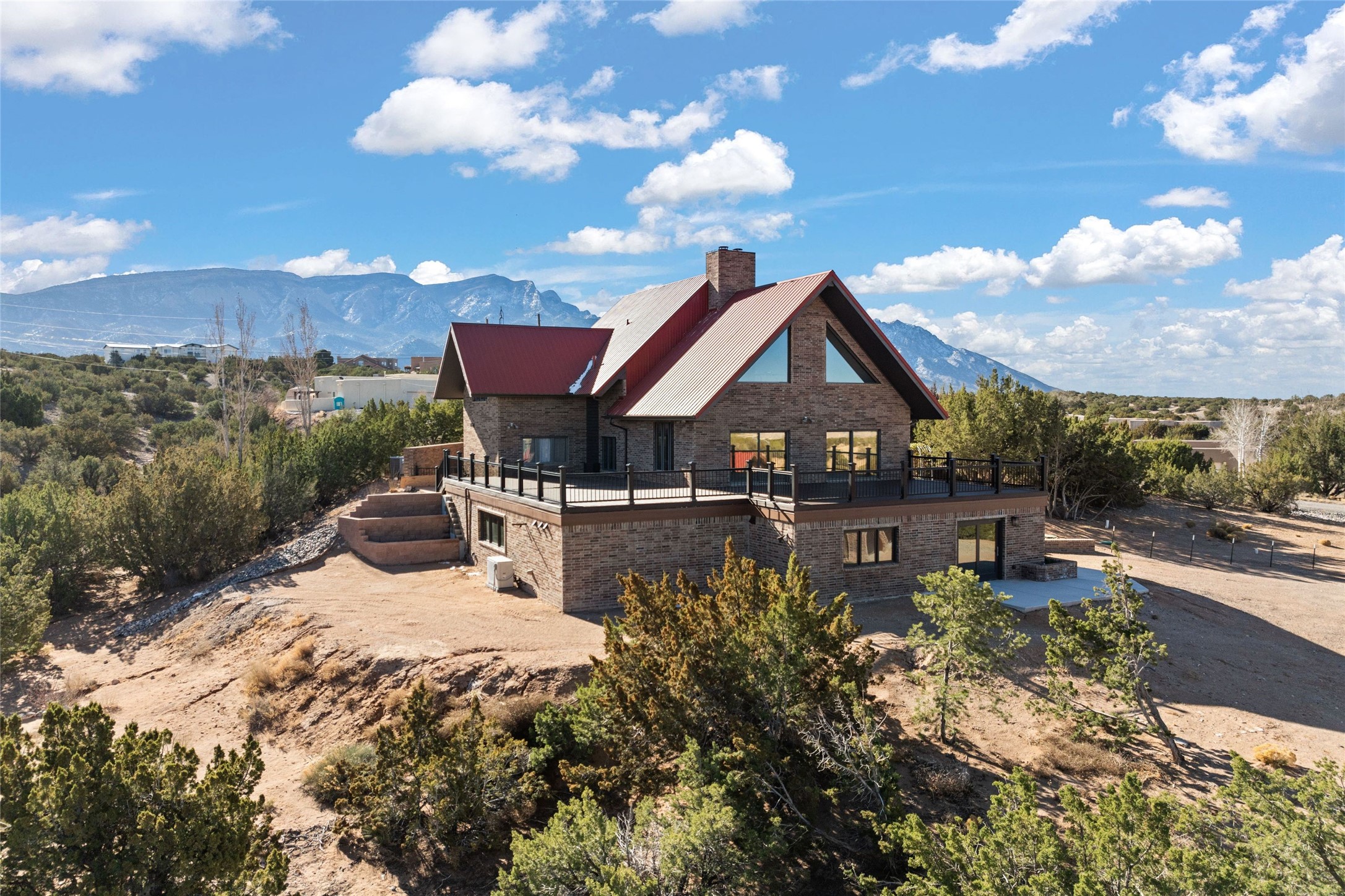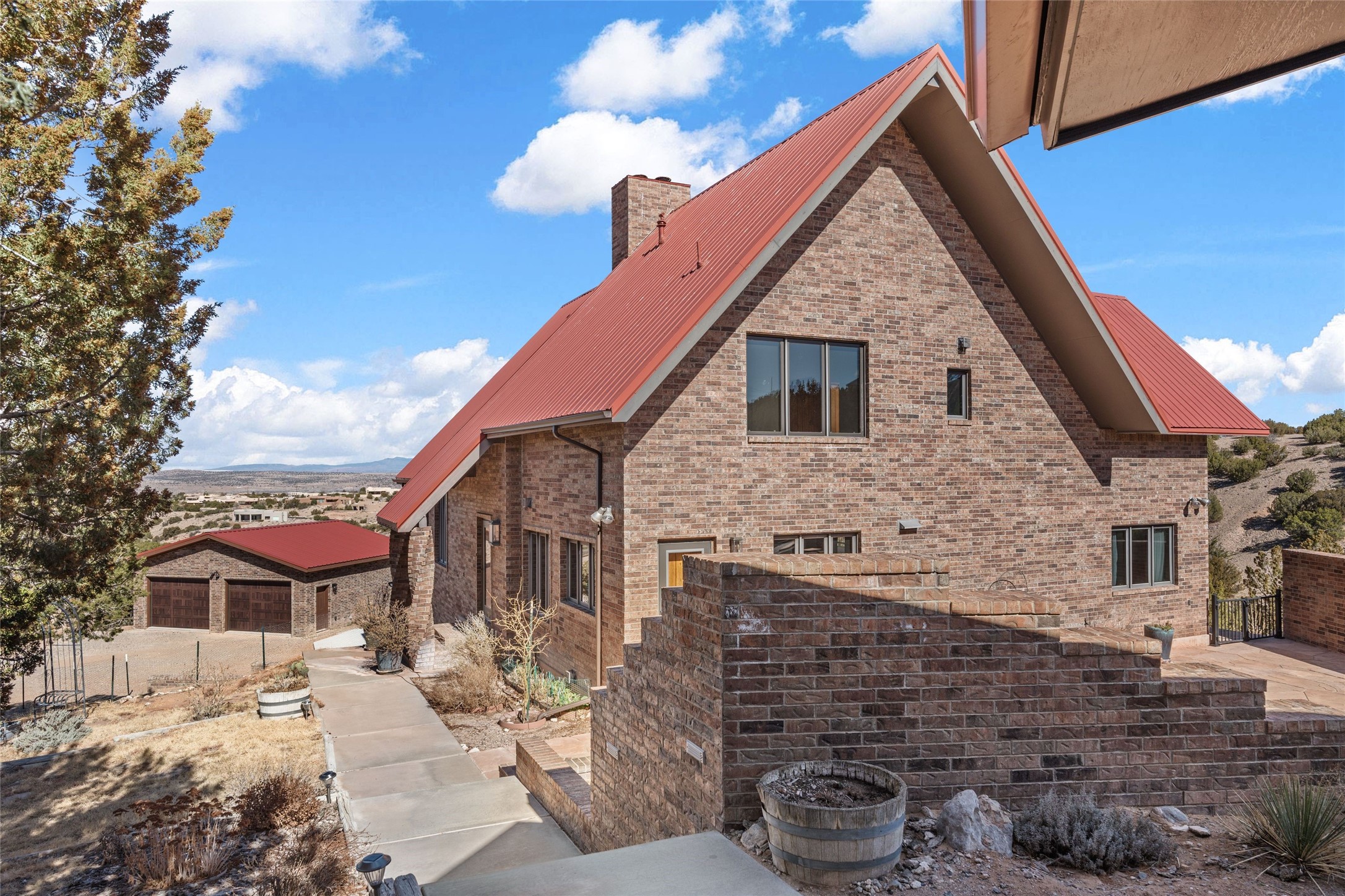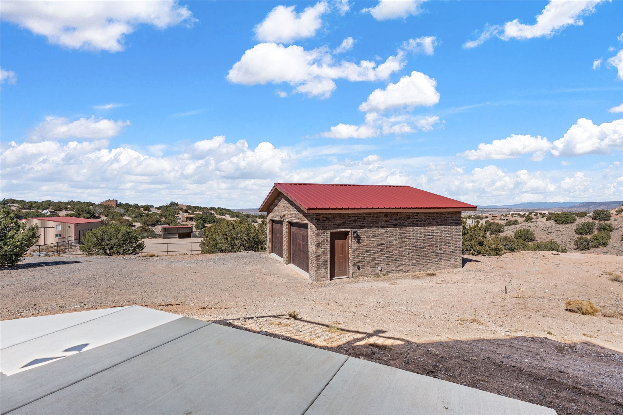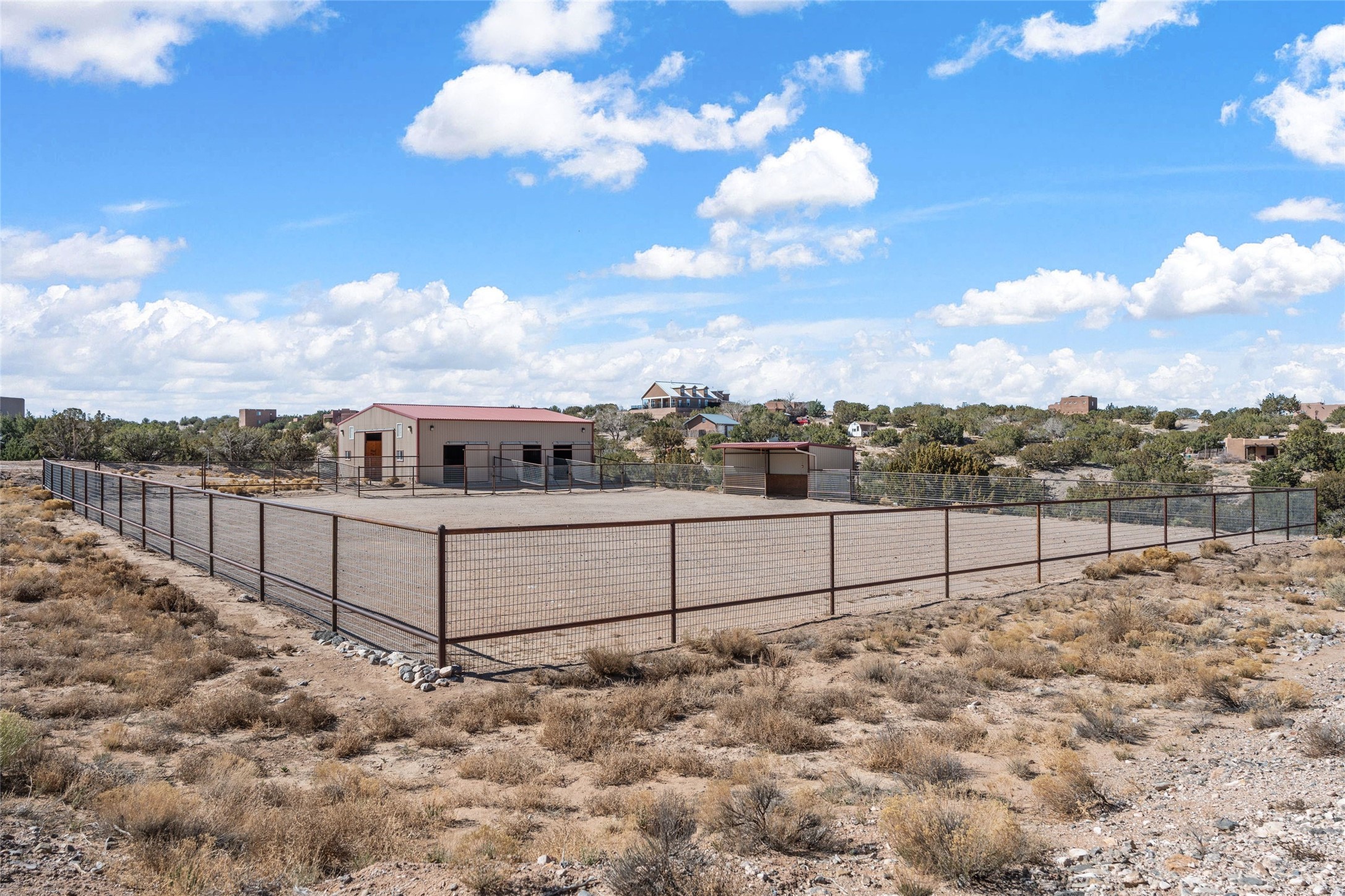 Fabulous family compound and horse property! 4.98 acres of space, views, and a lifestyle that invites multi family living, excellent horse facilities, two separate garages, one with heat/cool, room for lift, other with heat/cool plus bathroom. Must see this well maintained Northern NM brick beauty. Main house 3952 sf plus the 1 BR connected guest house is 1304 sf., total heated is 5256 sf. Main level of home features a living room, formal dining, on suite BR, spacious kitchen, nook for informal dining, half bath, and over 1300sf of open trex deck! Upstairs features primary suite, 3rd BR, loft which is open to main level. Lower level offers family room, 4th BR or office, bath, laundry and a 1304 sf attached 1 BR guest house included in the 5256 sf w/full kitchen, living, plus a 18 X 22 BR w/washer dryer hook ups, and separate entry also. Refrigerated Air, CFA, HWB, mini splits. Well designed barn 4 stall barn, center isle, hay storage, tack, steel lined, runs off 3 stalls, opens to an arena w/shelter. Easy access to National Forest trails.
