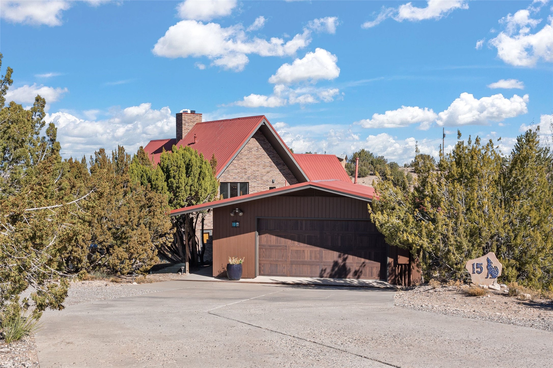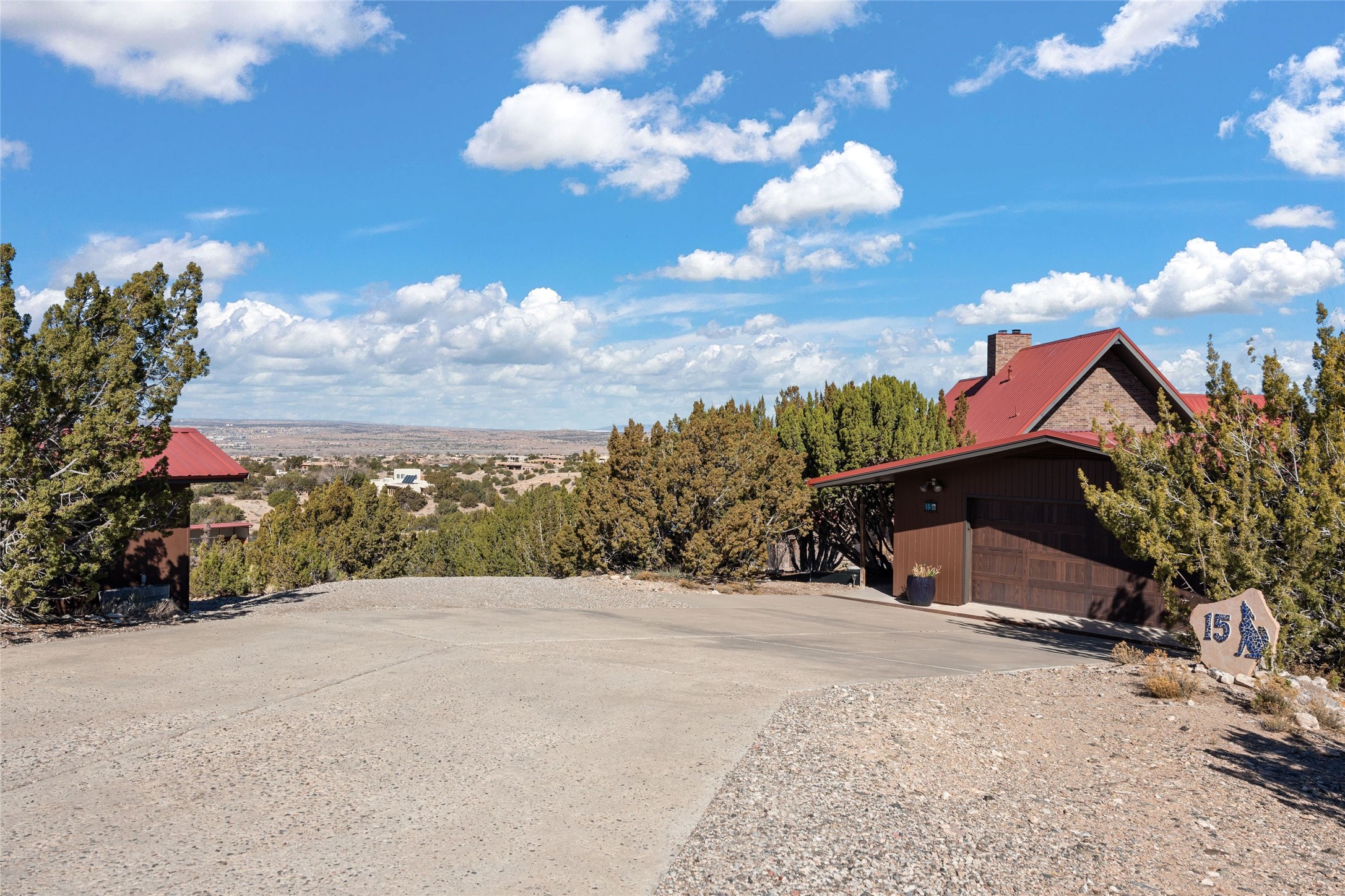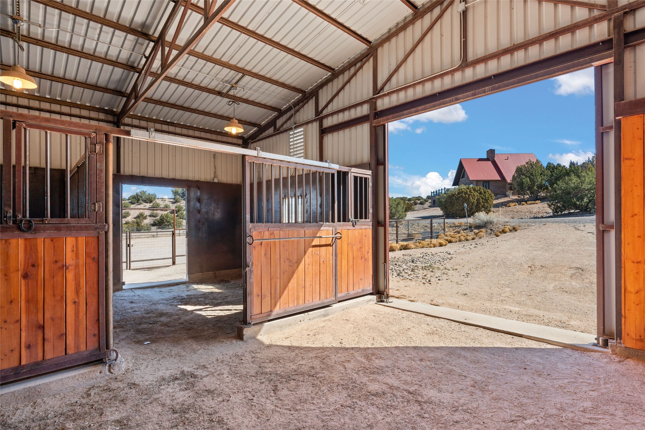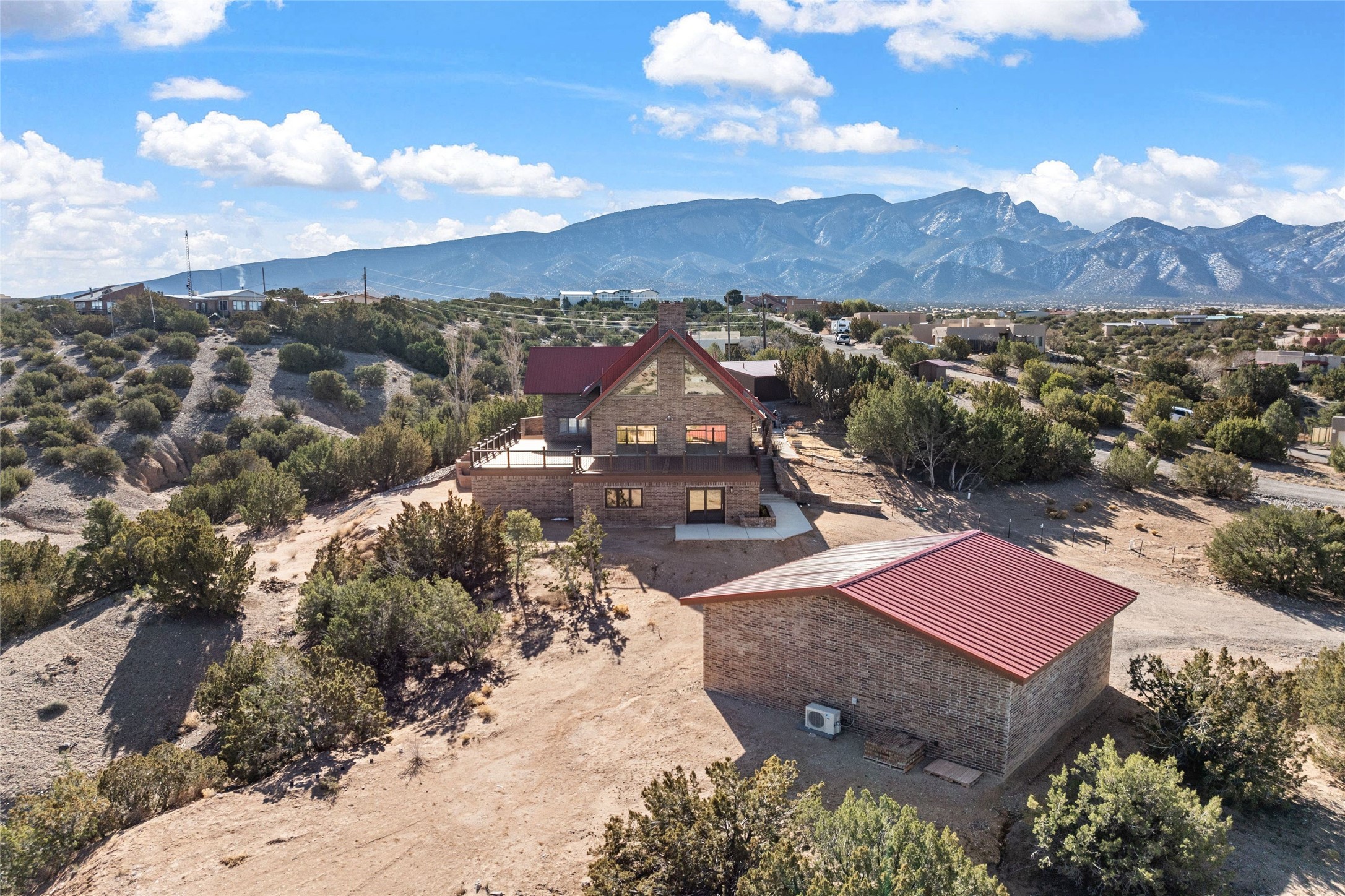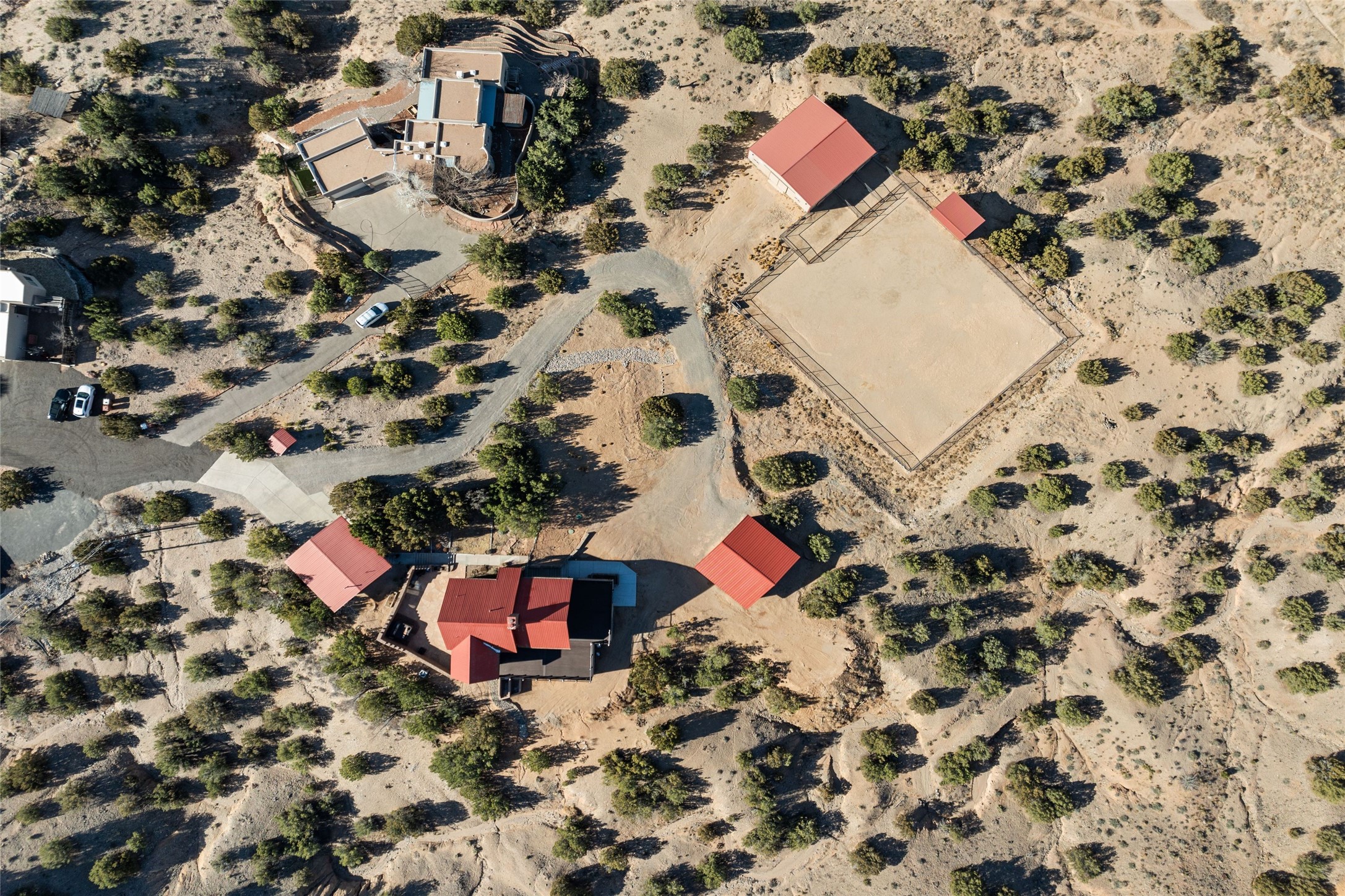 Fabulous family compound and horse property! 4.98 acres of space, views, and a lifestyle that invites multi family living, excellent horse facilities, two separate garages, one with heat/cool, room for lift, other with heat/cool plus bathroom. Must see this well maintained Northern NM brick beauty. Main house 3952 sf plus the 1 BR connected guest house is 1304 sf., total heated is 5256 sf. Main level of home features a living room, formal dining, on suite BR, spacious kitchen, nook for informal dining, half bath, and over 1300sf of open trex deck! Upstairs features primary suite, 3rd BR, loft which is open to main level. Lower level offers family room, 4th BR or office, bath, laundry and a 1304 sf attached 1 BR guest house included in the 5256 sf w/full kitchen, living, plus a 18 X 22 BR w/washer dryer hook ups, and separate entry also. Refrigerated Air, CFA, HWB, mini splits. Well designed barn 4 stall barn, center isle, hay storage, tack, steel lined, runs off 3 stalls, opens to an arena w/shelter. Easy access to National Forest trails.
