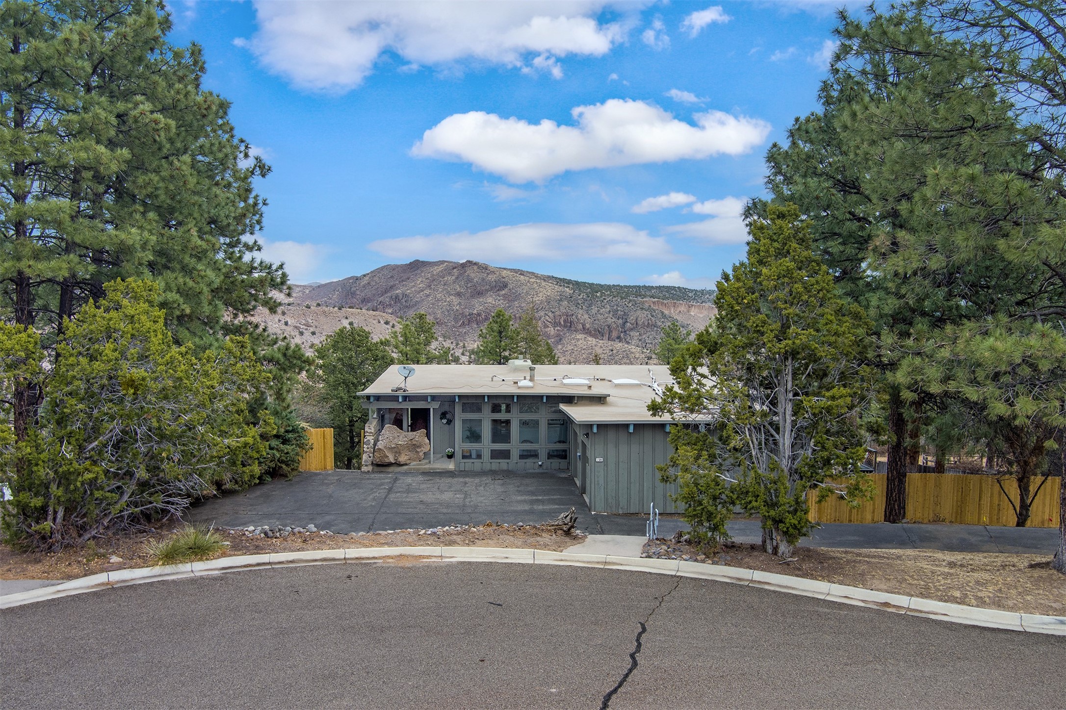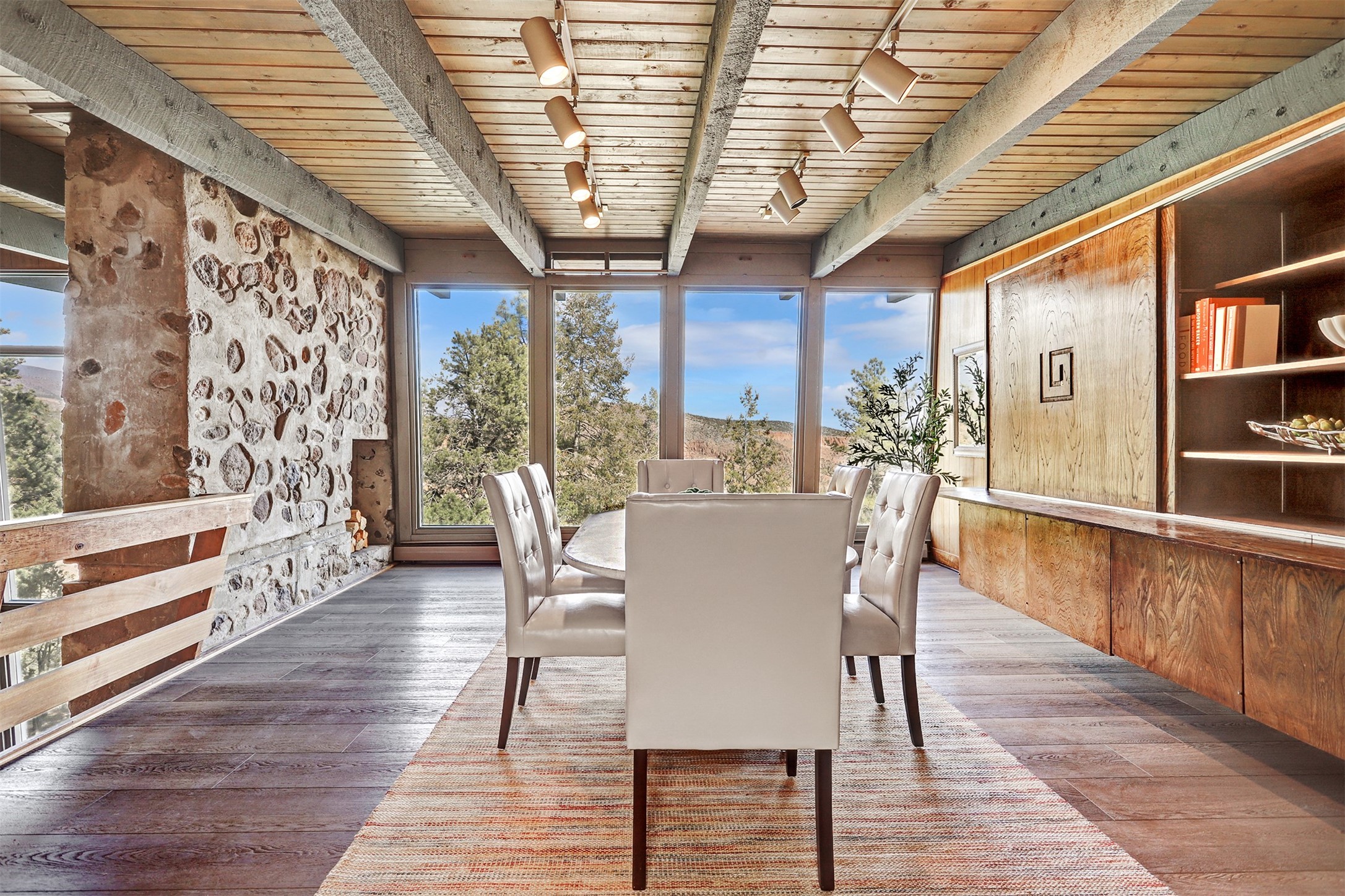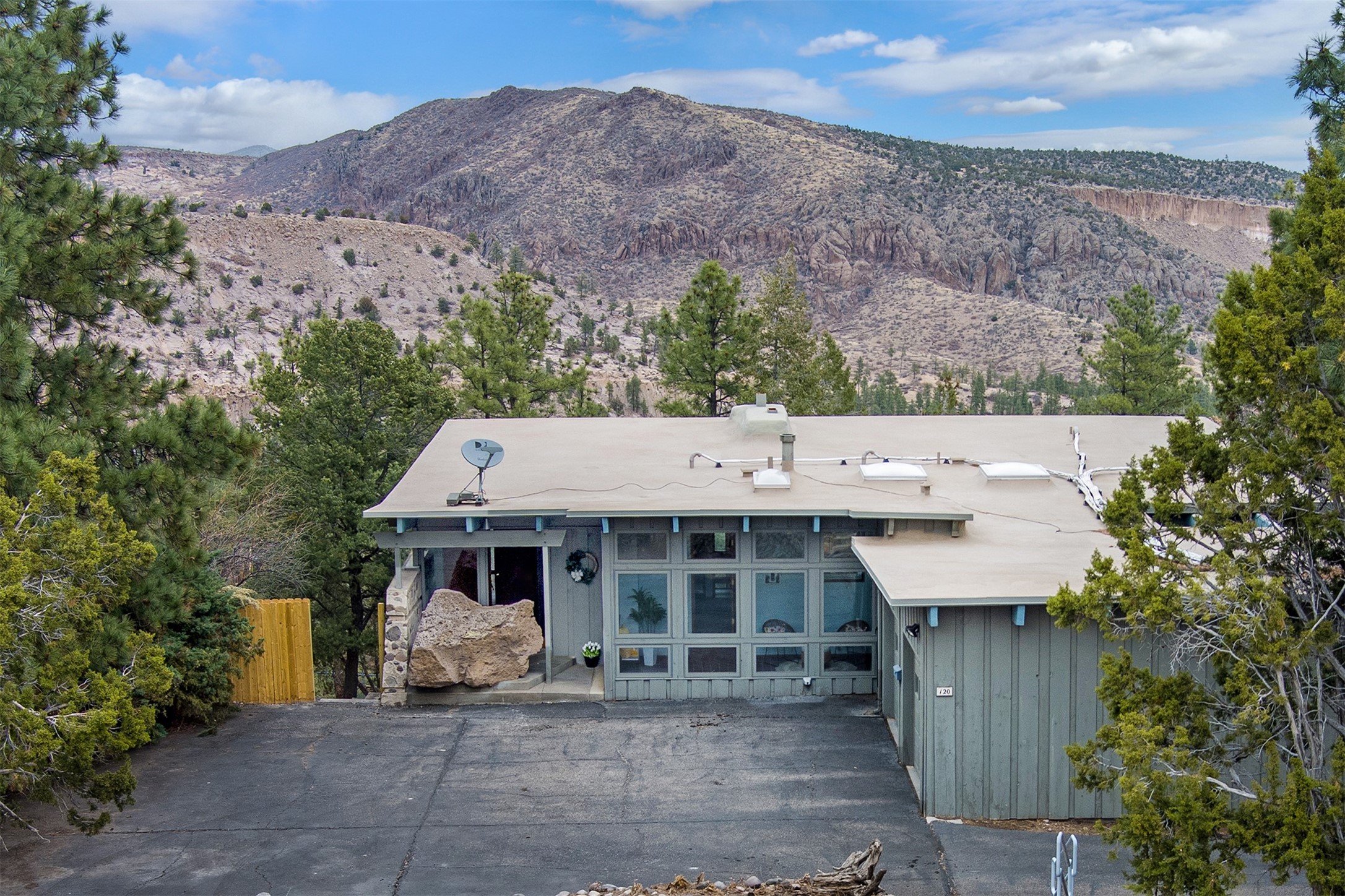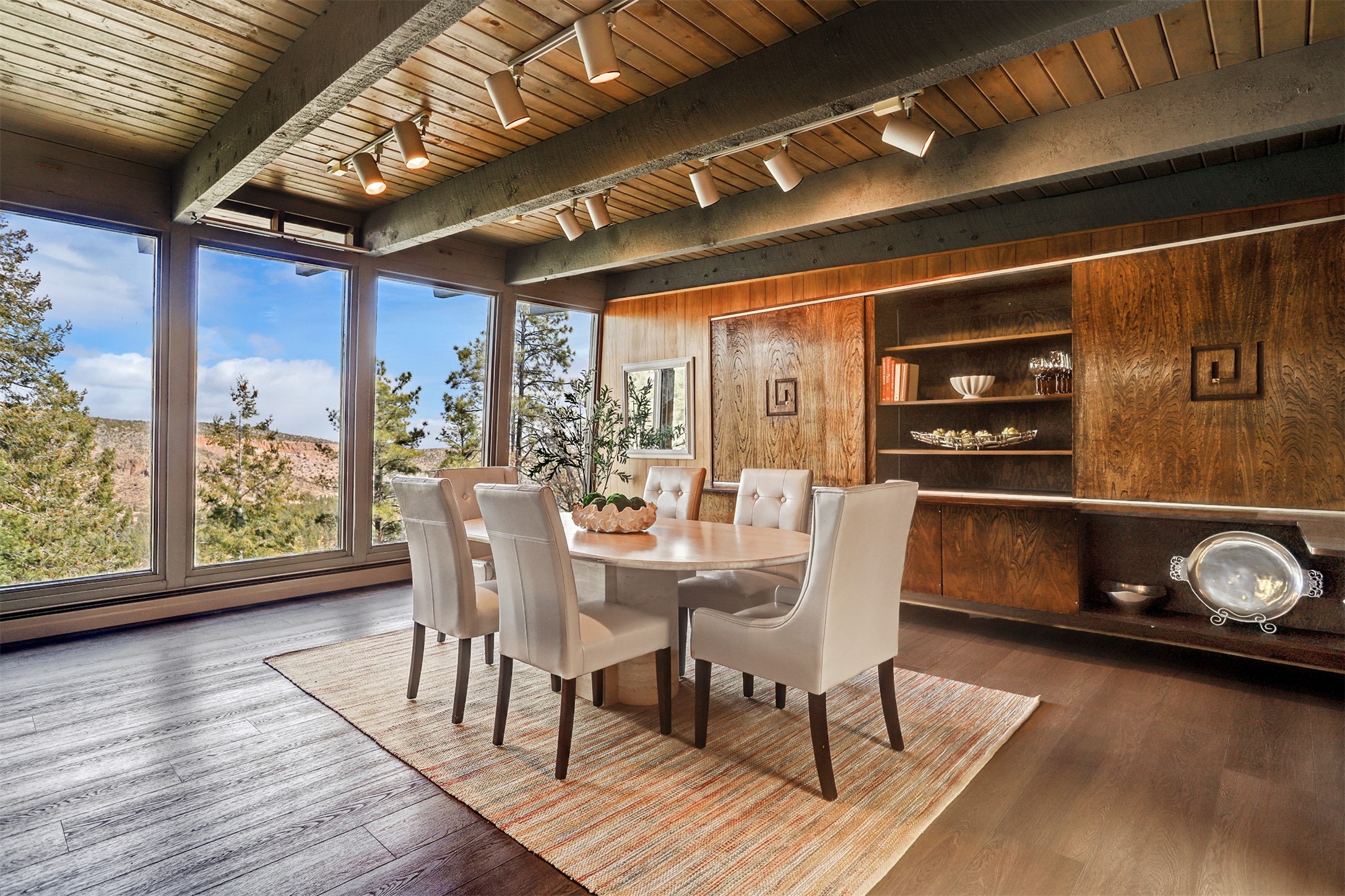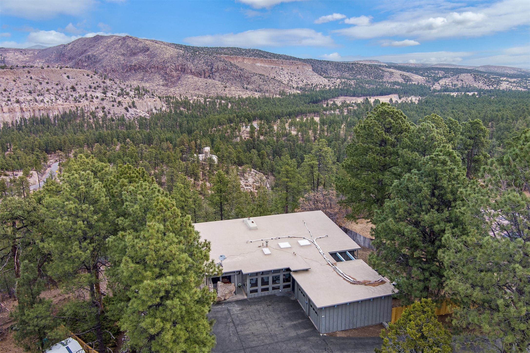 Perched on the picturesque Rendija Canyon, this stunning property with a biophilic architectural design seamlessly brings nature's qualities indoors. This remarkable property incorporates the New Mexico landscape by utilizing ponderosa, pion, and oak woods, as well as native rocks and minerals. Upon entry, you'll be met with views of the National Forest through massive two-story windows. Take the catwalk to the dining room, where the endless views continue. Your guests are sure to be awed by the organic splendor this area invokes. This level includes three guest rooms and a versatile flex room complete with a bathroom featuring fun swan fixtures. The kitchen offers convenient access to an outdoor patio and barbecue area as well as a laundry room and a two-car garage. Descend to the lower level to a spacious family room featuring Midcentury accents, such as the fireplace hood, floating hearth, and a Sputnik chandelier. This area includes a hot tub and wet bar with direct access to the back patio. The primary suite features a walk-in closet and an expansive bathroom adorned with a unique clamshell sink and koi-themed fixtures. Additionally, this level houses a large study with built-in bookshelves and a utility room providing ample storage. Stepping outside, you'll have a nice-sized, fenced yard before reaching the canyon and National Forest. This exceptional one-of-a-kind home combines modern amenities, striking design, and an immersive connection to nature. Don't miss your chance to experience this one-of-a-kind property. Schedule a showing today!