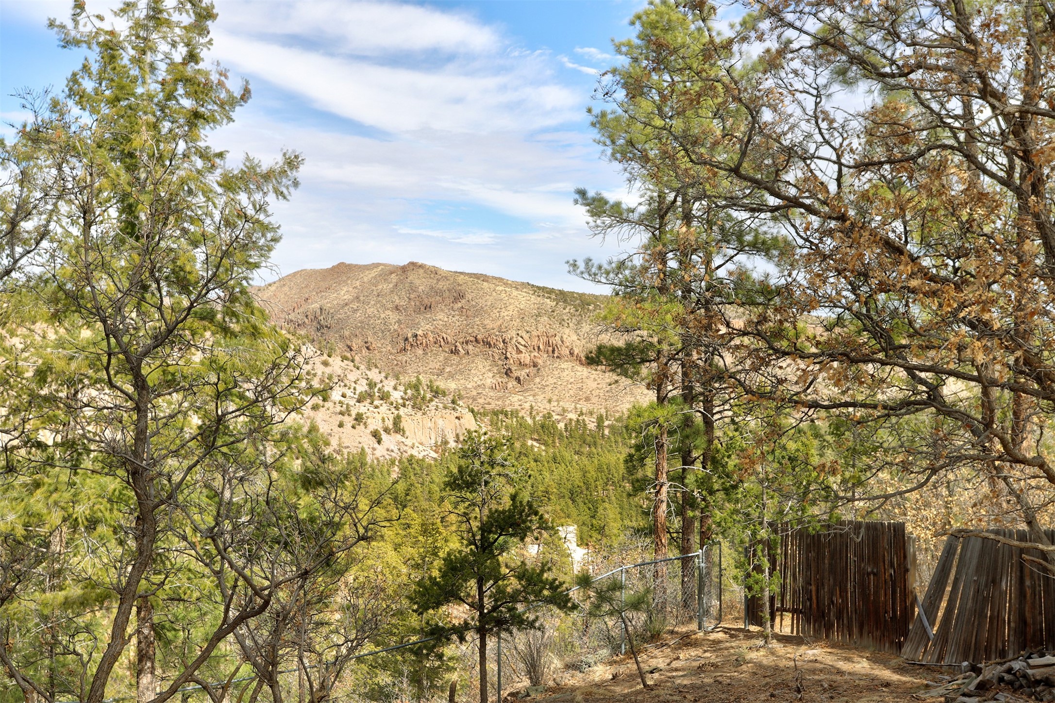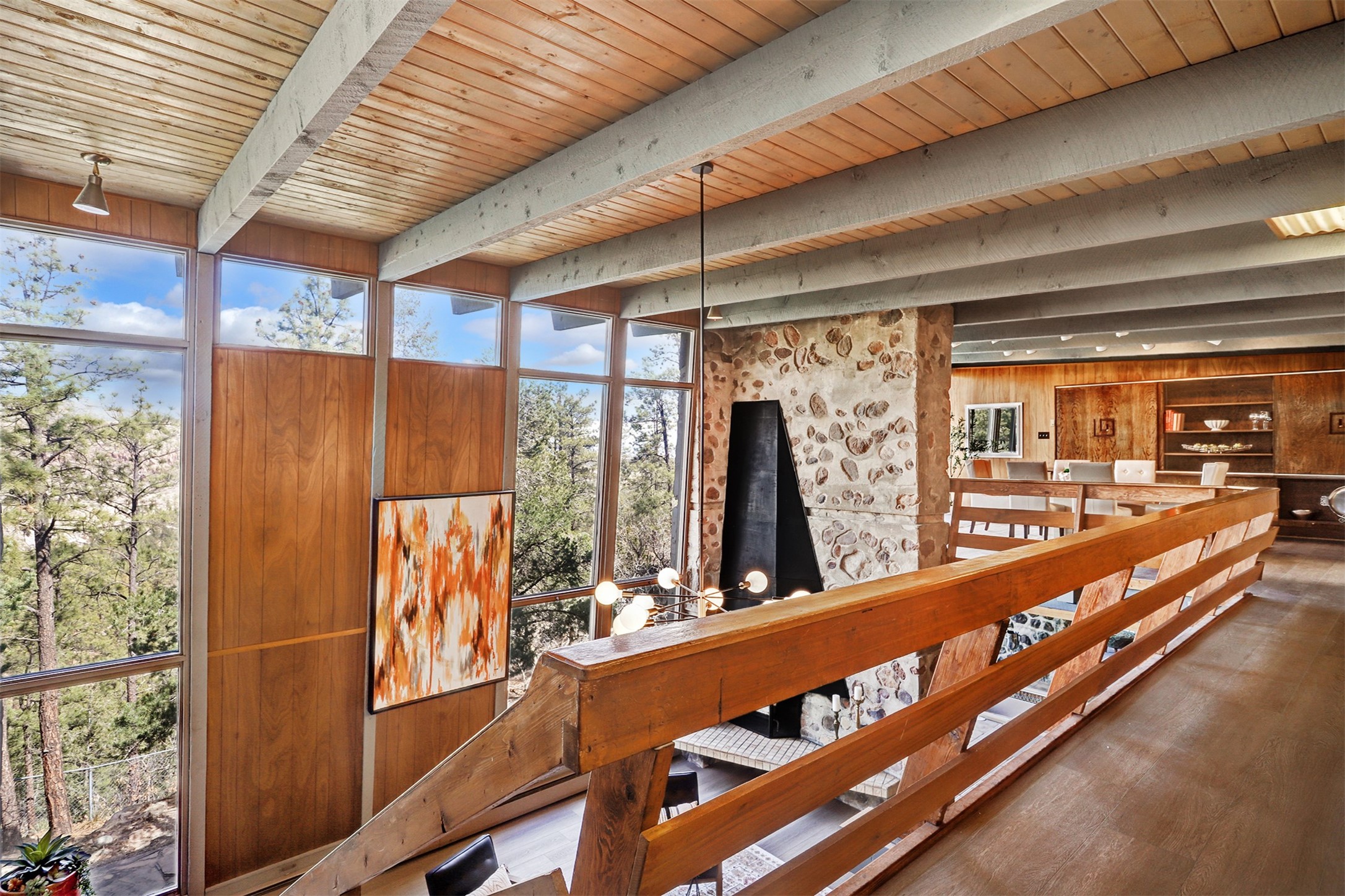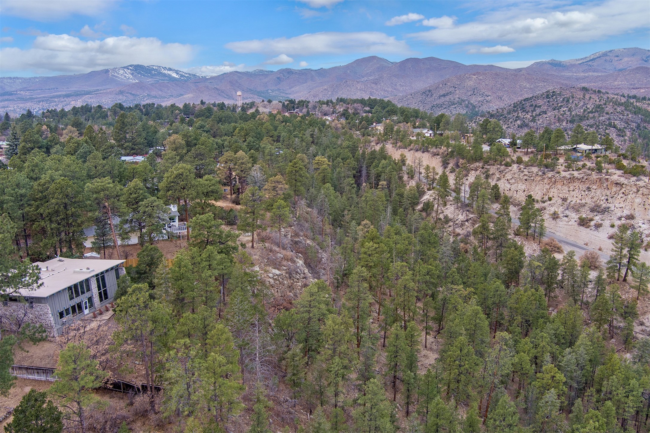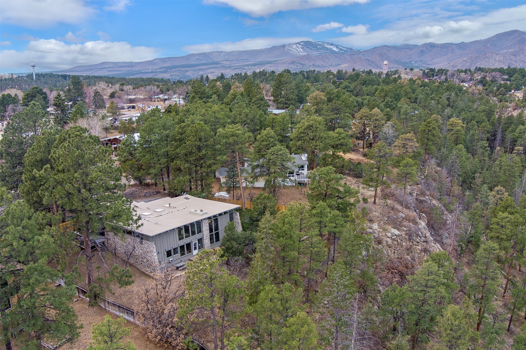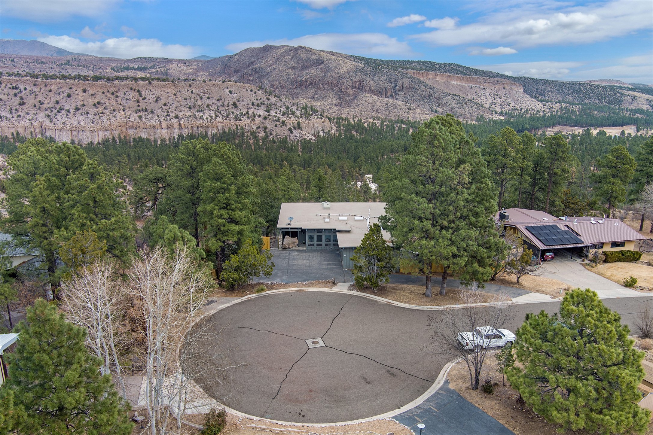 Perched on the picturesque Rendija Canyon, this stunning property with a biophilic architectural design seamlessly brings nature's qualities indoors. This remarkable property incorporates the New Mexico landscape by utilizing ponderosa, pion, and oak woods, as well as native rocks and minerals. Upon entry, you'll be met with views of the National Forest through massive two-story windows. Take the catwalk to the dining room, where the endless views continue. Your guests are sure to be awed by the organic splendor this area invokes. This level includes three guest rooms and a versatile flex room complete with a bathroom featuring fun swan fixtures. The kitchen offers convenient access to an outdoor patio and barbecue area as well as a laundry room and a two-car garage. Descend to the lower level to a spacious family room featuring Midcentury accents, such as the fireplace hood, floating hearth, and a Sputnik chandelier. This area includes a hot tub and wet bar with direct access to the back patio. The primary suite features a walk-in closet and an expansive bathroom adorned with a unique clamshell sink and koi-themed fixtures. Additionally, this level houses a large study with built-in bookshelves and a utility room providing ample storage. Stepping outside, you'll have a nice-sized, fenced yard before reaching the canyon and National Forest. This exceptional one-of-a-kind home combines modern amenities, striking design, and an immersive connection to nature. Don't miss your chance to experience this one-of-a-kind property. Schedule a showing today!