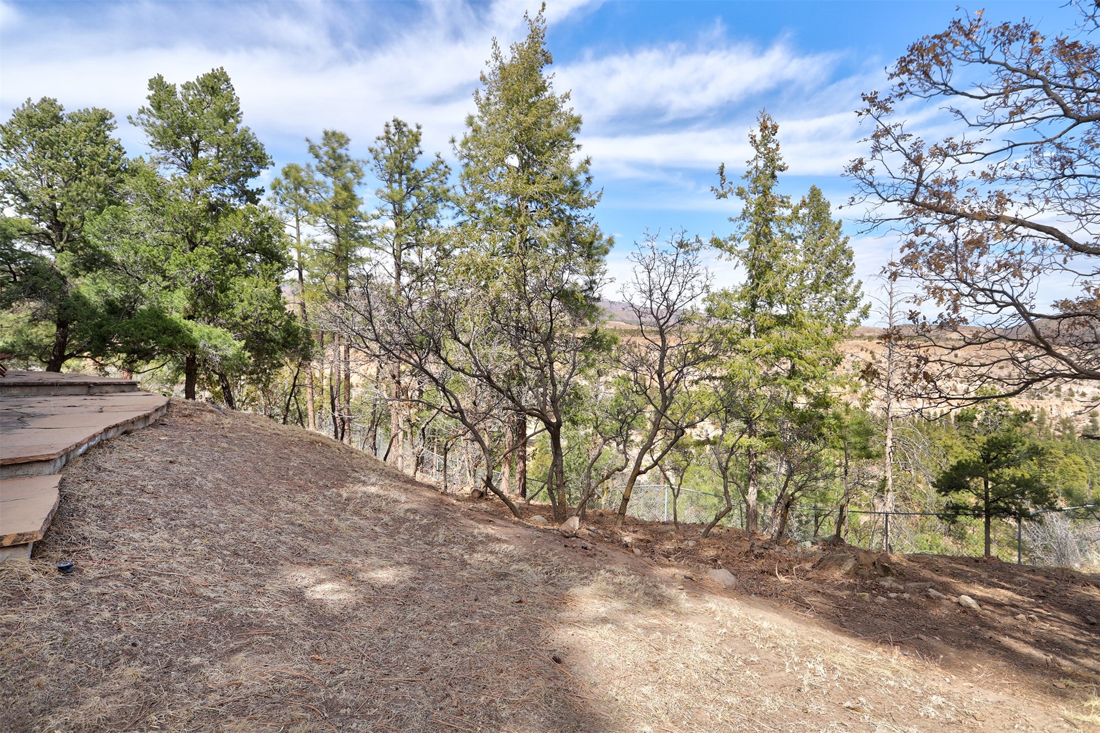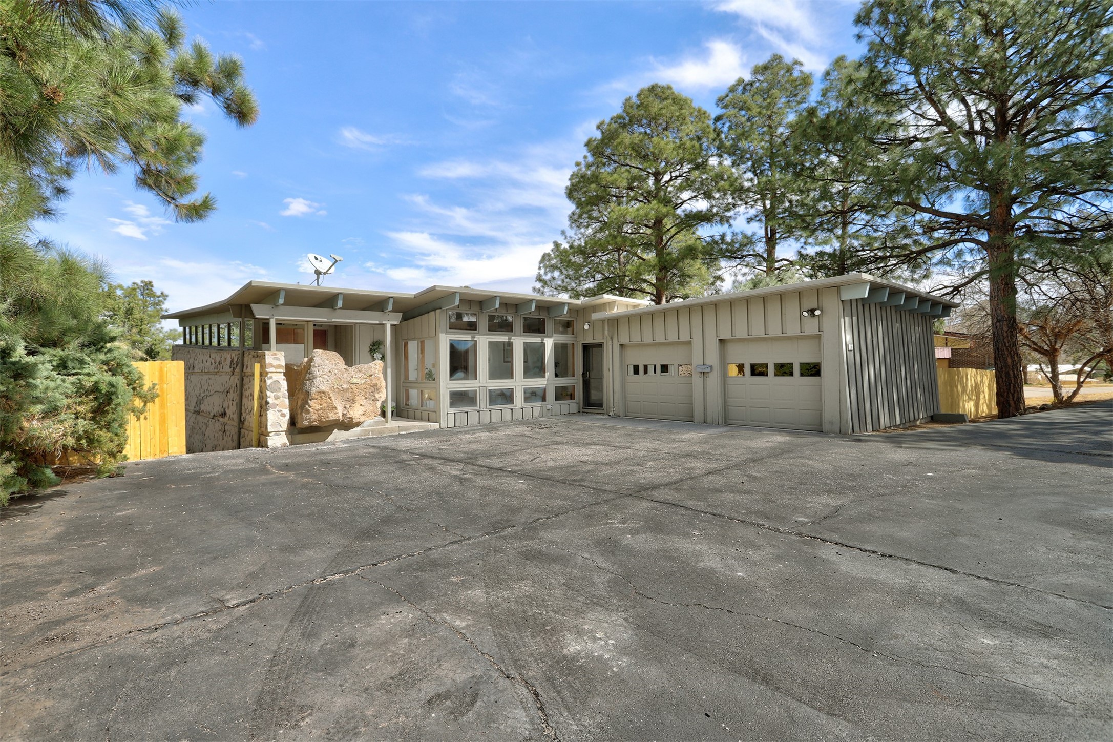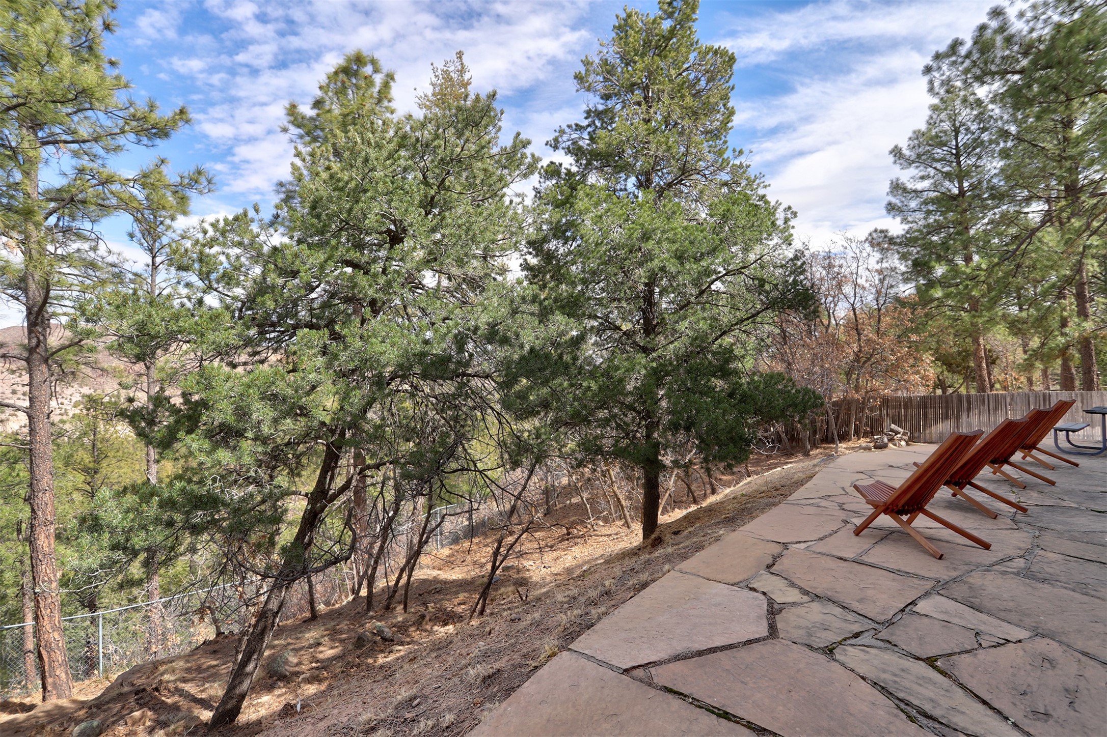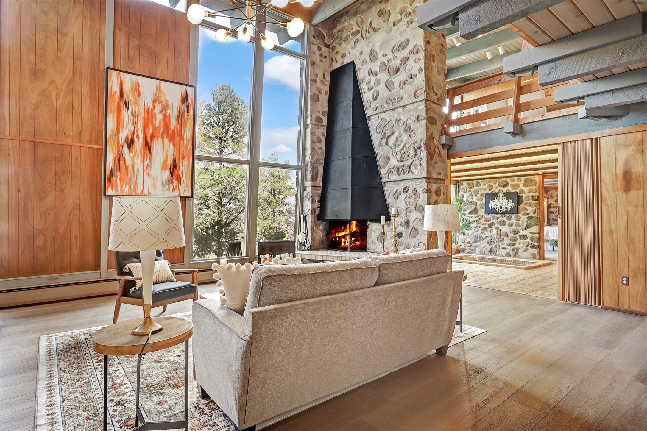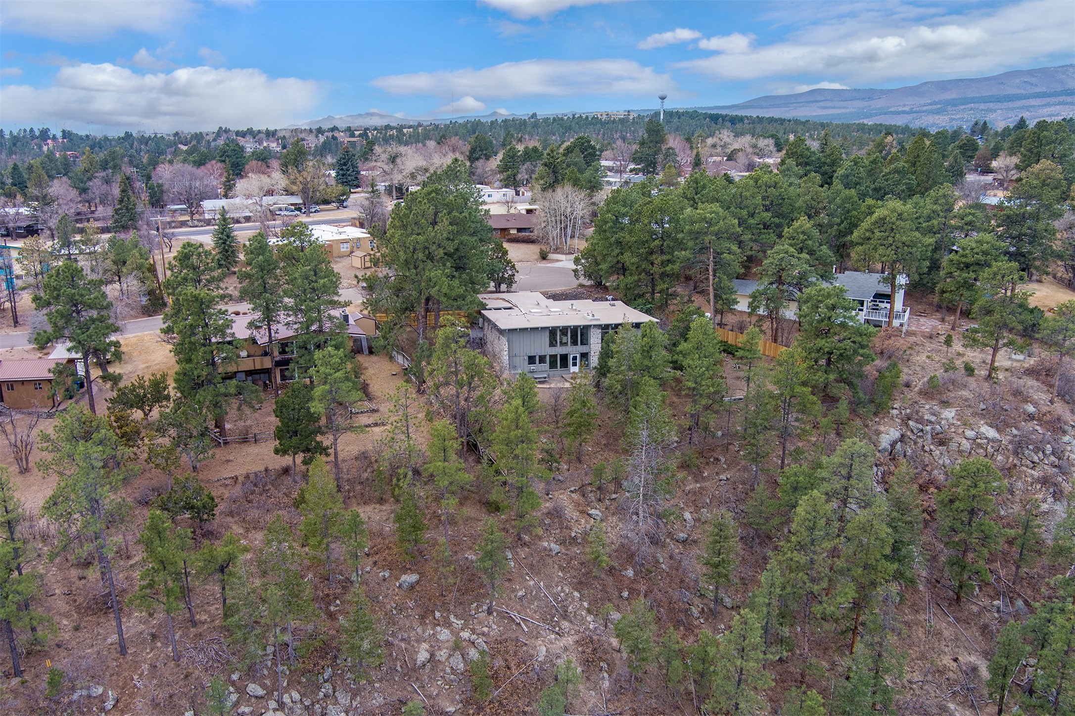 Perched on the picturesque Rendija Canyon, this stunning property with a biophilic architectural design seamlessly brings nature's qualities indoors. This remarkable property incorporates the New Mexico landscape by utilizing ponderosa, pion, and oak woods, as well as native rocks and minerals. Upon entry, you'll be met with views of the National Forest through massive two-story windows. Take the catwalk to the dining room, where the endless views continue. Your guests are sure to be awed by the organic splendor this area invokes. This level includes three guest rooms and a versatile flex room complete with a bathroom featuring fun swan fixtures. The kitchen offers convenient access to an outdoor patio and barbecue area as well as a laundry room and a two-car garage. Descend to the lower level to a spacious family room featuring Midcentury accents, such as the fireplace hood, floating hearth, and a Sputnik chandelier. This area includes a hot tub and wet bar with direct access to the back patio. The primary suite features a walk-in closet and an expansive bathroom adorned with a unique clamshell sink and koi-themed fixtures. Additionally, this level houses a large study with built-in bookshelves and a utility room providing ample storage. Stepping outside, you'll have a nice-sized, fenced yard before reaching the canyon and National Forest. This exceptional one-of-a-kind home combines modern amenities, striking design, and an immersive connection to nature. Don't miss your chance to experience this one-of-a-kind property. Schedule a showing today!