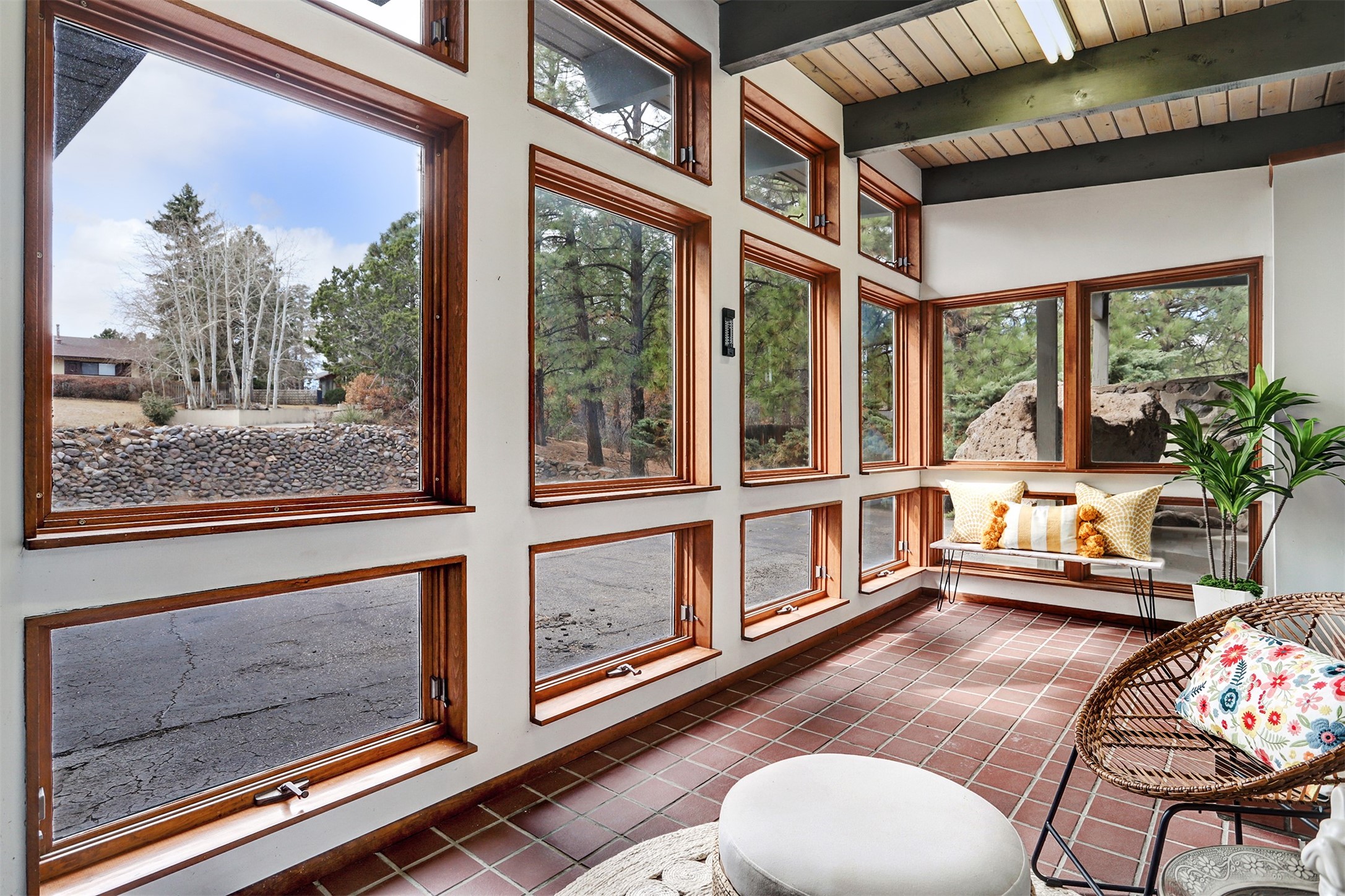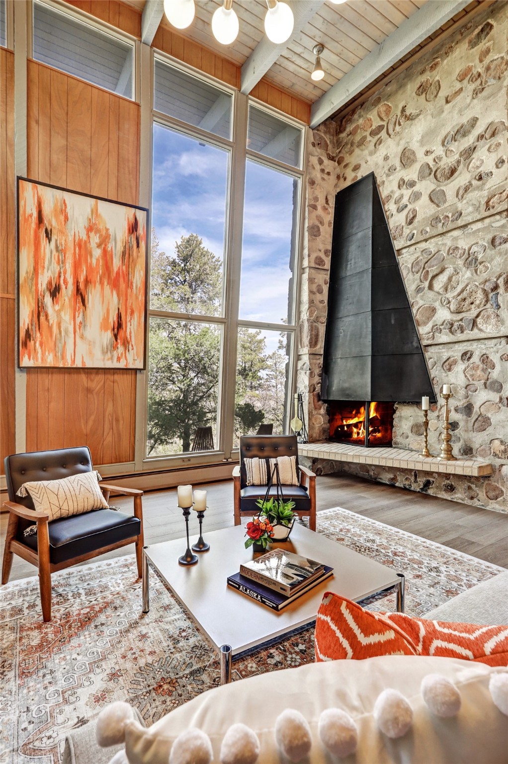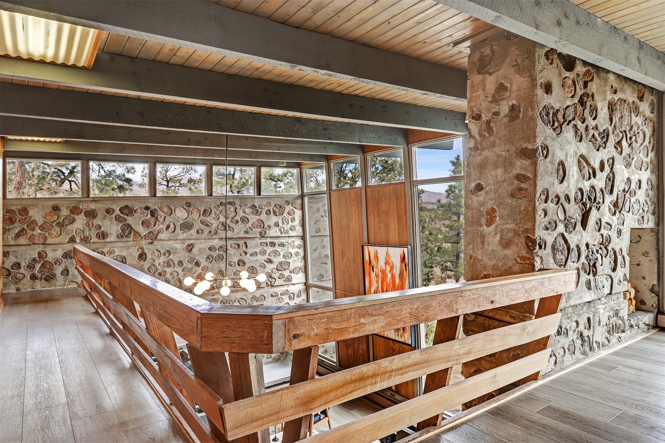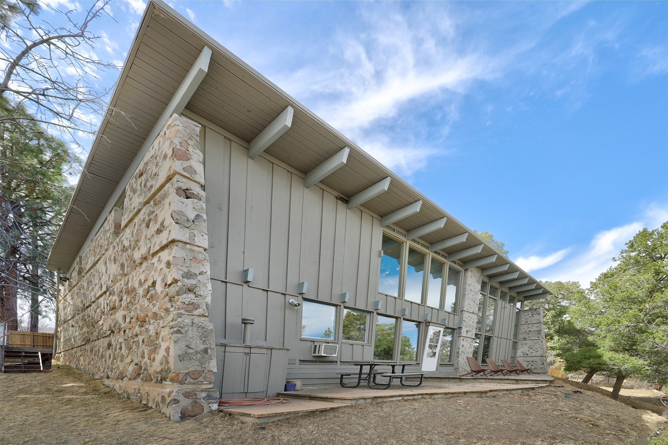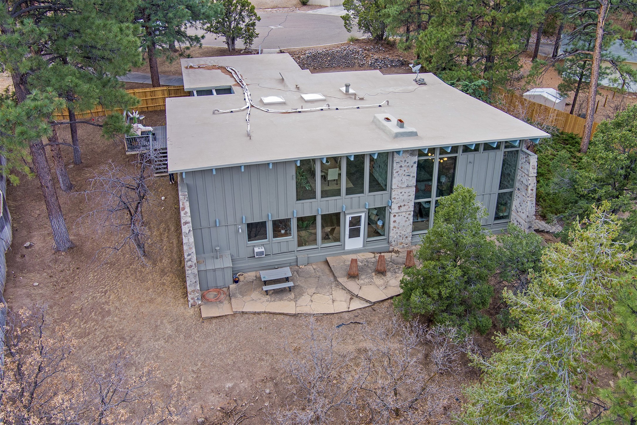 Perched on the picturesque Rendija Canyon, this stunning property with a biophilic architectural design seamlessly brings nature's qualities indoors. This remarkable property incorporates the New Mexico landscape by utilizing ponderosa, pion, and oak woods, as well as native rocks and minerals. Upon entry, you'll be met with views of the National Forest through massive two-story windows. Take the catwalk to the dining room, where the endless views continue. Your guests are sure to be awed by the organic splendor this area invokes. This level includes three guest rooms and a versatile flex room complete with a bathroom featuring fun swan fixtures. The kitchen offers convenient access to an outdoor patio and barbecue area as well as a laundry room and a two-car garage. Descend to the lower level to a spacious family room featuring Midcentury accents, such as the fireplace hood, floating hearth, and a Sputnik chandelier. This area includes a hot tub and wet bar with direct access to the back patio. The primary suite features a walk-in closet and an expansive bathroom adorned with a unique clamshell sink and koi-themed fixtures. Additionally, this level houses a large study with built-in bookshelves and a utility room providing ample storage. Stepping outside, you'll have a nice-sized, fenced yard before reaching the canyon and National Forest. This exceptional one-of-a-kind home combines modern amenities, striking design, and an immersive connection to nature. Don't miss your chance to experience this one-of-a-kind property. Schedule a showing today!