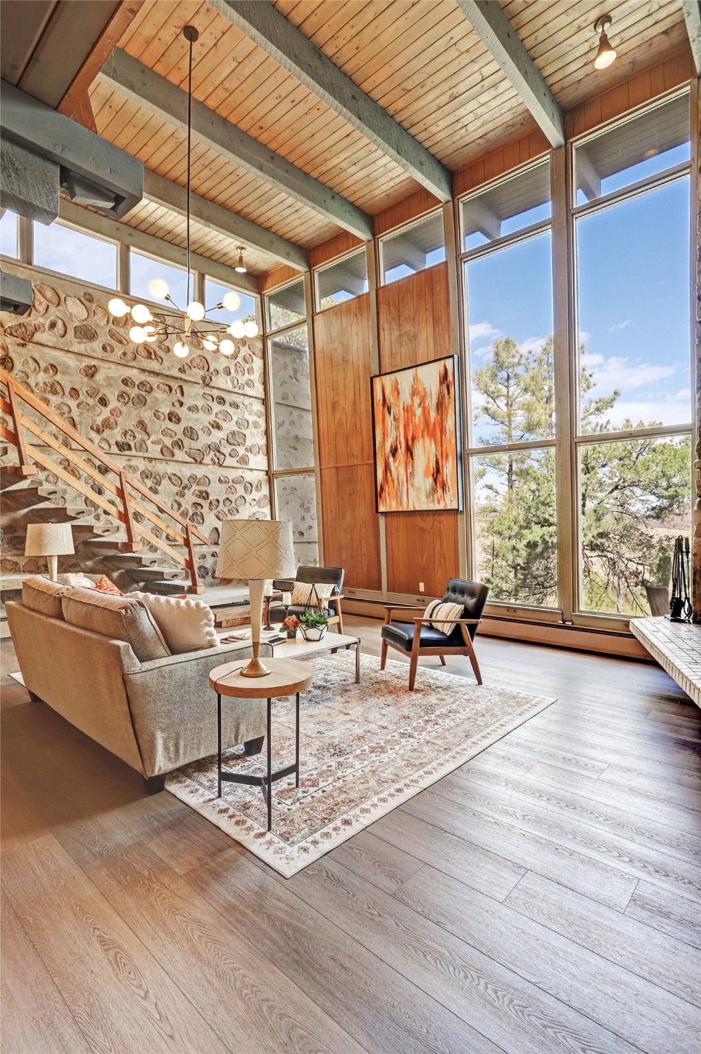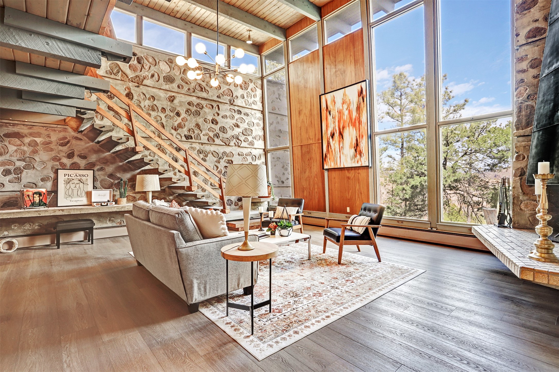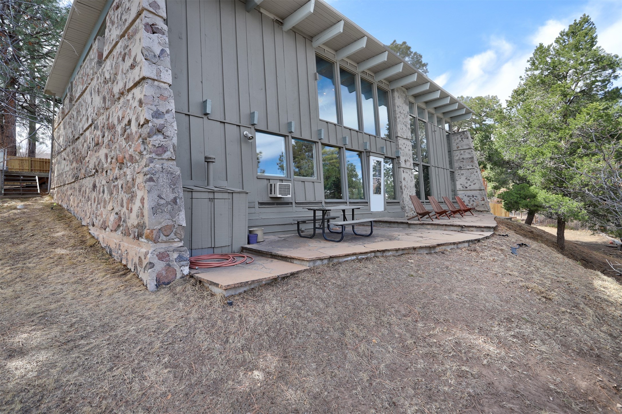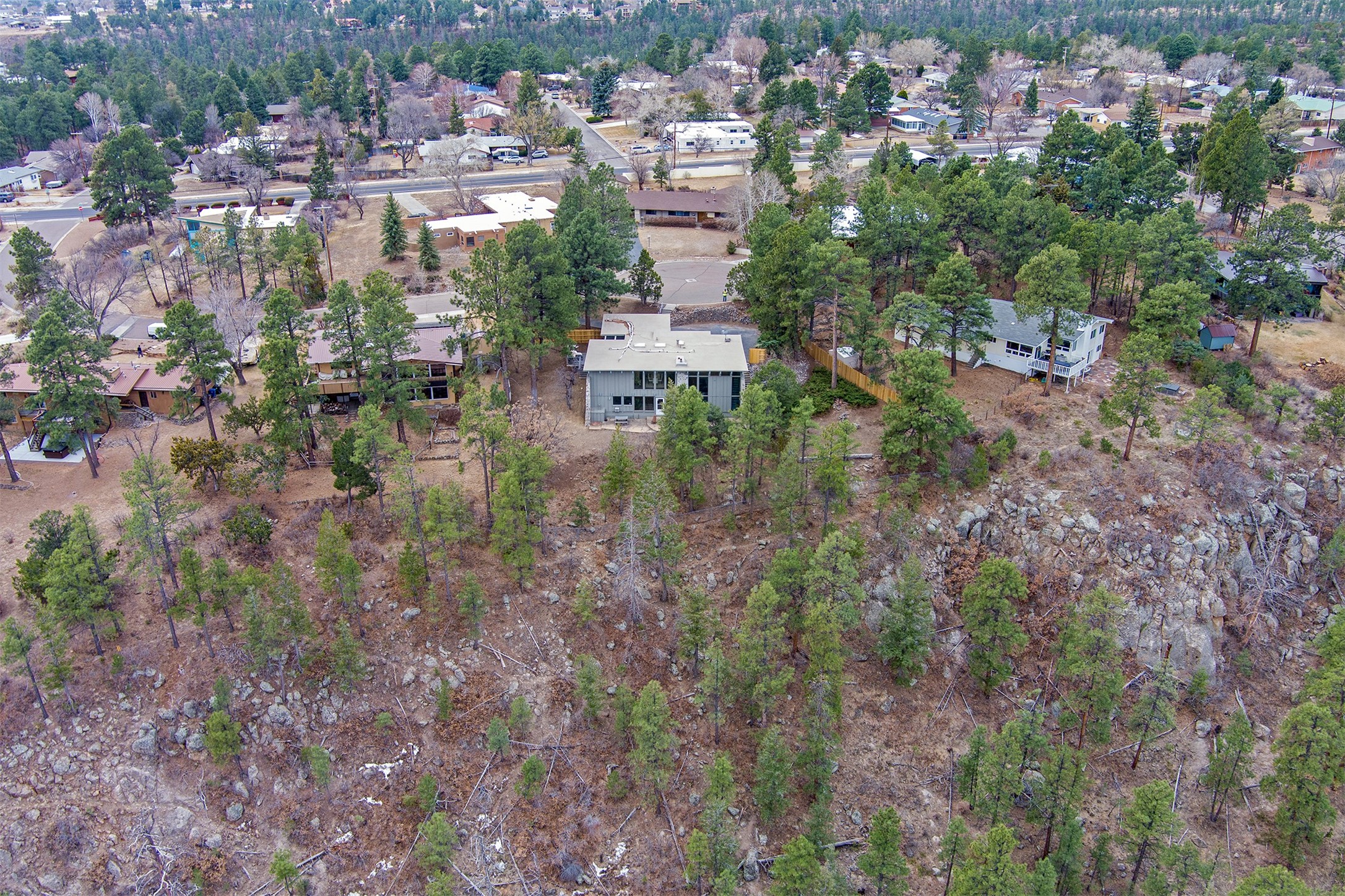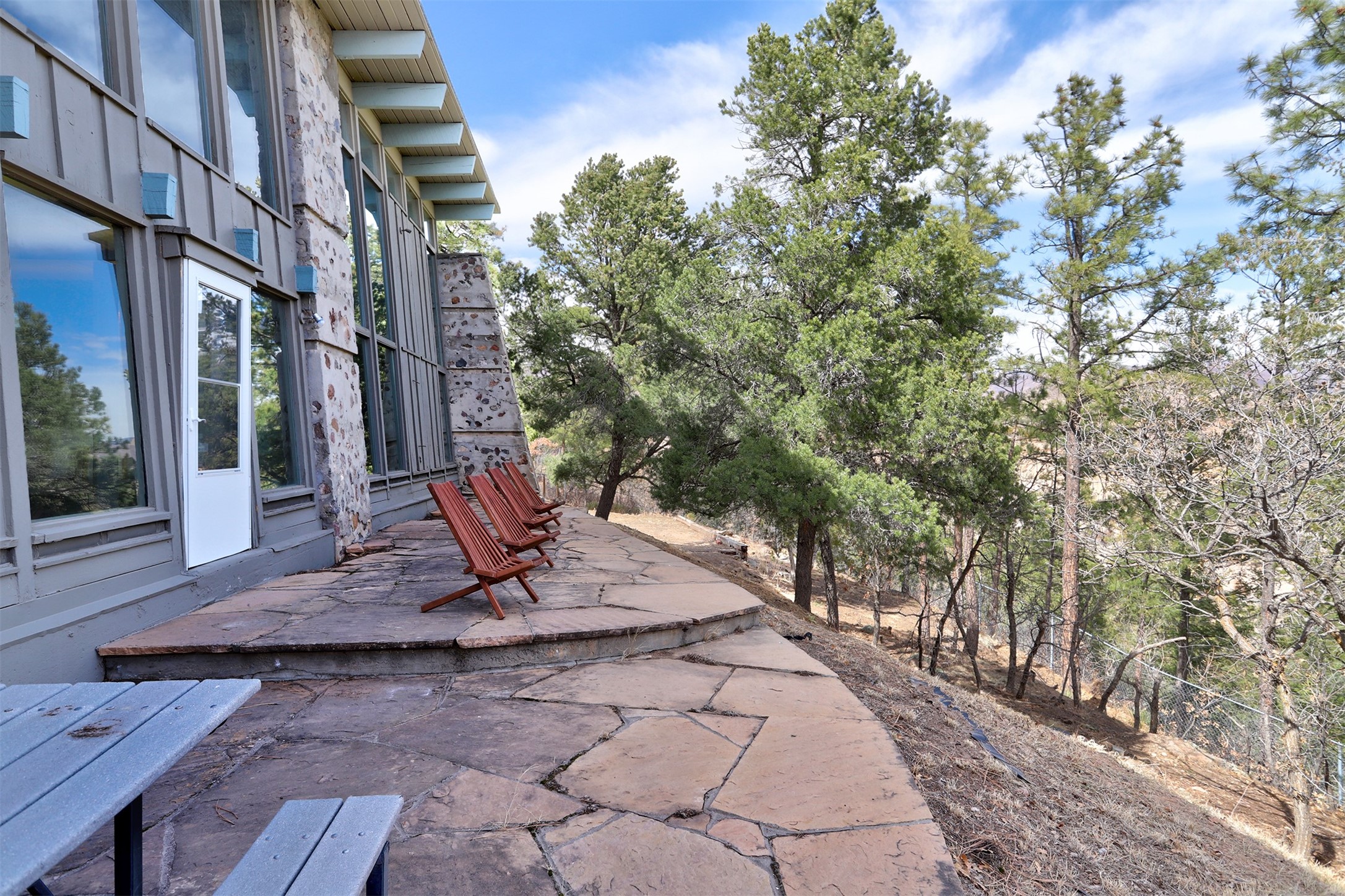 Perched on the picturesque Rendija Canyon, this stunning property with a biophilic architectural design seamlessly brings nature's qualities indoors. This remarkable property incorporates the New Mexico landscape by utilizing ponderosa, pion, and oak woods, as well as native rocks and minerals. Upon entry, you'll be met with views of the National Forest through massive two-story windows. Take the catwalk to the dining room, where the endless views continue. Your guests are sure to be awed by the organic splendor this area invokes. This level includes three guest rooms and a versatile flex room complete with a bathroom featuring fun swan fixtures. The kitchen offers convenient access to an outdoor patio and barbecue area as well as a laundry room and a two-car garage. Descend to the lower level to a spacious family room featuring Midcentury accents, such as the fireplace hood, floating hearth, and a Sputnik chandelier. This area includes a hot tub and wet bar with direct access to the back patio. The primary suite features a walk-in closet and an expansive bathroom adorned with a unique clamshell sink and koi-themed fixtures. Additionally, this level houses a large study with built-in bookshelves and a utility room providing ample storage. Stepping outside, you'll have a nice-sized, fenced yard before reaching the canyon and National Forest. This exceptional one-of-a-kind home combines modern amenities, striking design, and an immersive connection to nature. Don't miss your chance to experience this one-of-a-kind property. Schedule a showing today!